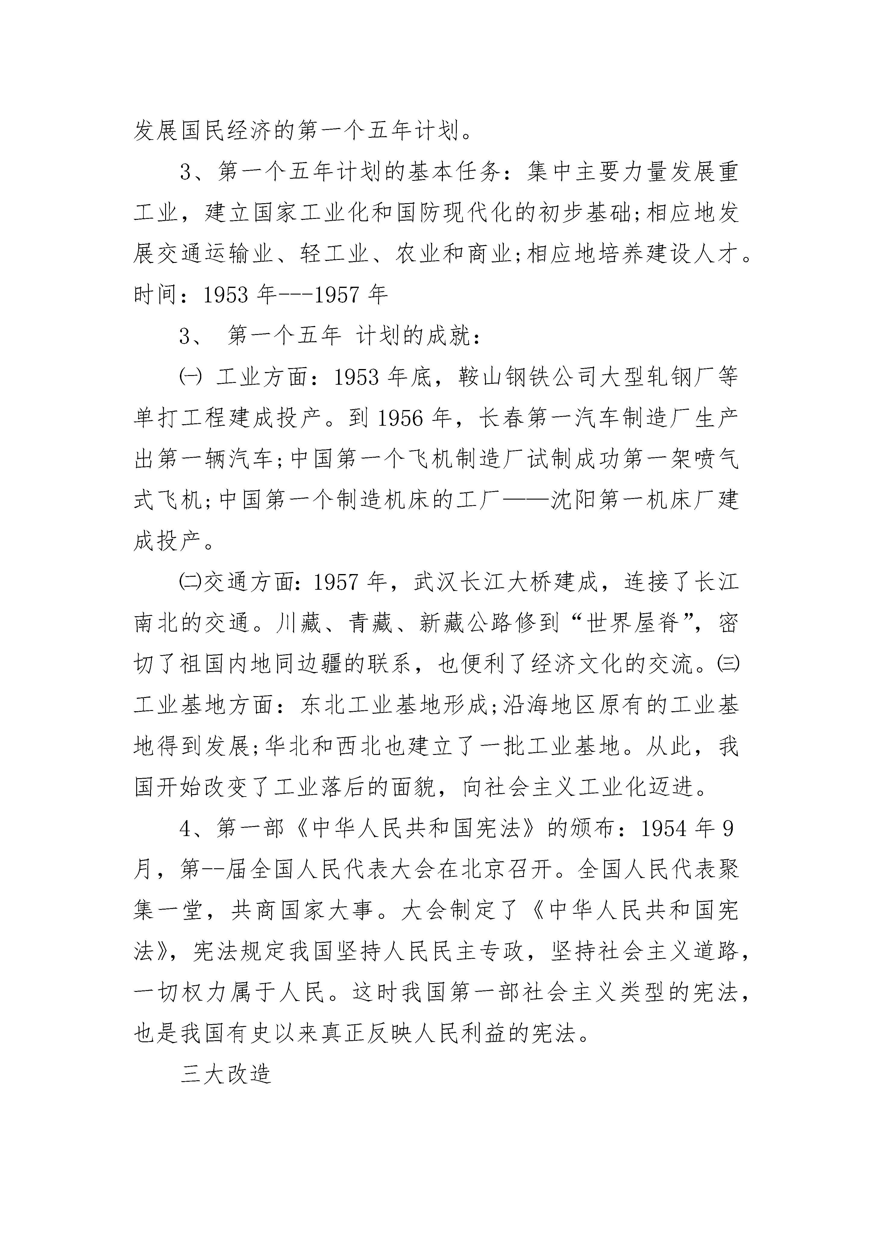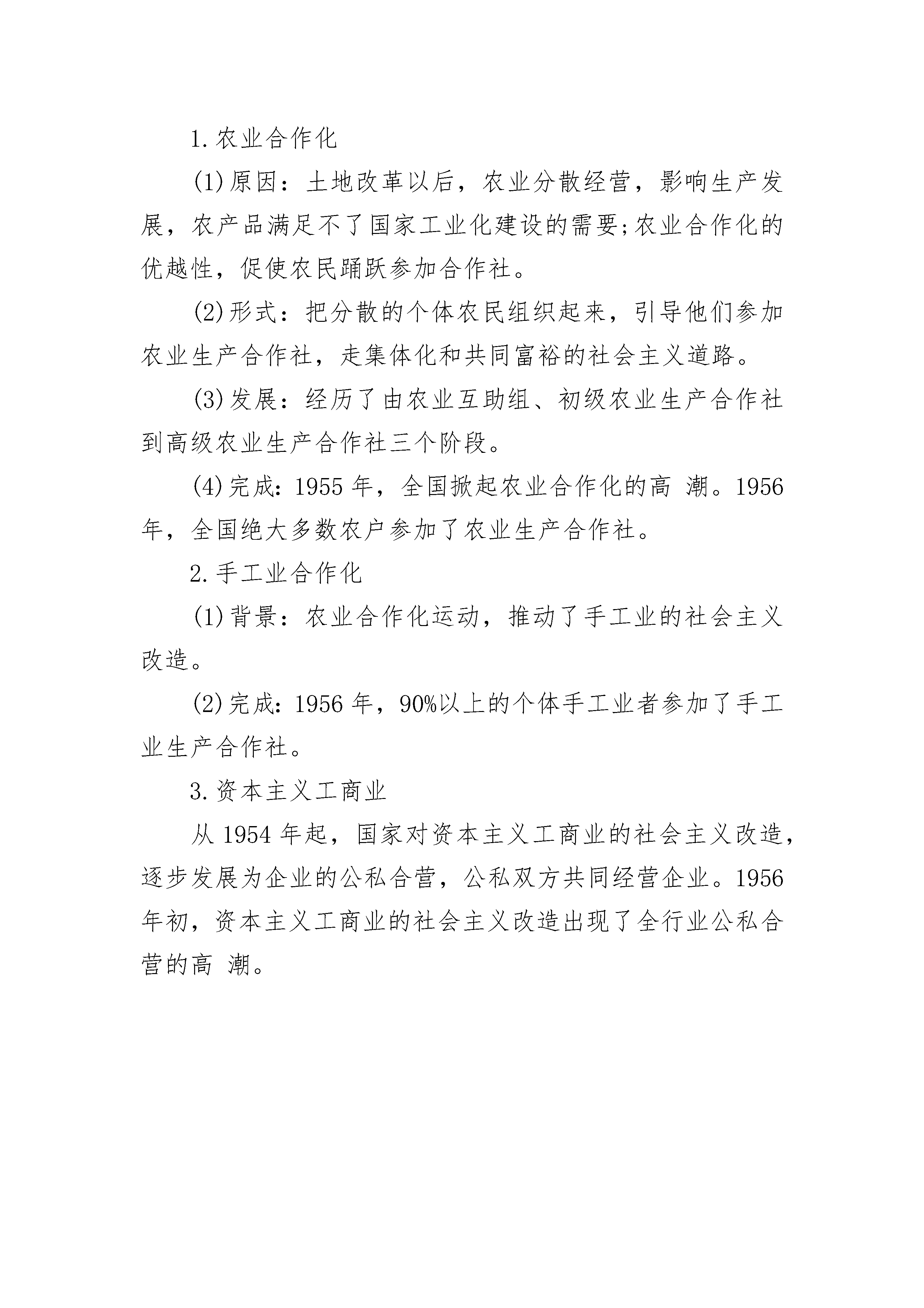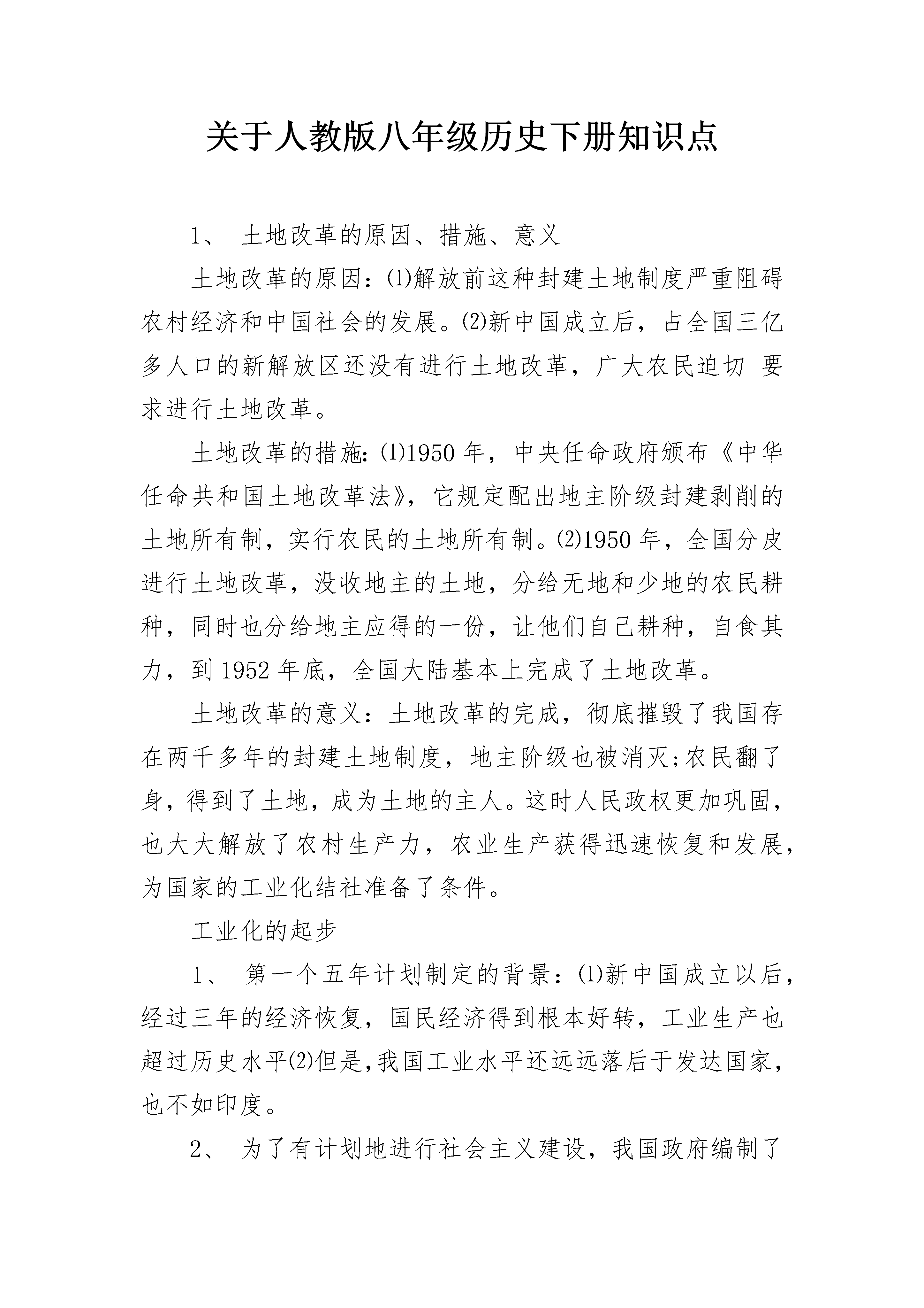 关于人教版八年级历史下册知识点1、土地改革的原因、措施、意义土地改革的原因:⑴解放前这种封建土地制度严重阻碍农村经济和中国社会的发展。⑵新中国成立后,占全国三亿多人口的新解放区还没有进行土地改革,广大农民迫切要求进行土地改革。土地改革的措施:⑴1950年,中央任命政府颁布《中华任命共和国土地改革法》,它规定配出地主阶级封建剥削的土地所有制,实行农民的土地所有制。⑵1950年,全国分皮进行土地改革,没收地主的土地,分给无地和少地的农民耕种,同时也分给地主应得的一份,让他们自己耕种,自食其力,到1952年底,全国大陆基本上完成了土地改革。土地改革的意义:土地改革的完成,彻底摧毁了我国存在两千多年的封建土地制度,地主阶级也被消灭;农民翻了身,得到了土地,成为土地的主人。这时人民政权更加巩固,也大大解放了农村生产力,农业生产获得迅速恢复和发展,为国家的工业化结社准备了条件。工业化的起步1、第一个五年计划制定的背景:⑴新中国成立以后,经过三年的经济恢复,国民经济得到根本好转,工业生产也超过历史水平⑵但是,我国工业水平还远远落后于发达国家,也不如印度。2、为了有计划地进行社会主义建设,我国政府编制了发展国民经济的第一个五年计划。3、第一个五年计划的基本任务:集中主要力量发展重工业,建立国家工业化和国防现代化的初步基础;相应地发展交通运输业、轻工业、农业和商业;相应地培养建设人才。时间:1953年---1957年3、第一个五年计划的成就:㈠工业方面:1953年底,鞍山钢铁公司大型轧钢厂等单打工程建成投产。到1956年,长春第一汽车制造厂生产出第一辆汽车;中国第一个飞机制造厂试制成功第一架喷气式飞机;中国第一个制造机床的工厂——沈阳第一机床厂建成投产。㈡交通方面:1957年,武汉长江大桥建成,连接了长江南北的交通。川藏、青藏、新藏公路修到“世界屋脊”,密切了祖国内地同边疆的联系,也便利了经济文化的交流。㈢工业基地方面:东北工业基地形成;沿海地区原有的工业基地得到发展;华北和西北也建立了一批工业基地。从此,我国开始改变了工业落后的面貌,向社会主义工业化迈进。4、第一部《中华人民共和国宪法》的颁布:1954年9月,第--届全国人民代表大会在北京召开。全国人民代表聚集一堂,共商国家大事。大会制定了《中华人民共和国宪法》,宪法规定我国坚持人民民主专政,坚持社会主义道路,一切权力属于人民。这时我国第一部社会主义类型的宪法,也是我国有史以来真正反映人民利益的宪法。三大改造1.农业合作化(1)原因:土地改革以后,农业分散经营,影响生产发展,农产品满足不了国家工业化建设的需要;农业合作化的优越性,促使农民踊跃参加合作社。(2)形式:把分散的个体农民组织起来,引导他们参加农业生产合作社,走集体化和共同富裕的社会主义道路。(3)发展:经历了由农业互助组、初级农业生产合作社到高级农业生产合作社三个阶段。(4)完成:1955年,全国掀起农业合作化的高潮。1956年,全国绝大多数农户参加了农业生产合作社。2.手工业合作化(1)背景:农业合作化运动,推动了手工业的社会主义改造。(2)完成:1956年,90%以上的个体手工业者参加了手工业生产合作社。3.资本主义工商业从1954年起,国家对资本主义工商业的社会主义改造,逐步发展为企业的公私合营,公私双方共同经营企业。1956年初,资本主义工商业的社会主义改造出现了全行业公私合营的高潮。