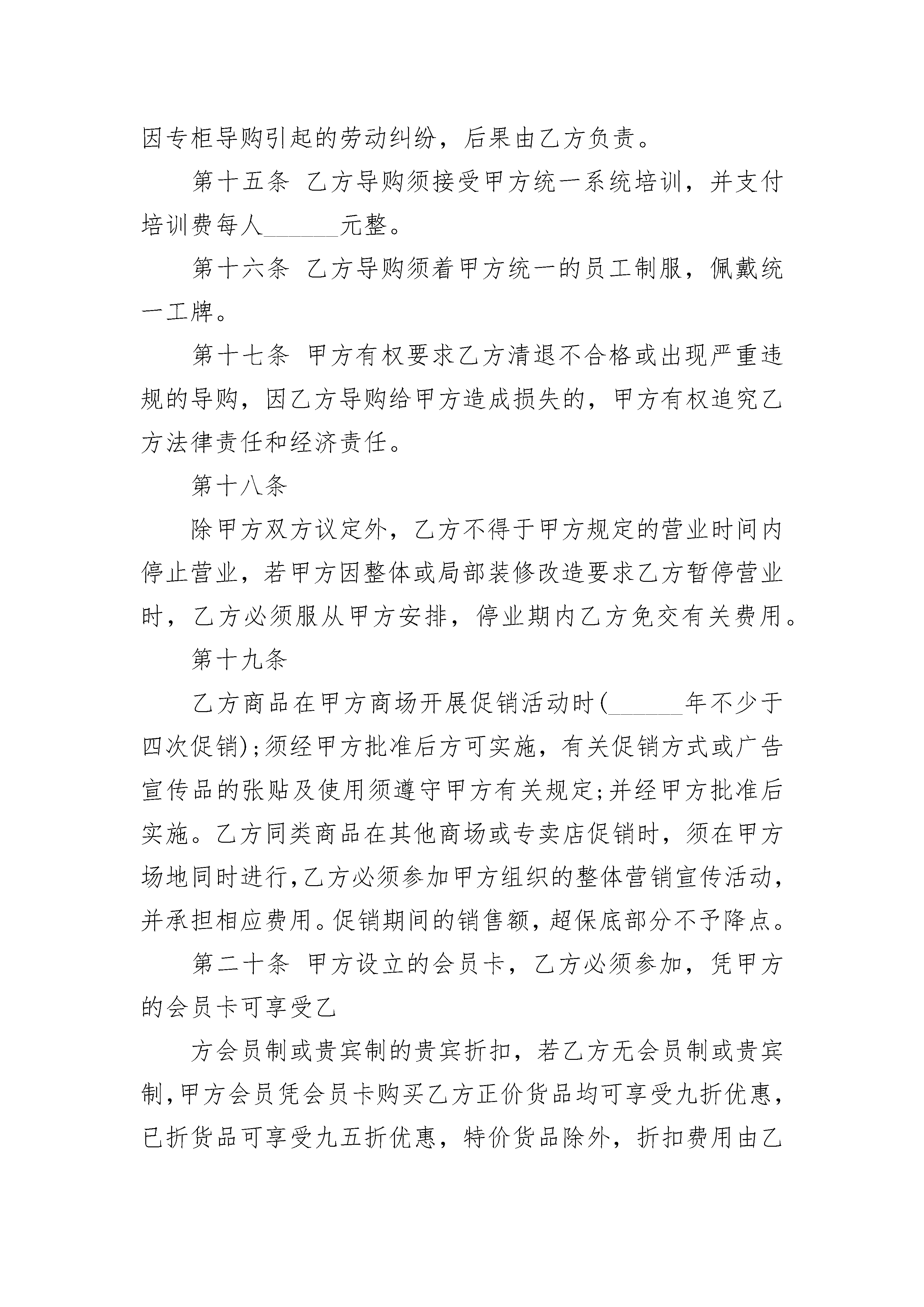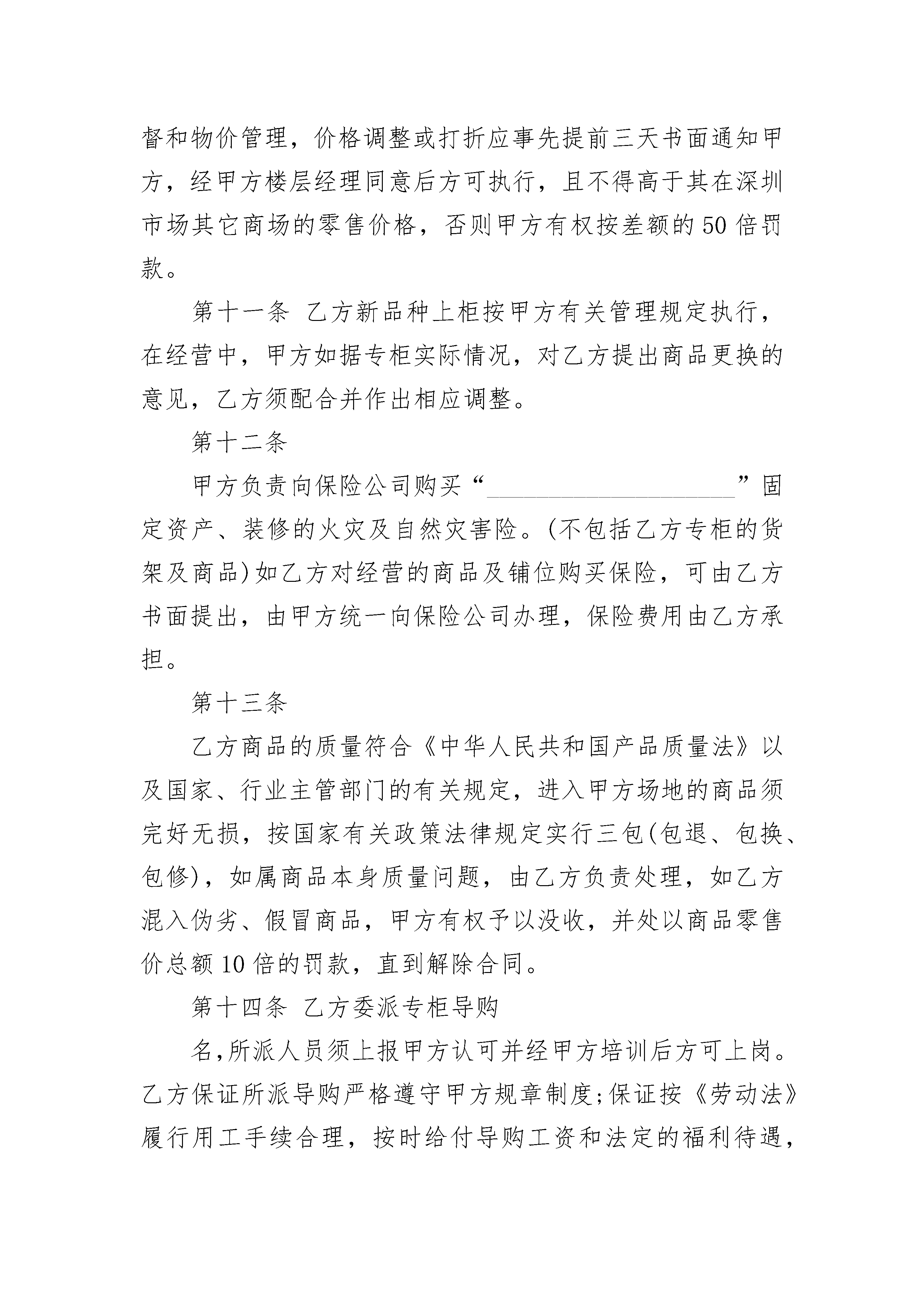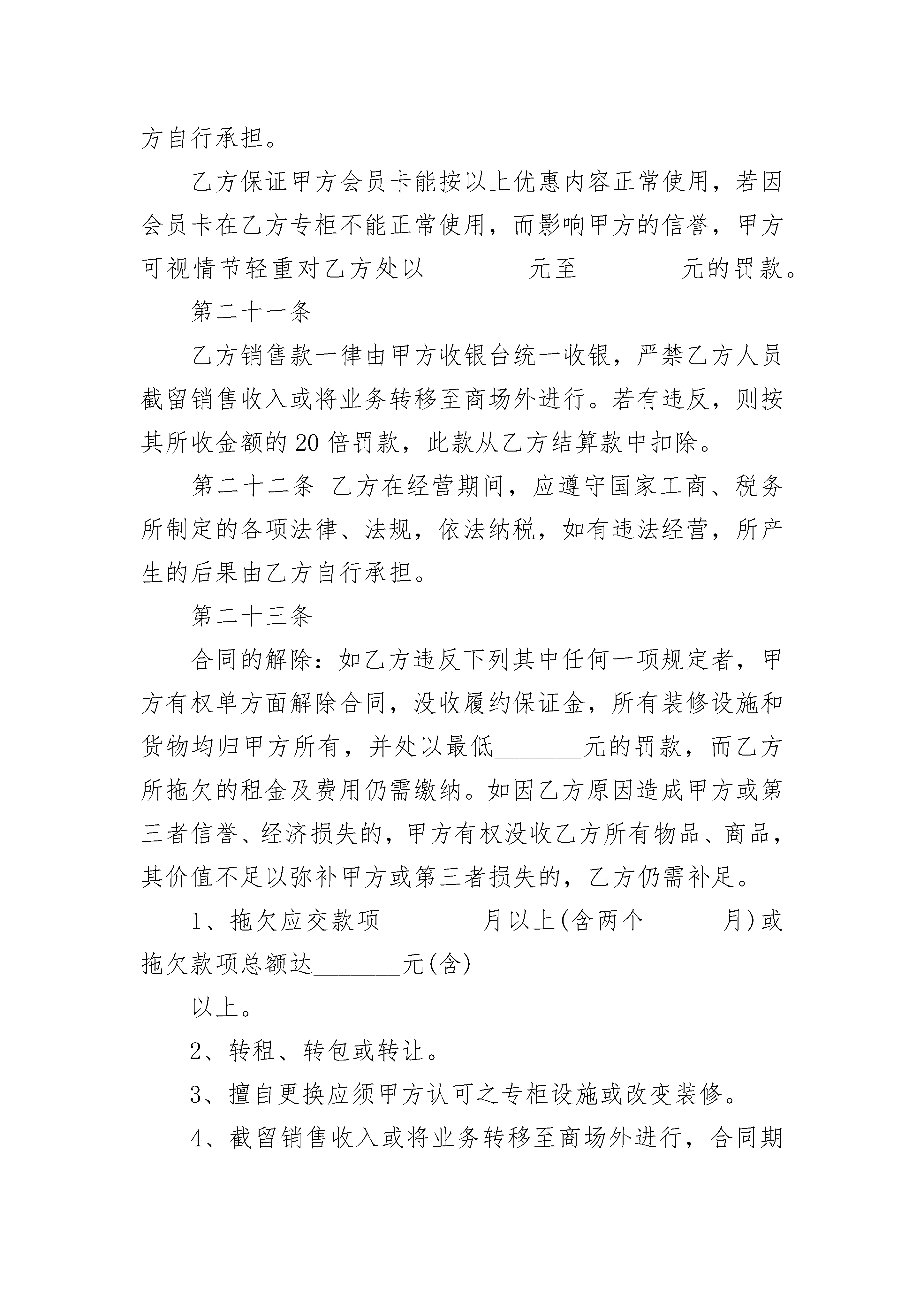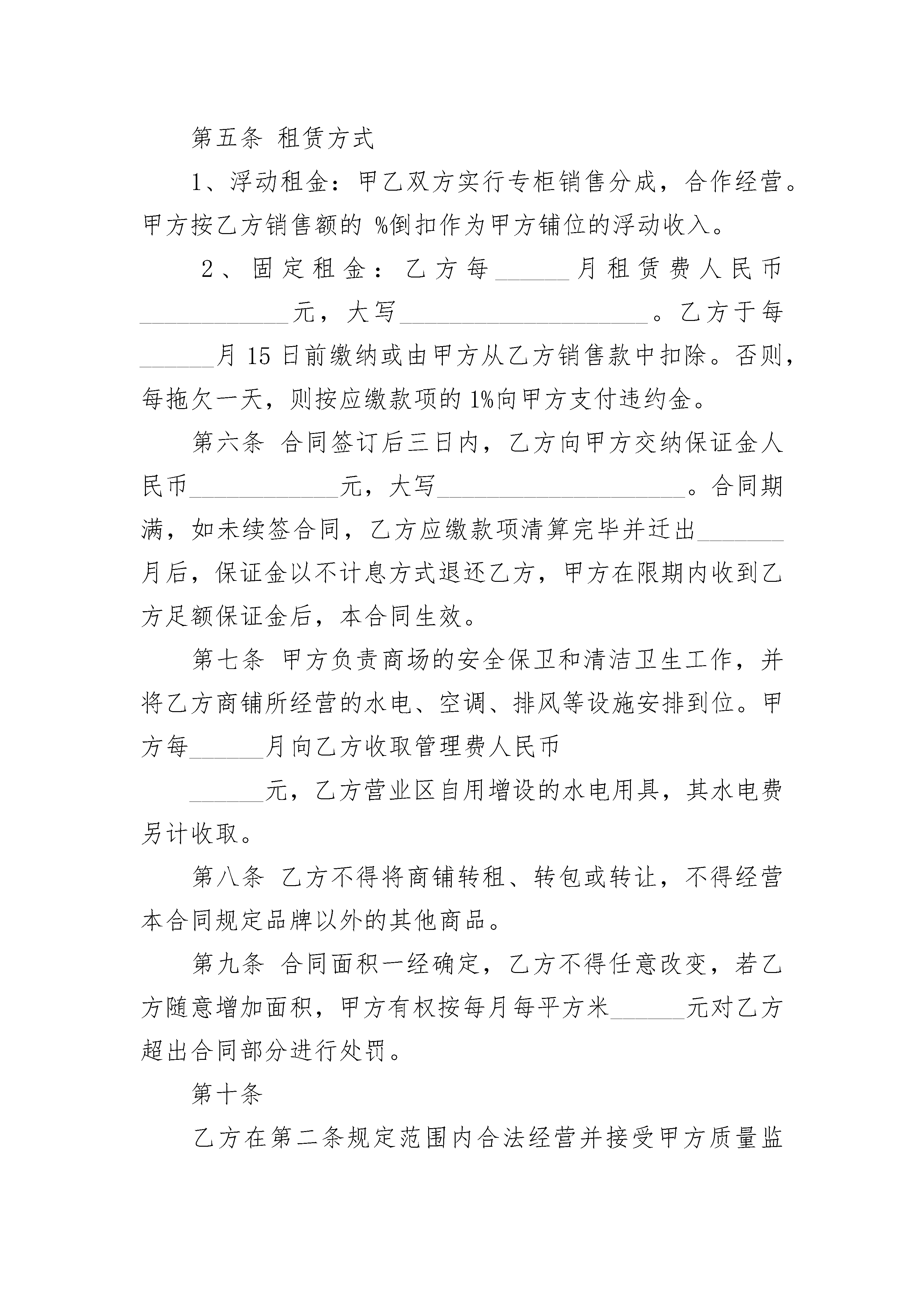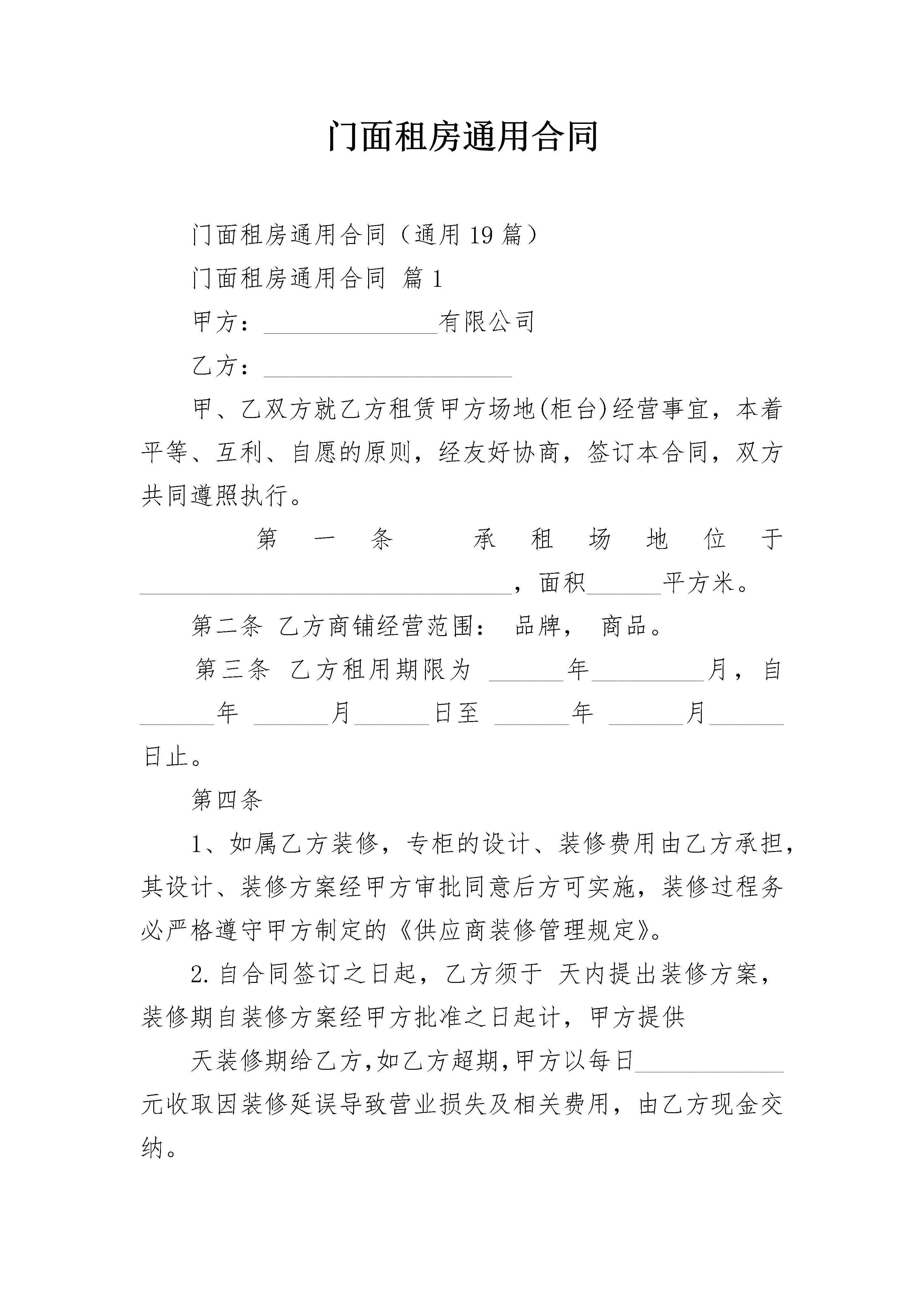 门面租房通用合同门面租房通用合同(通用19篇)门面租房通用合同篇1甲方:______________有限公司乙方:____________________甲、乙双方就乙方租赁甲方场地(柜台)经营事宜,本着平等、互利、自愿的原则,经友好协商,签订本合同,双方共同遵照执行。第一条承租场地位于______________________________,面积______平方米。第二条乙方商铺经营范围:品牌,商品。第三条乙方租用期限为______年_________月,自______年______月______日至______年______月______日止。第四条1、如属乙方装修,专柜的设计、装修费用由乙方承担,其设计、装修方案经甲方审批同意后方可实施,装修过程务必严格遵守甲方制定的《供应商装修管理规定》。2.自合同签订之日起,乙方须于天内提出装修方案,装修期自装修方案经甲方批准之日起计,甲方提供天装修期给乙方,如乙方超期,甲方以每日____________元收取因装修延误导致营业损失及相关费用,由乙方现金交纳。第五条租赁方式1、浮动租金:甲乙双方实行专柜销售分成,合作经营。甲方按乙方销售额的%倒扣作为甲方铺位的浮动收入。2、固定租金:乙方每______月租赁费人民币____________元,大写____________________。乙方于每______月15日前缴纳或由甲方从乙方销售款中扣除。否则,每拖欠一天,则按应缴款项的1%向甲方支付违约金。第六条合同签订后三日内,乙方向甲方交纳保证金人民币____________元,大写____________________。合同期满,如未续签合同,乙方应缴款项清算完毕并迁出_______月后,保证金以不计息方式退还乙方,甲方在限期内收到乙方足额保证金后,本合同生效。第七条甲方负责商场的安全保卫和清洁卫生工作,并将乙方商铺所经营的水电、空调、排风等设施安排到位。甲方每______月向乙方收取管理费人民币______元,乙方营业区自用增设的水电用具,其水电费另计收取。第八条乙方不得将商铺转租、转包或转让,不得经营本合同规定品牌以外的其他商品。第九条合同面积一经确定,乙方不得任意改变,若乙方随意增加面积,甲方有权按每月每平方米______元对乙方超出合同部分进行处罚。第十条乙方在第二条规定范围内合法经营并接受甲方质量监督和物价管理,价格调整或打折应事先提前三天书面通知甲方,经甲方楼层经理同意后方可执行,且不得高于其在深圳市场其它商场的零售价格,否则甲方有权按差额的50倍罚款。第十一条乙方新品种上柜按甲方有关管理规定执行,在经营中,甲方如据专柜实际情况,对乙方提出商品更换的意见,乙方须配合并作出相应调整。第十二条甲方负责向保险公司购买“____________________”固定资产、装修的火灾及自然灾害险。(不包括乙方专柜的货架及商品)如乙方对经营的商品及铺位购买保险,可由乙方书面提出,由甲方统一向保险公司办理,保险费用由乙方承担。第十三条乙方商品的质量符合《中华人民共和国产品质量法》以及国家、行业主管部门的有关规定,进入甲方场地的商品须完好无损,按国家有关政策法律规定实行三包(包退、包换、包修),如属商品本身质量问题,由乙方负责处理,如乙方混入伪劣、假冒商品,甲方有权予以没收,并处以商品零售价总额10倍的罚款,直到解除合同。第十四条乙方委派专柜导购名,所派人员须上报甲方认可并经甲方培训后方可上岗。乙方保证所派导购严格遵守甲方规章制度;保证按《劳动法》履行用工手续合理,按时给付导购工资和法定的福利待遇,因专柜导购引起的劳动纠纷,后果由乙方负责。第十五条乙方导购须接受甲方统一系统培训,并支付培训费每人______元整。第十六条乙方导购须着甲方统一的员工制服,佩戴统一工牌。第十七条甲方有权要求乙方清退不合格或出现严重违规的导购,因乙方导购给甲方造成损失的,甲方有权追究乙方法律责任和经济责任。第十八条除甲方双方议定外,乙方不得于甲方规定的营业时间内停止营业,若甲方因整体或局部装修改造要求乙方暂停营业时,乙方必须服从甲方安排,停业期内乙方免交有关费用。第十九条乙方商品在甲方商场开展促销活动时(______年不少于四次促销);须经甲方批准后方可实施,有关促销方式或广告宣传品的张贴及使用须遵守甲方有关规定;并经甲方批准后实施。乙方同类商品在其他商场或专卖店促销时,须在甲方场地同时进行,乙方必须参加甲方组织的整体营销宣传活动,并承担相应费用。促销期间的销售额,超保底部分不予降点。第二十条甲方设立的会员卡,乙方必须参加,凭甲方的会员卡可享受乙方会员制或贵宾制的贵宾折扣,若乙方无会员制或贵宾制,甲方会员凭会员卡购买乙方正价货品均可享受九折优惠,已折货品可享受九五折优惠,特价货品除外,折扣费用由乙方自