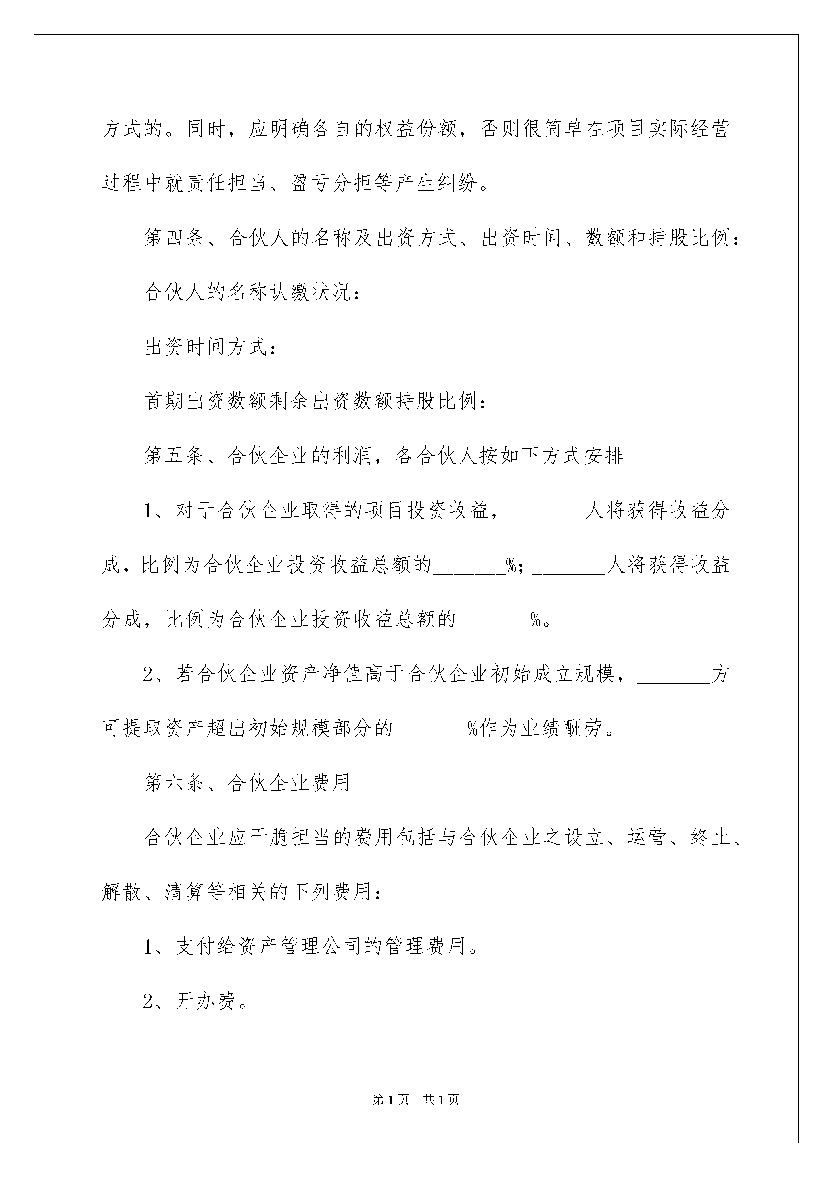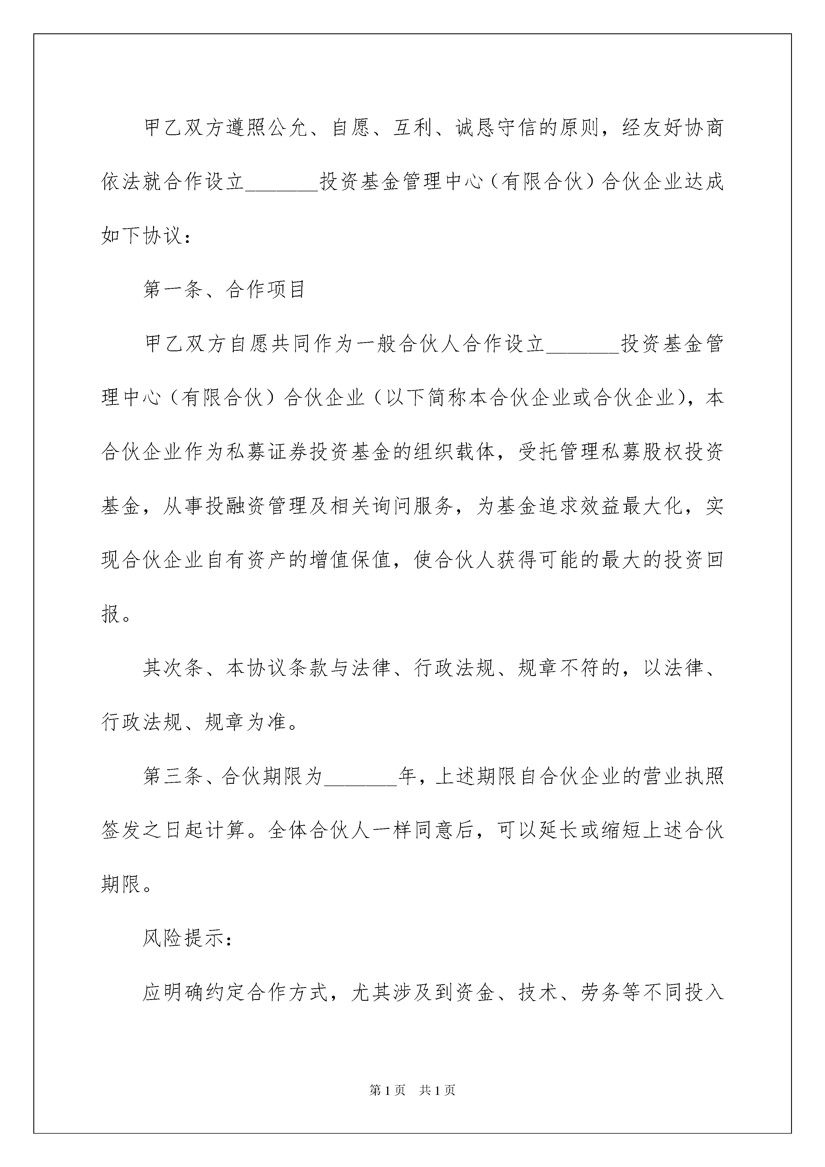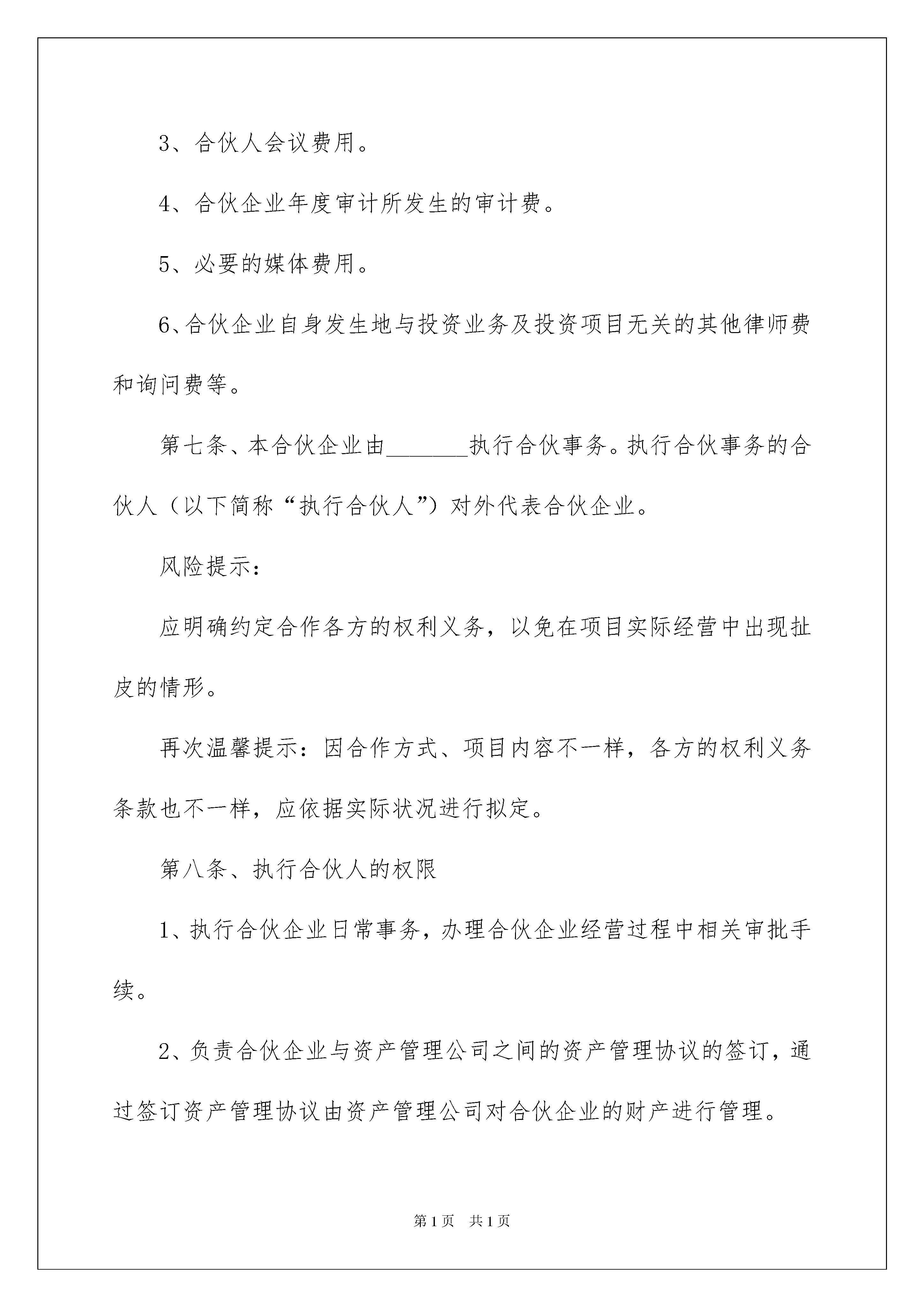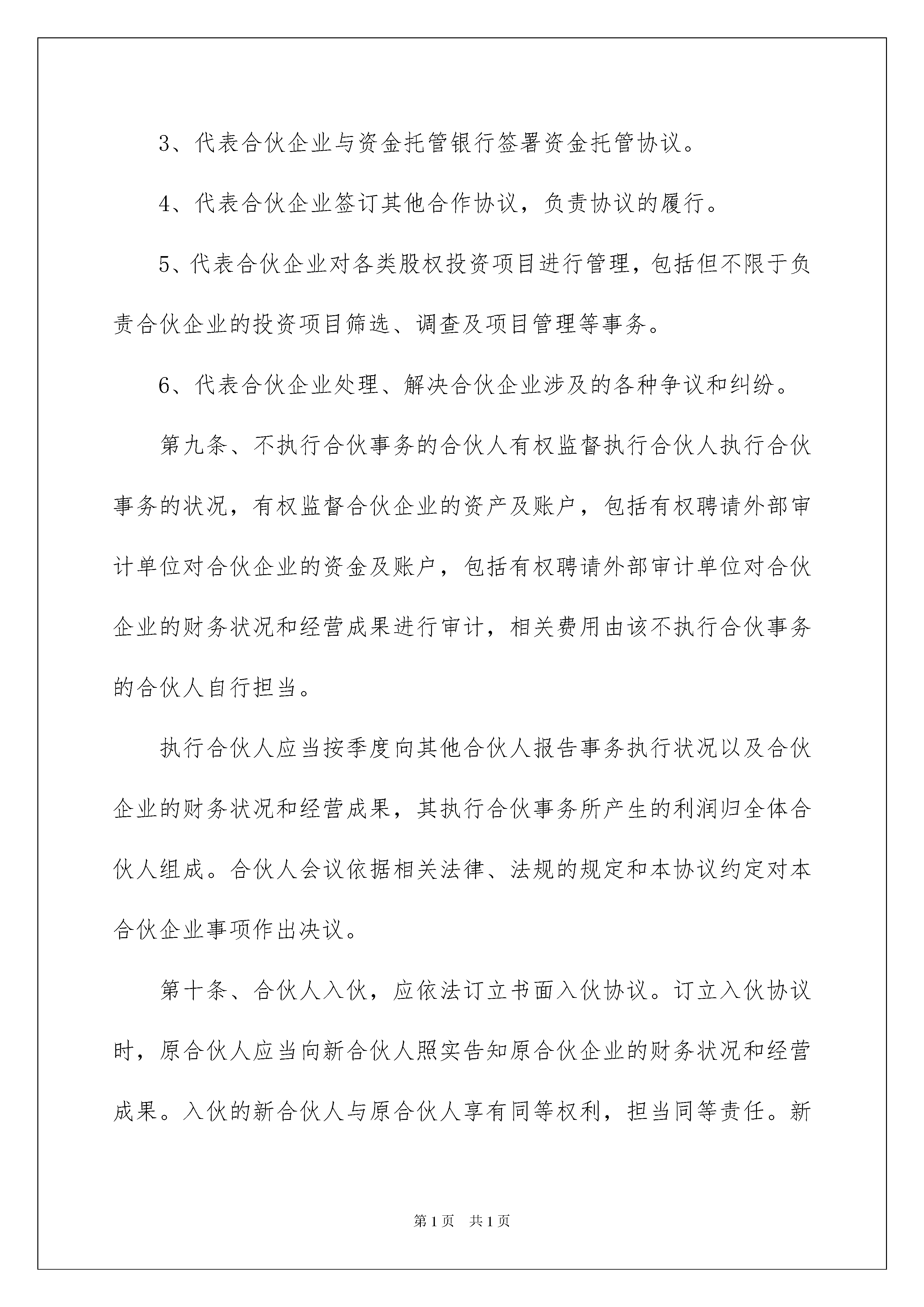 2022gp合作协议新gp合作协议范本2022新甲方:法定代表人:联系地址:联系电话:乙方:法定代表人:联系地址:风险提示:合作的方式多种多样,如合作设立公司、合作开发软件、合作购销产品等等,不同合作方式涉及到不同的项目内容,相应的协议条款可能大不相同。本协议的条款设置建立在特定项目的基础上,仅供参考。实践中,须要依据双方实际的合作方式、项目内容、权利义务等,修改或重新拟定条款。甲乙双方遵照公允、自愿、互利、诚恳守信的原则,经友好协商依法就合作设立_______投资基金管理中心(有限合伙)合伙企业达成如下协议:第一条、合作项目甲乙双方自愿共同作为一般合伙人合作设立_______投资基金管理中心(有限合伙)合伙企业(以下简称本合伙企业或合伙企业),本合伙企业作为私募证券投资基金的组织载体,受托管理私募股权投资基金,从事投融资管理及相关询问服务,为基金追求效益最大化,实现合伙企业自有资产的增值保值,使合伙人获得可能的最大的投资回报。其次条、本协议条款与法律、行政法规、规章不符的,以法律、行政法规、规章为准。第三条、合伙期限为_______年,上述期限自合伙企业的营业执照签发之日起计算。全体合伙人一样同意后,可以延长或缩短上述合伙期限。风险提示:应明确约定合作方式,尤其涉及到资金、技术、劳务等不同投入方式的。同时,应明确各自的权益份额,否则很简单在项目实际经营过程中就责任担当、盈亏分担等产生纠纷。第四条、合伙人的名称及出资方式、出资时间、数额和持股比例:合伙人的名称认缴状况:出资时间方式:首期出资数额剩余出资数额持股比例:第五条、合伙企业的利润,各合伙人按如下方式安排1、对于合伙企业取得的项目投资收益,_______人将获得收益分成,比例为合伙企业投资收益总额的_______%;_______人将获得收益分成,比例为合伙企业投资收益总额的_______%。2、若合伙企业资产净值高于合伙企业初始成立规模,_______方可提取资产超出初始规模部分的_______%作为业绩酬劳。第六条、合伙企业费用合伙企业应干脆担当的费用包括与合伙企业之设立、运营、终止、解散、清算等相关的下列费用:1、支付给资产管理公司的管理费用。2、开办费。3、合伙人会议费用。4、合伙企业年度审计所发生的审计费。5、必要的媒体费用。6、合伙企业自身发生地与投资业务及投资项目无关的其他律师费和询问费等。第七条、本合伙企业由_______执行合伙事务。执行合伙事务的合伙人(以下简称“执行合伙人”)对外代表合伙企业。风险提示:应明确约定合作各方的权利义务,以免在项目实际经营中出现扯皮的情形。再次温馨提示:因合作方式、项目内容不一样,各方的权利义务条款也不一样,应依据实际状况进行拟定。第八条、执行合伙人的权限1、执行合伙企业日常事务,办理合伙企业经营过程中相关审批手续。2、负责合伙企业与资产管理公司之间的资产管理协议的签订,通过签订资产管理协议由资产管理公司对合伙企业的财产进行管理。3、代表合伙企业与资金托管银行签署资金托管协议。4、代表合伙企业签订其他合作协议,负责协议的履行。5、代表合伙企业对各类股权投资项目进行管理,包括但不限于负责合伙企业的投资项目筛选、调查及项目管理等事务。6、代表合伙企业处理、解决合伙企业涉及的各种争议和纠纷。第九条、不执行合伙事务的合伙人有权监督执行合伙人执行合伙事务的状况,有权监督合伙企业的资产及账户,包括有权聘请外部审计单位对合伙企业的资金及账户,包括有权聘请外部审计单位对合伙企业的财务状况和经营成果进行审计,相关费用由该不执行合伙事务的合伙人自行担当。执行合伙人应当按季度向其他合伙人报告事务执行状况以及合伙企业的财务状况和经营成果,其执行合伙事务所产生的利润归全体合伙人组成。合伙人会议依据相关法律、法规的规定和本协议约定对本合伙企业事项作出决议。第十条、合伙人入伙,应依法订立书面入伙协议。订立入伙协议时,原合伙人应当向新合伙人照实告知原合伙企业的财务状况和经营成果。入伙的新合伙人与原合伙人享有同等权利,担当同等责任。新入伙的有限合伙人对入伙前合伙企业的债务以其认缴的出资额为限担当责任。第十一条、有下列情形之一的,合伙人可以退伙1、本协议约定的退伙事由出现。2、经全体合伙人一样同意。3、发生合伙人难以接着参与合伙的事由。4、其他合伙人严峻违反本协议约定的义务。5、合伙企业累计亏损超过总出资额50%时,有限合伙人可以退伙。合伙人退伙应当提前30日通知其他合伙人。擅自退伙的,应当赔偿由此给其他合伙人造成的损失;除非发生不行抗力情愿或进入解散、清算程序。第十二条、合伙人有下列情形之一的,经其