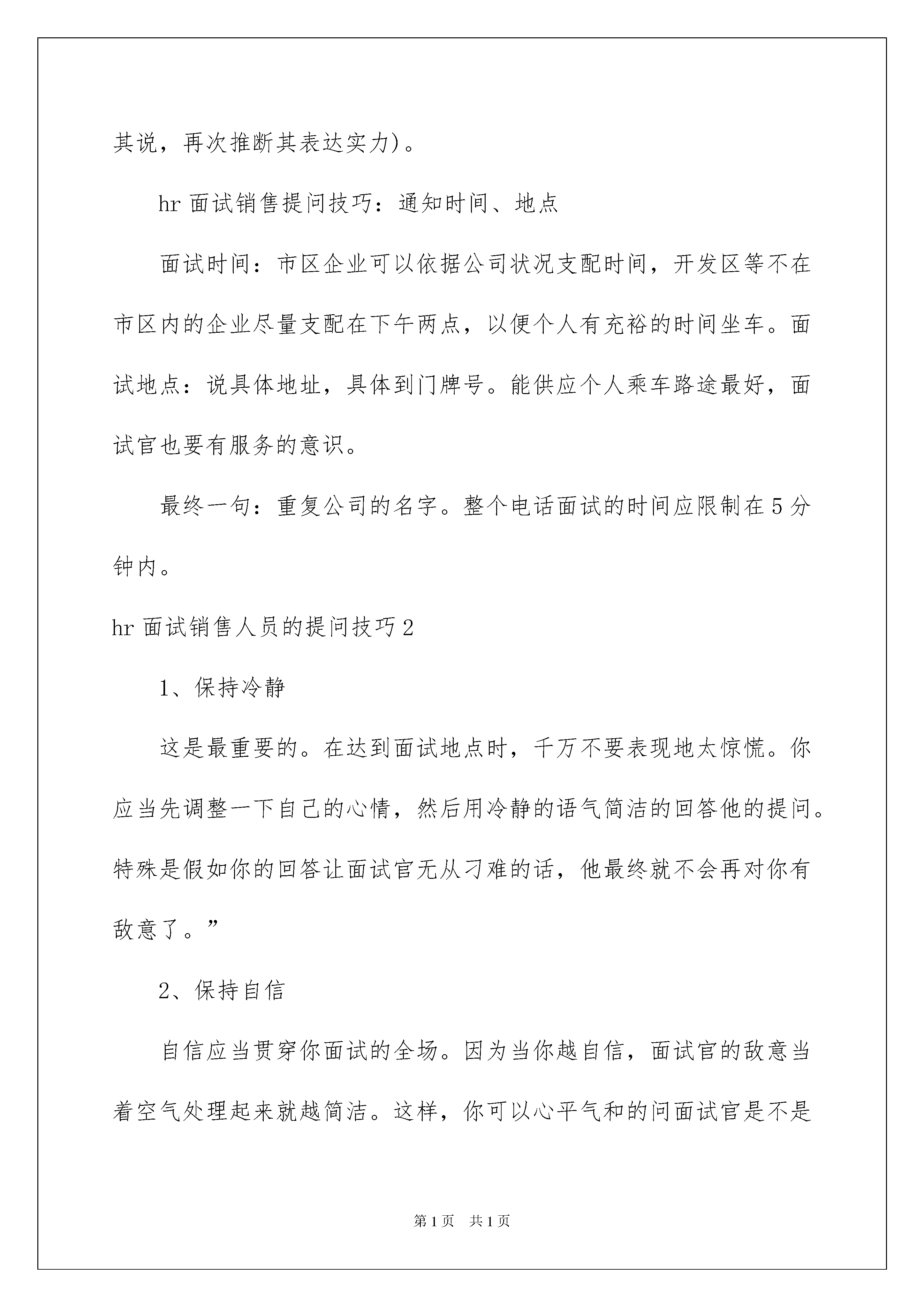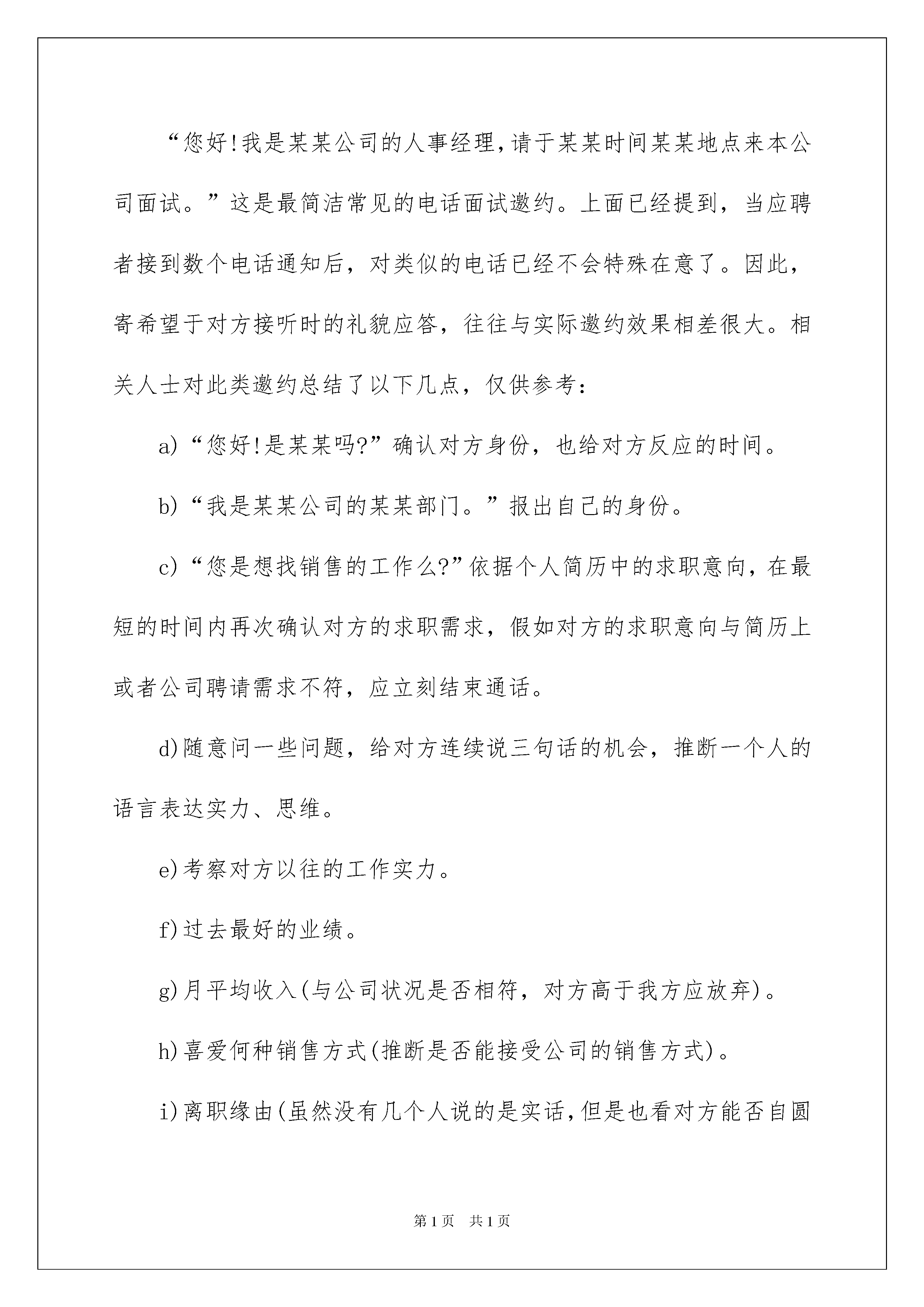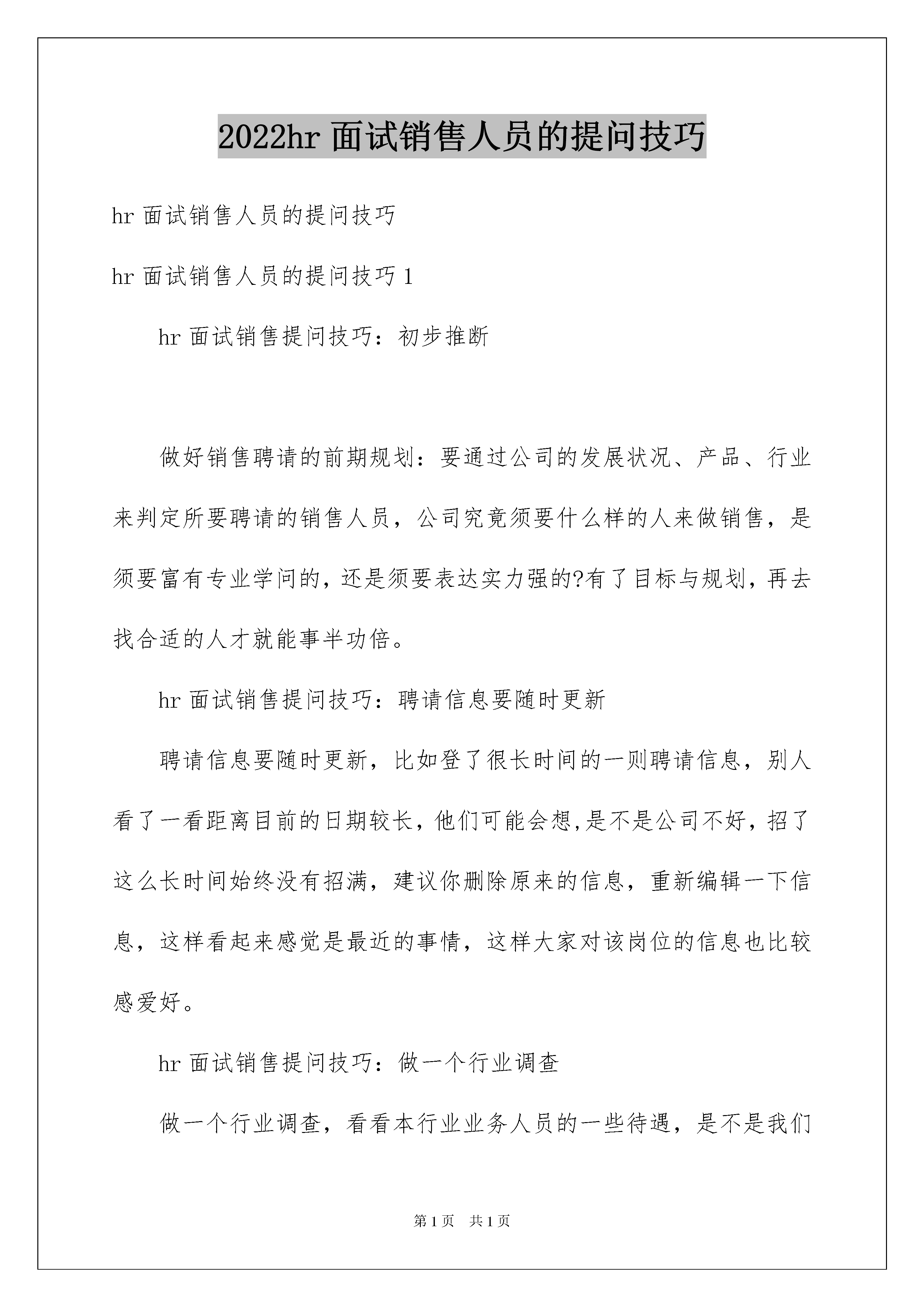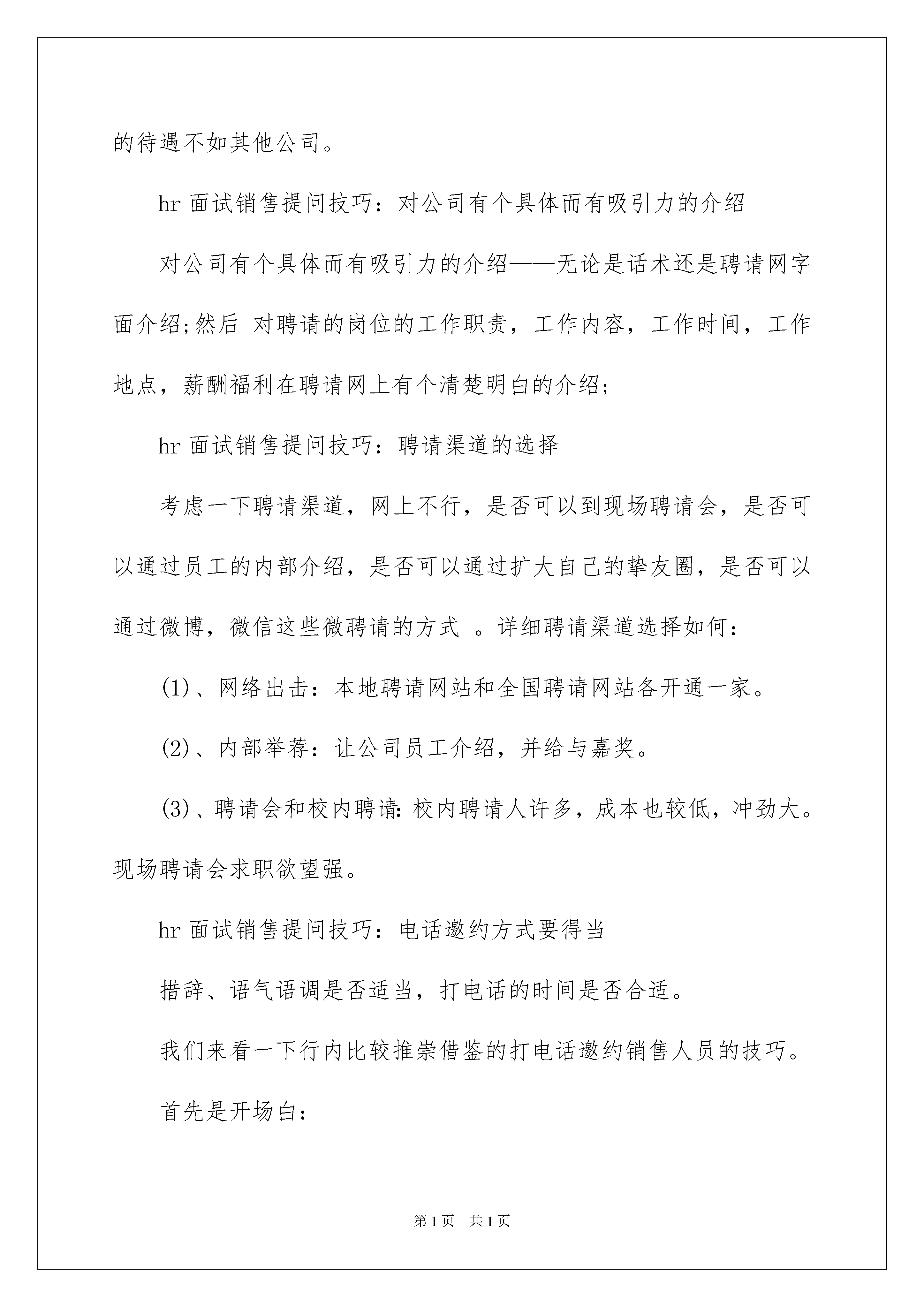 2022hr面试销售人员的提问技巧hr面试销售人员的提问技巧hr面试销售人员的提问技巧1hr面试销售提问技巧:初步推断做好销售聘请的前期规划:要通过公司的发展状况、产品、行业来判定所要聘请的销售人员,公司究竟须要什么样的人来做销售,是须要富有专业学问的,还是须要表达实力强的?有了目标与规划,再去找合适的人才就能事半功倍。hr面试销售提问技巧:聘请信息要随时更新聘请信息要随时更新,比如登了很长时间的一则聘请信息,别人看了一看距离目前的日期较长,他们可能会想,是不是公司不好,招了这么长时间始终没有招满,建议你删除原来的信息,重新编辑一下信息,这样看起来感觉是最近的事情,这样大家对该岗位的信息也比较感爱好。hr面试销售提问技巧:做一个行业调查做一个行业调查,看看本行业业务人员的一些待遇,是不是我们的待遇不如其他公司。hr面试销售提问技巧:对公司有个具体而有吸引力的介绍对公司有个具体而有吸引力的介绍——无论是话术还是聘请网字面介绍;然后对聘请的岗位的工作职责,工作内容,工作时间,工作地点,薪酬福利在聘请网上有个清楚明白的介绍;hr面试销售提问技巧:聘请渠道的选择考虑一下聘请渠道,网上不行,是否可以到现场聘请会,是否可以通过员工的内部介绍,是否可以通过扩大自己的挚友圈,是否可以通过微博,微信这些微聘请的方式。详细聘请渠道选择如何:(1)、网络出击:本地聘请网站和全国聘请网站各开通一家。(2)、内部举荐:让公司员工介绍,并给与嘉奖。(3)、聘请会和校内聘请:校内聘请人许多,成本也较低,冲劲大。现场聘请会求职欲望强。hr面试销售提问技巧:电话邀约方式要得当措辞、语气语调是否适当,打电话的时间是否合适。我们来看一下行内比较推崇借鉴的打电话邀约销售人员的技巧。首先是开场白:“您好!我是某某公司的人事经理,请于某某时间某某地点来本公司面试。”这是最简洁常见的电话面试邀约。上面已经提到,当应聘者接到数个电话通知后,对类似的电话已经不会特殊在意了。因此,寄希望于对方接听时的礼貌应答,往往与实际邀约效果相差很大。相关人士对此类邀约总结了以下几点,仅供参考:a)“您好!是某某吗?”确认对方身份,也给对方反应的时间。b)“我是某某公司的某某部门。”报出自己的身份。c)“您是想找销售的工作么?”依据个人简历中的求职意向,在最短的时间内再次确认对方的求职需求,假如对方的求职意向与简历上或者公司聘请需求不符,应立刻结束通话。d)随意问一些问题,给对方连续说三句话的机会,推断一个人的语言表达实力、思维。e)考察对方以往的工作实力。f)过去最好的业绩。g)月平均收入(与公司状况是否相符,对方高于我方应放弃)。h)喜爱何种销售方式(推断是否能接受公司的销售方式)。i)离职缘由(虽然没有几个人说的是实话,但是也看对方能否自圆其说,再次推断其表达实力)。hr面试销售提问技巧:通知时间、地点面试时间:市区企业可以依据公司状况支配时间,开发区等不在市区内的企业尽量支配在下午两点,以便个人有充裕的时间坐车。面试地点:说具体地址,具体到门牌号。能供应个人乘车路途最好,面试官也要有服务的意识。最终一句:重复公司的名字。整个电话面试的时间应限制在5分钟内。hr面试销售人员的提问技巧21、保持冷静这是最重要的。在达到面试地点时,千万不要表现地太惊慌。你应当先调整一下自己的心情,然后用冷静的语气简洁的回答他的提问。特殊是假如你的回答让面试官无从刁难的话,他最终就不会再对你有敌意了。”2、保持自信自信应当贯穿你面试的全场。因为当你越自信,面试官的敌意当着空气处理起来就越简洁。这样,你可以心平气和的问面试官是不是哪里出错了,还是现在面试的时机不恰当。面试官的敌意常常可能是一些与面试完全无关的事情造成的:可能他心情很差,为什么事情而难过,或者工作交期催得很急等等。3.、说话谨慎或许你的许多资料已经写在简历上了,但是面试官还是会问你许多问题。这个时候,你应当分清晰,你面对的是面试官,而不是挚友。不管是说话的语气,还是礼貌用语,都应当把握分寸。特殊是说话要经过大脑思索一番。4、解决争端可能会出现的问题是,你很不幸的遇到了一个刁难你的面试官。当你面对一位有敌意的面试官时,最好的方法就是停下来,问问他/她,是不是你在面试中说了什么让他生气的话冒犯到他了?许多时候,人们并没有相识到自己正在说的话(做的事情)会让人不开心。当他们意识到以后,就会立刻不着痕迹的'调整过来。5、笑着接受它假如面试官看法很恶劣,他可能已经中意了其他好的候选人了。你此时的唯一目标就是进入下一个步骤。找出下一步须要做什么,并努力去达到这一目标。6、优雅地离开不管结局如何,都请你