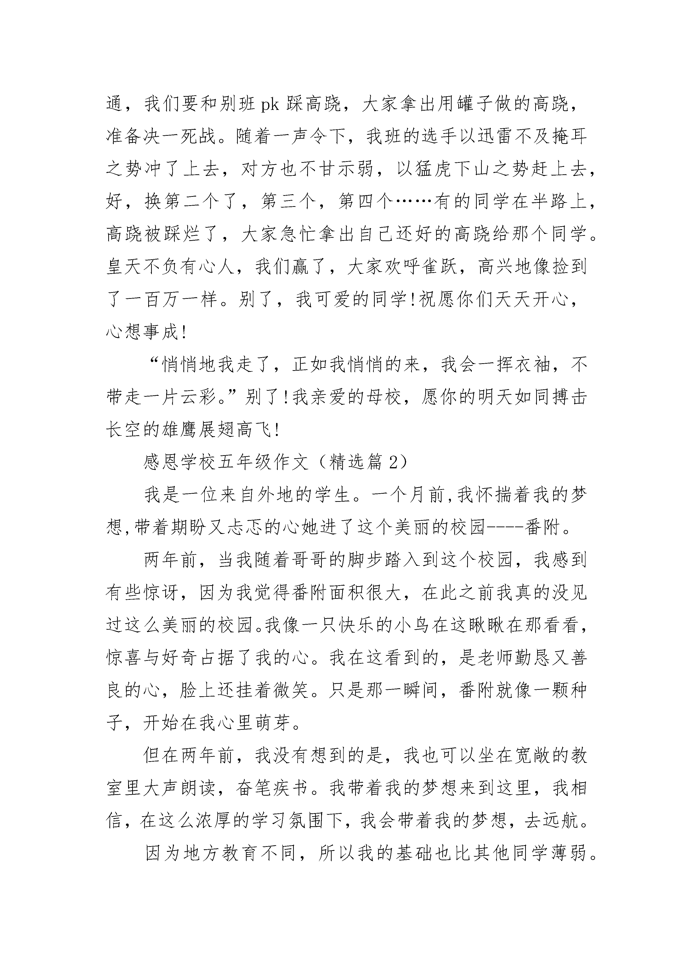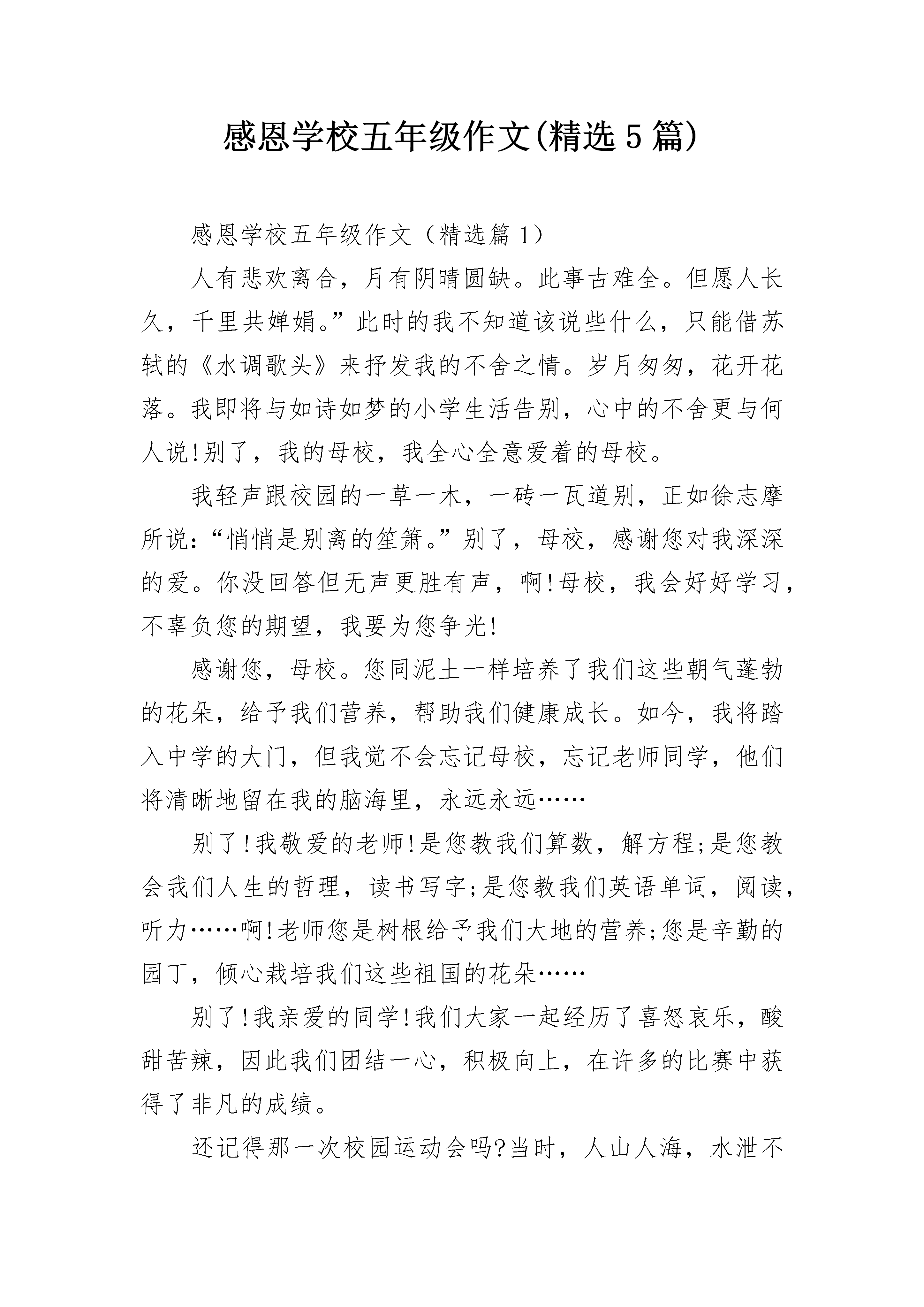 感恩学校五年级作文(精选5篇)感恩学校五年级作文(精选篇1)人有悲欢离合,月有阴晴圆缺。此事古难全。但愿人长久,千里共婵娟。”此时的我不知道该说些什么,只能借苏轼的《水调歌头》来抒发我的不舍之情。岁月匆匆,花开花落。我即将与如诗如梦的小学生活告别,心中的不舍更与何人说!别了,我的母校,我全心全意爱着的母校。我轻声跟校园的一草一木,一砖一瓦道别,正如徐志摩所说:“悄悄是别离的笙箫。”别了,母校,感谢您对我深深的爱。你没回答但无声更胜有声,啊!母校,我会好好学习,不辜负您的期望,我要为您争光!感谢您,母校。您同泥土一样培养了我们这些朝气蓬勃的花朵,给予我们营养,帮助我们健康成长。如今,我将踏入中学的大门,但我觉不会忘记母校,忘记老师同学,他们将清晰地留在我的脑海里,永远永远……别了!我敬爱的老师!是您教我们算数,解方程;是您教会我们人生的哲理,读书写字;是您教我们英语单词,阅读,听力……啊!老师您是树根给予我们大地的营养;您是辛勤的园丁,倾心栽培我们这些祖国的花朵……别了!我亲爱的同学!我们大家一起经历了喜怒哀乐,酸甜苦辣,因此我们团结一心,积极向上,在许多的比赛中获得了非凡的成绩。还记得那一次校园运动会吗?当时,人山人海,水泄不通,我们要和别班pk踩高跷,大家拿出用罐子做的高跷,准备决一死战。随着一声令下,我班的选手以迅雷不及掩耳之势冲了上去,对方也不甘示弱,以猛虎下山之势赶上去,好,换第二个了,第三个,第四个……有的同学在半路上,高跷被踩烂了,大家急忙拿出自己还好的高跷给那个同学。皇天不负有心人,我们赢了,大家欢呼雀跃,高兴地像捡到了一百万一样。别了,我可爱的同学!祝愿你们天天开心,心想事成!“悄悄地我走了,正如我悄悄的来,我会一挥衣袖,不带走一片云彩。”别了!我亲爱的母校,愿你的明天如同搏击长空的雄鹰展翅高飞!感恩学校五年级作文(精选篇2)我是一位来自外地的学生。一个月前,我怀揣着我的梦想,带着期盼又忐忑的心她进了这个美丽的校园----番附。两年前,当我随着哥哥的脚步踏入到这个校园,我感到有些惊讶,因为我觉得番附面积很大,在此之前我真的没见过这么美丽的校园。我像一只快乐的小鸟在这瞅瞅在那看看,惊喜与好奇占据了我的心。我在这看到的,是老师勤恳又善良的心,脸上还挂着微笑。只是那一瞬间,番附就像一颗种子,开始在我心里萌芽。但在两年前,我没有想到的是,我也可以坐在宽敞的教室里大声朗读,奋笔疾书。我带着我的梦想来到这里,我相信,在这么浓厚的学习氛围下,我会带着我的梦想,去远航。因为地方教育不同,所以我的基础也比其他同学薄弱。第一天上课,就感到了很大的压力,我无所适从。于是,老师过来开导我。她告诉我,这是正常的,有挫折才会让你成长。看到别人比你优秀,你在走上坡路;看到别人比你差,那就是在走下坡路啦。我们谈了许久,老师温暖的的话语就像母亲的手,慢慢地抚平我心里的不安与恐惧,让我很感动。学习上有许多不明白的地方我会去问老师。刚开始的时候我很害怕,害怕他们说我太笨,会轻视我。可是令我惊讶的是,他们没有责骂我,反倒是带着笑容,耐心地给我详细分析,循循教导深深地刻在我的脑海里,每次想起,都倍感温暖。作为留校的学生,周末的时候在偌大的校园里,接触得最多的,便是孤独了。我常常看月亮——“我们都在同一片天空下”这也是对想家的我来说最大的慰藉了。每当孤独一人的时候,黑暗和恐惧总是包围着我。可每当在这时,总会有盏灯,照亮我前方的路。我惊喜,走过去一看,那是老师备课的背影。我知道,麻烦到他们了。周末的私人时间也分给了我们,老师们都很辛苦,很勤恳。那盏灯,像一剂强心针,瞬间给我带来力量。晶莹的液体便又充满眼眶,心里满满的幸福。记得有一次晚自习,因为去开了一个小会回来,作业没有写完,剩下化学作业。我当时静不下心来,问题困扰着我,着急难过又想家的我,眼泪一下子就出来了,怎么止也止不住。然后有几个同学发现了,都赶忙过来安慰我。那时候还不认识她们,她们便开始手忙脚乱地安抚我,给我擦眼泪,一位同学还自告奋勇地开始给我讲解题目。当时我的心感动得快融化了,眼泪就更止不住了,同学们带给我的温暖,我想我这辈子也不会忘记的。每当我漫步在这个美丽的校园,鸟儿美妙的歌声和花的香气都萦绕着我。带给我蓬勃向上的朝气和温暖。我不会忘了我来学校的初衷——那便是我的梦想,而番附,则是我梦想起航的地方,像太阳一样指引着我,照亮我前方的路,也给我带来了温暖。感恩学校五年级作文(精选篇3)“我来自偶然,像一颗尘土。有谁看出我的脆弱。我来自何方,我情归何处,谁在下一刻呼唤我。天地虽宽,这条路却难走。我还有多少爱,我还有多少泪。要苍天知道,我不认输!”每每唱起这首歌,我就自然地想起母校。因为是母校让我懂得了感恩,是母校让我放飞了理想!世间万事万物都有理想。老鹰的理想是飞向蓝天,小鸡的理想是一把米糠,