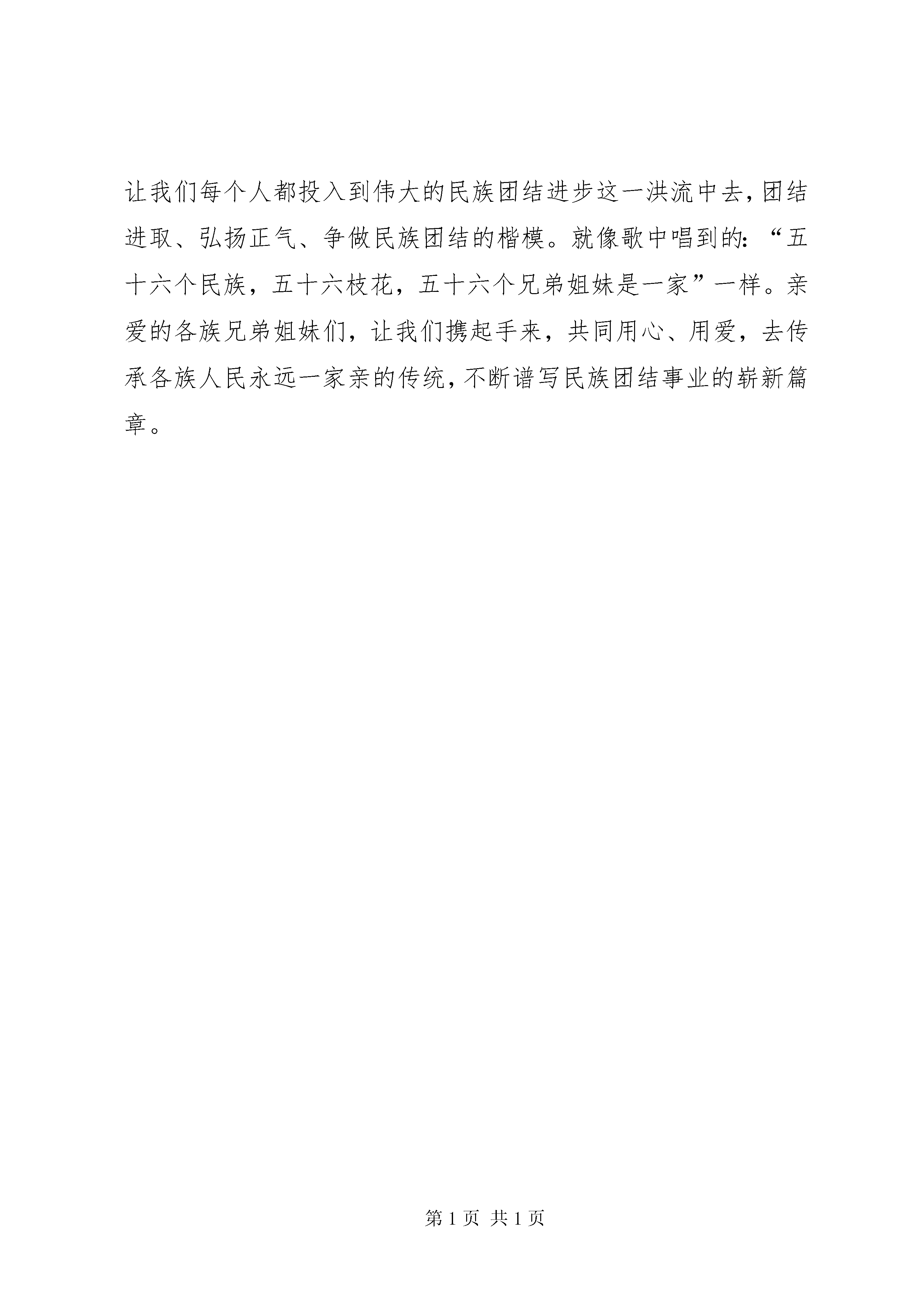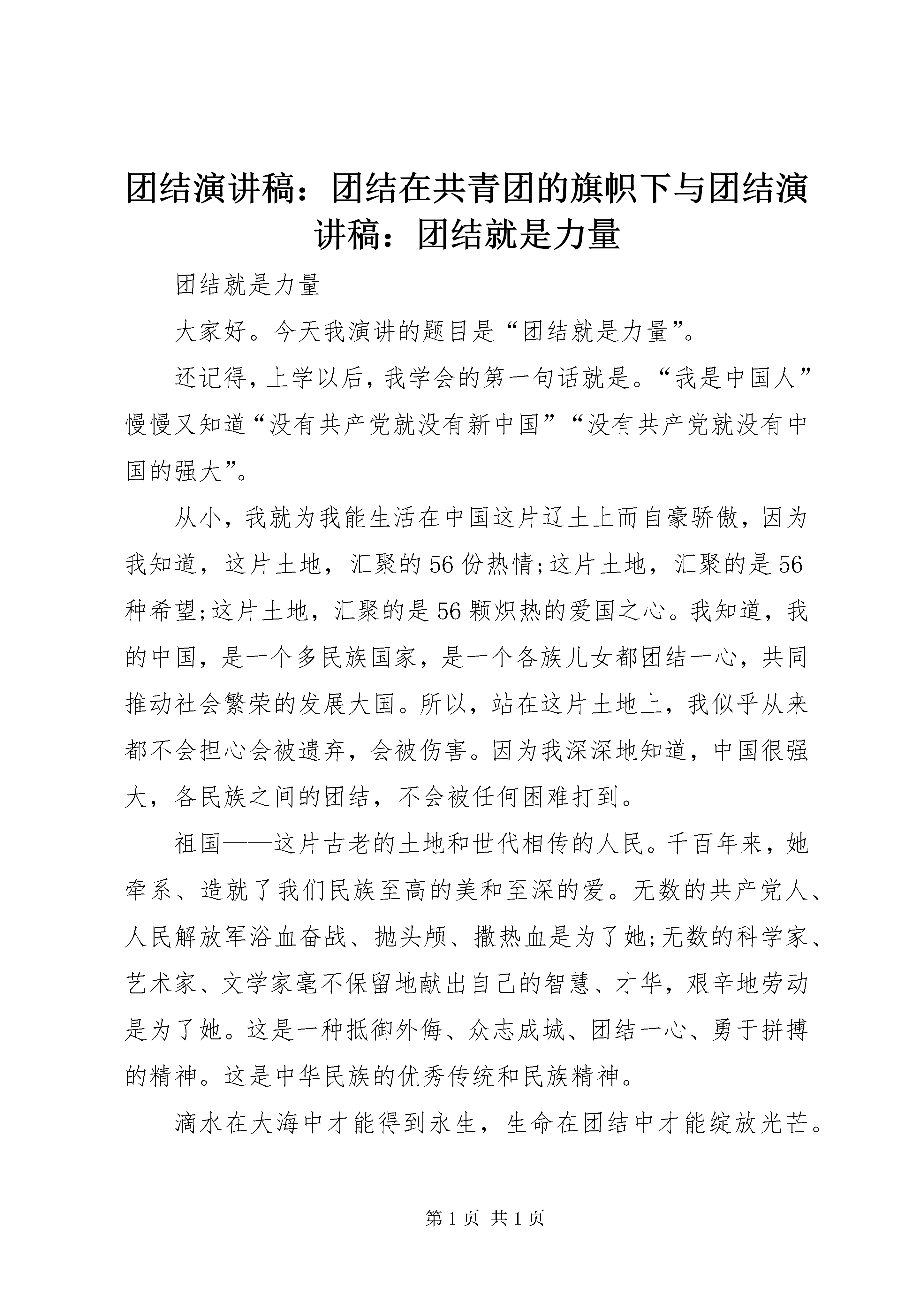 团结演讲稿:团结在共青团的旗帜下与团结演讲稿:团结就是力量团结就是力量大家好。今天我演讲的题目是“团结就是力量”。还记得,上学以后,我学会的第一句话就是。“我是中国人”慢慢又知道“没有共产党就没有新中国”“没有共产党就没有中国的强大”。从小,我就为我能生活在中国这片辽土上而自豪骄傲,因为我知道,这片土地,汇聚的56份热情;这片土地,汇聚的是56种希望;这片土地,汇聚的是56颗炽热的爱国之心。我知道,我的中国,是一个多民族国家,是一个各族儿女都团结一心,共同推动社会繁荣的发展大国。所以,站在这片土地上,我似乎从来都不会担心会被遗弃,会被伤害。因为我深深地知道,中国很强大,各民族之间的团结,不会被任何困难打到。祖国——这片古老的土地和世代相传的人民。千百年来,她牵系、造就了我们民族至高的美和至深的爱。无数的共产党人、人民解放军浴血奋战、抛头颅、撒热血是为了她;无数的科学家、艺术家、文学家毫不保留地献出自己的智慧、才华,艰辛地劳动是为了她。这是一种抵御外侮、众志成城、团结一心、勇于拼搏的精神。这是中华民族的优秀传统和民族精神。滴水在大海中才能得到永生,生命在团结中才能绽放光芒。让我们每个人都投入到伟大的民族团结进步这一洪流中去,团结进取、弘扬正气、争做民族团结的楷模。就像歌中唱到的:“五十六个民族,五十六枝花,五十六个兄弟姐妹是一家”一样。亲爱的各族兄弟姐妹们,让我们携起手来,共同用心、用爱,去传承各族人民永远一家亲的传统,不断谱写民族团结事业的崭新篇章。
