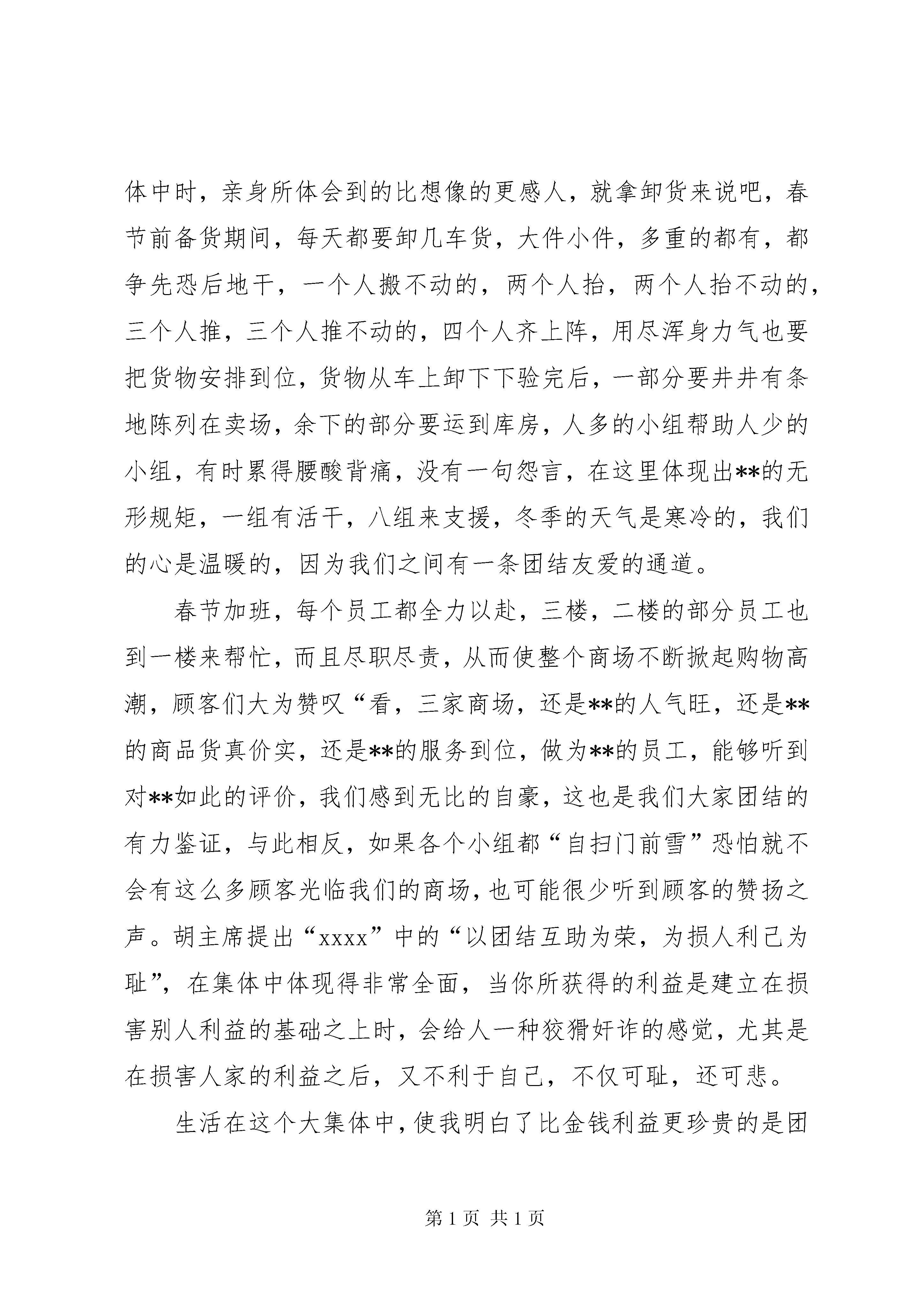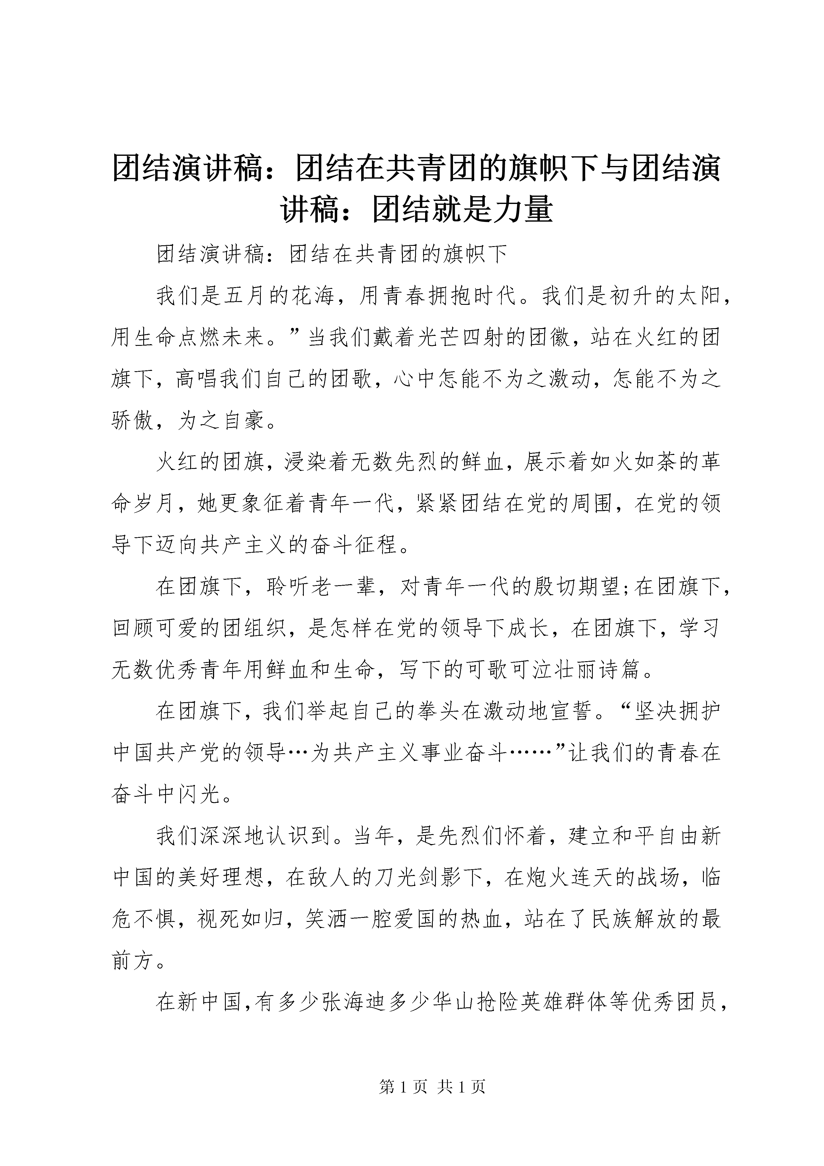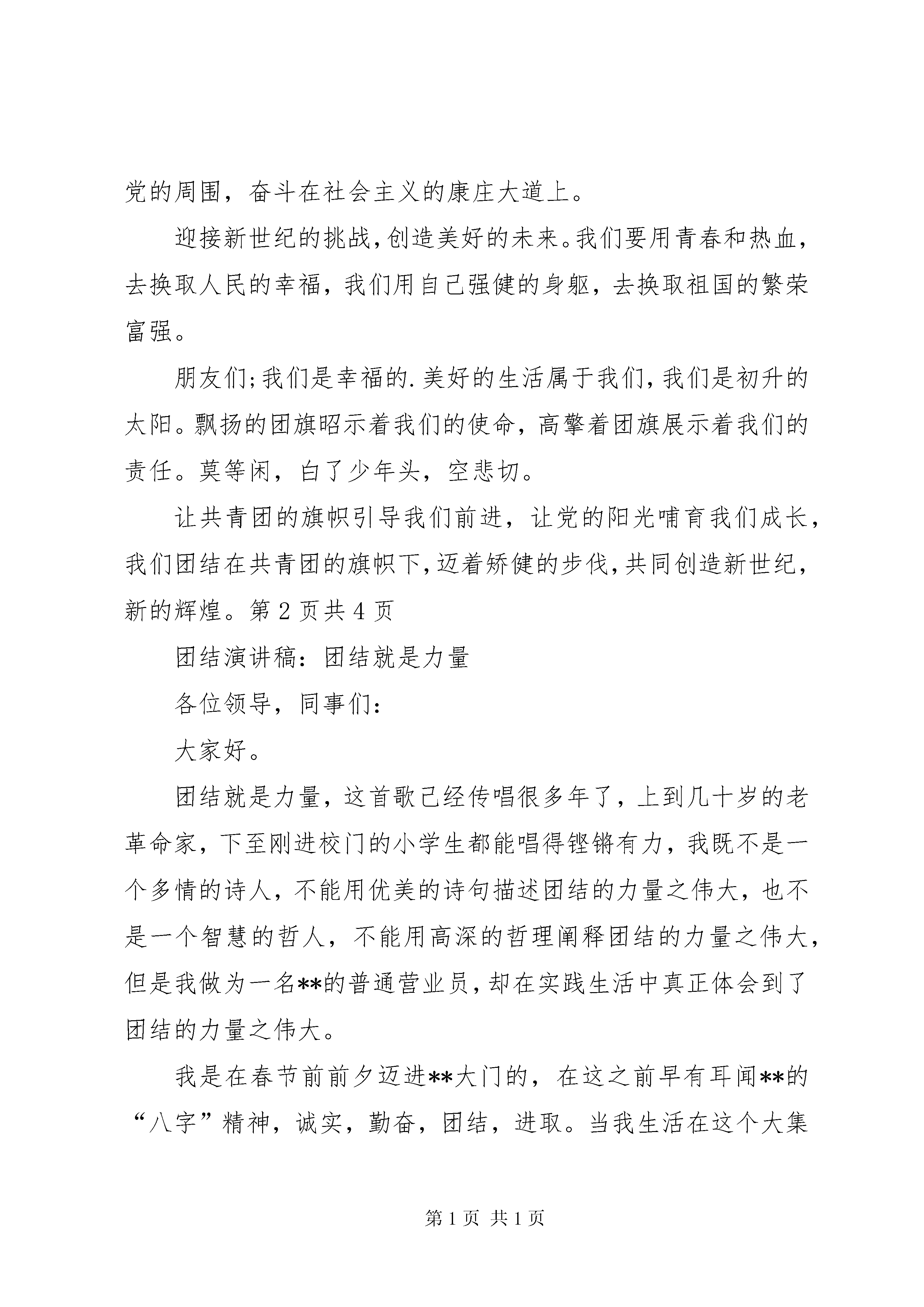 团结演讲稿:团结在共青团的旗帜下与团结演讲稿:团结就是力量团结演讲稿:团结在共青团的旗帜下我们是五月的花海,用青春拥抱时代。我们是初升的太阳,用生命点燃未来。”当我们戴着光芒四射的团徽,站在火红的团旗下,高唱我们自己的团歌,心中怎能不为之激动,怎能不为之骄傲,为之自豪。火红的团旗,浸染着无数先烈的鲜血,展示着如火如荼的革命岁月,她更象征着青年一代,紧紧团结在党的周围,在党的领导下迈向共产主义的奋斗征程。在团旗下,聆听老一辈,对青年一代的殷切期望;在团旗下,回顾可爱的团组织,是怎样在党的领导下成长,在团旗下,学习无数优秀青年用鲜血和生命,写下的可歌可泣壮丽诗篇。在团旗下,我们举起自己的拳头在激动地宣誓。“坚决拥护中国共产党的领导…为共产主义事业奋斗……”让我们的青春在奋斗中闪光。我们深深地认识到。当年,是先烈们怀着,建立和平自由新中国的美好理想,在敌人的刀光剑影下,在炮火连天的战场,临危不惧,视死如归,笑洒一腔爱国的热血,站在了民族解放的最前方。在新中国,有多少张海迪多少华山抢险英雄群体等优秀团员,为振兴中华而英勇地拼搏。又有多少向秀丽、雷锋等英雄们在团旗下成长。他们有坚定的共产主义信念,有为之献身的共产主义精神,他们为社会主义建设事业献身,而感到无尚荣光。火红的团旗,让我扬起了生活的风帆,懂得了人生的价值;更让我身深深地眷恋着这方热土。虽然,这里不是历史悠久的古都名城,没有南国的热闹繁华,没有南国的温润细美,更没有南国的富饶秀丽,但这里有挺拔巍峨的祁连山,有承载着历史沧桑的黑河水,有勤劳朴实、干劲十足的领头人,更有战天斗地,薪火相传的古甘州遗风。新世纪的春风,掀起我们感情的浪花,在山山水水之间荡漾。在我们这片既贫瘠而又荒凉的土地上,有许多青年团员,奋斗了一代又一代,他们为可爱的家乡洒下了辛勤的汗水,随着古老黑河的日月流淌。面对生活的困境,他们没有迷惘,面对沧桑岁月,他们没有失望。如今,沉舟侧畔千帆过,病树前头万木春。我们来了,我们与你们携手并肩,锐意进取,奋战在家乡的各条战线上。面对繁华似锦的甘州,放眼未来,我们豪情满怀,心神激荡……共青团是党的助手,鲜红的团旗是青年人的希望。过去,是由于她引导革命前辈,同国内外反动势力,进行英勇地搏斗,革命的种子,播撒在中华大地上。如今,是她引导着我们,团结在党的周围,奋斗在社会主义的康庄大道上。迎接新世纪的挑战,创造美好的未来。我们要用青春和热血,去换取人民的幸福,我们用自己强健的身躯,去换取祖国的繁荣富强。朋友们;我们是幸福的.美好的生活属于我们,我们是初升的太阳。飘扬的团旗昭示着我们的使命,高擎着团旗展示着我们的责任。莫等闲,白了少年头,空悲切。让共青团的旗帜引导我们前进,让党的阳光哺育我们成长,我们团结在共青团的旗帜下,迈着矫健的步伐,共同创造新世纪,新的辉煌。团结演讲稿:团结就是力量各位领导,同事们:大家好。团结就是力量,这首歌己经传唱很多年了,上到几十岁的老革命家,下至刚进校门的小学生都能唱得铿锵有力,我既不是一个多情的诗人,不能用优美的诗句描述团结的力量之伟大,也不是一个智慧的哲人,不能用高深的哲理阐释团结的力量之伟大,但是我做为一名**的普通营业员,却在实践生活中真正体会到了团结的力量之伟大。我是在春节前前夕迈进**大门的,在这之前早有耳闻**的“八字”精神,诚实,勤奋,团结,进取。当我生活在这个大集体中时,亲身所体会到的比想像的更感人,就拿卸货来说吧,春节前备货期间,每天都要卸几车货,大件小件,多重的都有,都争先恐后地干,一个人搬不动的,两个人抬,两个人抬不动的,三个人推,三个人推不动的,四个人齐上阵,用尽浑身力气也要把货物安排到位,货物从车上卸下下验完后,一部分要井井有条地陈列在卖场,余下的部分要运到库房,人多的小组帮助人少的小组,有时累得腰酸背痛,没有一句怨言,在这里体现出**的无形规矩,一组有活干,八组来支援,冬季的天气是寒冷的,我们的心是温暖的,因为我们之间有一条团结友爱的通道。春节加班,每个员工都全力以赴,三楼,二楼的部分员工也到一楼来帮忙,而且尽职尽责,从而使整个商场不断掀起购物高潮,顾客们大为赞叹“看,三家商场,还是**的人气旺,还是**的商品货真价实,还是**的服务到位,做为**的员工,能够听到对**如此的评价,我们感到无比的自豪,这也是我们大家团结的有力鉴证,与此相反,如果各个小组都“自扫门前雪”恐怕就不会有这么多顾客光临我们的商场,也可能很少听到顾客的赞扬之声。胡主席提出“xxxx”中的“以团结互助为荣,为损人利己为耻”,在集体中体现得非常全面,当你所获得的利益是建立在损害别人利益的基础之上时,会给人一种狡猾奸诈的感觉,尤其是在损害人家的利益之后,又不利于自己,不仅可耻,还可悲。生活在这个大集体中,使我明