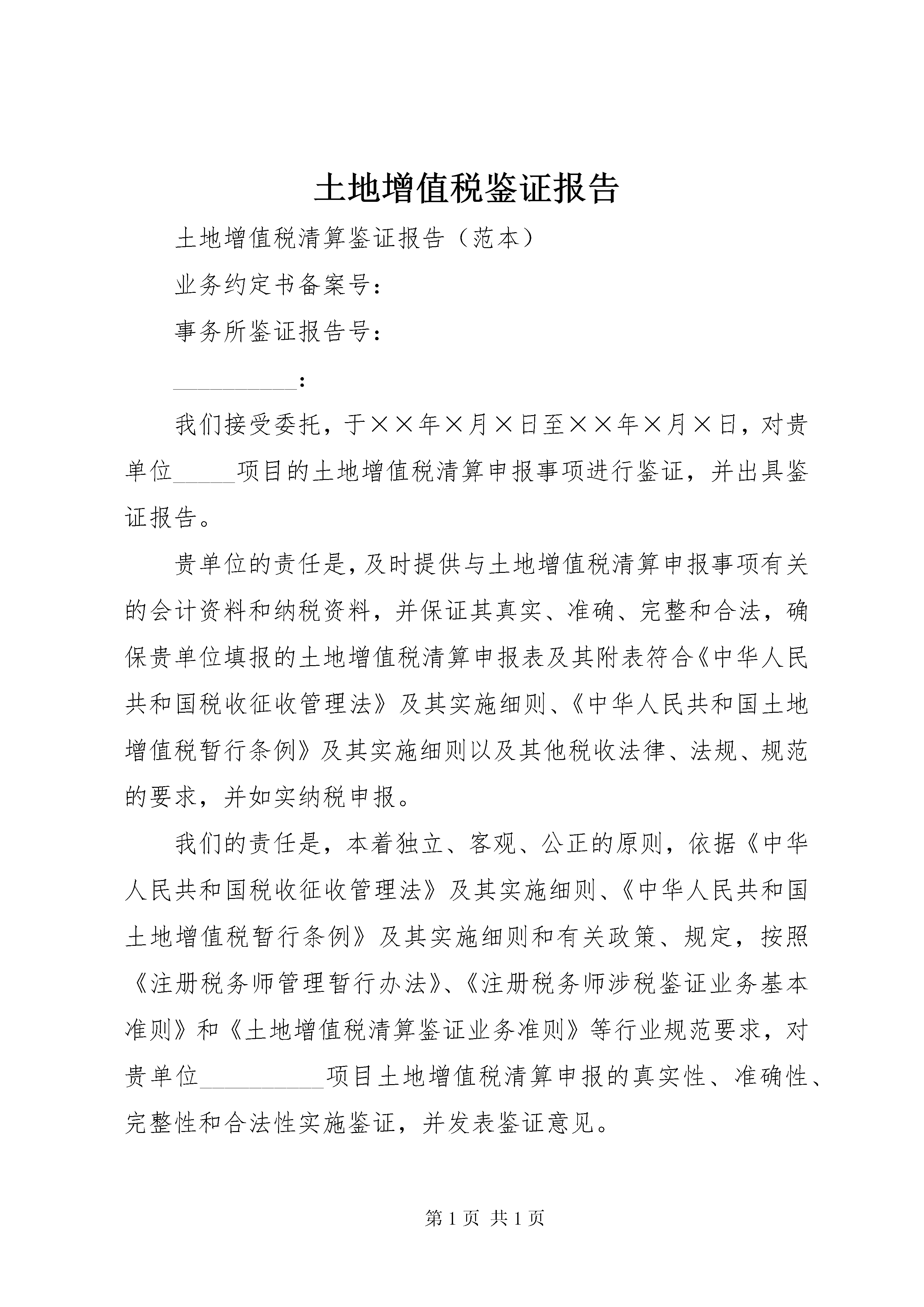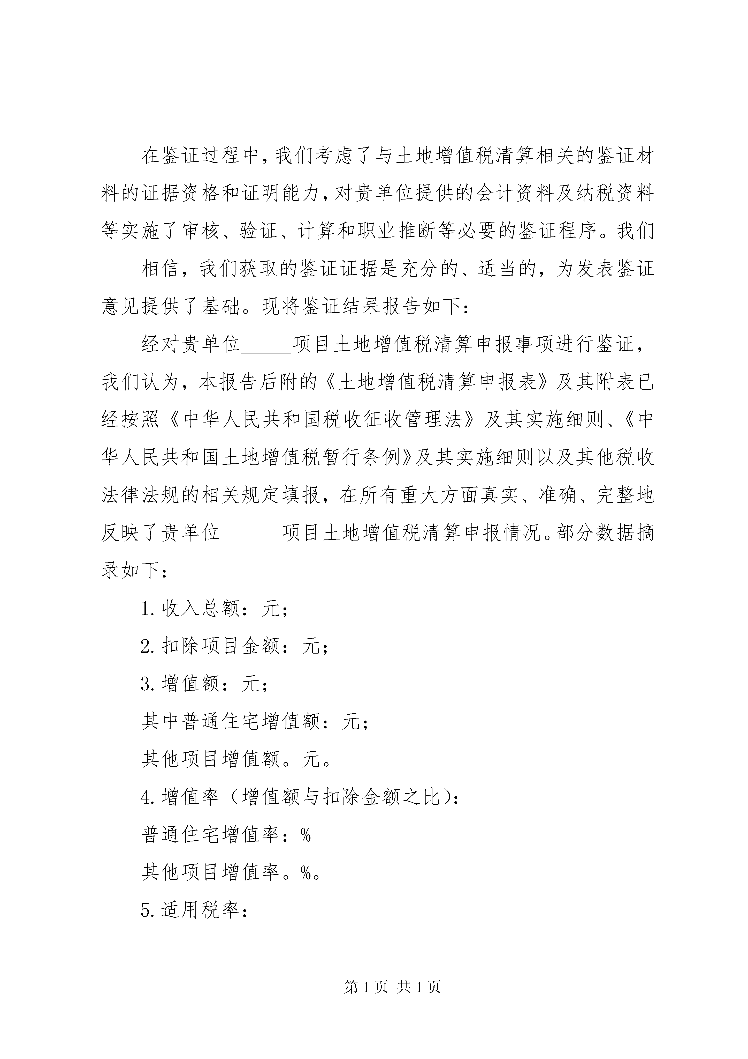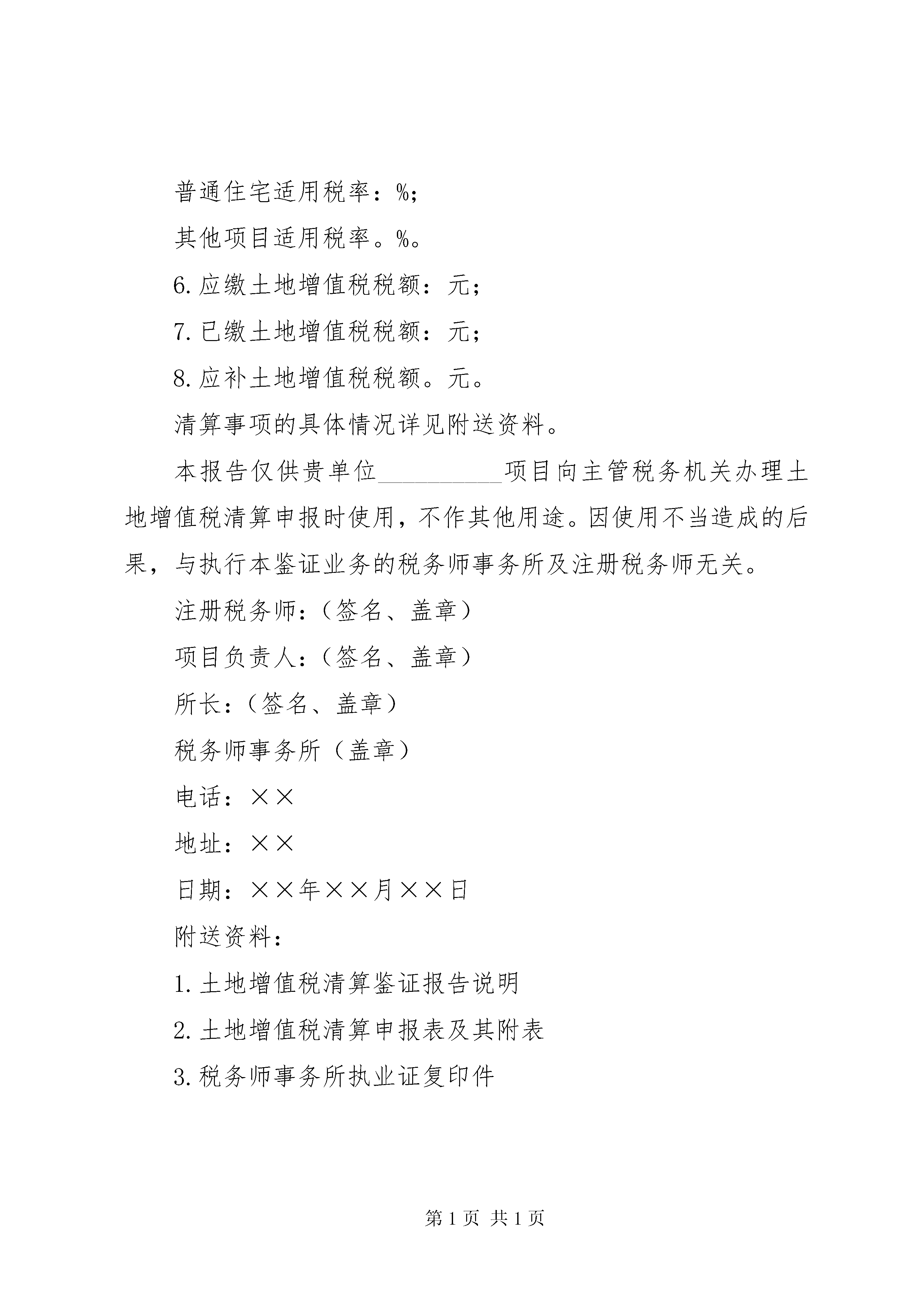 土地增值税鉴证报告土地增值税清算鉴证报告(范本)业务约定书备案号:事务所鉴证报告号:__________:我们接受委托,于××年×月×日至××年×月×日,对贵单位_____项目的土地增值税清算申报事项进行鉴证,并出具鉴证报告。贵单位的责任是,及时提供与土地增值税清算申报事项有关的会计资料和纳税资料,并保证其真实、准确、完整和合法,确保贵单位填报的土地增值税清算申报表及其附表符合《中华人民共和国税收征收管理法》及其实施细则、《中华人民共和国土地增值税暂行条例》及其实施细则以及其他税收法律、法规、规范的要求,并如实纳税申报。我们的责任是,本着独立、客观、公正的原则,依据《中华人民共和国税收征收管理法》及其实施细则、《中华人民共和国土地增值税暂行条例》及其实施细则和有关政策、规定,按照《注册税务师管理暂行办法》、《注册税务师涉税鉴证业务基本准则》和《土地增值税清算鉴证业务准则》等行业规范要求,对贵单位__________项目土地增值税清算申报的真实性、准确性、完整性和合法性实施鉴证,并发表鉴证意见。在鉴证过程中,我们考虑了与土地增值税清算相关的鉴证材料的证据资格和证明能力,对贵单位提供的会计资料及纳税资料等实施了审核、验证、计算和职业推断等必要的鉴证程序。我们相信,我们获取的鉴证证据是充分的、适当的,为发表鉴证意见提供了基础。现将鉴证结果报告如下:经对贵单位_____项目土地增值税清算申报事项进行鉴证,我们认为,本报告后附的《土地增值税清算申报表》及其附表已经按照《中华人民共和国税收征收管理法》及其实施细则、《中华人民共和国土地增值税暂行条例》及其实施细则以及其他税收法律法规的相关规定填报,在所有重大方面真实、准确、完整地反映了贵单位______项目土地增值税清算申报情况。部分数据摘录如下:1.收入总额:元;2.扣除项目金额:元;3.增值额:元;其中普通住宅增值额:元;其他项目增值额。元。4.增值率(增值额与扣除金额之比):普通住宅增值率:%其他项目增值率。%。5.适用税率:普通住宅适用税率:%;其他项目适用税率。%。6.应缴土地增值税税额:元;7.已缴土地增值税税额:元;8.应补土地增值税税额。元。清算事项的具体情况详见附送资料。本报告仅供贵单位__________项目向主管税务机关办理土地增值税清算申报时使用,不作其他用途。因使用不当造成的后果,与执行本鉴证业务的税务师事务所及注册税务师无关。注册税务师:(签名、盖章)项目负责人:(签名、盖章)所长:(签名、盖章)税务师事务所(盖章)电话:××地址:××日期:××年××月××日附送资料:1.土地增值税清算鉴证报告说明2.土地增值税清算申报表及其附表3.税务师事务所执业证复印件
