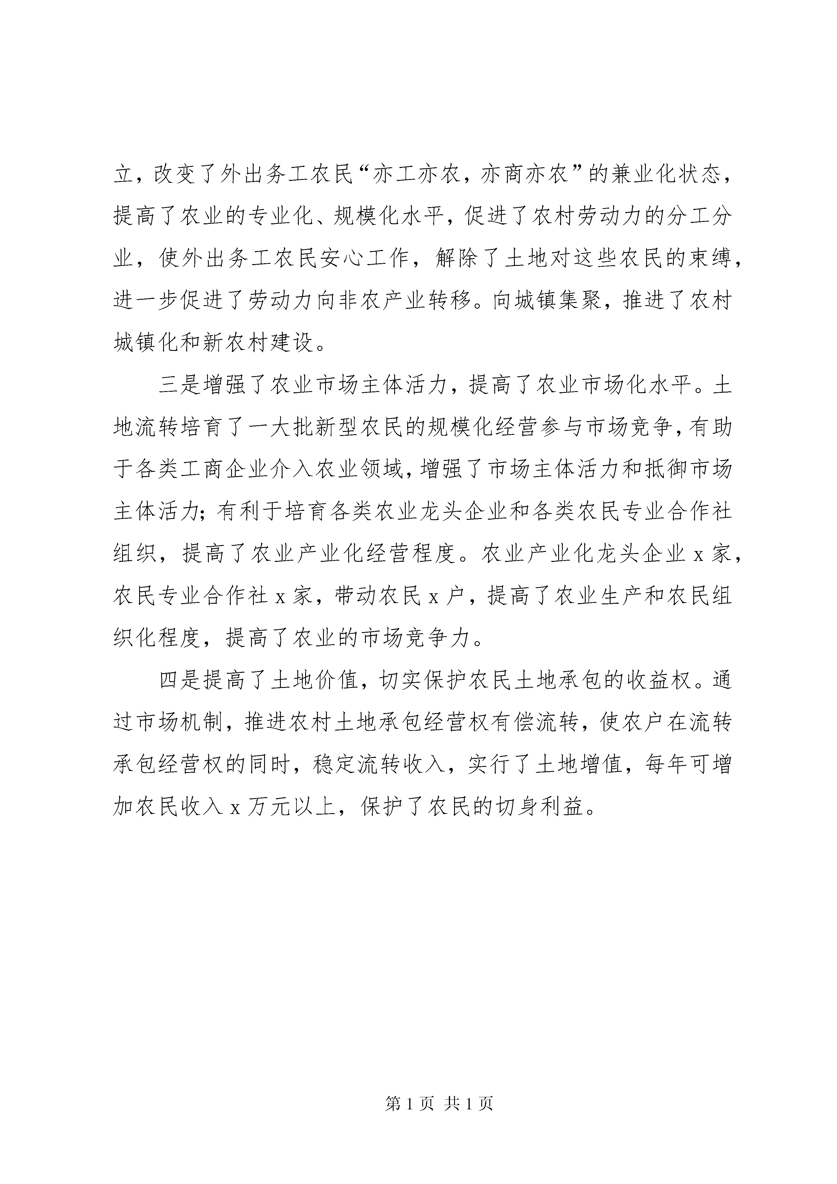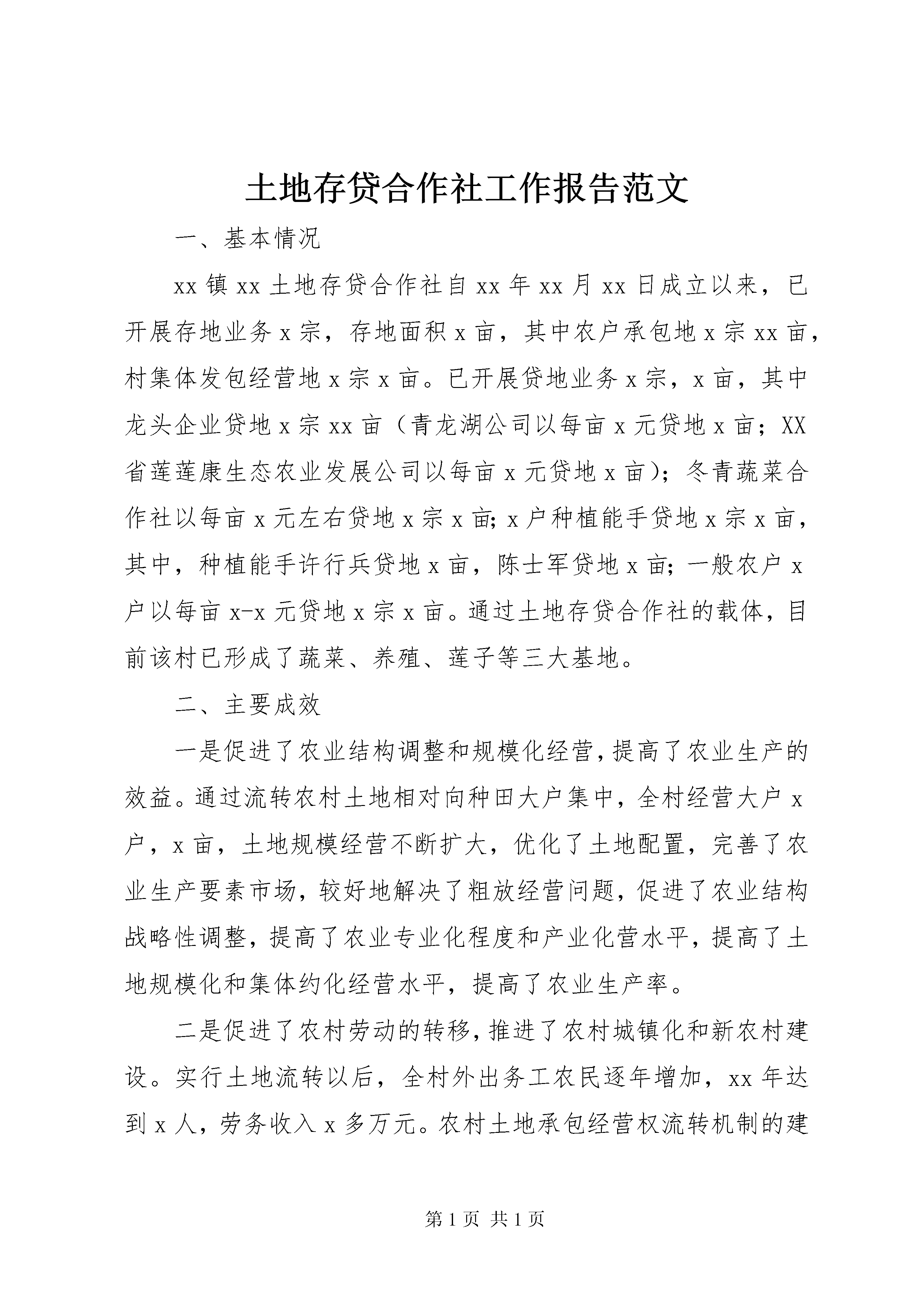 土地存贷合作社工作报告范文一、基本情况xx镇xx土地存贷合作社自xx年xx月xx日成立以来,已开展存地业务x宗,存地面积x亩,其中农户承包地x宗xx亩,村集体发包经营地x宗x亩。已开展贷地业务x宗,x亩,其中龙头企业贷地x宗xx亩(青龙湖公司以每亩x元贷地x亩;XX省莲莲康生态农业发展公司以每亩x元贷地x亩);冬青蔬菜合作社以每亩x元左右贷地x宗x亩;x户种植能手贷地x宗x亩,其中,种植能手许行兵贷地x亩,陈士军贷地x亩;一般农户x户以每亩x-x元贷地x宗x亩。通过土地存贷合作社的载体,目前该村已形成了蔬菜、养殖、莲子等三大基地。二、主要成效一是促进了农业结构调整和规模化经营,提高了农业生产的效益。通过流转农村土地相对向种田大户集中,全村经营大户x户,x亩,土地规模经营不断扩大,优化了土地配置,完善了农业生产要素市场,较好地解决了粗放经营问题,促进了农业结构战略性调整,提高了农业专业化程度和产业化营水平,提高了土地规模化和集体约化经营水平,提高了农业生产率。二是促进了农村劳动的转移,推进了农村城镇化和新农村建设。实行土地流转以后,全村外出务工农民逐年增加,xx年达到x人,劳务收入x多万元。农村土地承包经营权流转机制的建立,改变了外出务工农民“亦工亦农,亦商亦农”的兼业化状态,提高了农业的专业化、规模化水平,促进了农村劳动力的分工分业,使外出务工农民安心工作,解除了土地对这些农民的束缚,进一步促进了劳动力向非农产业转移。向城镇集聚,推进了农村城镇化和新农村建设。三是增强了农业市场主体活力,提高了农业市场化水平。土地流转培育了一大批新型农民的规模化经营参与市场竞争,有助于各类工商企业介入农业领域,增强了市场主体活力和抵御市场主体活力;有利于培育各类农业龙头企业和各类农民专业合作社组织,提高了农业产业化经营程度。农业产业化龙头企业x家,农民专业合作社x家,带动农民x户,提高了农业生产和农民组织化程度,提高了农业的市场竞争力。四是提高了土地价值,切实保护农民土地承包的收益权。通过市场机制,推进农村土地承包经营权有偿流转,使农户在流转承包经营权的同时,稳定流转收入,实行了土地增值,每年可增加农民收入x万元以上,保护了农民的切身利益。