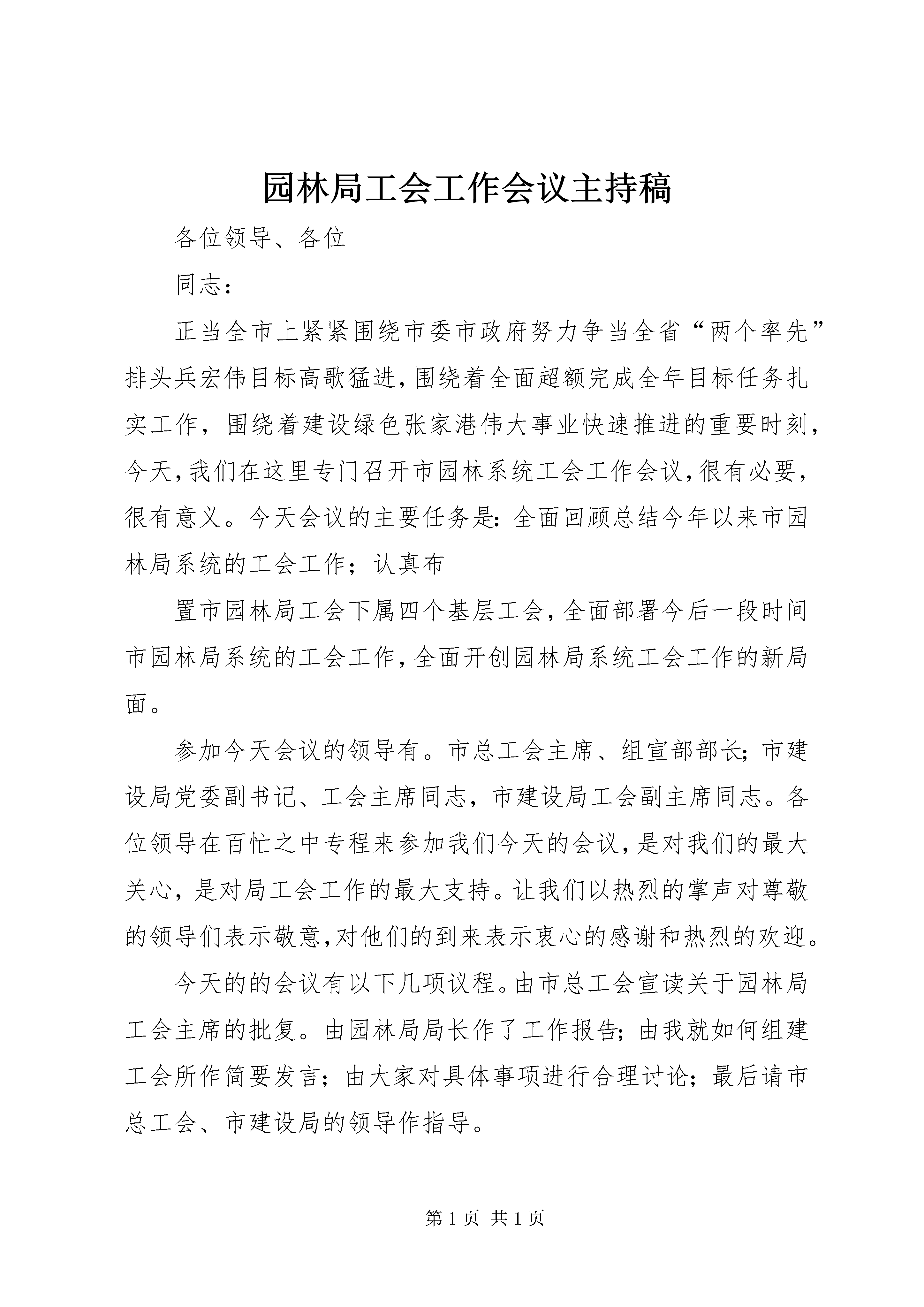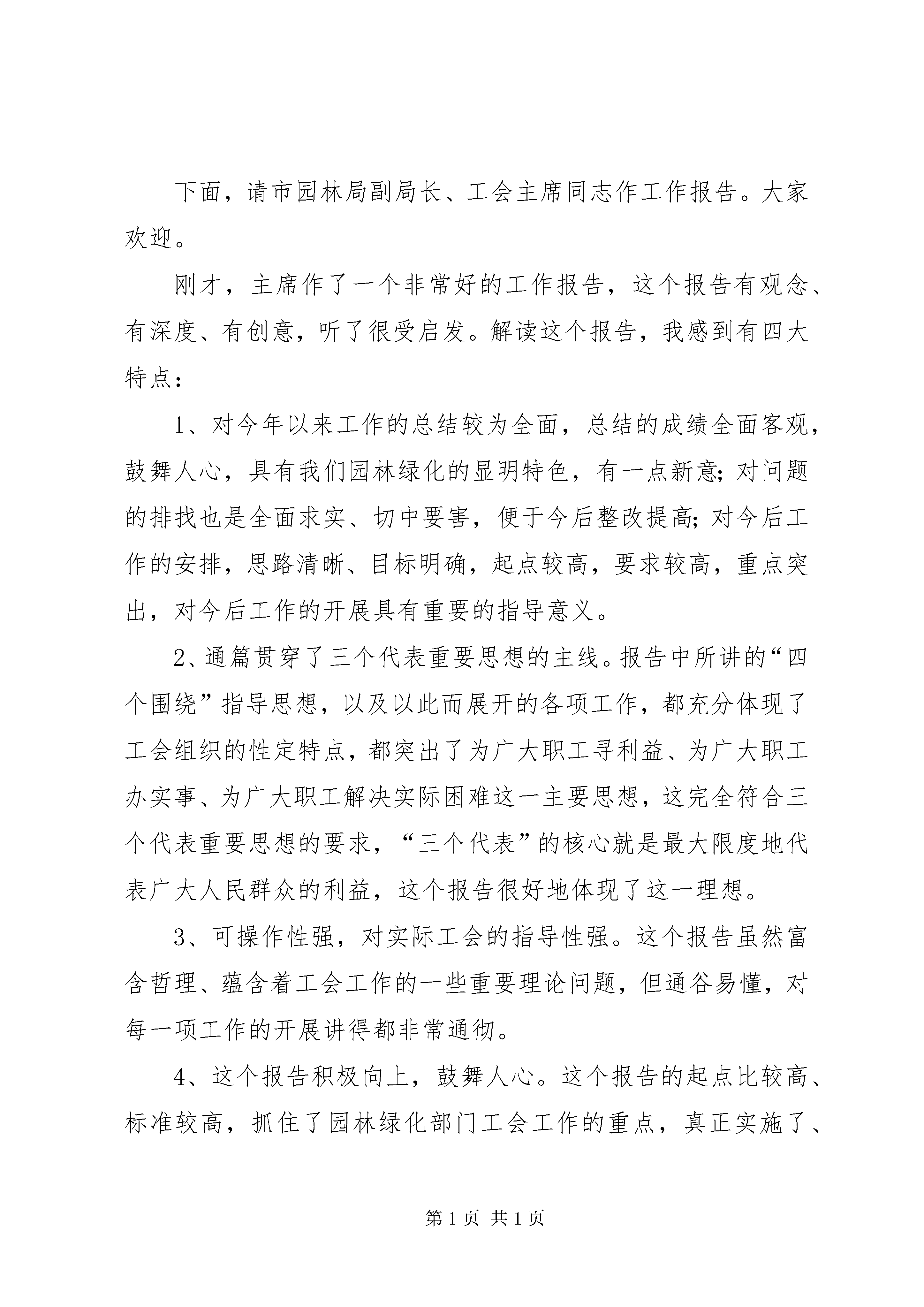 园林局工会工作会议主持稿各位领导、各位同志:正当全市上紧紧围绕市委市政府努力争当全省“两个率先”排头兵宏伟目标高歌猛进,围绕着全面超额完成全年目标任务扎实工作,围绕着建设绿色张家港伟大事业快速推进的重要时刻,今天,我们在这里专门召开市园林系统工会工作会议,很有必要,很有意义。今天会议的主要任务是:全面回顾总结今年以来市园林局系统的工会工作;认真布置市园林局工会下属四个基层工会,全面部署今后一段时间市园林局系统的工会工作,全面开创园林局系统工会工作的新局面。参加今天会议的领导有。市总工会主席、组宣部部长;市建设局党委副书记、工会主席同志,市建设局工会副主席同志。各位领导在百忙之中专程来参加我们今天的会议,是对我们的最大关心,是对局工会工作的最大支持。让我们以热烈的掌声对尊敬的领导们表示敬意,对他们的到来表示衷心的感谢和热烈的欢迎。今天的的会议有以下几项议程。由市总工会宣读关于园林局工会主席的批复。由园林局局长作了工作报告;由我就如何组建工会所作简要发言;由大家对具体事项进行合理讨论;最后请市总工会、市建设局的领导作指导。下面,请市园林局副局长、工会主席同志作工作报告。大家欢迎。刚才,主席作了一个非常好的工作报告,这个报告有观念、有深度、有创意,听了很受启发。解读这个报告,我感到有四大特点:1、对今年以来工作的总结较为全面,总结的成绩全面客观,鼓舞人心,具有我们园林绿化的显明特色,有一点新意;对问题的排找也是全面求实、切中要害,便于今后整改提高;对今后工作的安排,思路清晰、目标明确,起点较高,要求较高,重点突出,对今后工作的开展具有重要的指导意义。2、通篇贯穿了三个代表重要思想的主线。报告中所讲的“四个围绕”指导思想,以及以此而展开的各项工作,都充分体现了工会组织的性定特点,都突出了为广大职工寻利益、为广大职工办实事、为广大职工解决实际困难这一主要思想,这完全符合三个代表重要思想的要求,“三个代表”的核心就是最大限度地代表广大人民群众的利益,这个报告很好地体现了这一理想。3、可操作性强,对实际工会的指导性强。这个报告虽然富含哲理、蕴含着工会工作的一些重要理论问题,但通谷易懂,对每一项工作的开展讲得都非常通彻。4、这个报告积极向上,鼓舞人心。这个报告的起点比较高、标准较高,抓住了园林绿化部门工会工作的重点,真正实施了、做好了,是很有一些闪光点的,为园林局工会事业分阶段构划了思路和目标。所以,我个人认为这个报告非常好,希望大家很好的消化、很好的实施。