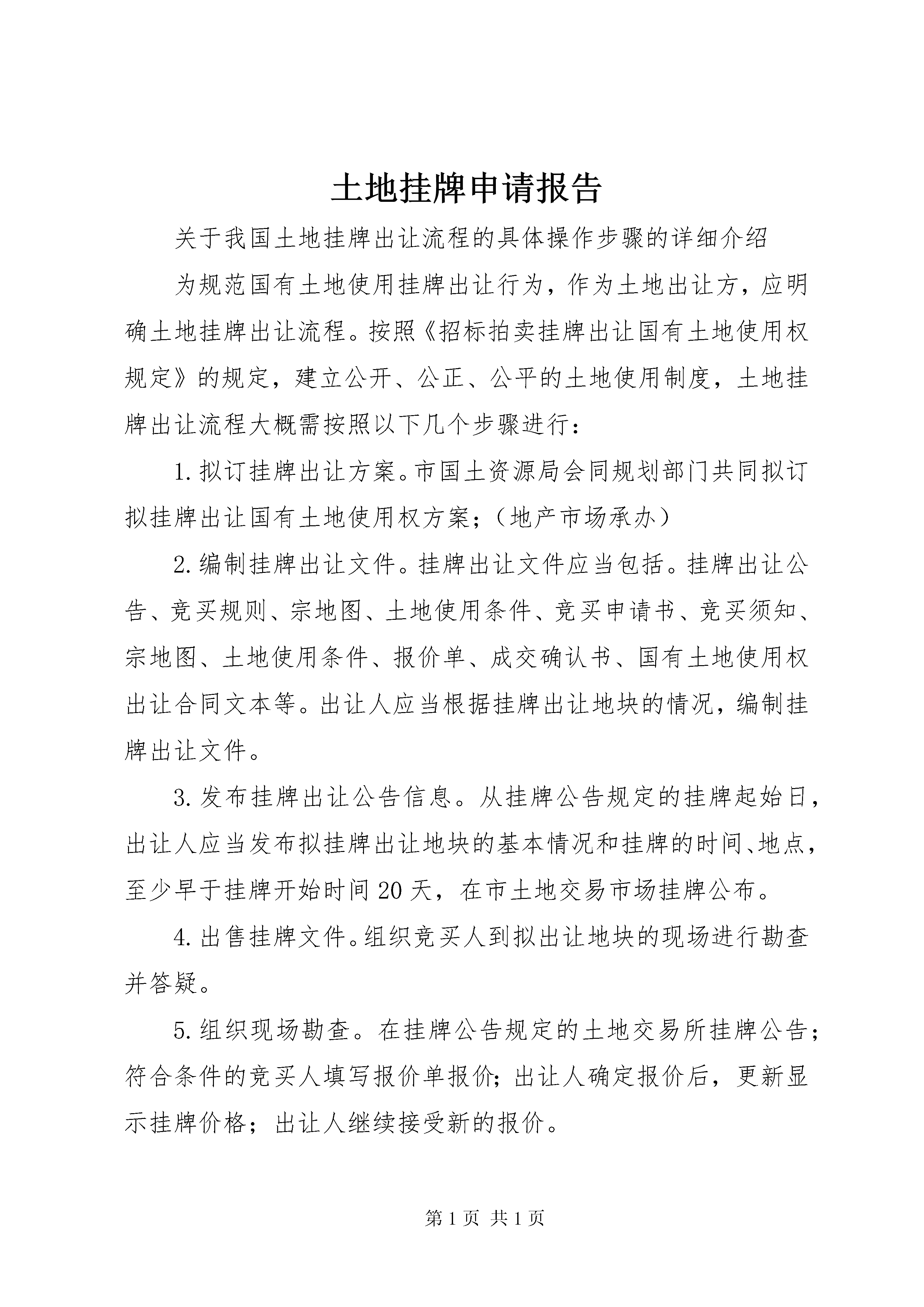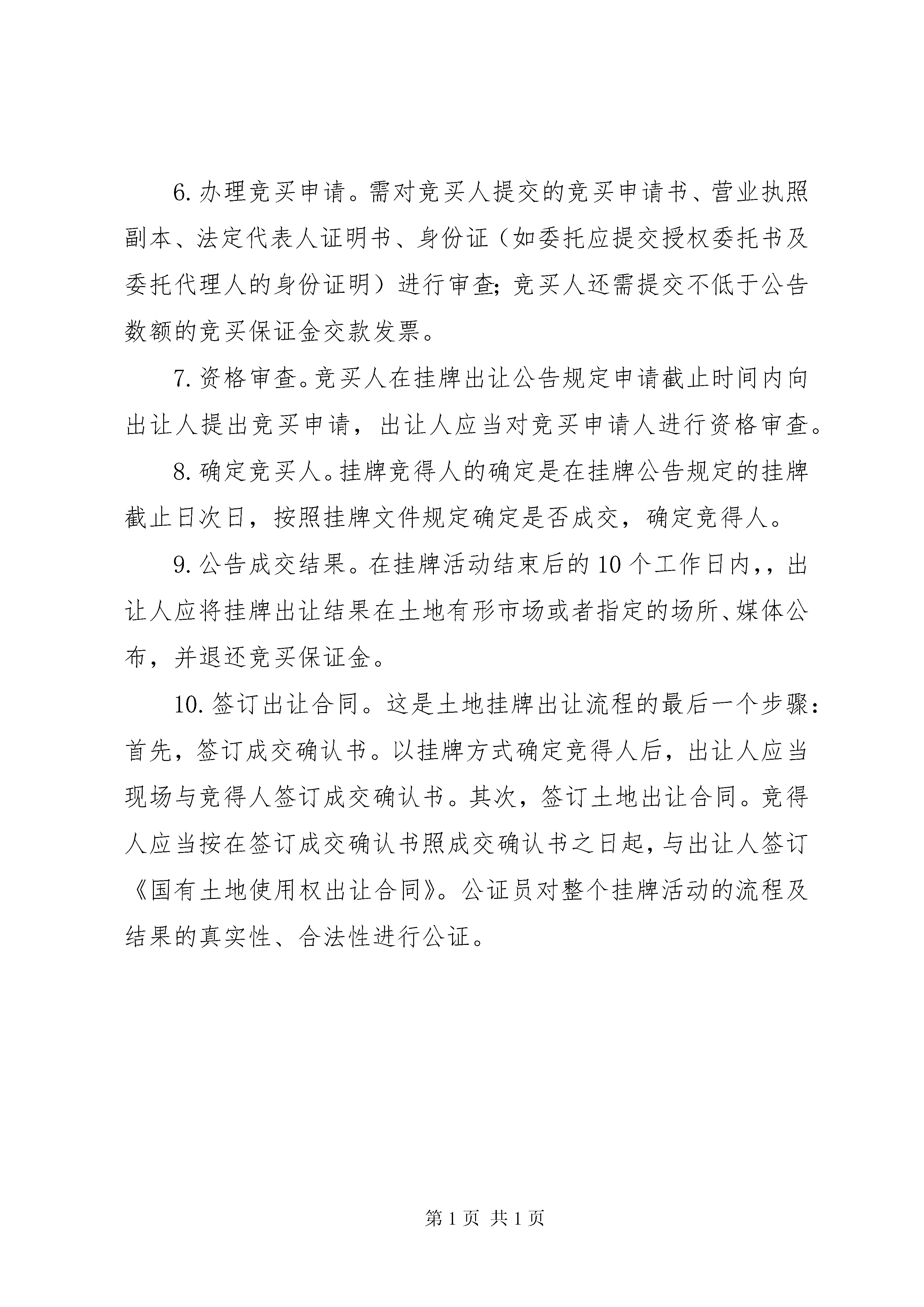 土地挂牌申请报告关于我国土地挂牌出让流程的具体操作步骤的详细介绍为规范国有土地使用挂牌出让行为,作为土地出让方,应明确土地挂牌出让流程。按照《招标拍卖挂牌出让国有土地使用权规定》的规定,建立公开、公正、公平的土地使用制度,土地挂牌出让流程大概需按照以下几个步骤进行:1.拟订挂牌出让方案。市国土资源局会同规划部门共同拟订拟挂牌出让国有土地使用权方案;(地产市场承办)2.编制挂牌出让文件。挂牌出让文件应当包括。挂牌出让公告、竞买规则、宗地图、土地使用条件、竞买申请书、竞买须知、宗地图、土地使用条件、报价单、成交确认书、国有土地使用权出让合同文本等。出让人应当根据挂牌出让地块的情况,编制挂牌出让文件。3.发布挂牌出让公告信息。从挂牌公告规定的挂牌起始日,出让人应当发布拟挂牌出让地块的基本情况和挂牌的时间、地点,至少早于挂牌开始时间20天,在市土地交易市场挂牌公布。4.出售挂牌文件。组织竞买人到拟出让地块的现场进行勘查并答疑。5.组织现场勘查。在挂牌公告规定的土地交易所挂牌公告;符合条件的竞买人填写报价单报价;出让人确定报价后,更新显示挂牌价格;出让人继续接受新的报价。6.办理竞买申请。需对竞买人提交的竞买申请书、营业执照副本、法定代表人证明书、身份证(如委托应提交授权委托书及委托代理人的身份证明)进行审查;竞买人还需提交不低于公告数额的竞买保证金交款发票。7.资格审查。竞买人在挂牌出让公告规定申请截止时间内向出让人提出竞买申请,出让人应当对竞买申请人进行资格审查。8.确定竞买人。挂牌竞得人的确定是在挂牌公告规定的挂牌截止日次日,按照挂牌文件规定确定是否成交,确定竞得人。9.公告成交结果。在挂牌活动结束后的10个工作日内,,出让人应将挂牌出让结果在土地有形市场或者指定的场所、媒体公布,并退还竞买保证金。10.签订出让合同。这是土地挂牌出让流程的最后一个步骤:首先,签订成交确认书。以挂牌方式确定竞得人后,出让人应当现场与竞得人签订成交确认书。其次,签订土地出让合同。竞得人应当按在签订成交确认书照成交确认书之日起,与出让人签订《国有土地使用权出让合同》。公证员对整个挂牌活动的流程及结果的真实性、合法性进行公证。