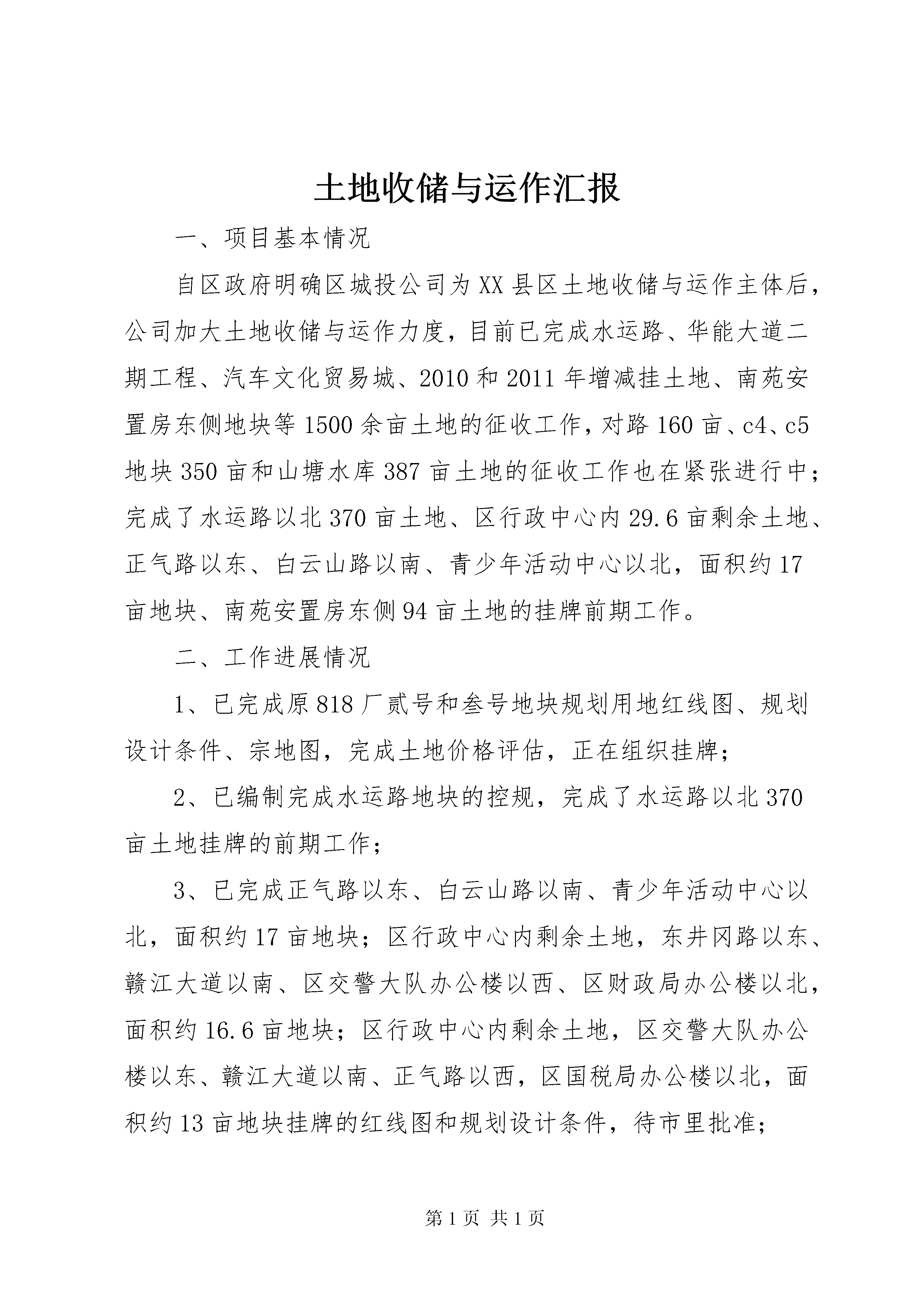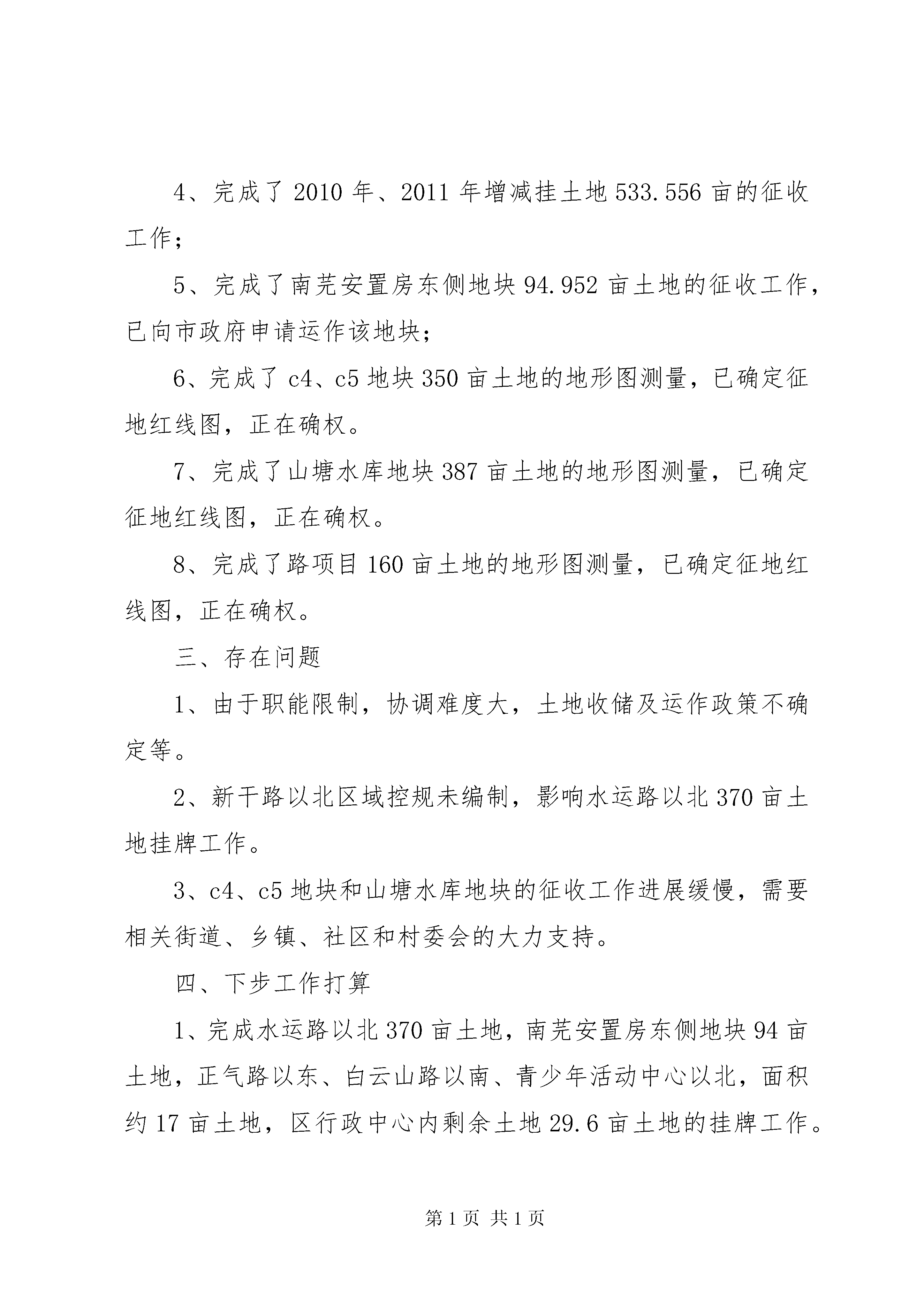 土地收储与运作汇报一、项目基本情况自区政府明确区城投公司为XX县区土地收储与运作主体后,公司加大土地收储与运作力度,目前已完成水运路、华能大道二期工程、汽车文化贸易城、2010和2011年增减挂土地、南苑安置房东侧地块等1500余亩土地的征收工作,对路160亩、c4、c5地块350亩和山塘水库387亩土地的征收工作也在紧张进行中;完成了水运路以北370亩土地、区行政中心内29.6亩剩余土地、正气路以东、白云山路以南、青少年活动中心以北,面积约17亩地块、南苑安置房东侧94亩土地的挂牌前期工作。二、工作进展情况1、已完成原818厂贰号和叁号地块规划用地红线图、规划设计条件、宗地图,完成土地价格评估,正在组织挂牌;2、已编制完成水运路地块的控规,完成了水运路以北370亩土地挂牌的前期工作;3、已完成正气路以东、白云山路以南、青少年活动中心以北,面积约17亩地块;区行政中心内剩余土地,东井冈路以东、赣江大道以南、区交警大队办公楼以西、区财政局办公楼以北,面积约16.6亩地块;区行政中心内剩余土地,区交警大队办公楼以东、赣江大道以南、正气路以西,区国税局办公楼以北,面积约13亩地块挂牌的红线图和规划设计条件,待市里批准;4、完成了2010年、2011年增减挂土地533.556亩的征收工作;5、完成了南芫安置房东侧地块94.952亩土地的征收工作,已向市政府申请运作该地块;6、完成了c4、c5地块350亩土地的地形图测量,已确定征地红线图,正在确权。7、完成了山塘水库地块387亩土地的地形图测量,已确定征地红线图,正在确权。8、完成了路项目160亩土地的地形图测量,已确定征地红线图,正在确权。三、存在问题1、由于职能限制,协调难度大,土地收储及运作政策不确定等。2、新干路以北区域控规未编制,影响水运路以北370亩土地挂牌工作。3、c4、c5地块和山塘水库地块的征收工作进展缓慢,需要相关街道、乡镇、社区和村委会的大力支持。四、下步工作打算1、完成水运路以北370亩土地,南芫安置房东侧地块94亩土地,正气路以东、白云山路以南、青少年活动中心以北,面积约17亩土地,区行政中心内剩余土地29.6亩土地的挂牌工作。2、完成路项目160亩、c4、c5地块350亩、山塘水库387亩土地的征收工作。3、根据市、区确立建设城东片区的要求,筹划城东片区土地征收工作。