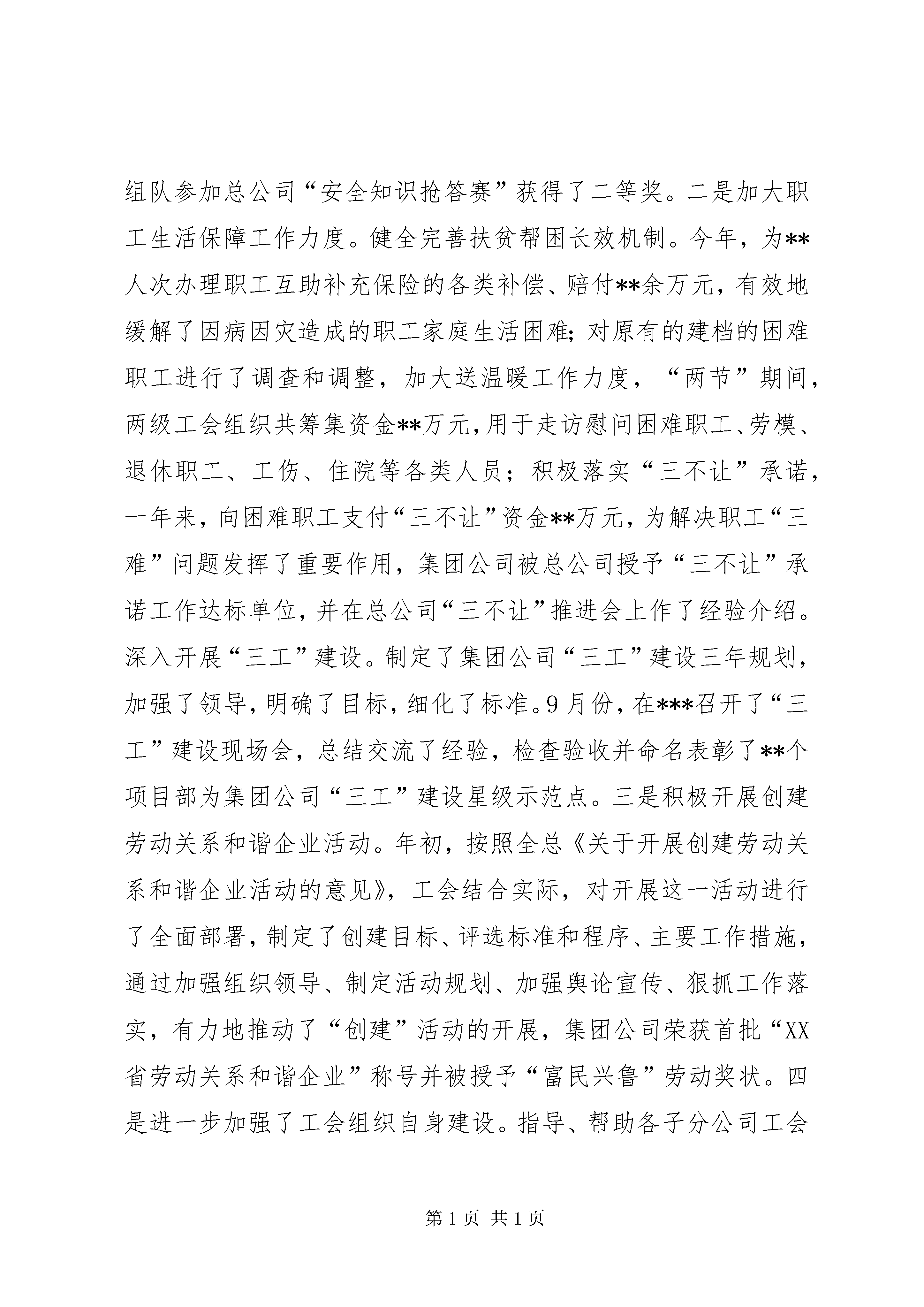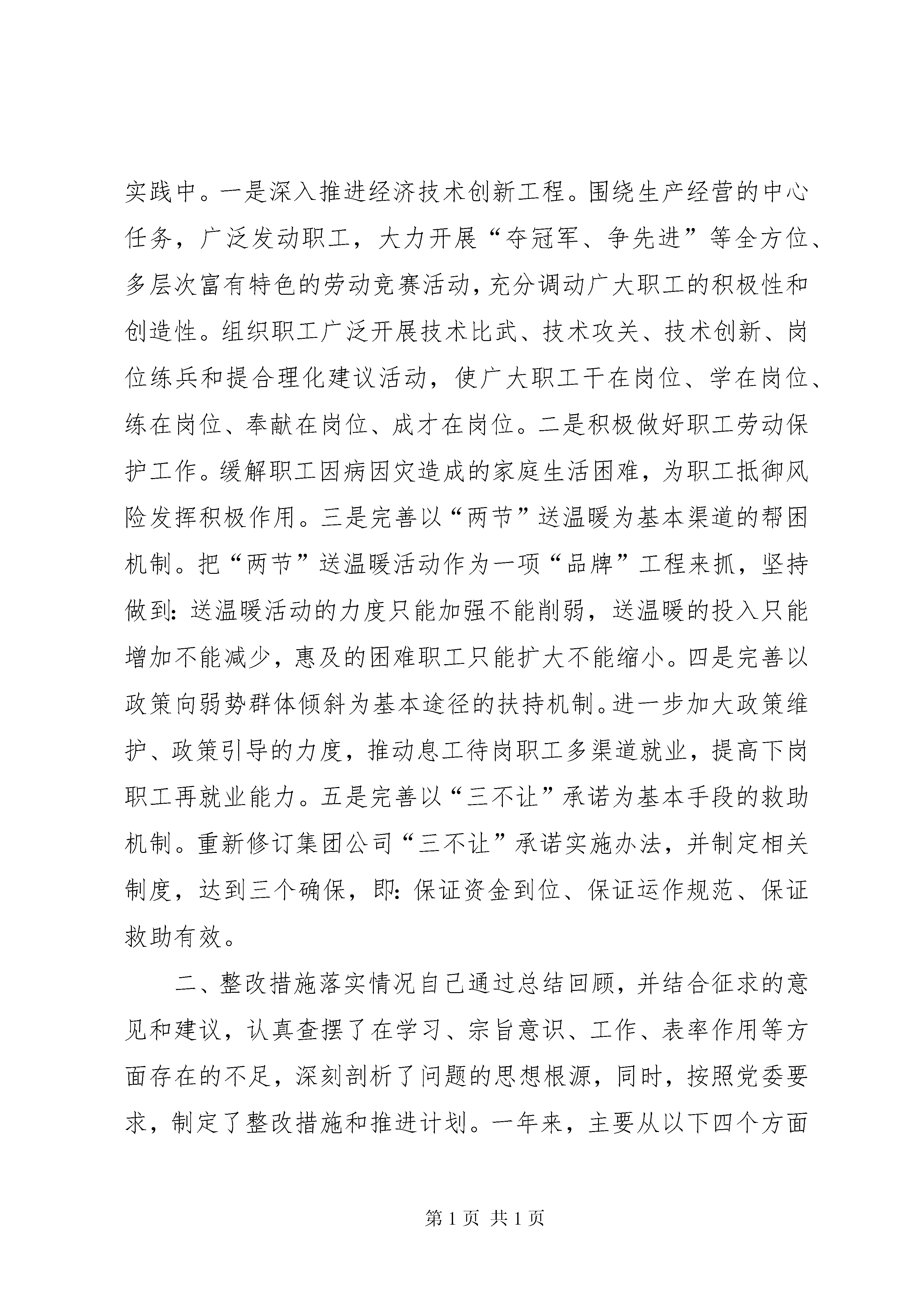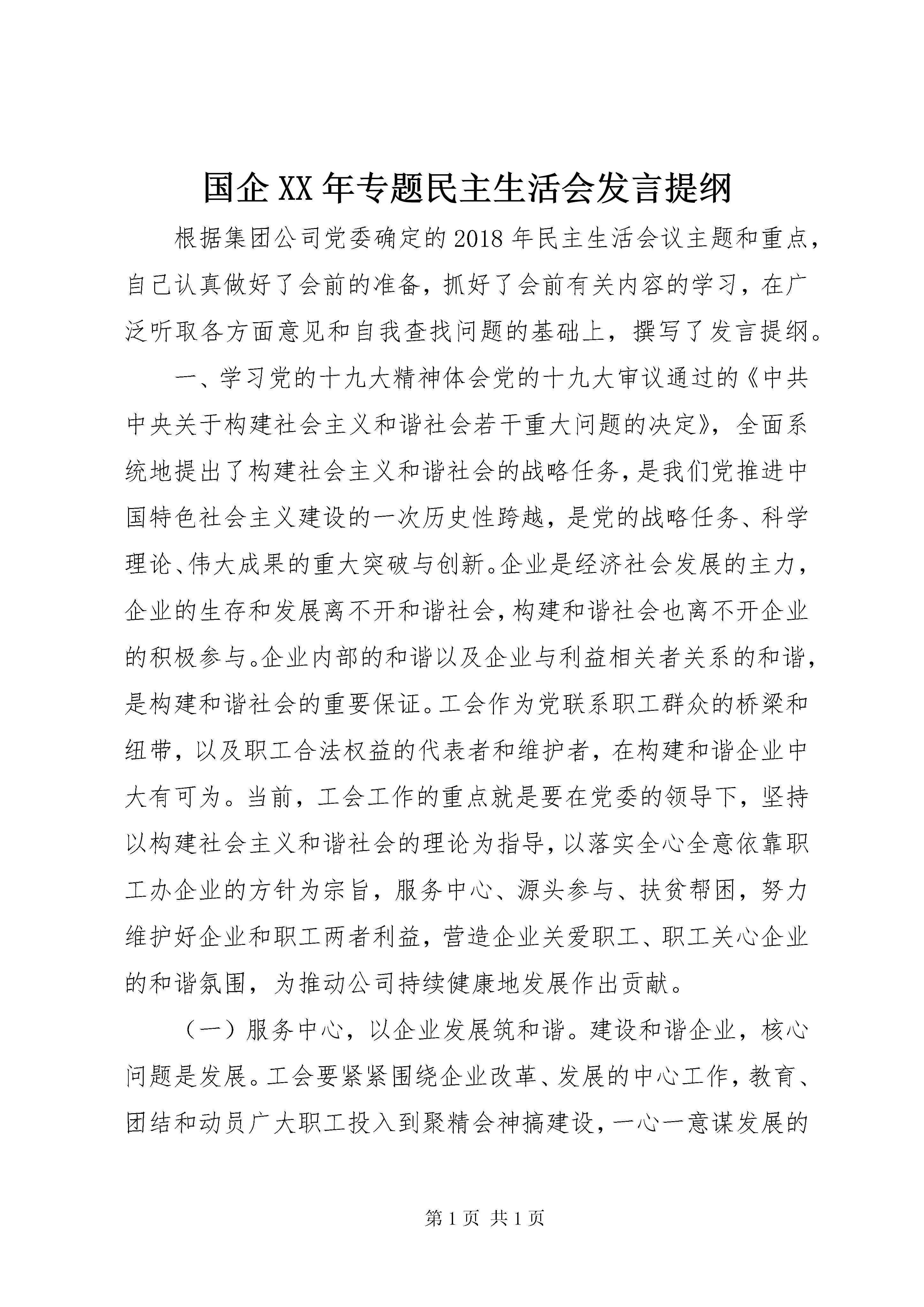 国企XX年专题民主生活会发言提纲根据集团公司党委确定的2018年民主生活会议主题和重点,自己认真做好了会前的准备,抓好了会前有关内容的学习,在广泛听取各方面意见和自我查找问题的基础上,撰写了发言提纲。一、学习党的十九大精神体会党的十九大审议通过的《中共中央关于构建社会主义和谐社会若干重大问题的决定》,全面系统地提出了构建社会主义和谐社会的战略任务,是我们党推进中国特色社会主义建设的一次历史性跨越,是党的战略任务、科学理论、伟大成果的重大突破与创新。企业是经济社会发展的主力,企业的生存和发展离不开和谐社会,构建和谐社会也离不开企业的积极参与。企业内部的和谐以及企业与利益相关者关系的和谐,是构建和谐社会的重要保证。工会作为党联系职工群众的桥梁和纽带,以及职工合法权益的代表者和维护者,在构建和谐企业中大有可为。当前,工会工作的重点就是要在党委的领导下,坚持以构建社会主义和谐社会的理论为指导,以落实全心全意依靠职工办企业的方针为宗旨,服务中心、源头参与、扶贫帮困,努力维护好企业和职工两者利益,营造企业关爱职工、职工关心企业的和谐氛围,为推动公司持续健康地发展作出贡献。(一)服务中心,以企业发展筑和谐。建设和谐企业,核心问题是发展。工会要紧紧围绕企业改革、发展的中心工作,教育、团结和动员广大职工投入到聚精会神搞建设,一心一意谋发展的实践中。一是深入推进经济技术创新工程。围绕生产经营的中心任务,广泛发动职工,大力开展“夺冠军、争先进”等全方位、多层次富有特色的劳动竞赛活动,充分调动广大职工的积极性和创造性。组织职工广泛开展技术比武、技术攻关、技术创新、岗位练兵和提合理化建议活动,使广大职工干在岗位、学在岗位、练在岗位、奉献在岗位、成才在岗位。二是积极做好职工劳动保护工作。缓解职工因病因灾造成的家庭生活困难,为职工抵御风险发挥积极作用。三是完善以“两节”送温暖为基本渠道的帮困机制。把“两节”送温暖活动作为一项“品牌”工程来抓,坚持做到:送温暖活动的力度只能加强不能削弱,送温暖的投入只能增加不能减少,惠及的困难职工只能扩大不能缩小。四是完善以政策向弱势群体倾斜为基本途径的扶持机制。进一步加大政策维护、政策引导的力度,推动息工待岗职工多渠道就业,提高下岗职工再就业能力。五是完善以“三不让”承诺为基本手段的救助机制。重新修订集团公司“三不让”承诺实施办法,并制定相关制度,达到三个确保,即:保证资金到位、保证运作规范、保证救助有效。二、整改措施落实情况自己通过总结回顾,并结合征求的意见和建议,认真查摆了在学习、宗旨意识、工作、表率作用等方面存在的不足,深刻剖析了问题的思想根源,同时,按照党委要求,制定了整改措施和推进计划。一年来,主要从以下四个方面进行了落实。1、加强学习,理论和业务水平有新的提高。平时,自己更加注重了认真学习党和国家的有关方针政策,学习业务知识,坚持用科学的理论来指导实际工作,增强工作的主动性、预见性和科学性。注意在工作中思考,在思考中工作。对重大理论,对党和国家的有关方针和政策,对集团公司所处的内外部环境,对具体的工作进行经常性的思考和反思,通过思考和反思,提高对重大问题的判断能力和重要工作的决策能力。2、转变作风,群众观念有新的增强。自己能够坚持深入基层,深入群众,了解民情,尽心竭力为职工办实事、办好事。今年,在工作任务比较多、比较繁杂的情况下,自己能够尽量抽出时间,到基层单位、到项目部、到重点工程搞调研,了解情况,慰问职工。特别是解决职工的热点难点问题时,能够主动地把自己置身于职工群众之中,及时了解情况,做好职工思想工作,切实为职工解决思想、工作以及生活中的一些实际问题。3、开拓创新,分管工作有新的作为。工作中,自己能够进一步解放思想,更新观念,以强烈的事业心和责任感,认真研究分管的各项工作所面临的新形势、新情况、新问题,不断总结以往工作的经验,克服畏难情绪,甩掉思想包袱,勇于创新、大胆实践,创造性地开展工作。如:在总公司系统率先开展了“三不让”承诺工作和创建劳动关系和谐企业活动等,均取得了良好的效果。4、严于律己,自律意识进一步强化。一年来,自己能够牢固树立马克思主义的世界观、人生观和价值观,树立正确的权利观、地位观、利益观,牢记两个“务必”,严格执行上级和集团公司的有关规定和纪律,正确对待和使用好手中权利。坚持自重、自省、自警、自励,做到见微知著,防微杜渐。坚持吃苦在前,享受在后,勇于奉献,不计较个人得失,恪尽职守,尽职尽责地做好本职工作。三、一年来的工作简要回顾(一)工会工作方面。在各级党政领导的大力支持下,我团结带领工会常委一班人主要做了以下工作:一是围绕生产经营中心开展工作。深入开展“创争”活动,积极为开展“创争”活动搭建平台,注意发挥先进典型的推动作用,组织召开了“创争”活动第二次推进会