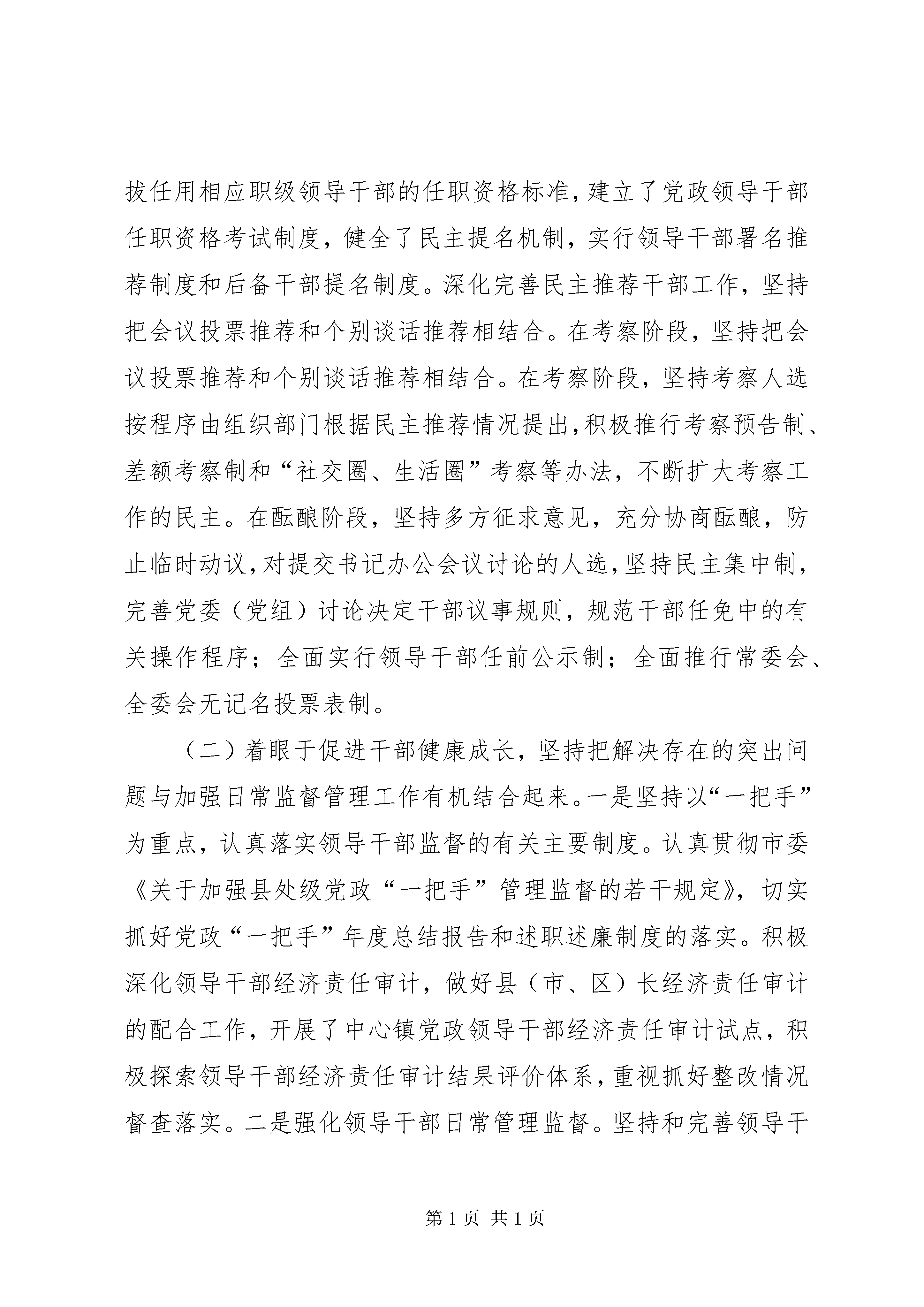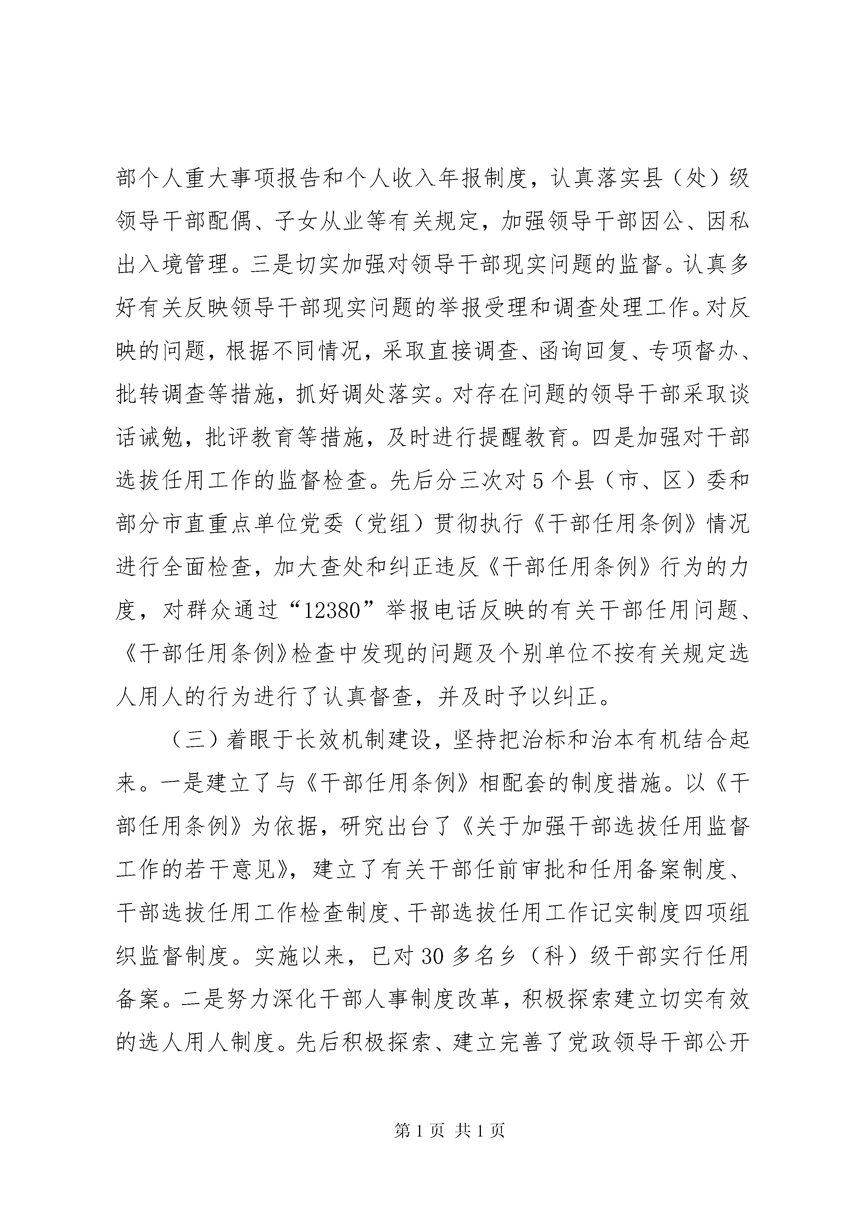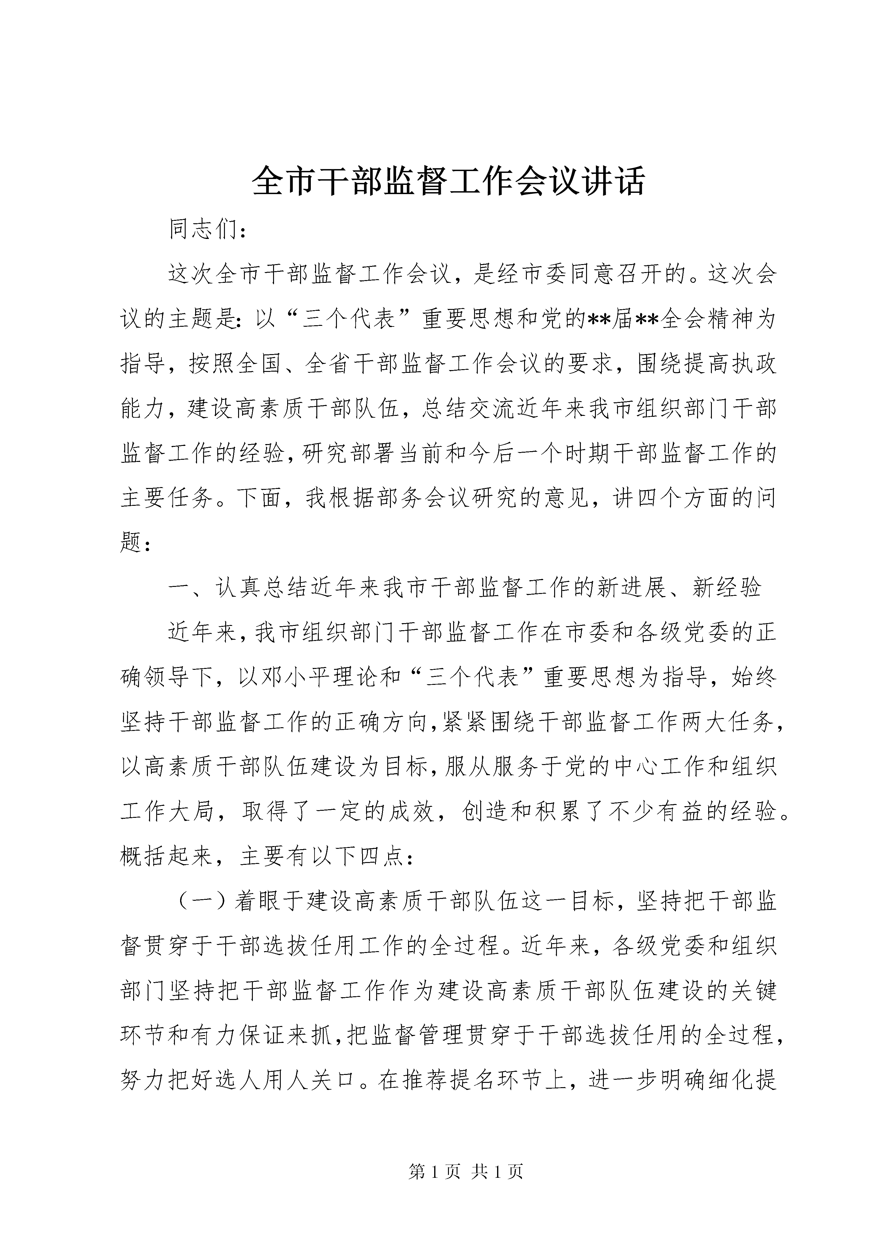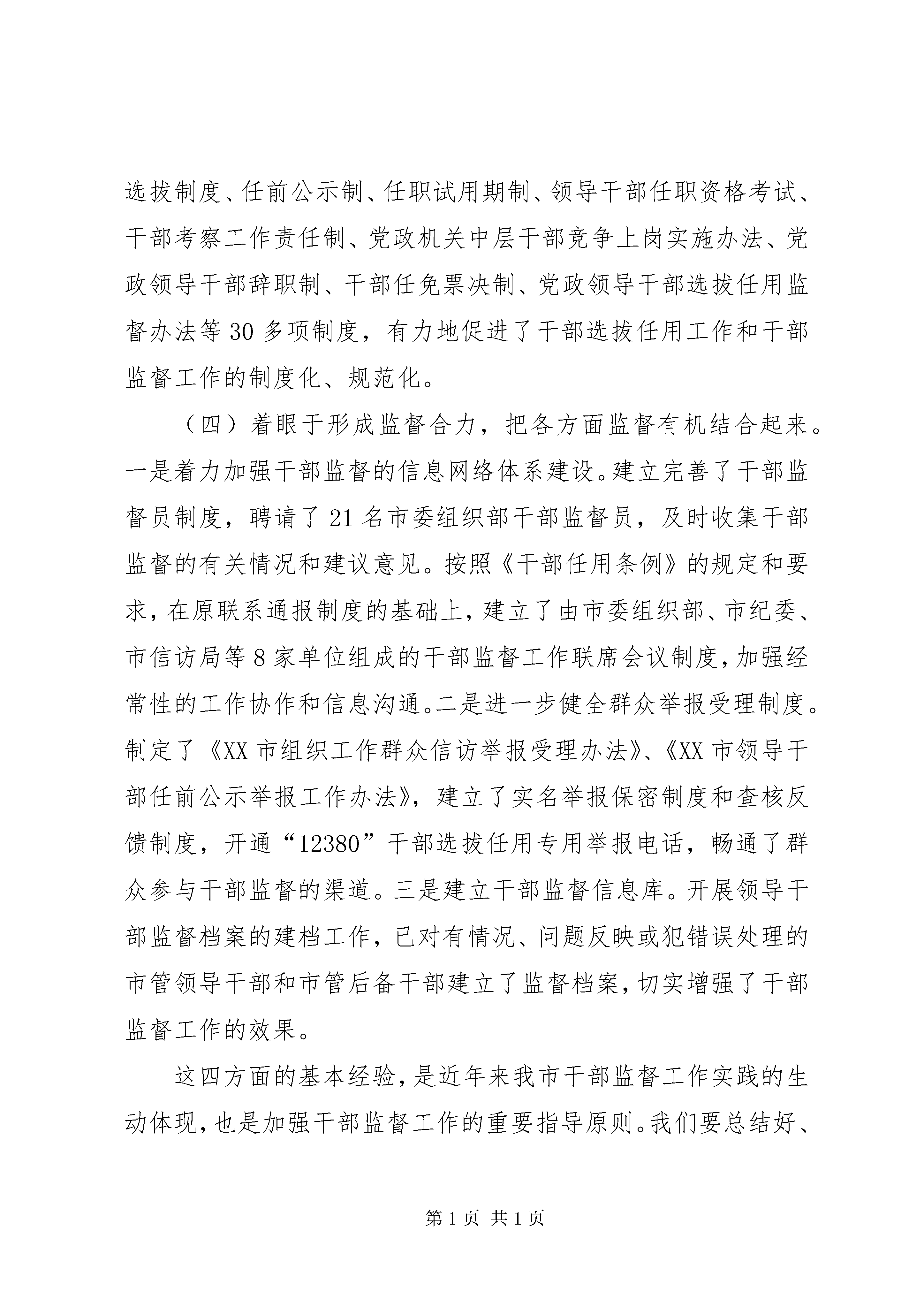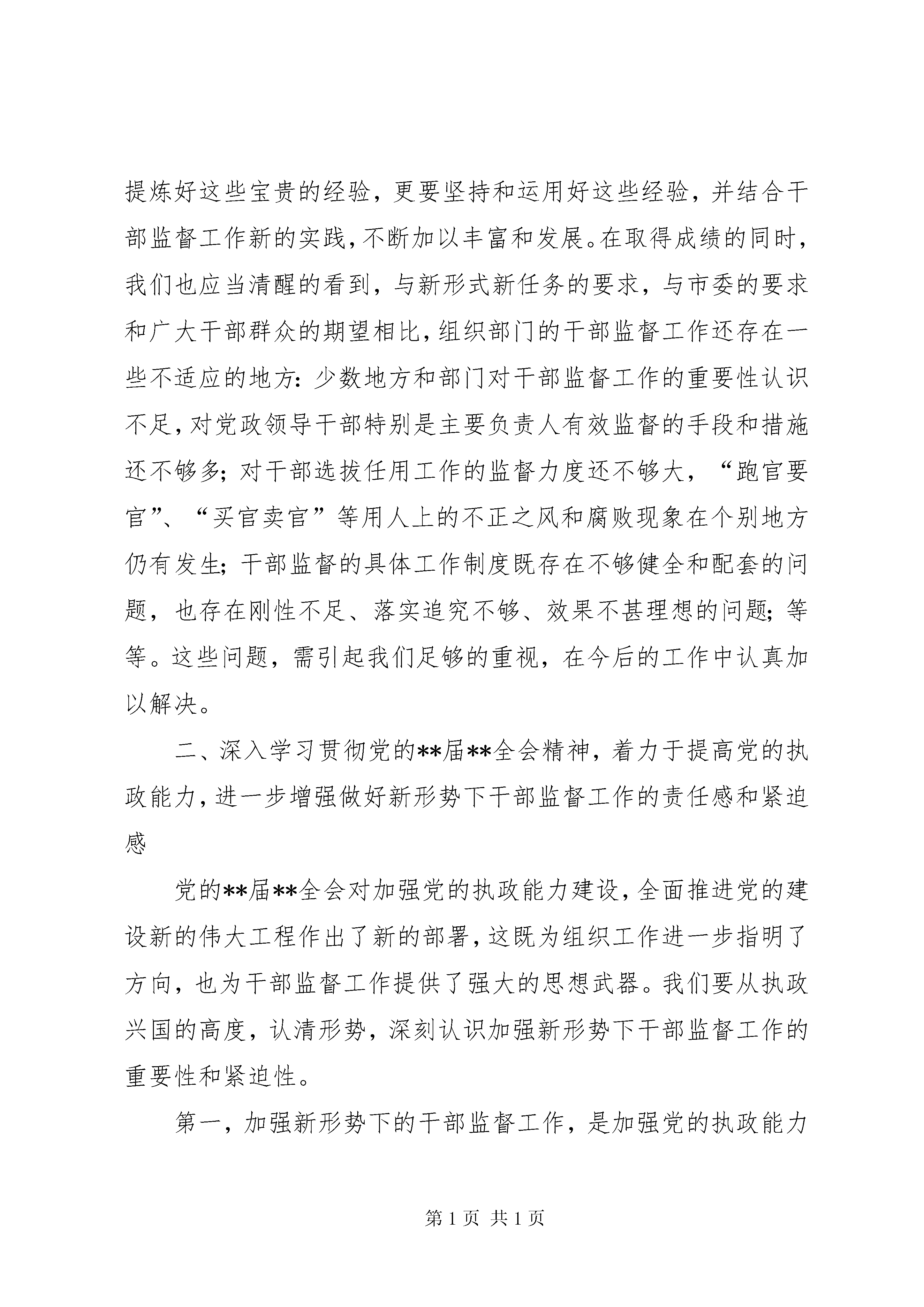 全市干部监督工作会议讲话同志们:这次全市干部监督工作会议,是经市委同意召开的。这次会议的主题是:以“三个代表”重要思想和党的**届**全会精神为指导,按照全国、全省干部监督工作会议的要求,围绕提高执政能力,建设高素质干部队伍,总结交流近年来我市组织部门干部监督工作的经验,研究部署当前和今后一个时期干部监督工作的主要任务。下面,我根据部务会议研究的意见,讲四个方面的问题:一、认真总结近年来我市干部监督工作的新进展、新经验近年来,我市组织部门干部监督工作在市委和各级党委的正确领导下,以邓小平理论和“三个代表”重要思想为指导,始终坚持干部监督工作的正确方向,紧紧围绕干部监督工作两大任务,以高素质干部队伍建设为目标,服从服务于党的中心工作和组织工作大局,取得了一定的成效,创造和积累了不少有益的经验。概括起来,主要有以下四点:(一)着眼于建设高素质干部队伍这一目标,坚持把干部监督贯穿于干部选拔任用工作的全过程。近年来,各级党委和组织部门坚持把干部监督工作作为建设高素质干部队伍建设的关键环节和有力保证来抓,把监督管理贯穿于干部选拔任用的全过程,努力把好选人用人关口。在推荐提名环节上,进一步明确细化提拔任用相应职级领导干部的任职资格标准,建立了党政领导干部任职资格考试制度,健全了民主提名机制,实行领导干部署名推荐制度和后备干部提名制度。深化完善民主推荐干部工作,坚持把会议投票推荐和个别谈话推荐相结合。在考察阶段,坚持把会议投票推荐和个别谈话推荐相结合。在考察阶段,坚持考察人选按程序由组织部门根据民主推荐情况提出,积极推行考察预告制、差额考察制和“社交圈、生活圈”考察等办法,不断扩大考察工作的民主。在酝酿阶段,坚持多方征求意见,充分协商酝酿,防止临时动议,对提交书记办公会议讨论的人选,坚持民主集中制,完善党委(党组)讨论决定干部议事规则,规范干部任免中的有关操作程序;全面实行领导干部任前公示制;全面推行常委会、全委会无记名投票表制。(二)着眼于促进干部健康成长,坚持把解决存在的突出问题与加强日常监督管理工作有机结合起来。一是坚持以“一把手”为重点,认真落实领导干部监督的有关主要制度。认真贯彻市委《关于加强县处级党政“一把手”管理监督的若干规定》,切实抓好党政“一把手”年度总结报告和述职述廉制度的落实。积极深化领导干部经济责任审计,做好县(市、区)长经济责任审计的配合工作,开展了中心镇党政领导干部经济责任审计试点,积极探索领导干部经济责任审计结果评价体系,重视抓好整改情况督查落实。二是强化领导干部日常管理监督。坚持和完善领导干部个人重大事项报告和个人收入年报制度,认真落实县(处)级领导干部配偶、子女从业等有关规定,加强领导干部因公、因私出入境管理。三是切实加强对领导干部现实问题的监督。认真多好有关反映领导干部现实问题的举报受理和调查处理工作。对反映的问题,根据不同情况,采取直接调查、函询回复、专项督办、批转调查等措施,抓好调处落实。对存在问题的领导干部采取谈话诫勉,批评教育等措施,及时进行提醒教育。四是加强对干部选拔任用工作的监督检查。先后分三次对5个县(市、区)委和部分市直重点单位党委(党组)贯彻执行《干部任用条例》情况进行全面检查,加大查处和纠正违反《干部任用条例》行为的力度,对群众通过“12380”举报电话反映的有关干部任用问题、《干部任用条例》检查中发现的问题及个别单位不按有关规定选人用人的行为进行了认真督查,并及时予以纠正。(三)着眼于长效机制建设,坚持把治标和治本有机结合起来。一是建立了与《干部任用条例》相配套的制度措施。以《干部任用条例》为依据,研究出台了《关于加强干部选拔任用监督工作的若干意见》,建立了有关干部任前审批和任用备案制度、干部选拔任用工作检查制度、干部选拔任用工作记实制度四项组织监督制度。实施以来,已对30多名乡(科)级干部实行任用备案。二是努力深化干部人事制度改革,积极探索建立切实有效的选人用人制度。先后积极探索、建立完善了党政领导干部公开选拔制度、任前公示制、任职试用期制、领导干部任职资格考试、干部考察工作责任制、党政机关中层干部竞争上岗实施办法、党政领导干部辞职制、干部任免票决制、党政领导干部选拔任用监督办法等30多项制度,有力地促进了干部选拔任用工作和干部监督工作的制度化、规范化。(四)着眼于形成监督合力,把各方面监督有机结合起来。一是着力加强干部监督的信息网络体系建设。建立完善了干部监督员制度,聘请了21名市委组织部干部监督员,及时收集干部监督的有关情况和建议意见。按照《干部任用条例》的规定和要求,在原联系通报制度的基础上,建立了由市委组织部、市纪委、市信访局等8家单位组成的干部监督工作联席会议制度,加强经常性的工作协作和信息沟通。二是进一步健全群众举报受理制度。制定了《XX市组织