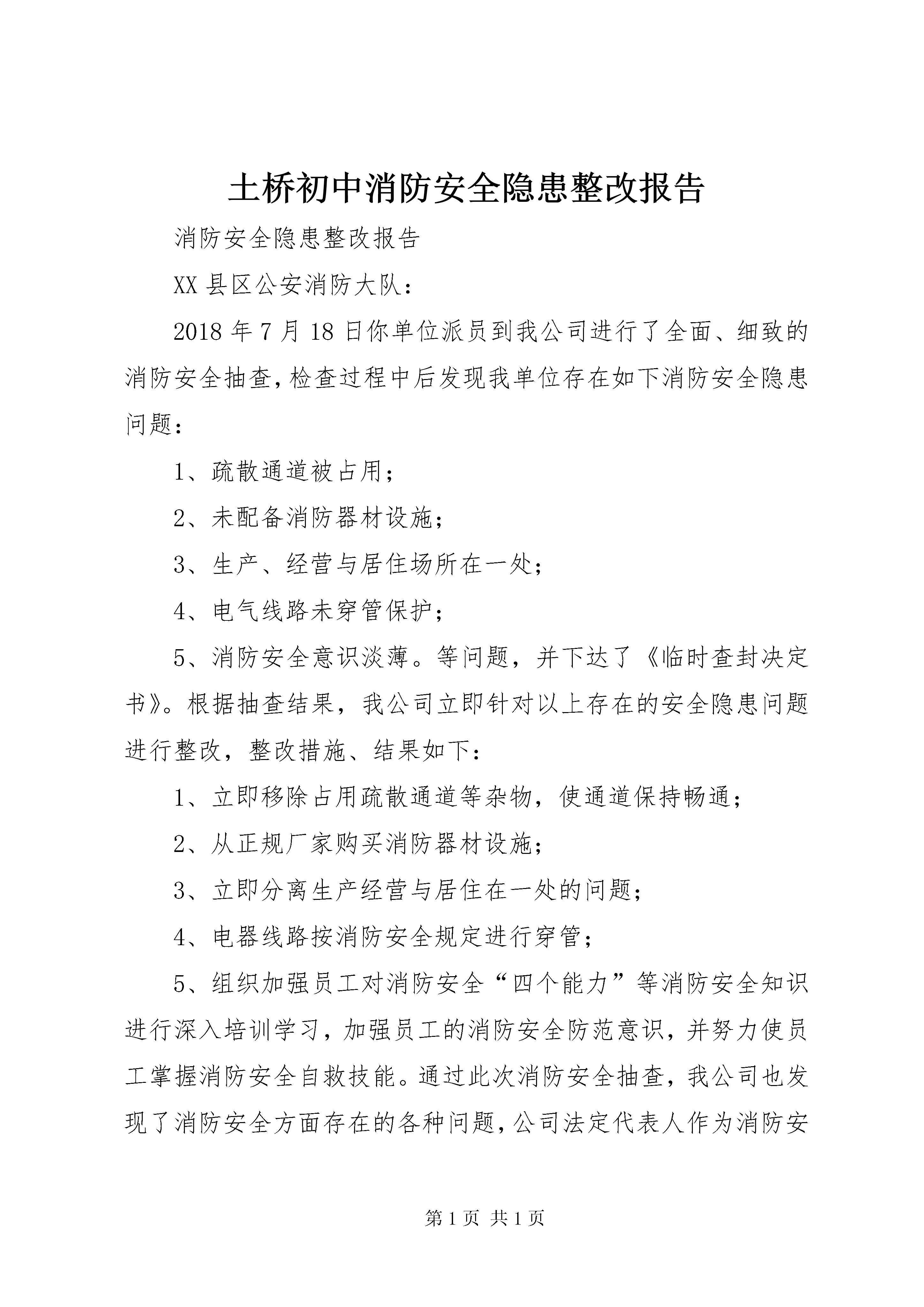 土桥初中消防安全隐患整改报告消防安全隐患整改报告XX县区公安消防大队:2018年7月18日你单位派员到我公司进行了全面、细致的消防安全抽查,检查过程中后发现我单位存在如下消防安全隐患问题:1、疏散通道被占用;2、未配备消防器材设施;3、生产、经营与居住场所在一处;4、电气线路未穿管保护;5、消防安全意识淡薄。等问题,并下达了《临时查封决定书》。根据抽查结果,我公司立即针对以上存在的安全隐患问题进行整改,整改措施、结果如下:1、立即移除占用疏散通道等杂物,使通道保持畅通;2、从正规厂家购买消防器材设施;3、立即分离生产经营与居住在一处的问题;4、电器线路按消防安全规定进行穿管;5、组织加强员工对消防安全“四个能力”等消防安全知识进行深入培训学习,加强员工的消防安全防范意识,并努力使员工掌握消防安全自救技能。通过此次消防安全抽查,我公司也发现了消防安全方面存在的各种问题,公司法定代表人作为消防安全第一责任人,立即组织消防安全会议,提出针对性整改措施,责成相关人员完善整改方案,并要求依消防安全隐隐患整改报告方案进行快速有效整改,现已经全部落实到位。我公司一直以来都极为重视消防安全,严格落实消防安全责任制,并明确公司法定代表人作为消防安全第一责任人,此次消防隐患被发现后,公司全体员工迅速统一思想,树立信心,痛痛下决心,并保障投入,彻底将隐患整改到位,确保公司消防安全。通过这次消防安全隐患整改工作,公司不仅排除了安全隐患,更为员工加强消防安全意识,认真落实各项消防安全工作营造了良好氛围。XX县区天昊广告传媒有限公司2018年7月18日