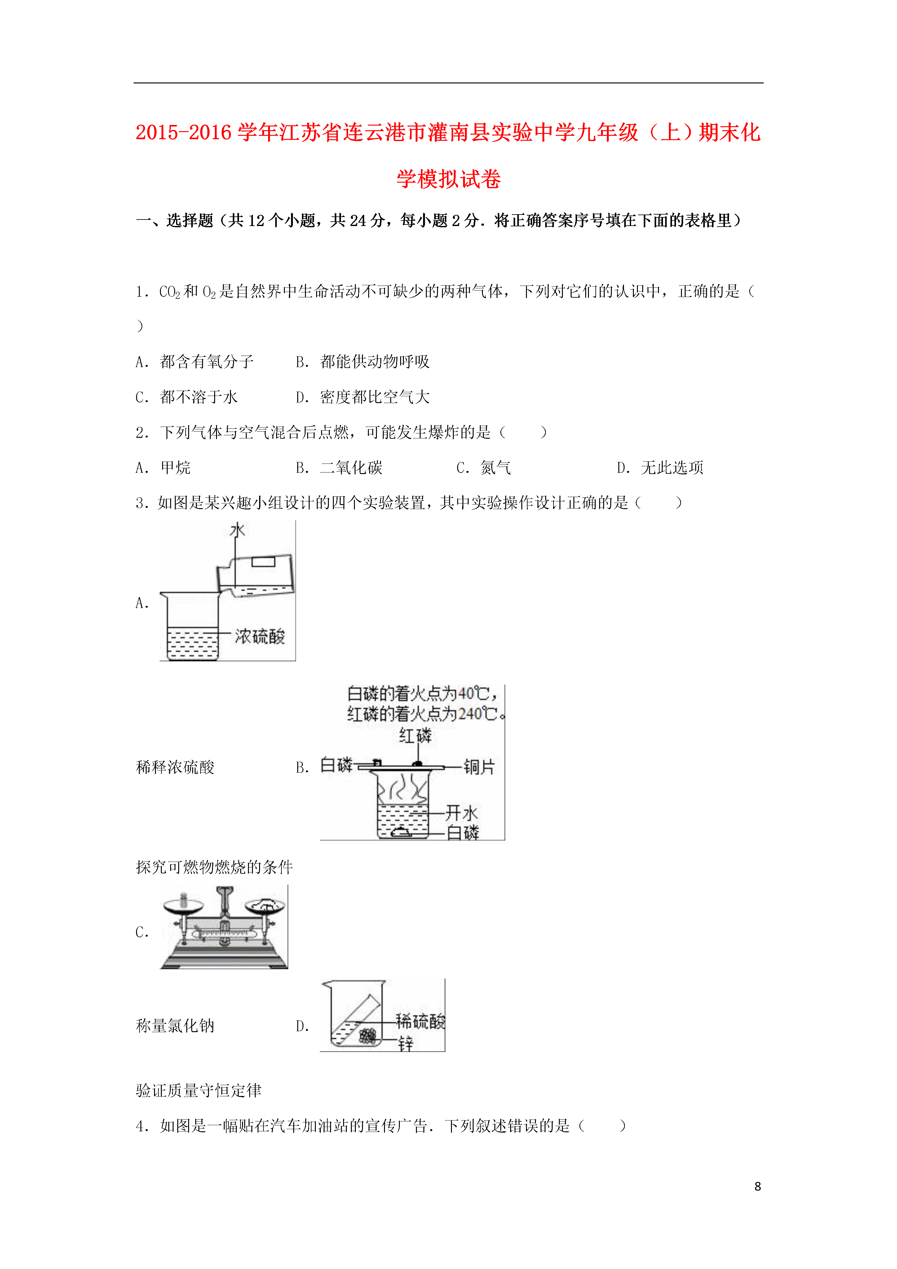 试题-江苏-2016_江苏省连云港市灌南县实验中学2015-2016学年九年级化学上学期期末模拟试题(含解析) 新人教版.doc