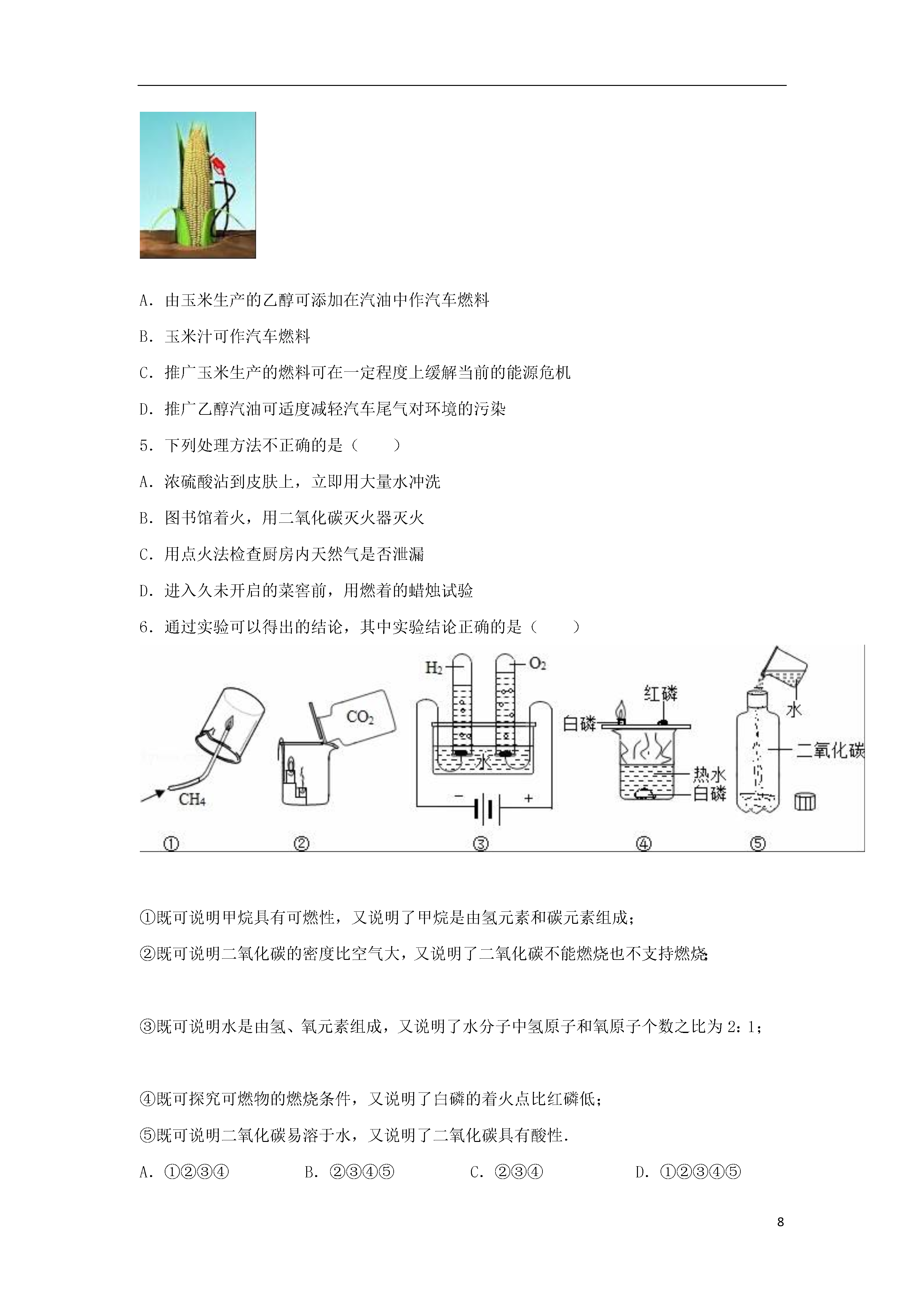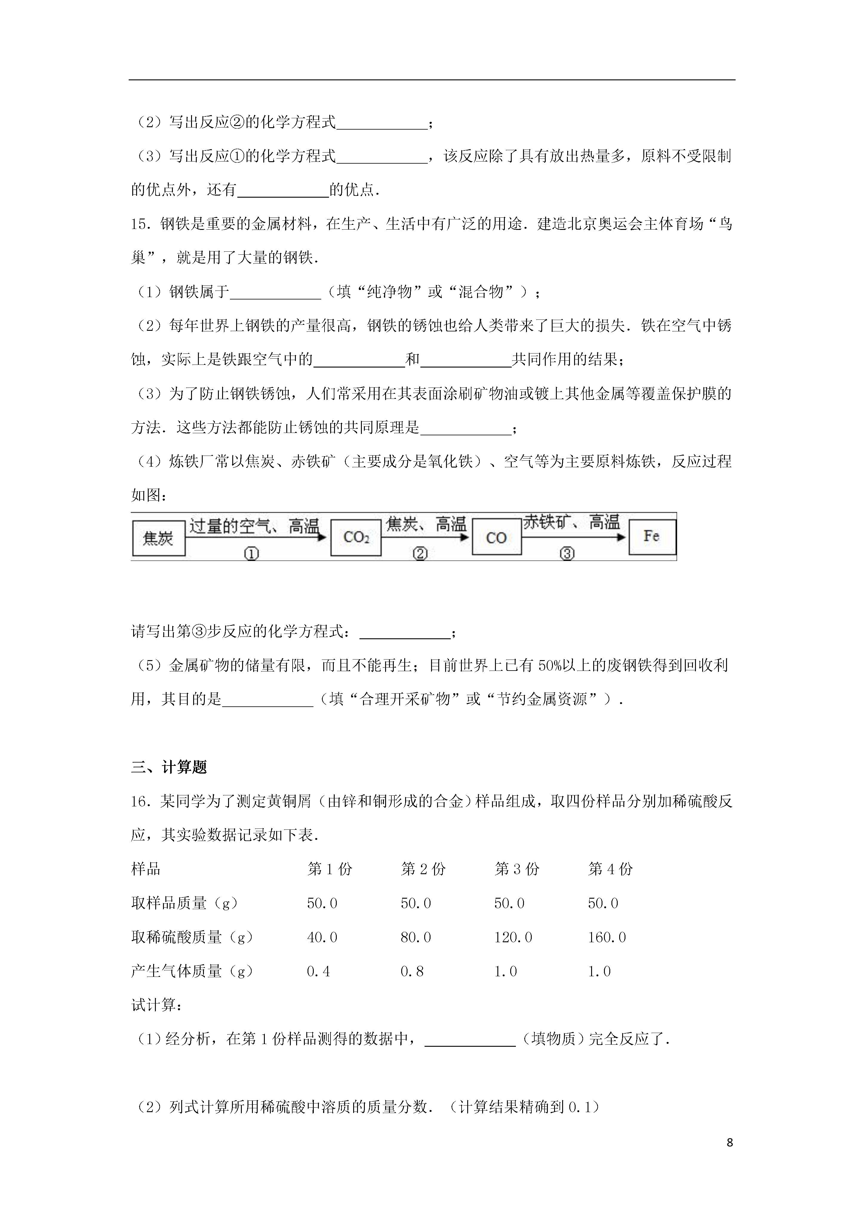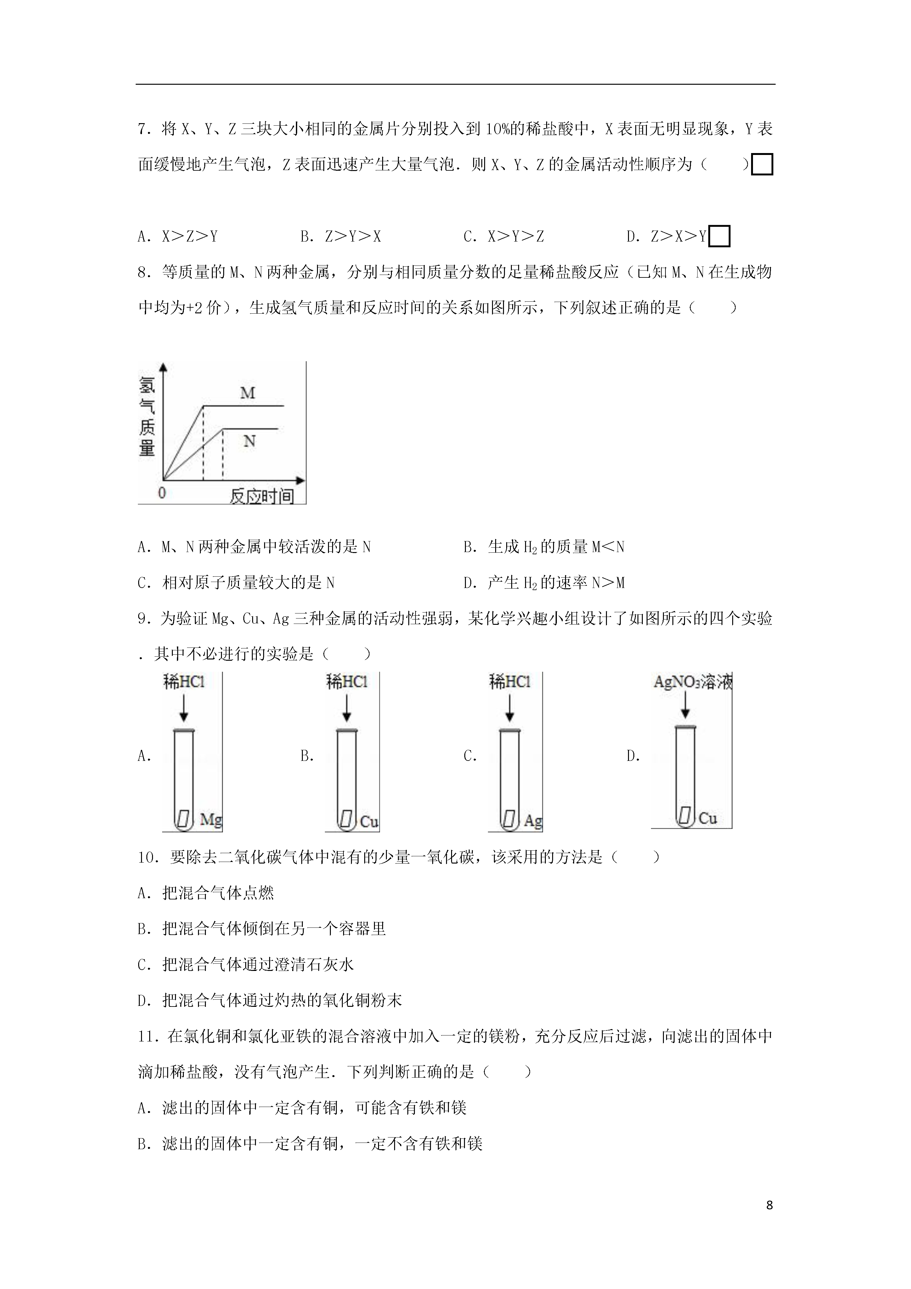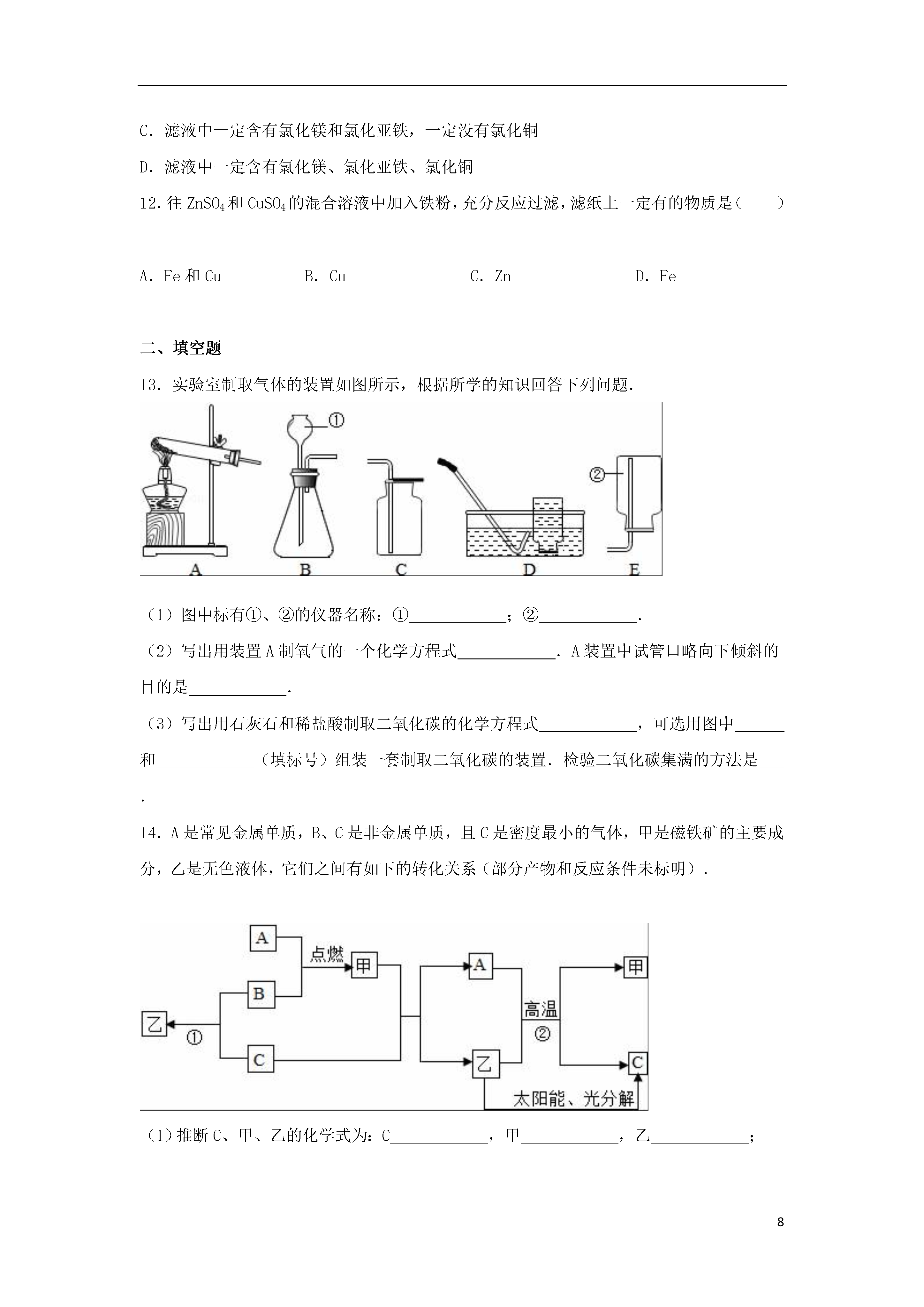82015-2016学年江苏省连云港市灌南县实验中学九年级(上)期末化学模拟试卷一、选择题(共12个小题,共24分,每小题2分.将正确答案序号填在下面的表格里)1.CO2和O2是自然界中生命活动不可缺少的两种气体,下列对它们的认识中,正确的是()A.都含有氧分子B.都能供动物呼吸C.都不溶于水D.密度都比空气大2.下列气体与空气混合后点燃,可能发生爆炸的是()A.甲烷B.二氧化碳C.氮气D.无此选项3.如图是某兴趣小组设计的四个实验装置,其中实验操作设计正确的是()A.稀释浓硫酸B.探究可燃物燃烧的条件C.称量氯化钠D.验证质量守恒定律4.如图是一幅贴在汽车加油站的宣传广告.下列叙述错误的是()A.由玉米生产的乙醇可添加在汽油中作汽车燃料B.玉米汁可作汽车燃料C.推广玉米生产的燃料可在一定程度上缓解当前的能源危机D.推广乙醇汽油可适度减轻汽车尾气对环境的污染5.下列处理方法不正确的是()A.浓硫酸沾到皮肤上,立即用大量水冲洗B.图书馆着火,用二氧化碳灭火器灭火C.用点火法检查厨房内天然气是否泄漏D.进入久未开启的菜窖前,用燃着的蜡烛试验6.通过实验可以得出的结论,其中实验结论正确的是()①既可说明甲烷具有可燃性,又说明了甲烷是由氢元素和碳元素组成;②既可说明二氧化碳的密度比空气大,又说明了二氧化碳不能燃烧也不支持燃烧;③既可说明水是由氢、氧元素组成,又说明了水分子中氢原子和氧原子个数之比为2:1;④既可探究可燃物的燃烧条件,又说明了白磷的着火点比红磷低;⑤既可说明二氧化碳易溶于水,又说明了二氧化碳具有酸性.A.①②③④B.②③④⑤C.②③④D.①②③④⑤7.将X、Y、Z三块大小相同的金属片分别投入到10%的稀盐酸中,X表面无明显现象,Y表面缓慢地产生气泡,Z表面迅速产生大量气泡.则X、Y、Z的金属活动性顺序为()A.X>Z>YB.Z>Y>XC.X>Y>ZD.Z>X>Y8.等质量的M、N两种金属,分别与相同质量分数的足量稀盐酸反应(已知M、N在生成物中均为+2价),生成氢气质量和反应时间的关系如图所示,下列叙述正确的是()A.M、N两种金属中较活泼的是NB.生成H2的质量M<NC.相对原子质量较大的是ND.产生H2的速率N>M9.为验证Mg、Cu、Ag三种金属的活动性强弱,某化学兴趣小组设计了如图所示的四个实验.其中不必进行的实验是()A.B.C.D.10.要除去二氧化碳气体中混有的少量一氧化碳,该采用的方法是()A.把混合气体点燃B.把混合气体倾倒在另一个容器里C.把混合气体通过澄清石灰水D.把混合气体通过灼热的氧化铜粉末11.在氯化铜和氯化亚铁的混合溶液中加入一定的镁粉,充分反应后过滤,向滤出的固体中滴加稀盐酸,没有气泡产生.下列判断正确的是()A.滤出的固体中一定含有铜,可能含有铁和镁B.滤出的固体中一定含有铜,一定不含有铁和镁C.滤液中一定含有氯化镁和氯化亚铁,一定没有氯化铜D.滤液中一定含有氯化镁、氯化亚铁、氯化铜12.往ZnSO4和CuSO4的混合溶液中加入铁粉,充分反应过滤,滤纸上一定有的物质是()A.Fe和CuB.CuC.ZnD.Fe二、填空题13.实验室制取气体的装置如图所示,根据所学的知识回答下列问题.(1)图中标有①、②的仪器名称:①;②.(2)写出用装置A制氧气的一个化学方程式.A装置中试管口略向下倾斜的目的是.(3)写出用石灰石和稀盐酸制取二氧化碳的化学方程式,可选用图中和(填标号)组装一套制取二氧化碳的装置.检验二氧化碳集满的方法是.14.A是常见金属单质,B、C是非金属单质,且C是密度最小的气体,甲是磁铁矿的主要成分,乙是无色液体,它们之间有如下的转化关系(部分产物和反应条件未标明).(1)推断C、甲、乙的化学式为:C,甲,乙;(2)写出反应②的化学方程式;(3)写出反应①的化学方程式,该反应除了具有放出热量多,原料不受限制的优点外,还有的优点.15.钢铁是重要的金属材料,在生产、生活中有广泛的用途.建造北京奥运会主体育场“鸟巢”,就是用了大量的钢铁.(1)钢铁属于(填“纯净物”或“混合物”);(2)每年世界上钢铁的产量很高,钢铁的锈蚀也给人类带来了巨大的损失.铁在空气中锈蚀,实际上是铁跟空气中的和共同作用的结果;(3)为了防止钢铁锈蚀,人们常采用在其表面涂刷矿物油或镀上其他金属等覆盖保护膜的方法.这些方法都能防止锈蚀的共同原理是;(4)炼铁厂常以焦炭、赤铁矿(主要成分是氧化铁)、空气等为主要原料炼铁,反应过程如图:请写出第③步反应的化学方程式:;(5)金属矿物的储量有限,而且不能再生;目前世界上已有50%以上的废钢铁得到回收利用,其目的是