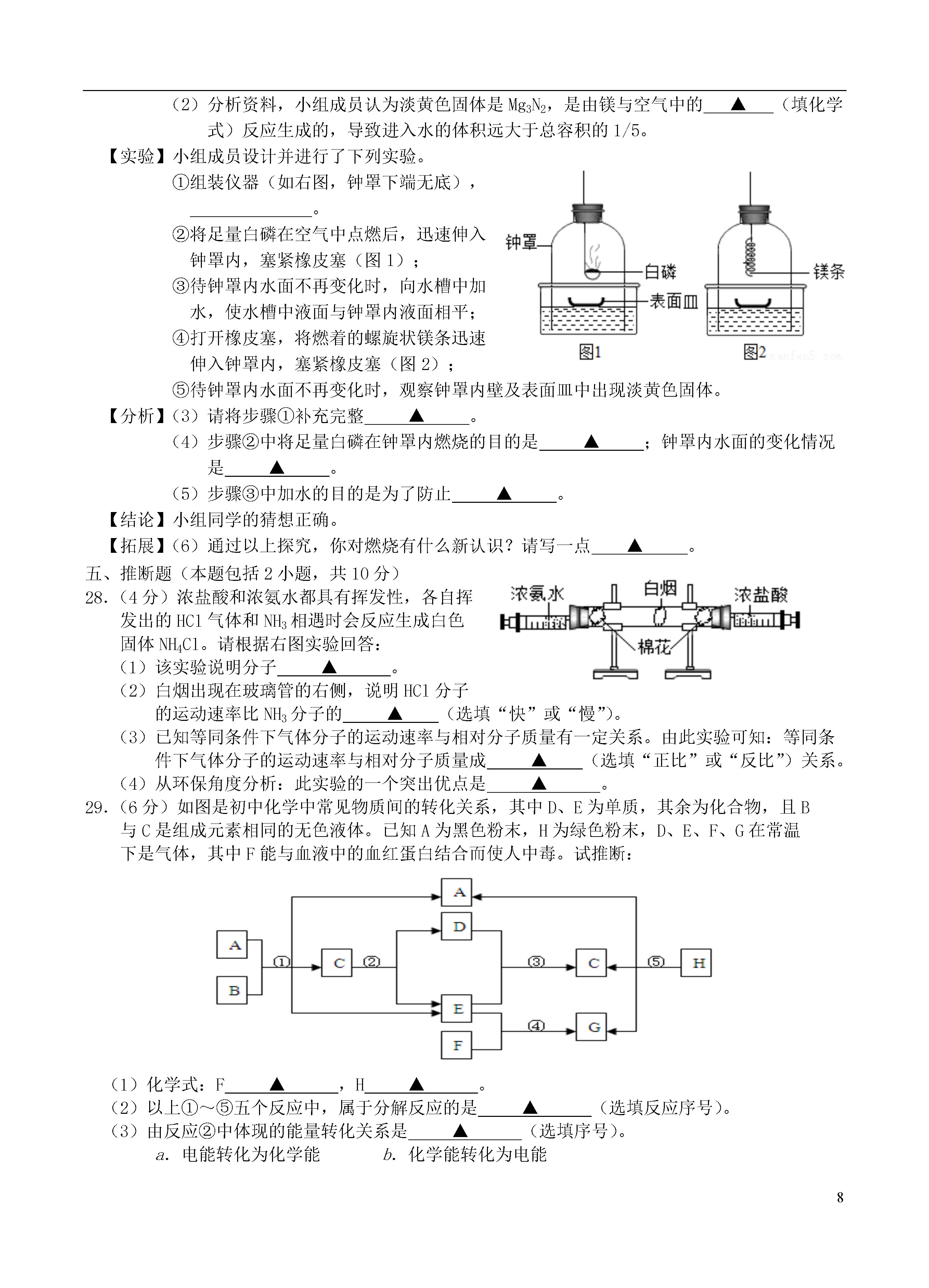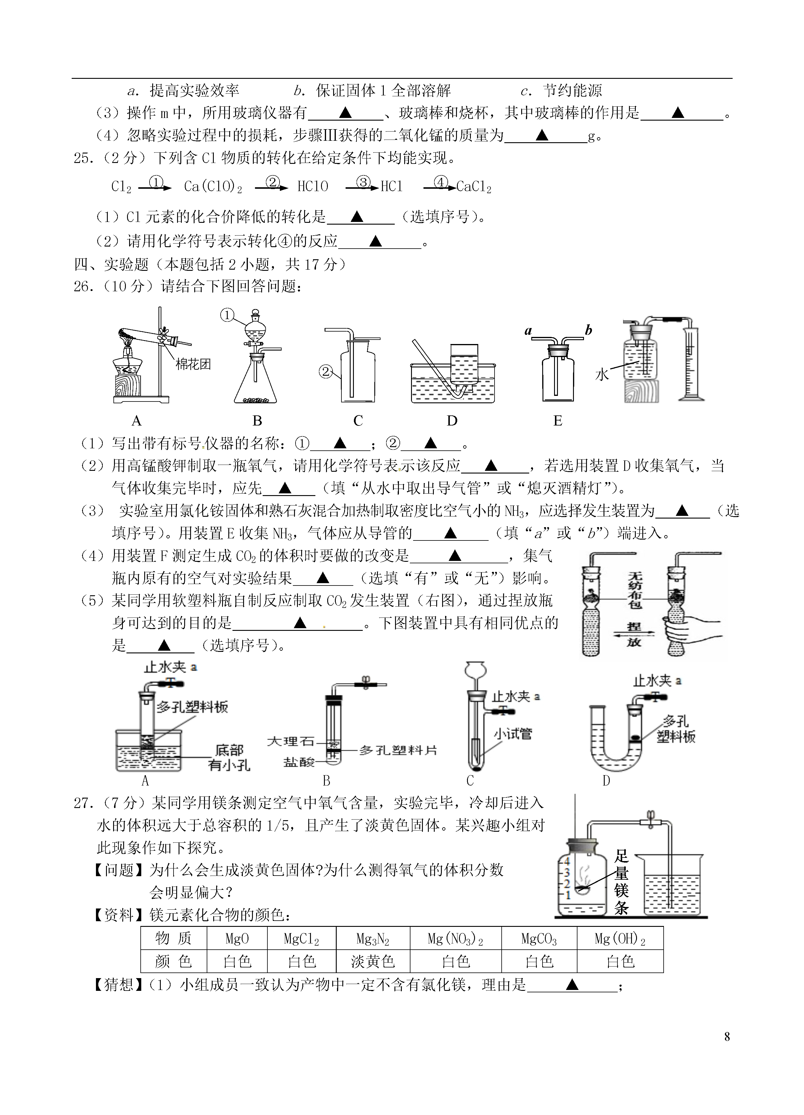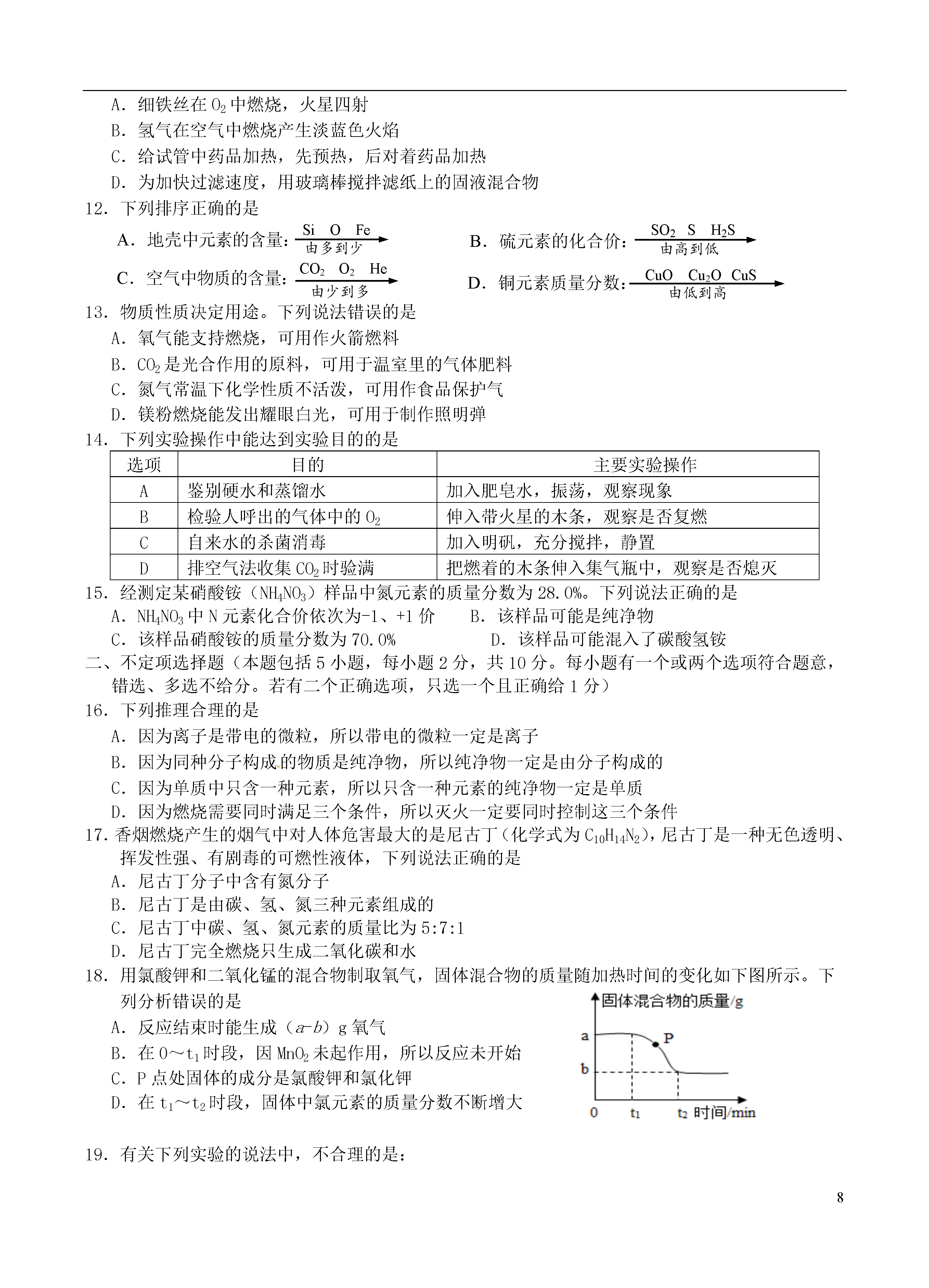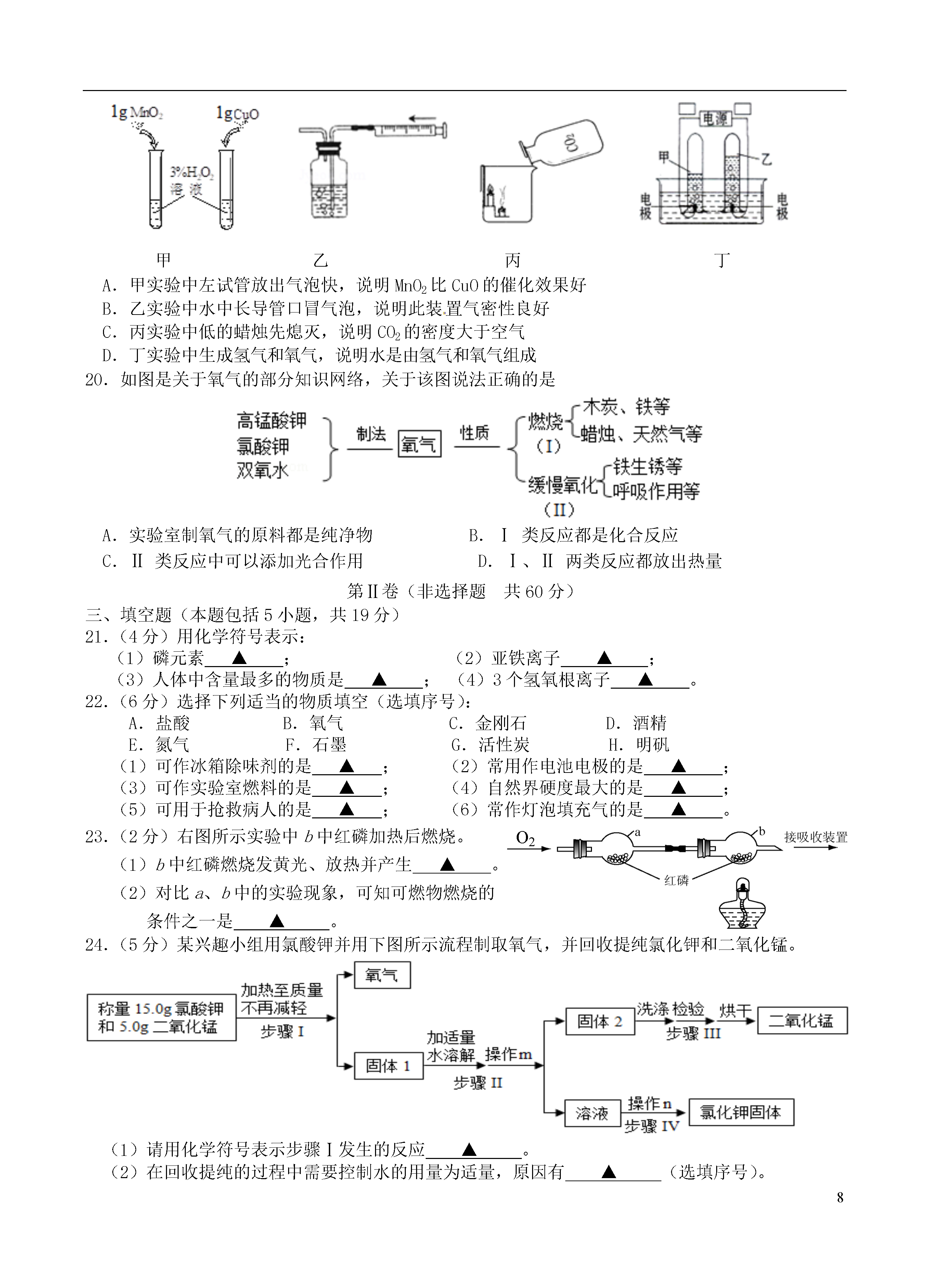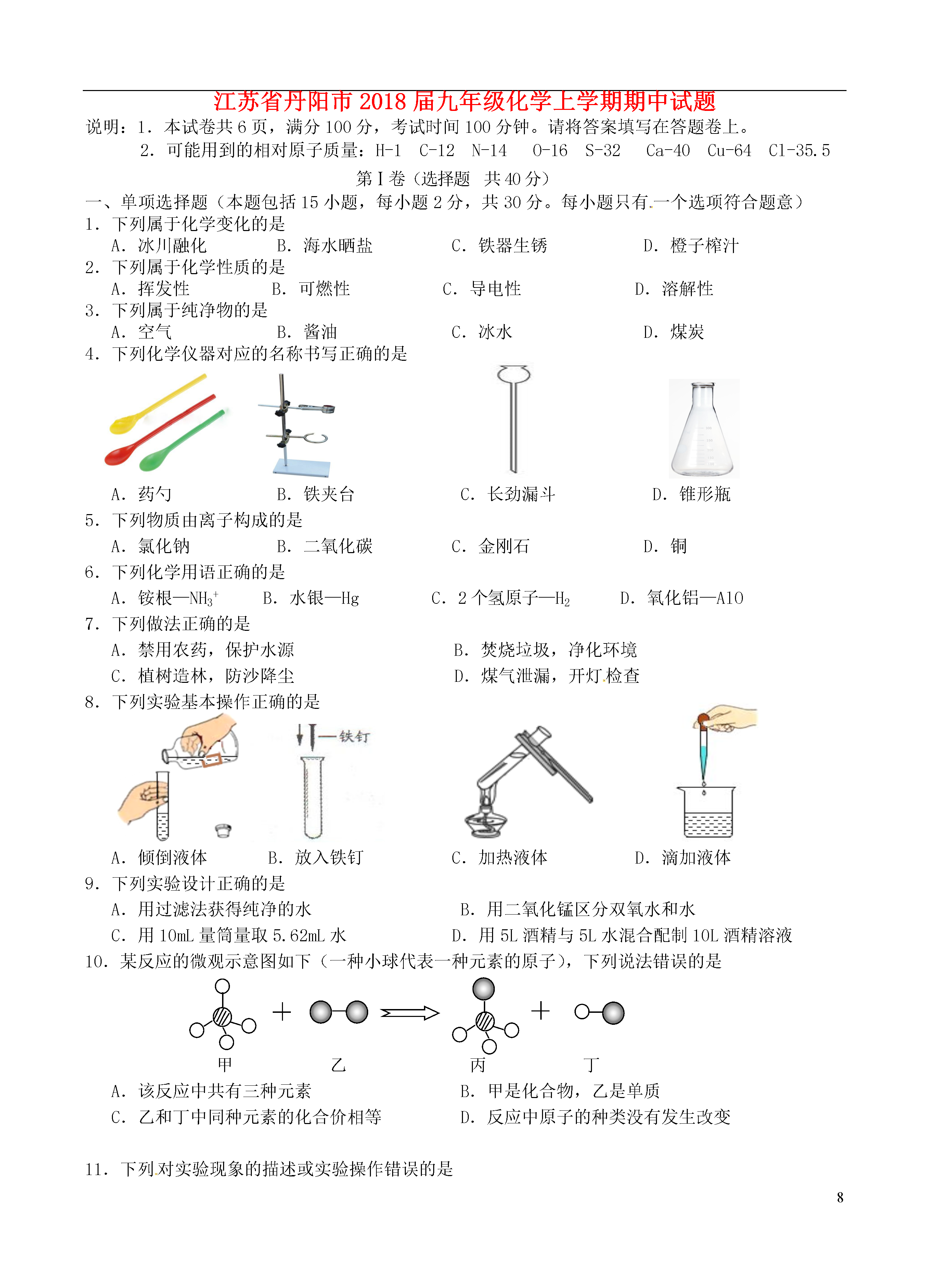 8江苏省丹阳市2018届九年级化学上学期期中试题说明:1.本试卷,满分100分,考试时间100分钟。请将答案填写在答题卷上。2.可能用到的相对原子质量:H-1C-12N-14O-16S-32Ca-40Cu-64Cl-35.5第Ⅰ卷(选择题共40分)一、单项选择题(本题包括15小题,每小题2分,共30分。每小题只有一个选项符合题意)1.下列属于化学变化的是A.冰川融化B.海水晒盐C.铁器生锈D.橙子榨汁2.下列属于化学性质的是A.挥发性B.可燃性C.导电性D.溶解性3.下列属于纯净物的是A.空气B.酱油C.冰水D.煤炭4.下列化学仪器对应的名称书写正确的是A.药勺B.铁夹台C.长劲漏斗D.锥形瓶5.下列物质由离子构成的是A.氯化钠B.二氧化碳C.金刚石D.铜6.下列化学用语正确的是A.铵根—NH3+B.水银—HgC.2个氢原子—H2D.氧化铝—AlO7.下列做法正确的是A.禁用农药,保护水源B.焚烧垃圾,净化环境C.植树造林,防沙降尘D.煤气泄漏,开灯检查8.下列实验基本操作正确的是A.倾倒液体B.放入铁钉C.加热液体D.滴加液体9.下列实验设计正确的是A.用过滤法获得纯净的水B.用二氧化锰区分双氧水和水C.用10mL量筒量取5.62mL水D.用5L酒精与5L水混合配制10L酒精溶液10.某反应的微观示意图如下(一种小球代表一种元素的原子),下列说法错误的是甲乙丙丁A.该反应中共有三种元素B.甲是化合物,乙是单质C.乙和丁中同种元素的化合价相等D.反应中原子的种类没有发生改变11.下列对实验现象的描述或实验操作错误的是A.细铁丝在O2中燃烧,火星四射B.氢气在空气中燃烧产生淡蓝色火焰C.给试管中药品加热,先预热,后对着药品加热D.为加快过滤速度,用玻璃棒搅拌滤纸上的固液混合物A.地壳中元素的含量:SiOFe由多到少B.硫元素的化合价:由高到低SO2SH2SC.空气中物质的含量:CO2O2He由少到多D.铜元素质量分数:CuOCu2OCuS由低到高12.下列排序正确的是13.物质性质决定用途。下列说法错误的是A.氧气能支持燃烧,可用作火箭燃料B.CO2是光合作用的原料,可用于温室里的气体肥料C.氮气常温下化学性质不活泼,可用作食品保护气D.镁粉燃烧能发出耀眼白光,可用于制作照明弹14.下列实验操作中能达到实验目的的是选项目的主要实验操作A鉴别硬水和蒸馏水加入肥皂水,振荡,观察现象B检验人呼出的气体中的O2伸入带火星的木条,观察是否复燃C自来水的杀菌消毒加入明矾,充分搅拌,静置D排空气法收集CO2时验满把燃着的木条伸入集气瓶中,观察是否熄灭15.经测定某硝酸铵(NH4NO3)样品中氮元素的质量分数为28.0%。下列说法正确的是A.NH4NO3中N元素化合价依次为-1、+1价B.该样品可能是纯净物C.该样品硝酸铵的质量分数为70.0%D.该样品可能混入了碳酸氢铵二、不定项选择题(本题包括5小题,每小题2分,共10分。每小题有一个或两个选项符合题意,错选、多选不给分。若有二个正确选项,只选一个且正确给1分)16.下列推理合理的是A.因为离子是带电的微粒,所以带电的微粒一定是离子B.因为同种分子构成的物质是纯净物,所以纯净物一定是由分子构成的C.因为单质中只含一种元素,所以只含一种元素的纯净物一定是单质D.因为燃烧需要同时满足三个条件,所以灭火一定要同时控制这三个条件17.香烟燃烧产生的烟气中对人体危害最大的是尼古丁(化学式为C10H14N2),尼古丁是一种无色透明、挥发性强、有剧毒的可燃性液体,下列说法正确的是A.尼古丁分子中含有氮分子B.尼古丁是由碳、氢、氮三种元素组成的C.尼古丁中碳、氢、氮元素的质量比为5:7:1D.尼古丁完全燃烧只生成二氧化碳和水18.用氯酸钾和二氧化锰的混合物制取氧气,固体混合物的质量随加热时间的变化如下图所示。下列分析错误的是A.反应结束时能生成(a-b)g氧气B.在0~t1时段,因MnO2未起作用,所以反应未开始C.P点处固体的成分是氯酸钾和氯化钾D.在t1~t2时段,固体中氯元素的质量分数不断增大19.有关下列实验的说法中,不合理的是:甲乙丙丁A.甲实验中左试管放出气泡快,说明MnO2比CuO的催化效果好B.乙实验中水中长导管口冒气泡,说明此装置气密性良好C.丙实验中低的蜡烛先熄灭,说明CO2的密度大于空气D.丁实验中生成氢气和氧气,说明水是由氢气和氧气组成20.如图是关于氧气的部分知识网络,关于该图说法正确的是A.实验室制氧气的原料都是纯净物B.Ⅰ类反应都是化合反应C.Ⅱ类反应中可以添