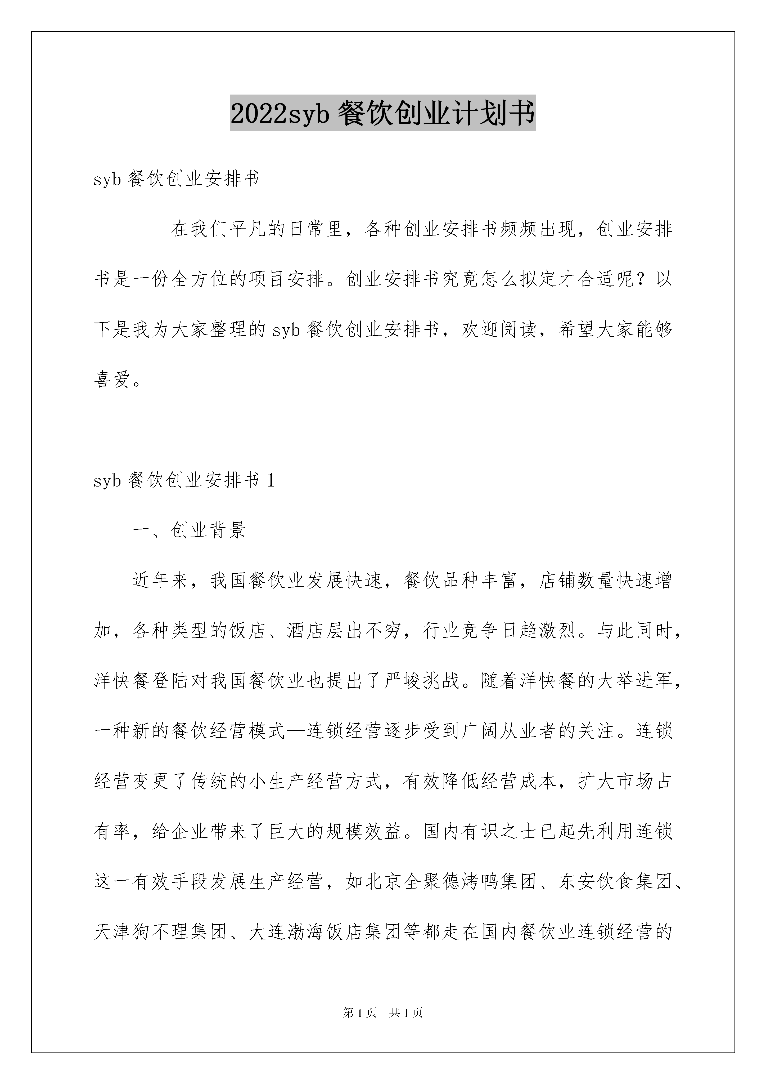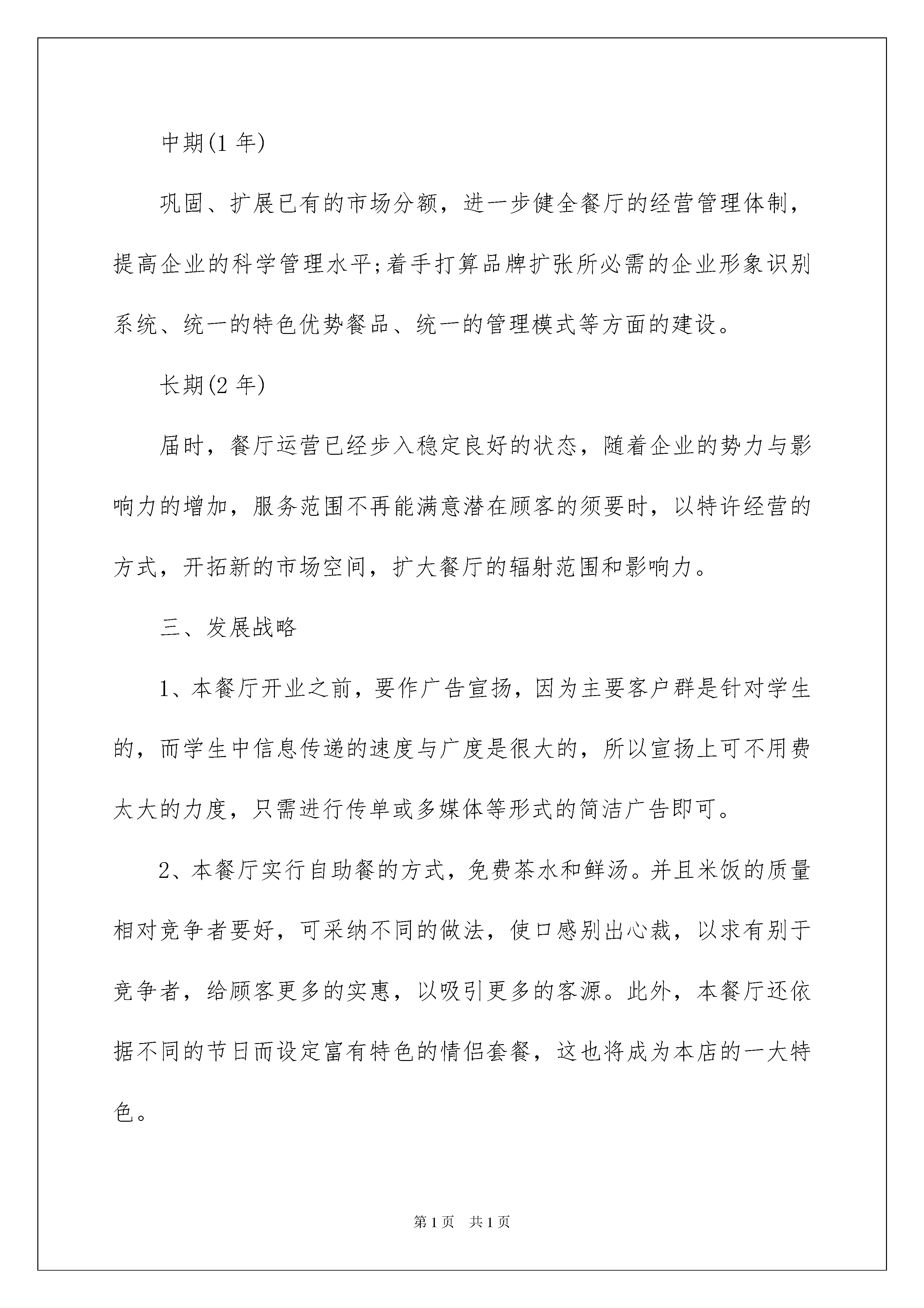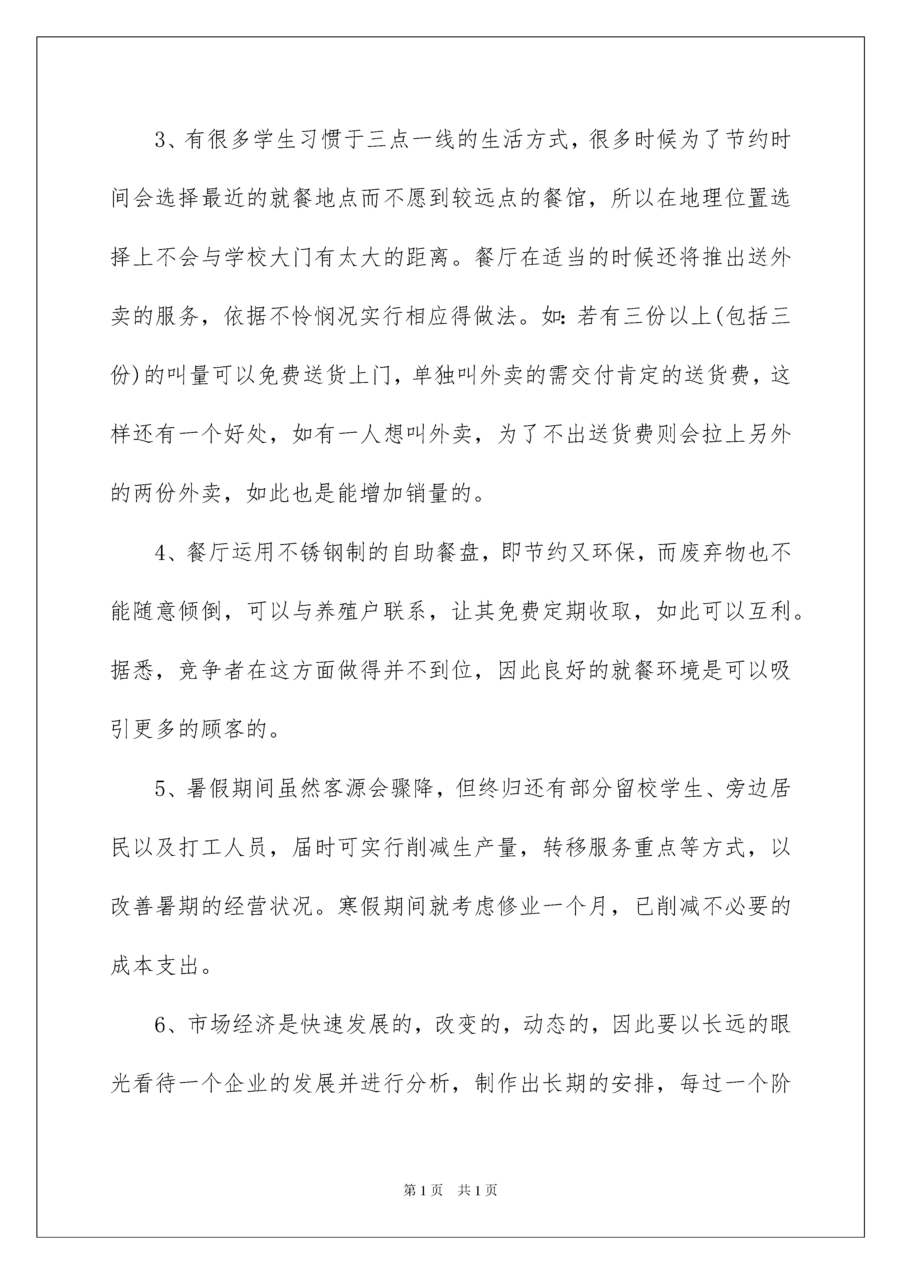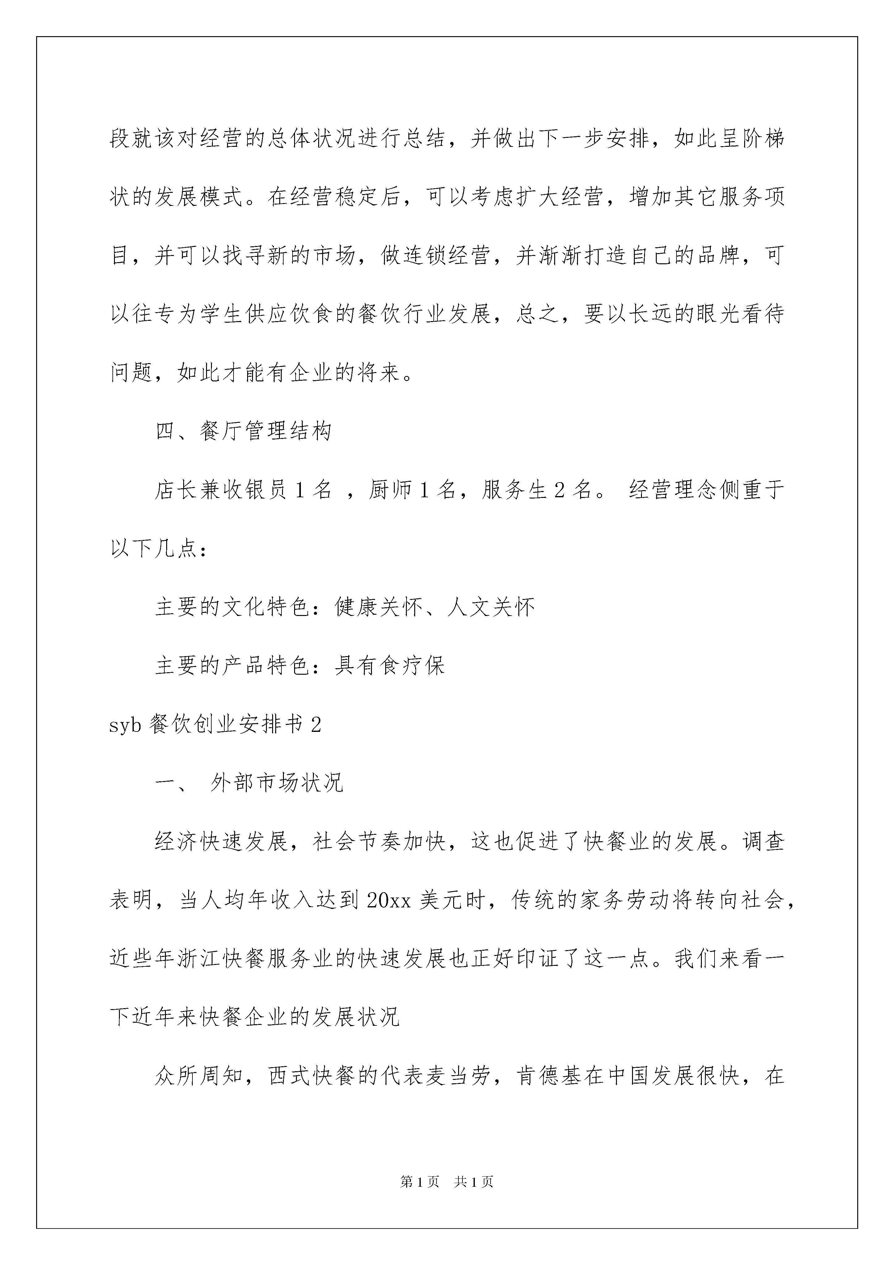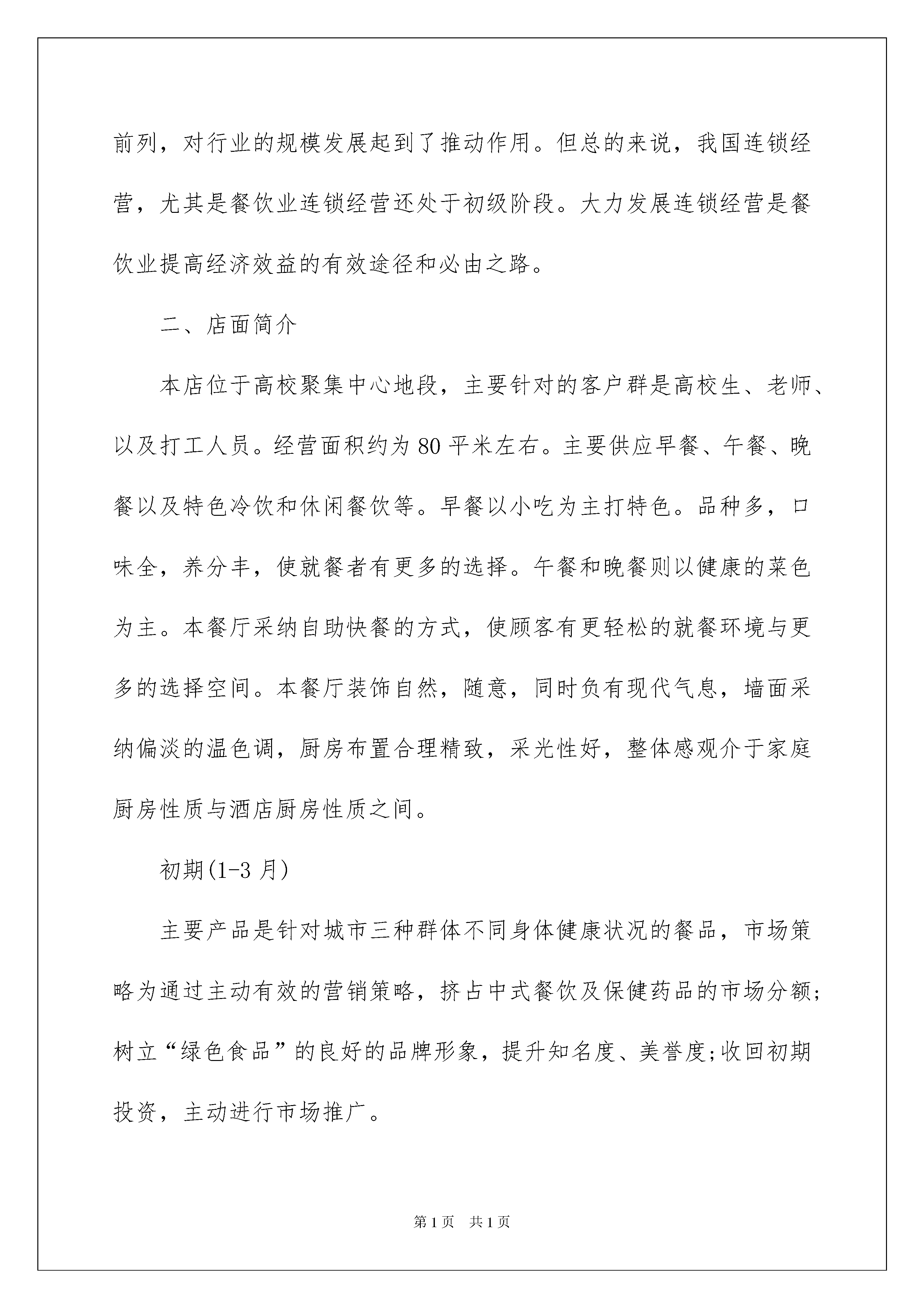 2022syb餐饮创业计划书syb餐饮创业安排书在我们平凡的日常里,各种创业安排书频频出现,创业安排书是一份全方位的项目安排。创业安排书究竟怎么拟定才合适呢?以下是我为大家整理的syb餐饮创业安排书,欢迎阅读,希望大家能够喜爱。syb餐饮创业安排书1一、创业背景近年来,我国餐饮业发展快速,餐饮品种丰富,店铺数量快速增加,各种类型的饭店、酒店层出不穷,行业竞争日趋激烈。与此同时,洋快餐登陆对我国餐饮业也提出了严峻挑战。随着洋快餐的大举进军,一种新的餐饮经营模式—连锁经营逐步受到广阔从业者的关注。连锁经营变更了传统的小生产经营方式,有效降低经营成本,扩大市场占有率,给企业带来了巨大的规模效益。国内有识之士已起先利用连锁这一有效手段发展生产经营,如北京全聚德烤鸭集团、东安饮食集团、天津狗不理集团、大连渤海饭店集团等都走在国内餐饮业连锁经营的前列,对行业的规模发展起到了推动作用。但总的来说,我国连锁经营,尤其是餐饮业连锁经营还处于初级阶段。大力发展连锁经营是餐饮业提高经济效益的有效途径和必由之路。二、店面简介本店位于高校聚集中心地段,主要针对的客户群是高校生、老师、以及打工人员。经营面积约为80平米左右。主要供应早餐、午餐、晚餐以及特色冷饮和休闲餐饮等。早餐以小吃为主打特色。品种多,口味全,养分丰,使就餐者有更多的选择。午餐和晚餐则以健康的菜色为主。本餐厅采纳自助快餐的方式,使顾客有更轻松的就餐环境与更多的选择空间。本餐厅装饰自然,随意,同时负有现代气息,墙面采纳偏淡的温色调,厨房布置合理精致,采光性好,整体感观介于家庭厨房性质与酒店厨房性质之间。初期(1-3月)主要产品是针对城市三种群体不同身体健康状况的餐品,市场策略为通过主动有效的营销策略,挤占中式餐饮及保健药品的市场分额;树立“绿色食品”的良好的品牌形象,提升知名度、美誉度;收回初期投资,主动进行市场推广。中期(1年)巩固、扩展已有的市场分额,进一步健全餐厅的经营管理体制,提高企业的科学管理水平;着手打算品牌扩张所必需的企业形象识别系统、统一的特色优势餐品、统一的管理模式等方面的建设。长期(2年)届时,餐厅运营已经步入稳定良好的状态,随着企业的势力与影响力的增加,服务范围不再能满意潜在顾客的须要时,以特许经营的方式,开拓新的市场空间,扩大餐厅的辐射范围和影响力。三、发展战略1、本餐厅开业之前,要作广告宣扬,因为主要客户群是针对学生的,而学生中信息传递的速度与广度是很大的,所以宣扬上可不用费太大的力度,只需进行传单或多媒体等形式的简洁广告即可。2、本餐厅实行自助餐的方式,免费茶水和鲜汤。并且米饭的质量相对竞争者要好,可采纳不同的做法,使口感别出心裁,以求有别于竞争者,给顾客更多的实惠,以吸引更多的客源。此外,本餐厅还依据不同的节日而设定富有特色的情侣套餐,这也将成为本店的一大特色。3、有很多学生习惯于三点一线的生活方式,很多时候为了节约时间会选择最近的就餐地点而不愿到较远点的餐馆,所以在地理位置选择上不会与学校大门有太大的距离。餐厅在适当的时候还将推出送外卖的服务,依据不怜悯况实行相应得做法。如:若有三份以上(包括三份)的叫量可以免费送货上门,单独叫外卖的需交付肯定的送货费,这样还有一个好处,如有一人想叫外卖,为了不出送货费则会拉上另外的两份外卖,如此也是能增加销量的。4、餐厅运用不锈钢制的自助餐盘,即节约又环保,而废弃物也不能随意倾倒,可以与养殖户联系,让其免费定期收取,如此可以互利。据悉,竞争者在这方面做得并不到位,因此良好的就餐环境是可以吸引更多的顾客的。5、暑假期间虽然客源会骤降,但终归还有部分留校学生、旁边居民以及打工人员,届时可实行削减生产量,转移服务重点等方式,以改善暑期的经营状况。寒假期间就考虑修业一个月,已削减不必要的成本支出。6、市场经济是快速发展的,改变的,动态的,因此要以长远的眼光看待一个企业的发展并进行分析,制作出长期的安排,每过一个阶段就该对经营的总体状况进行总结,并做出下一步安排,如此呈阶梯状的发展模式。在经营稳定后,可以考虑扩大经营,增加其它服务项目,并可以找寻新的市场,做连锁经营,并渐渐打造自己的品牌,可以往专为学生供应饮食的餐饮行业发展,总之,要以长远的眼光看待问题,如此才能有企业的将来。四、餐厅管理结构店长兼收银员1名,厨师1名,服务生2名。经营理念侧重于以下几点:主要的文化特色:健康关怀、人文关怀主要的产品特色:具有食疗保syb餐饮创业安排书2一、外部市场状况经济快速发展,社会节奏加快,这也促进了快餐业的发展。调查表明,当人均年收入达到20xx美元时,传统的家务劳动将转向社会,近些年浙