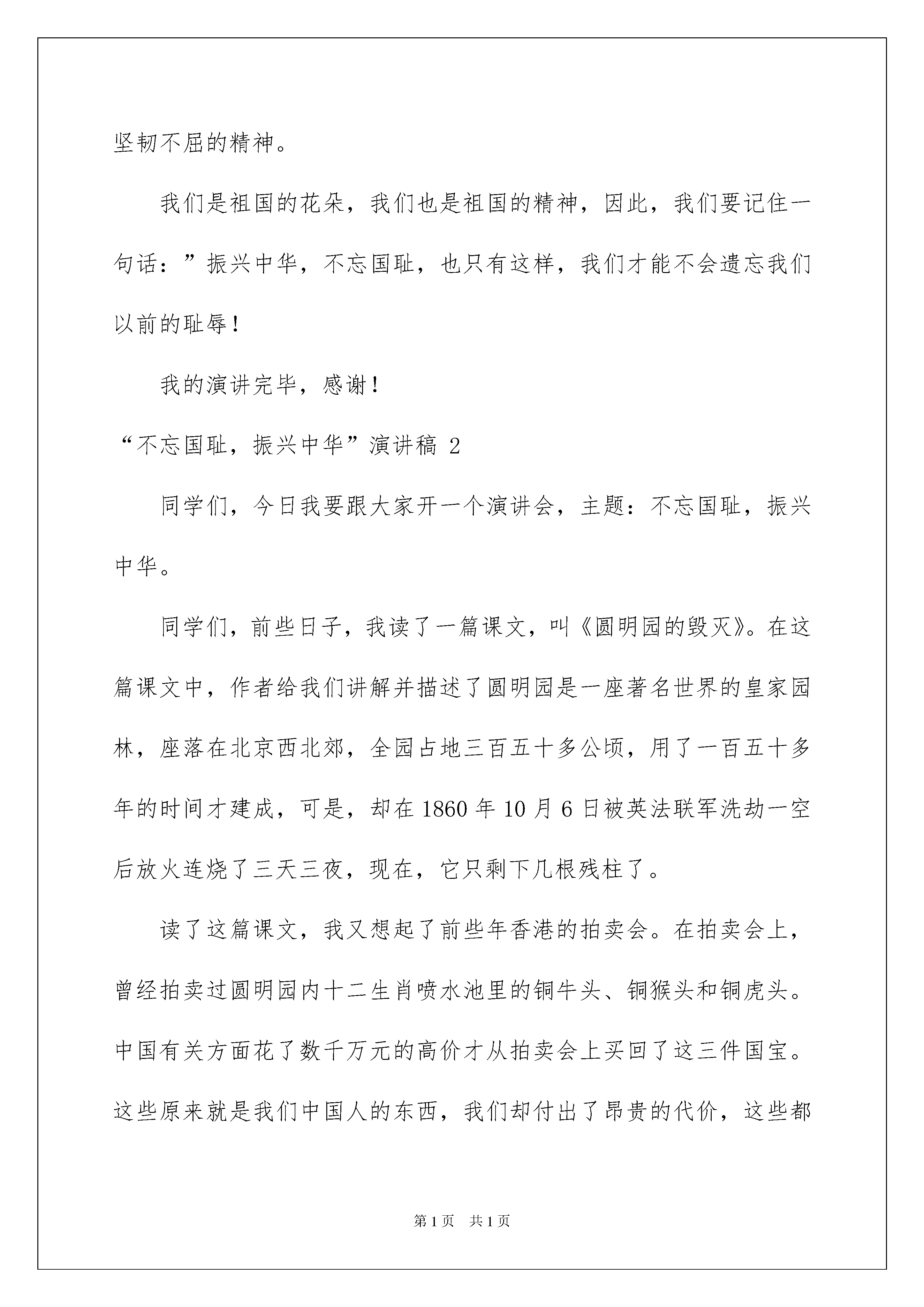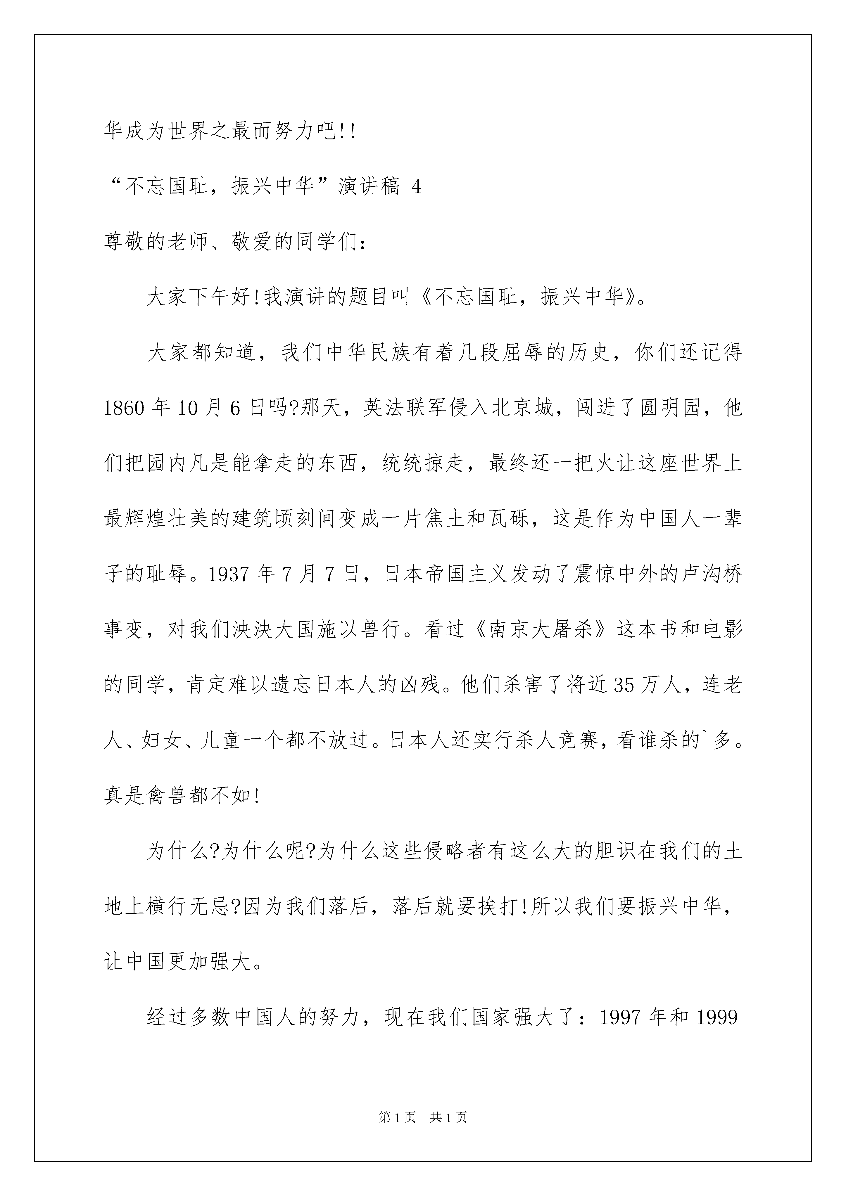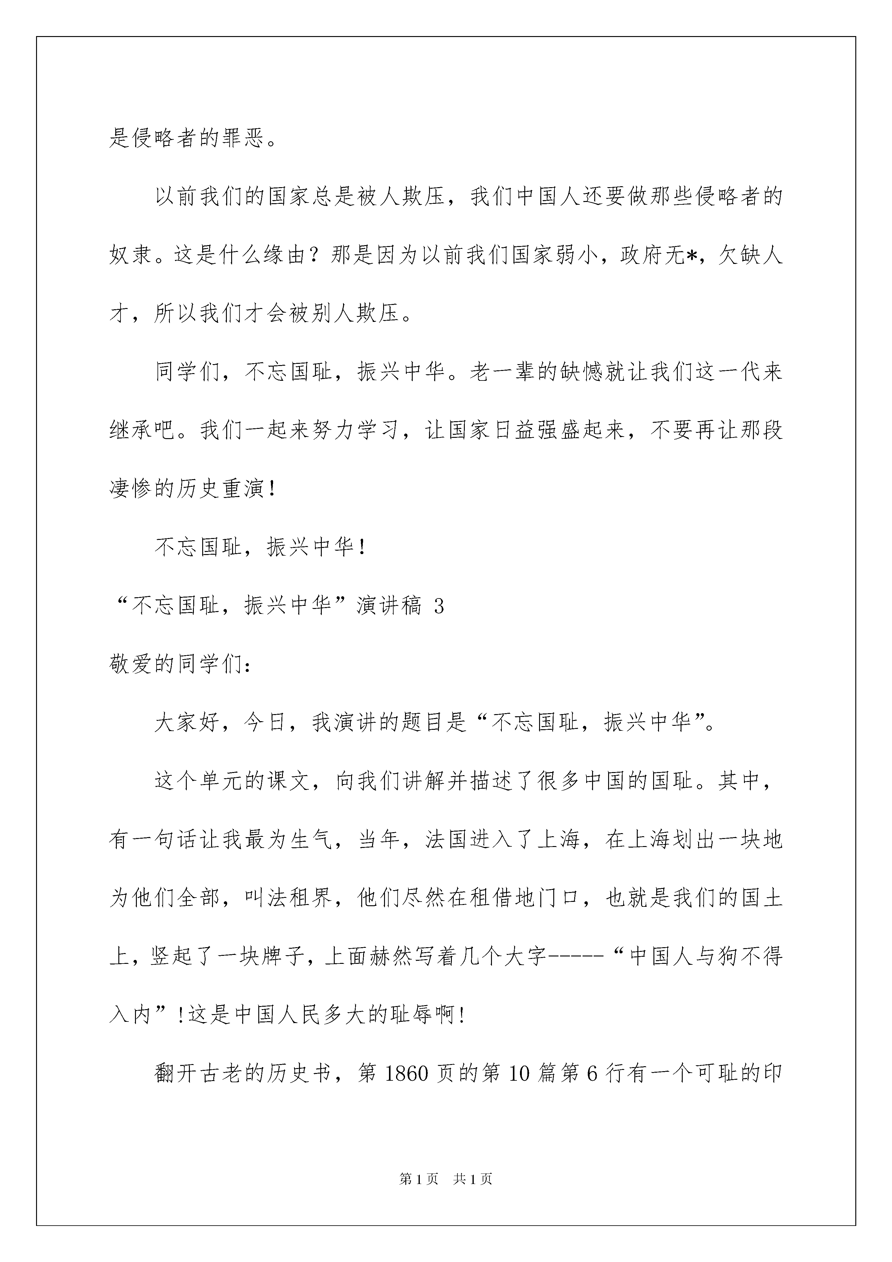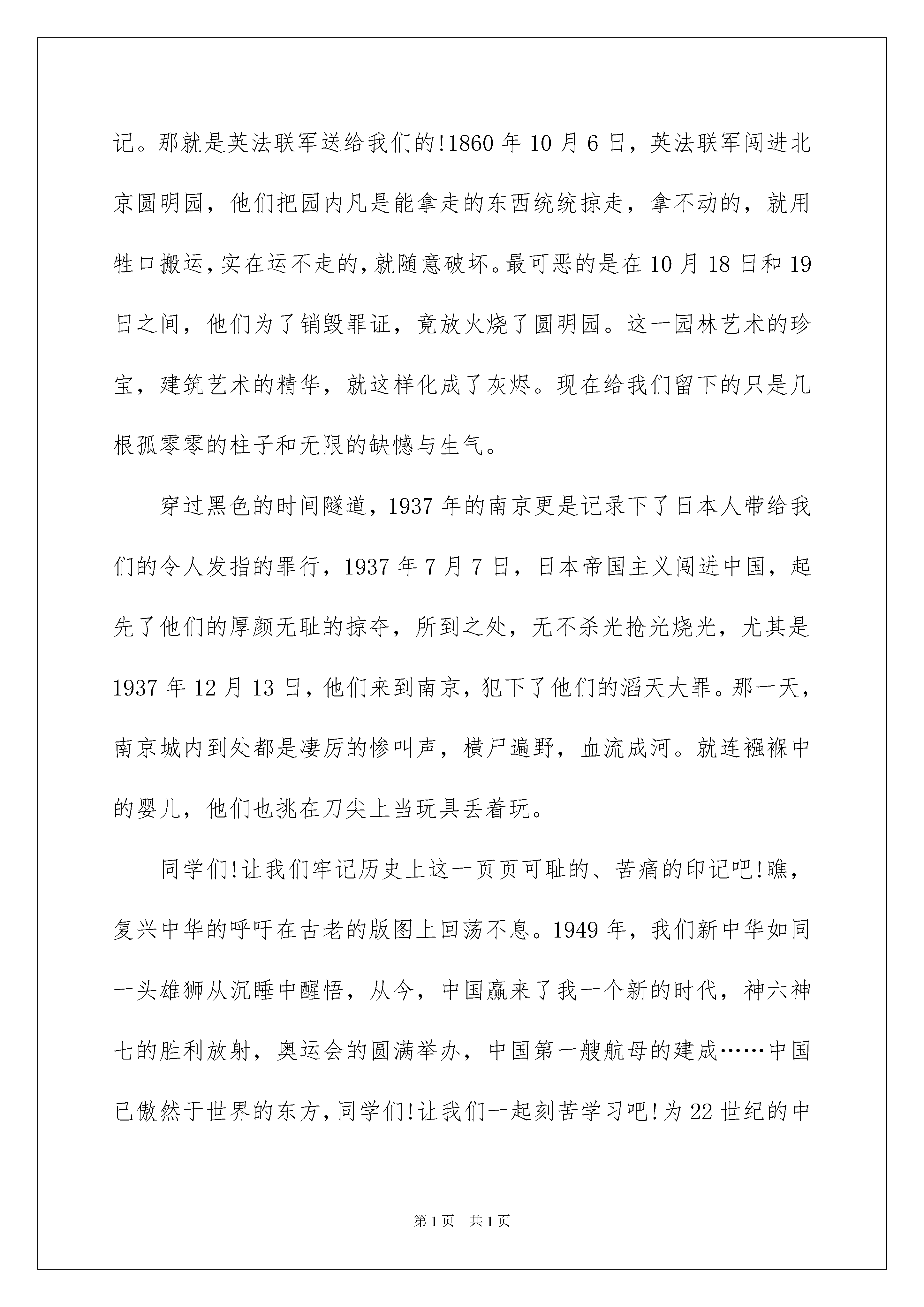 2022“不忘国耻,振兴中华”演讲稿“不忘国耻,振兴中华”演讲稿15篇演讲稿具有观点显明,内容具有鼓动性的特点。在不断进步的时代,我们运用上演讲稿的状况与日俱增,信任许多挚友都对写演讲稿感到特别苦恼吧,以下是我收集整理的“不忘国耻,振兴中华”演讲稿,欢迎大家借鉴与参考,希望对大家有所帮助。“不忘国耻,振兴中华”演讲稿1我们大家都知道,当五星红旗升起来的时候,我们中国有近一百年的耻辱,也有我么抗日斗争的成功。就是因为振兴中华,我们才有今日!中国曾经是多么落后啊!许多土地被割让了,我们又签了多数条不同等条约呀!还有火烧圆明园,南京大屠杀,还有我们跟日本的8年抗日斗争!当我们唱起:“起来,不愿做奴隶的人们,把我们的血肉建成我们新的长城……这也是件当着我们中华人名的少先队员的任务。我们现在生活的那么华蜜,一点损害都没有,都是我们中国人民坚韧不屈的精神。我们是祖国的花朵,我们也是祖国的精神,因此,我们要记住一句话:”振兴中华,不忘国耻,也只有这样,我们才能不会遗忘我们以前的耻辱!我的演讲完毕,感谢!“不忘国耻,振兴中华”演讲稿2同学们,今日我要跟大家开一个演讲会,主题:不忘国耻,振兴中华。同学们,前些日子,我读了一篇课文,叫《圆明园的毁灭》。在这篇课文中,作者给我们讲解并描述了圆明园是一座著名世界的皇家园林,座落在北京西北郊,全园占地三百五十多公顷,用了一百五十多年的时间才建成,可是,却在1860年10月6日被英法联军洗劫一空后放火连烧了三天三夜,现在,它只剩下几根残柱了。读了这篇课文,我又想起了前些年香港的拍卖会。在拍卖会上,曾经拍卖过圆明园内十二生肖喷水池里的铜牛头、铜猴头和铜虎头。中国有关方面花了数千万元的高价才从拍卖会上买回了这三件国宝。这些原来就是我们中国人的东西,我们却付出了昂贵的代价,这些都是侵略者的罪恶。以前我们的国家总是被人欺压,我们中国人还要做那些侵略者的奴隶。这是什么缘由?那是因为以前我们国家弱小,政府无*,欠缺人才,所以我们才会被别人欺压。同学们,不忘国耻,振兴中华。老一辈的缺憾就让我们这一代来继承吧。我们一起来努力学习,让国家日益强盛起来,不要再让那段凄惨的历史重演!不忘国耻,振兴中华!“不忘国耻,振兴中华”演讲稿3敬爱的同学们:大家好,今日,我演讲的题目是“不忘国耻,振兴中华”。这个单元的课文,向我们讲解并描述了很多中国的国耻。其中,有一句话让我最为生气,当年,法国进入了上海,在上海划出一块地为他们全部,叫法租界,他们尽然在租借地门口,也就是我们的国土上,竖起了一块牌子,上面赫然写着几个大字-----“中国人与狗不得入内”!这是中国人民多大的耻辱啊!翻开古老的历史书,的第10篇第6行有一个可耻的印记。那就是英法联军送给我们的!1860年10月6日,英法联军闯进北京圆明园,他们把园内凡是能拿走的东西统统掠走,拿不动的,就用牲口搬运,实在运不走的,就随意破坏。最可恶的是在10月18日和19日之间,他们为了销毁罪证,竟放火烧了圆明园。这一园林艺术的珍宝,建筑艺术的精华,就这样化成了灰烬。现在给我们留下的只是几根孤零零的柱子和无限的缺憾与生气。穿过黑色的时间隧道,1937年的南京更是记录下了日本人带给我们的令人发指的罪行,1937年7月7日,日本帝国主义闯进中国,起先了他们的厚颜无耻的掠夺,所到之处,无不杀光抢光烧光,尤其是1937年12月13日,他们来到南京,犯下了他们的滔天大罪。那一天,南京城内到处都是凄厉的惨叫声,横尸遍野,血流成河。就连襁褓中的婴儿,他们也挑在刀尖上当玩具丢着玩。同学们!让我们牢记历史上这一页页可耻的、苦痛的印记吧!瞧,复兴中华的呼吁在古老的版图上回荡不息。1949年,我们新中华如同一头雄狮从沉睡中醒悟,从今,中国赢来了我一个新的时代,神六神七的胜利放射,奥运会的圆满举办,中国第一艘航母的建成……中国已傲然于世界的东方,同学们!让我们一起刻苦学习吧!为22世纪的中华成为世界之最而努力吧!!“不忘国耻,振兴中华”演讲稿4尊敬的老师、敬爱的同学们:大家下午好!我演讲的题目叫《不忘国耻,振兴中华》。大家都知道,我们中华民族有着几段屈辱的历史,你们还记得1860年10月6日吗?那天,英法联军侵入北京城,闯进了圆明园,他们把园内凡是能拿走的东西,统统掠走,最终还一把火让这座世界上最辉煌壮美的建筑顷刻间变成一片焦土和瓦砾,这是作为中国人一辈子的耻辱。1937年7月7日,日本帝国主义发动了震惊中外的卢沟桥事变,对我们泱泱大国施以兽行。看过《南京大屠杀》这本书和电影的同学,肯定难以遗忘日本人的凶残。他们杀害了将近35万人,连老人、妇女、儿童一