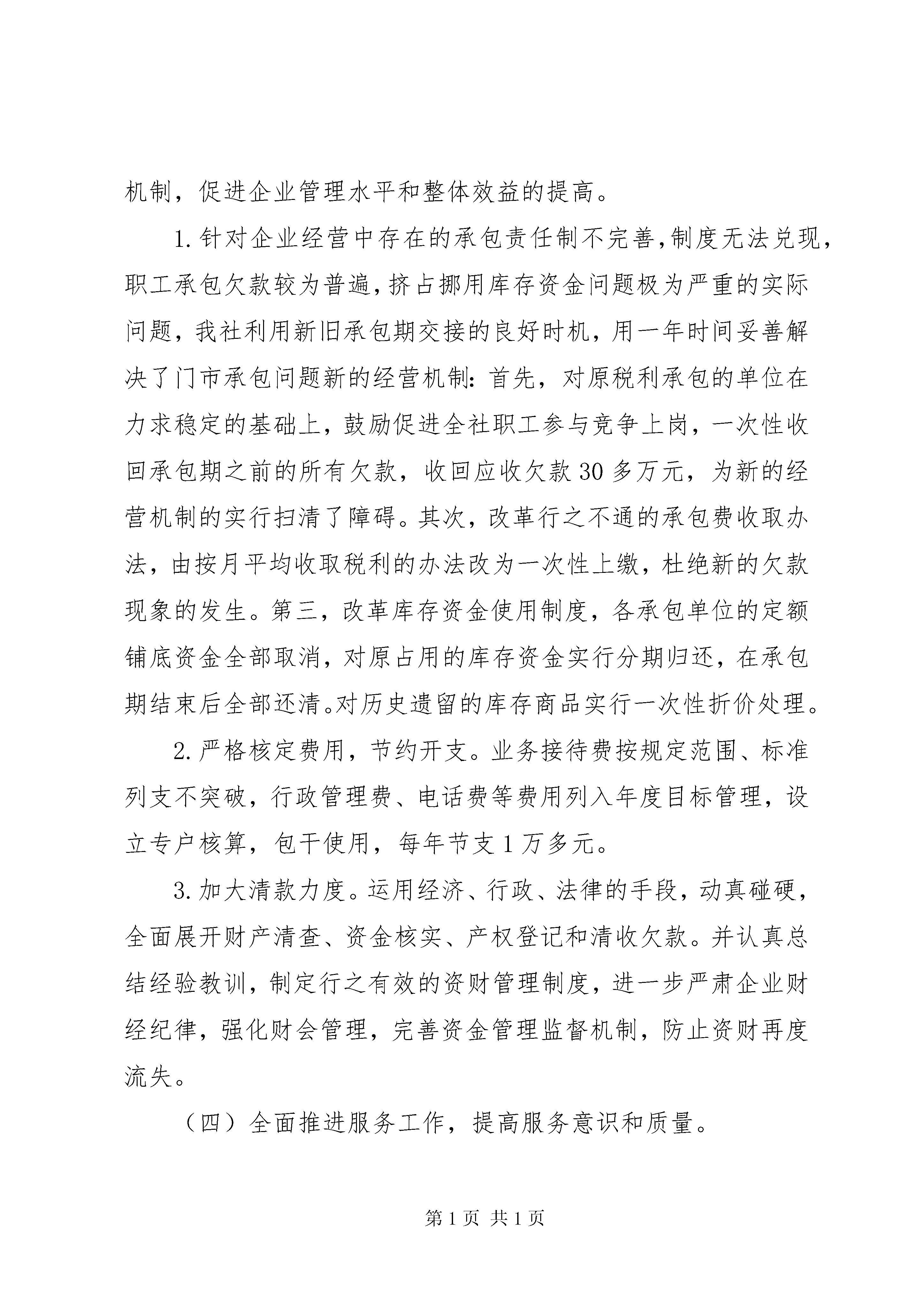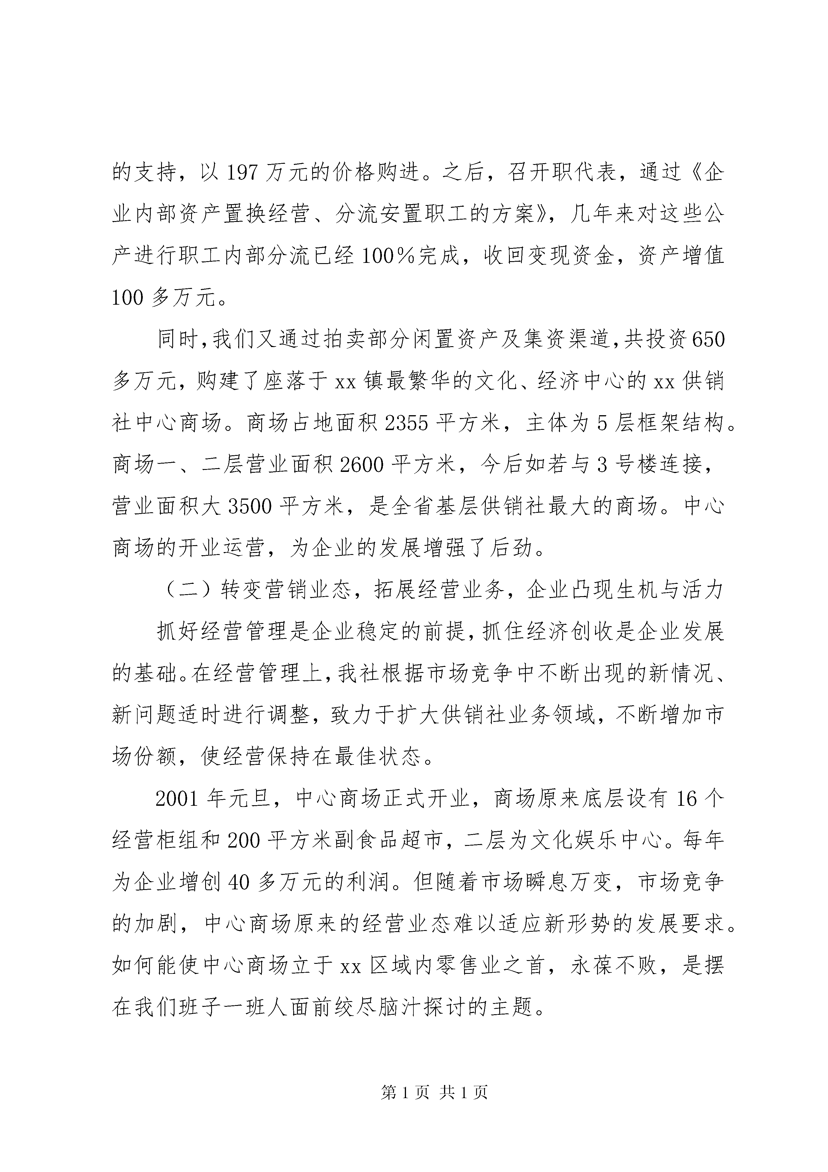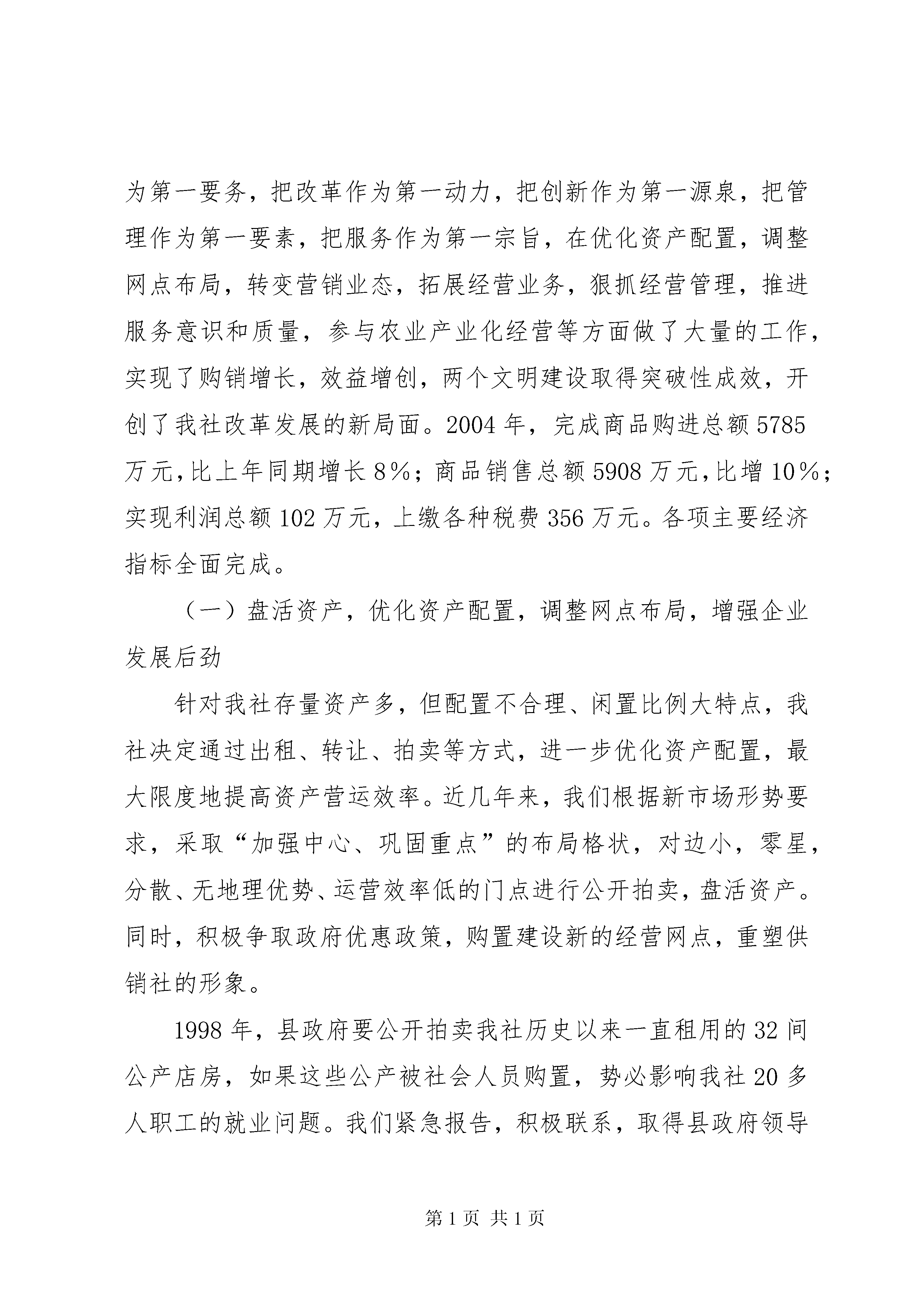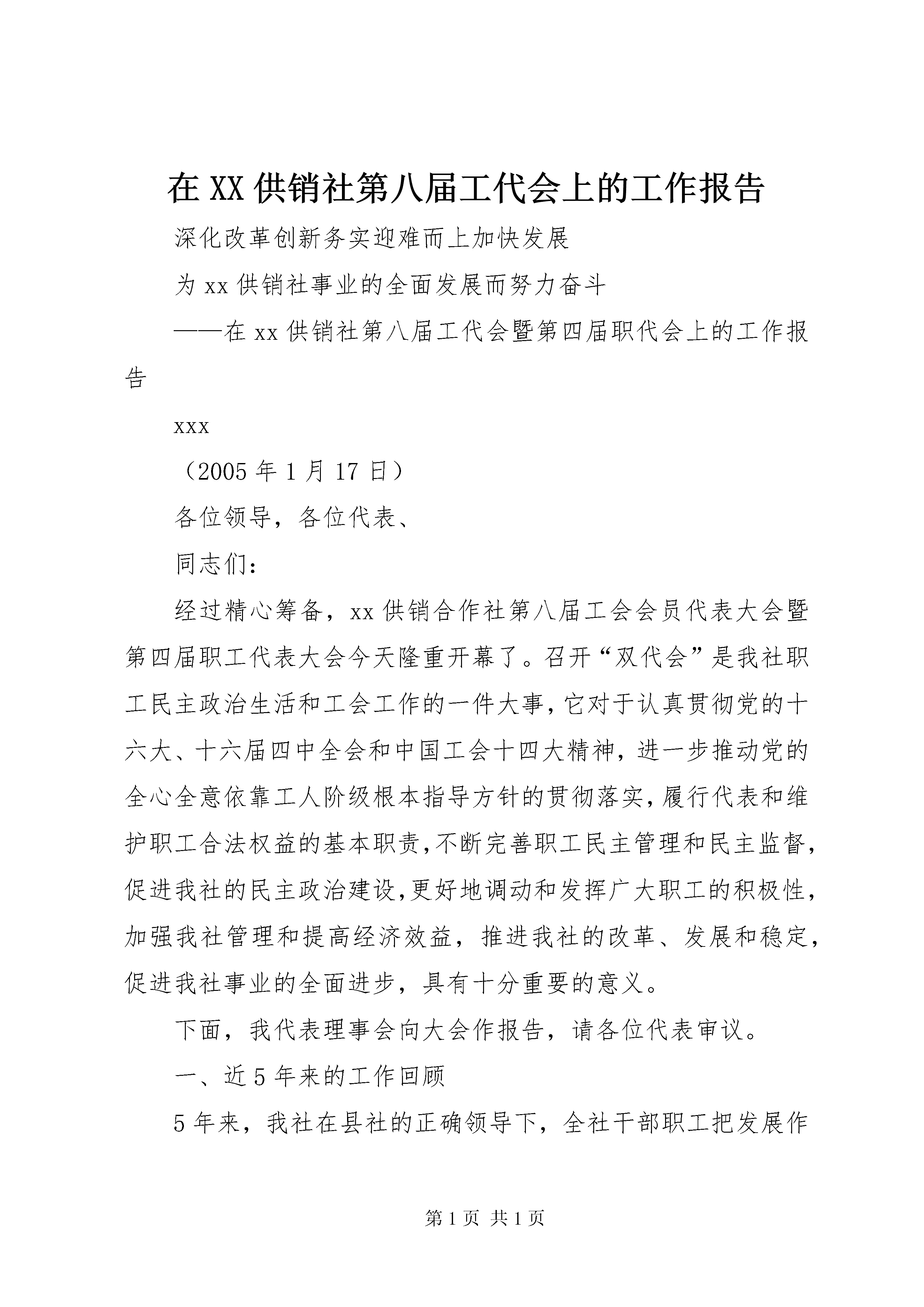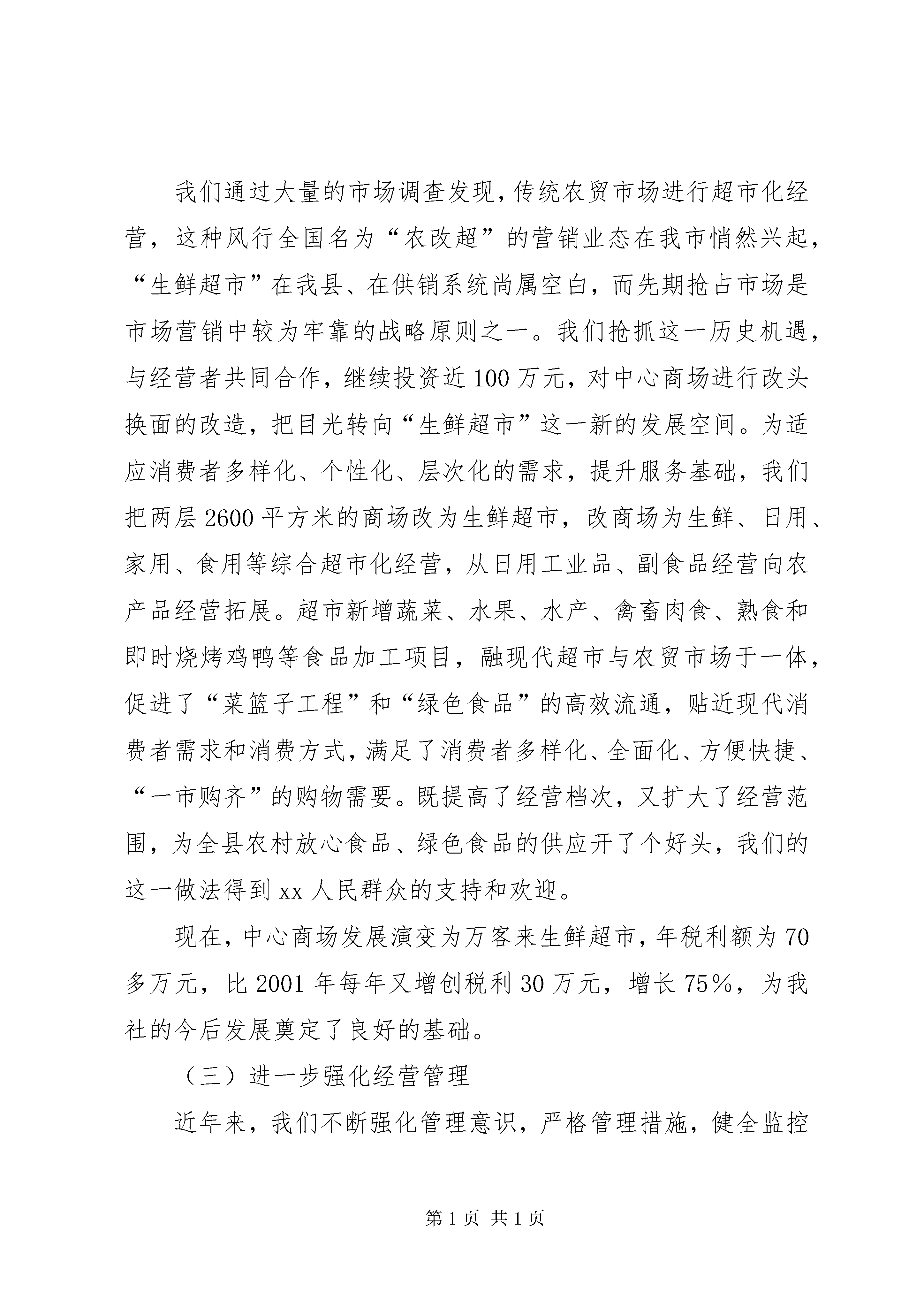 在XX供销社第八届工代会上的工作报告深化改革创新务实迎难而上加快发展为xx供销社事业的全面发展而努力奋斗——在xx供销社第八届工代会暨第四届职代会上的工作报告xxx(2005年1月17日)各位领导,各位代表、同志们:经过精心筹备,xx供销合作社第八届工会会员代表大会暨第四届职工代表大会今天隆重开幕了。召开“双代会”是我社职工民主政治生活和工会工作的一件大事,它对于认真贯彻党的十六大、十六届四中全会和中国工会十四大精神,进一步推动党的全心全意依靠工人阶级根本指导方针的贯彻落实,履行代表和维护职工合法权益的基本职责,不断完善职工民主管理和民主监督,促进我社的民主政治建设,更好地调动和发挥广大职工的积极性,加强我社管理和提高经济效益,推进我社的改革、发展和稳定,促进我社事业的全面进步,具有十分重要的意义。下面,我代表理事会向大会作报告,请各位代表审议。一、近5年来的工作回顾5年来,我社在县社的正确领导下,全社干部职工把发展作为第一要务,把改革作为第一动力,把创新作为第一源泉,把管理作为第一要素,把服务作为第一宗旨,在优化资产配置,调整网点布局,转变营销业态,拓展经营业务,狠抓经营管理,推进服务意识和质量,参与农业产业化经营等方面做了大量的工作,实现了购销增长,效益增创,两个文明建设取得突破性成效,开创了我社改革发展的新局面。2004年,完成商品购进总额5785万元,比上年同期增长8%;商品销售总额5908万元,比增10%;实现利润总额102万元,上缴各种税费356万元。各项主要经济指标全面完成。(一)盘活资产,优化资产配置,调整网点布局,增强企业发展后劲针对我社存量资产多,但配置不合理、闲置比例大特点,我社决定通过出租、转让、拍卖等方式,进一步优化资产配置,最大限度地提高资产营运效率。近几年来,我们根据新市场形势要求,采取“加强中心、巩固重点”的布局格状,对边小,零星,分散、无地理优势、运营效率低的门点进行公开拍卖,盘活资产。同时,积极争取政府优惠政策,购置建设新的经营网点,重塑供销社的形象。1998年,县政府要公开拍卖我社历史以来一直租用的32间公产店房,如果这些公产被社会人员购置,势必影响我社20多人职工的就业问题。我们紧急报告,积极联系,取得县政府领导的支持,以197万元的价格购进。之后,召开职代表,通过《企业内部资产置换经营、分流安置职工的方案》,几年来对这些公产进行职工内部分流已经100%完成,收回变现资金,资产增值100多万元。同时,我们又通过拍卖部分闲置资产及集资渠道,共投资650多万元,购建了座落于xx镇最繁华的文化、经济中心的xx供销社中心商场。商场占地面积2355平方米,主体为5层框架结构。商场一、二层营业面积2600平方米,今后如若与3号楼连接,营业面积大3500平方米,是全省基层供销社最大的商场。中心商场的开业运营,为企业的发展增强了后劲。(二)转变营销业态,拓展经营业务,企业凸现生机与活力抓好经营管理是企业稳定的前提,抓住经济创收是企业发展的基础。在经营管理上,我社根据市场竞争中不断出现的新情况、新问题适时进行调整,致力于扩大供销社业务领域,不断增加市场份额,使经营保持在最佳状态。2001年元旦,中心商场正式开业,商场原来底层设有16个经营柜组和200平方米副食品超市,二层为文化娱乐中心。每年为企业增创40多万元的利润。但随着市场瞬息万变,市场竞争的加剧,中心商场原来的经营业态难以适应新形势的发展要求。如何能使中心商场立于xx区域内零售业之首,永葆不败,是摆在我们班子一班人面前绞尽脑汁探讨的主题。我们通过大量的市场调查发现,传统农贸市场进行超市化经营,这种风行全国名为“农改超”的营销业态在我市悄然兴起,“生鲜超市”在我县、在供销系统尚属空白,而先期抢占市场是市场营销中较为牢靠的战略原则之一。我们抢抓这一历史机遇,与经营者共同合作,继续投资近100万元,对中心商场进行改头换面的改造,把目光转向“生鲜超市”这一新的发展空间。为适应消费者多样化、个性化、层次化的需求,提升服务基础,我们把两层2600平方米的商场改为生鲜超市,改商场为生鲜、日用、家用、食用等综合超市化经营,从日用工业品、副食品经营向农产品经营拓展。超市新增蔬菜、水果、水产、禽畜肉食、熟食和即时烧烤鸡鸭等食品加工项目,融现代超市与农贸市场于一体,促进了“菜篮子工程”和“绿色食品”的高效流通,贴近现代消费者需求和消费方式,满足了消费者多样化、全面化、方便快捷、“一市购齐”的购物需要。既提高了经营档次,又扩大了经营范围,为全县农村放心食品、绿色食品的供应开了个好头,我们的这一做法得到xx人民群众的支持和欢迎。现在,中心商场发展演变为万客来生鲜超市,年税利额为70多万元,比2001年每年又增创税利30万元,增长75%,为我社的今后