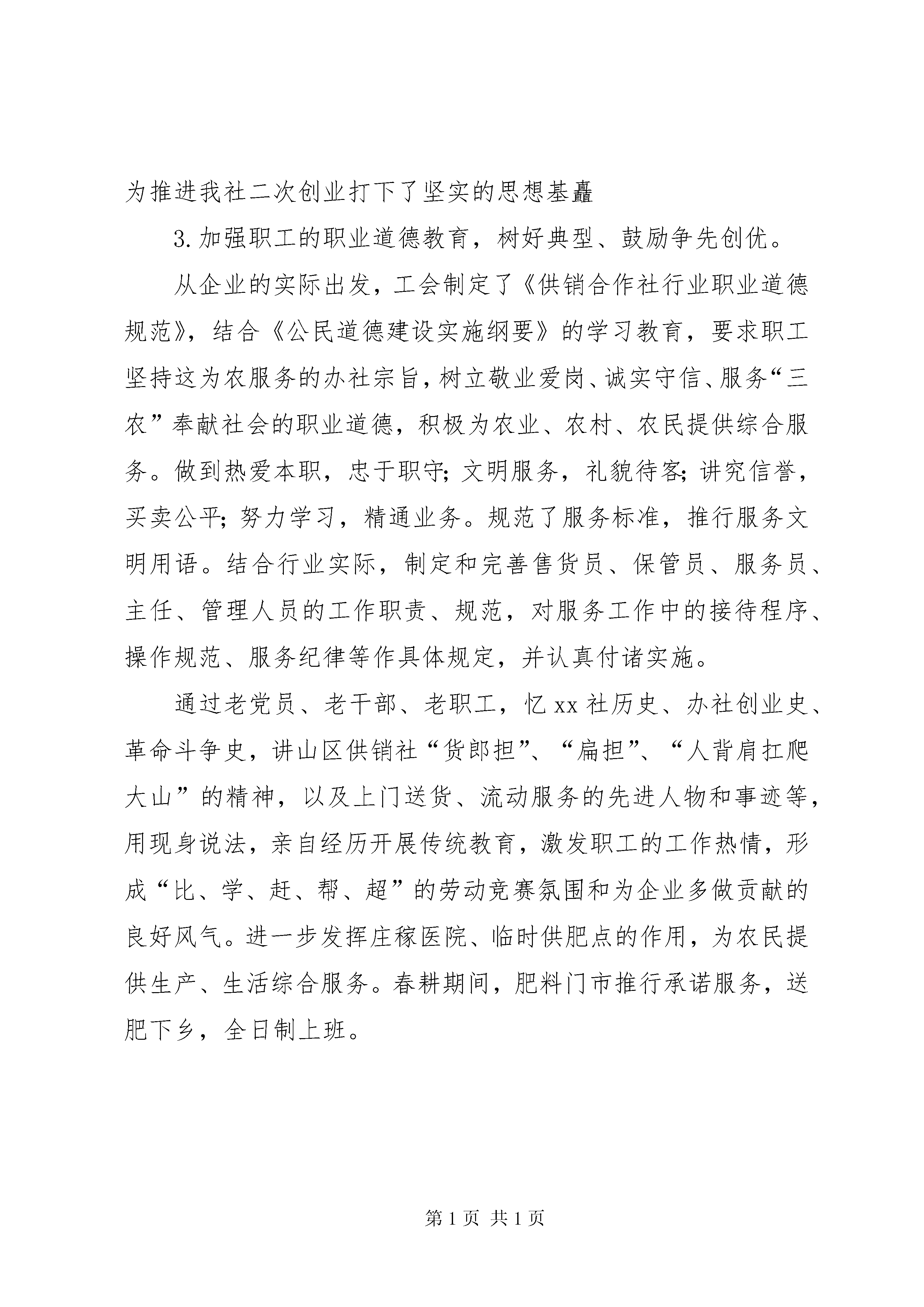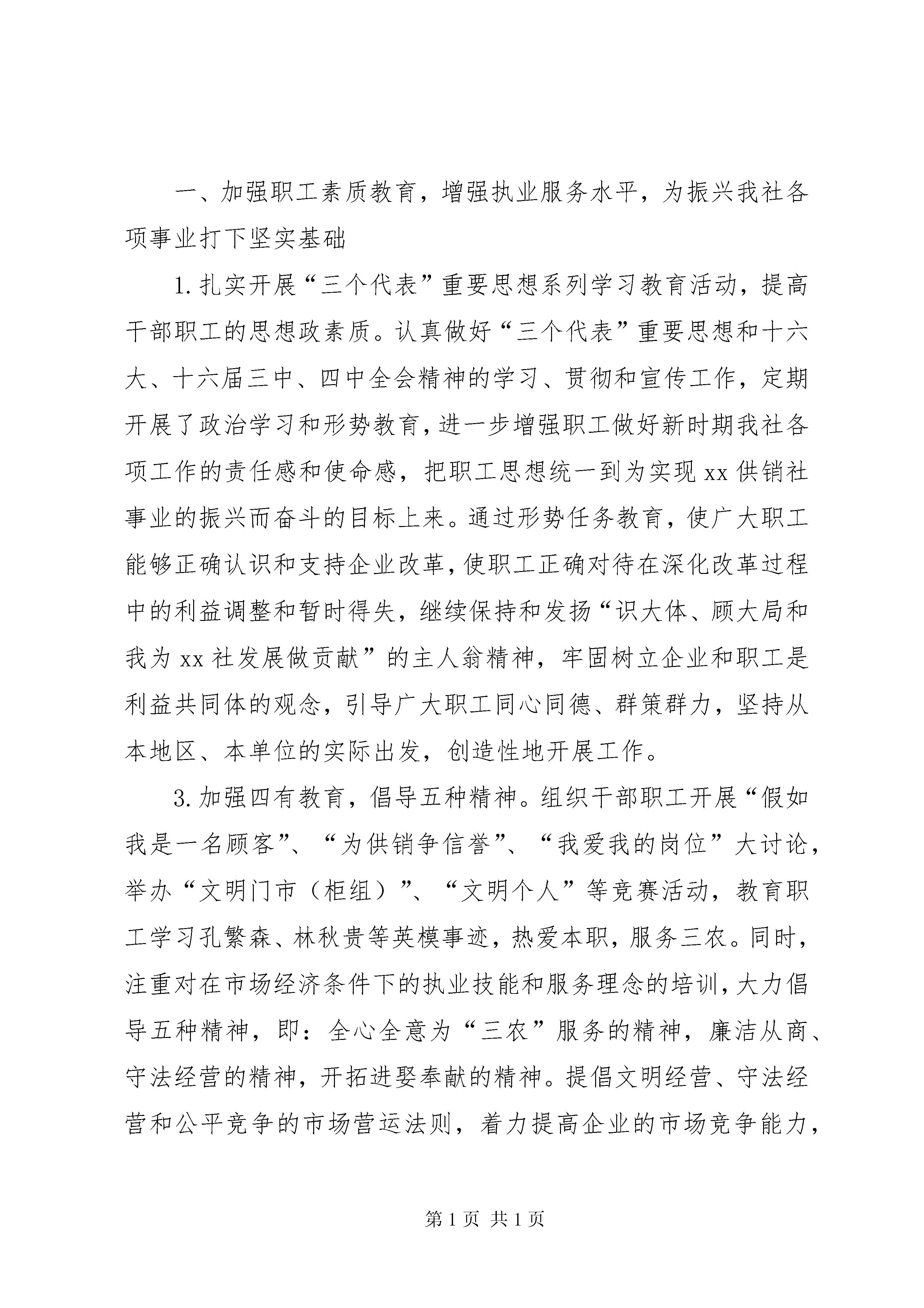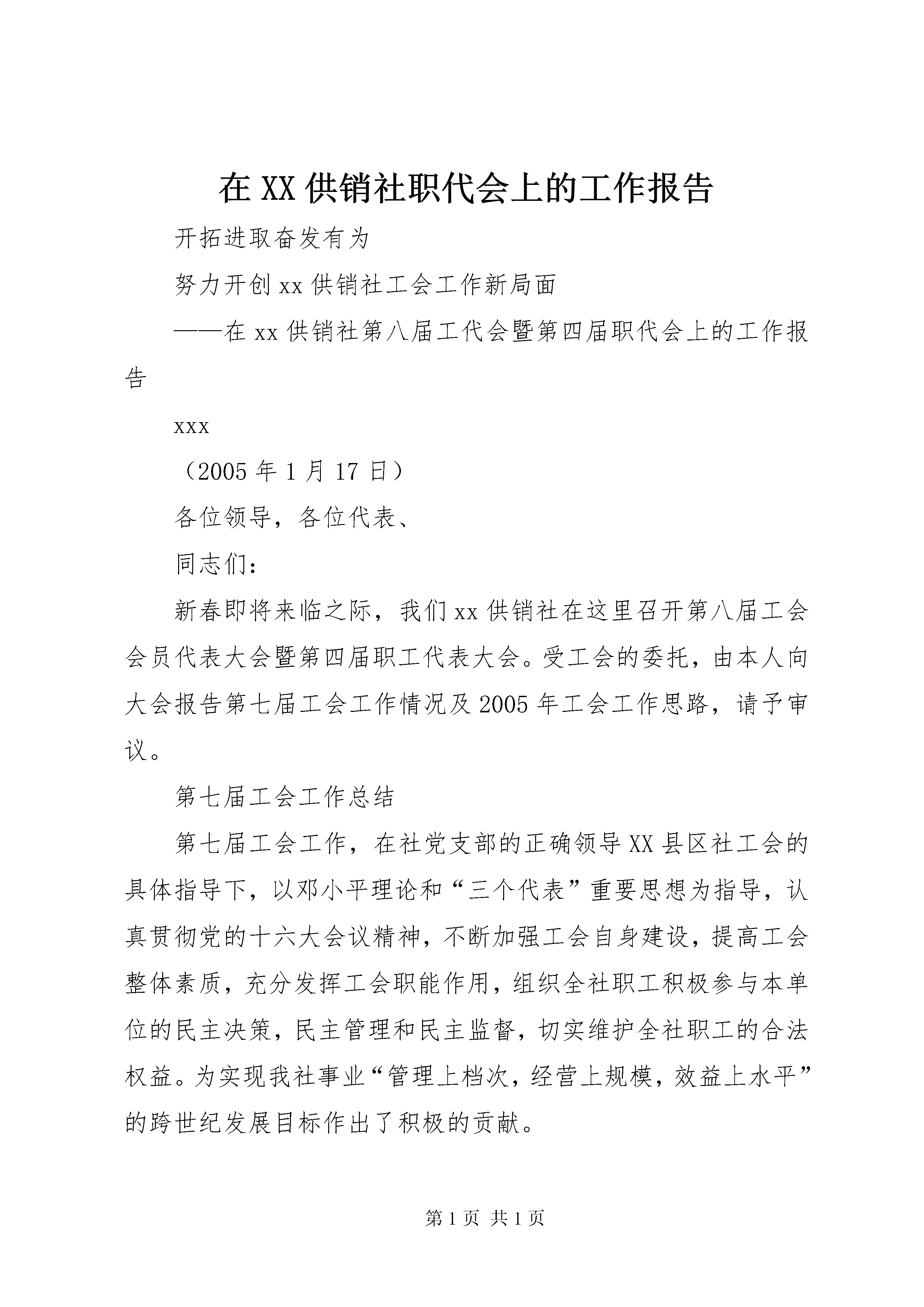 在XX供销社职代会上的工作报告开拓进取奋发有为努力开创xx供销社工会工作新局面——在xx供销社第八届工代会暨第四届职代会上的工作报告xxx(2005年1月17日)各位领导,各位代表、同志们:新春即将来临之际,我们xx供销社在这里召开第八届工会会员代表大会暨第四届职工代表大会。受工会的委托,由本人向大会报告第七届工会工作情况及2005年工会工作思路,请予审议。第七届工会工作总结第七届工会工作,在社党支部的正确领导XX县区社工会的具体指导下,以邓小平理论和“三个代表”重要思想为指导,认真贯彻党的十六大会议精神,不断加强工会自身建设,提高工会整体素质,充分发挥工会职能作用,组织全社职工积极参与本单位的民主决策,民主管理和民主监督,切实维护全社职工的合法权益。为实现我社事业“管理上档次,经营上规模,效益上水平”的跨世纪发展目标作出了积极的贡献。一、加强职工素质教育,增强执业服务水平,为振兴我社各项事业打下坚实基础1.扎实开展“三个代表”重要思想系列学习教育活动,提高干部职工的思想政素质。认真做好“三个代表”重要思想和十六大、十六届三中、四中全会精神的学习、贯彻和宣传工作,定期开展了政治学习和形势教育,进一步增强职工做好新时期我社各项工作的责任感和使命感,把职工思想统一到为实现xx供销社事业的振兴而奋斗的目标上来。通过形势任务教育,使广大职工能够正确认识和支持企业改革,使职工正确对待在深化改革过程中的利益调整和暂时得失,继续保持和发扬“识大体、顾大局和我为xx社发展做贡献”的主人翁精神,牢固树立企业和职工是利益共同体的观念,引导广大职工同心同德、群策群力,坚持从本地区、本单位的实际出发,创造性地开展工作。3.加强四有教育,倡导五种精神。组织干部职工开展“假如我是一名顾客”、“为供销争信誉”、“我爱我的岗位”大讨论,举办“文明门市(柜组)”、“文明个人”等竞赛活动,教育职工学习孔繁森、林秋贵等英模事迹,热爱本职,服务三农。同时,注重对在市场经济条件下的执业技能和服务理念的培训,大力倡导五种精神,即:全心全意为“三农”服务的精神,廉洁从商、守法经营的精神,开拓进娶奉献的精神。提倡文明经营、守法经营和公平竞争的市场营运法则,着力提高企业的市场竞争能力,为推进我社二次创业打下了坚实的思想基矗3.加强职工的职业道德教育,树好典型、鼓励争先创优。从企业的实际出发,工会制定了《供销合作社行业职业道德规范》,结合《公民道德建设实施纲要》的学习教育,要求职工坚持这为农服务的办社宗旨,树立敬业爱岗、诚实守信、服务“三农”奉献社会的职业道德,积极为农业、农村、农民提供综合服务。做到热爱本职,忠于职守;文明服务,礼貌待客;讲究信誉,买卖公平;努力学习,精通业务。规范了服务标准,推行服务文明用语。结合行业实际,制定和完善售货员、保管员、服务员、主任、管理人员的工作职责、规范,对服务工作中的接待程序、操作规范、服务纪律等作具体规定,并认真付诸实施。通过老党员、老干部、老职工,忆xx社历史、办社创业史、革命斗争史,讲山区供销社“货郎担”、“扁担”、“人背肩扛爬大山”的精神,以及上门送货、流动服务的先进人物和事迹等,用现身说法,亲自经历开展传统教育,激发职工的工作热情,形成“比、学、赶、帮、超”的劳动竞赛氛围和为企业多做贡献的良好风气。进一步发挥庄稼医院、临时供肥点的作用,为农民提供生产、生活综合服务。春耕期间,肥料门市推行承诺服务,送肥下乡,全日制上班。