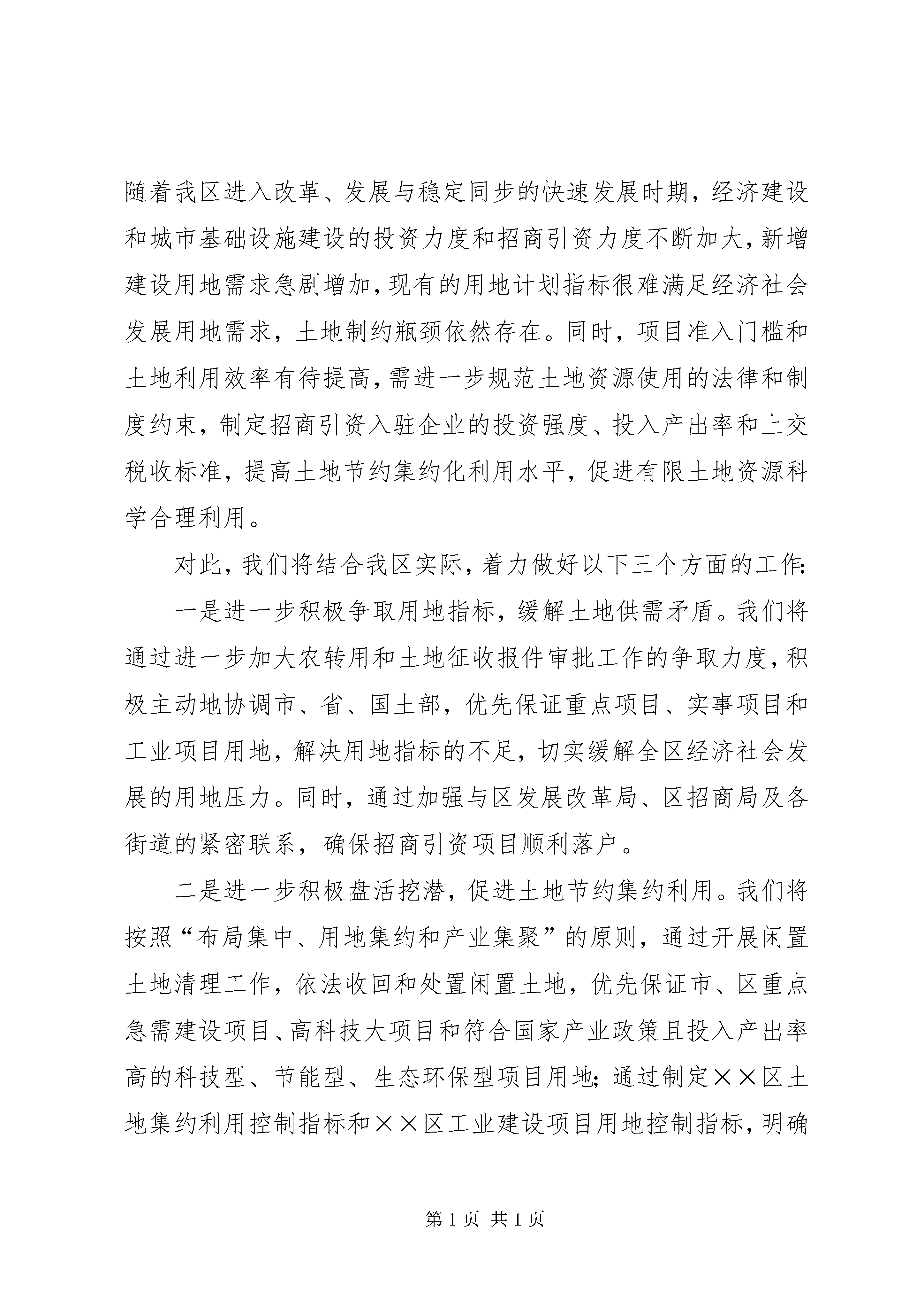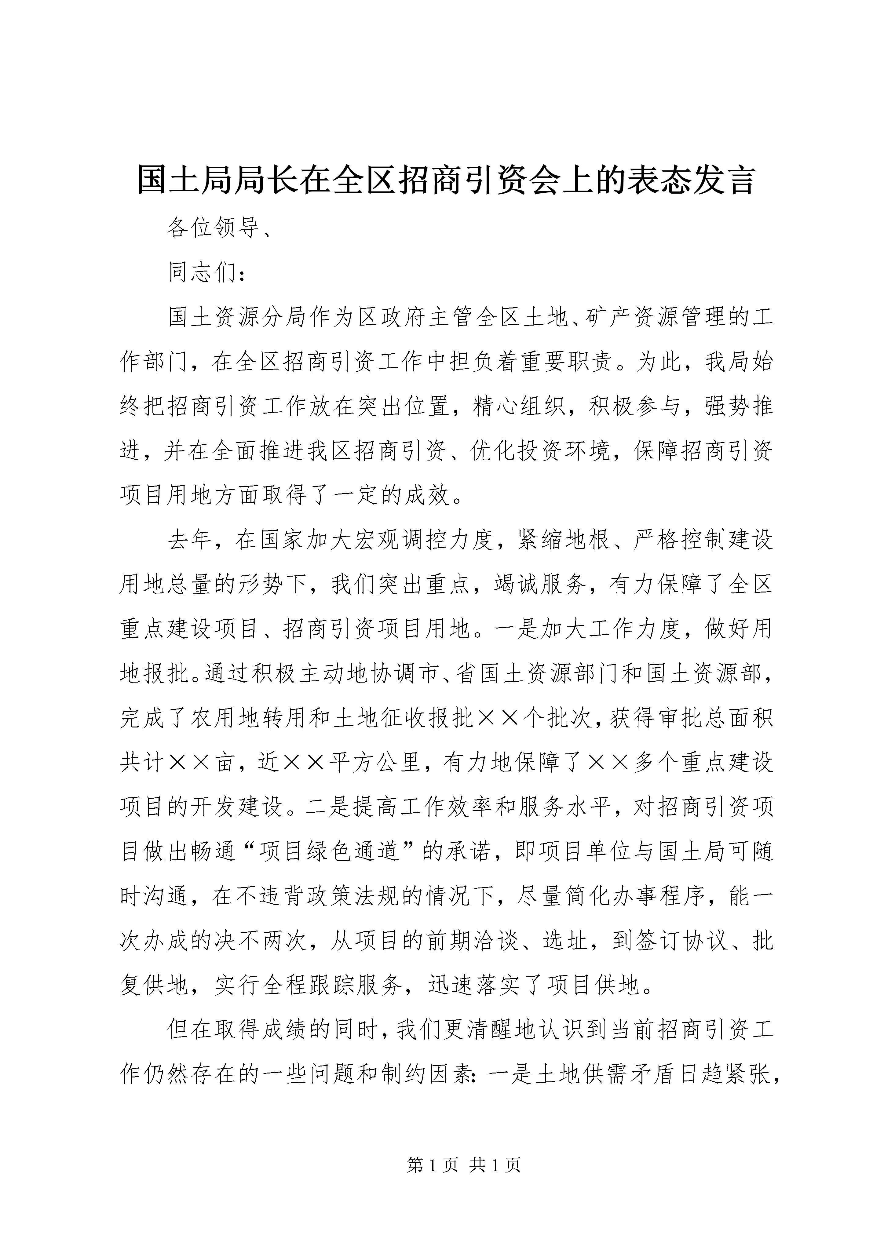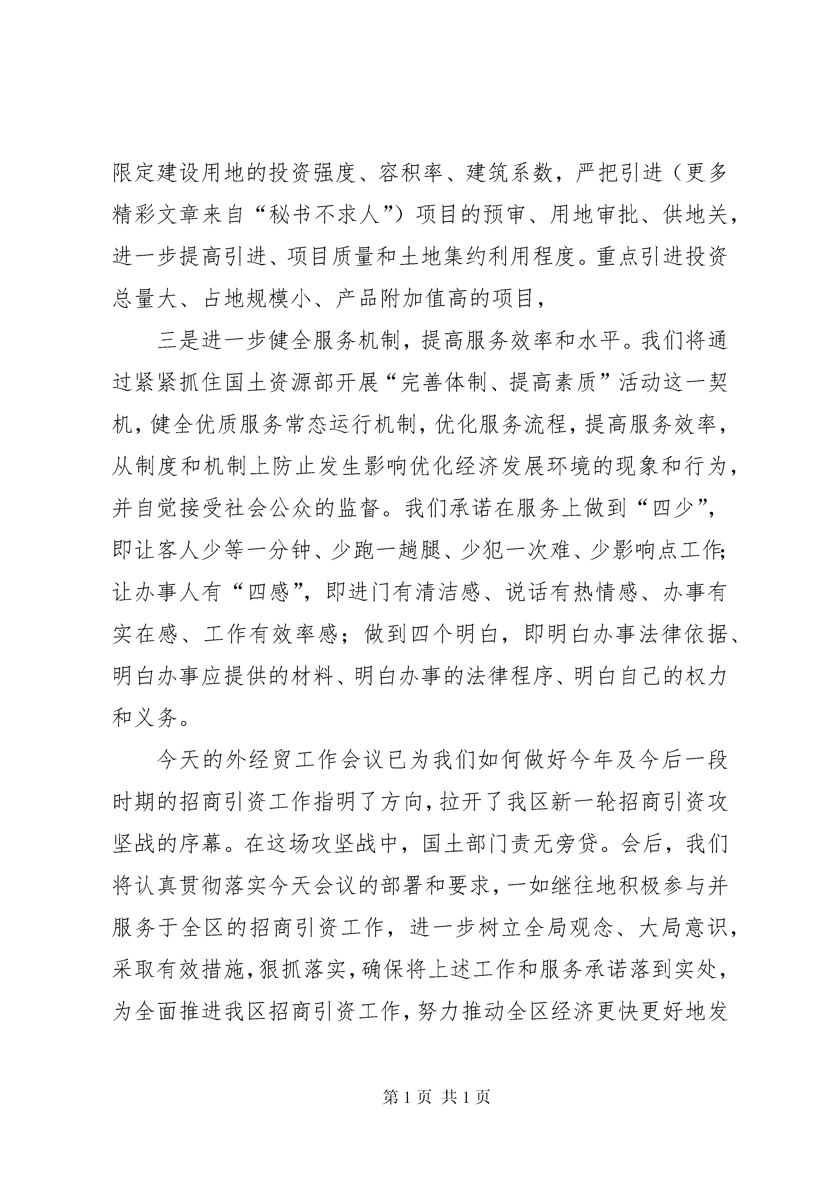 国土局局长在全区招商引资会上的表态发言各位领导、同志们:国土资源分局作为区政府主管全区土地、矿产资源管理的工作部门,在全区招商引资工作中担负着重要职责。为此,我局始终把招商引资工作放在突出位置,精心组织,积极参与,强势推进,并在全面推进我区招商引资、优化投资环境,保障招商引资项目用地方面取得了一定的成效。去年,在国家加大宏观调控力度,紧缩地根、严格控制建设用地总量的形势下,我们突出重点,竭诚服务,有力保障了全区重点建设项目、招商引资项目用地。一是加大工作力度,做好用地报批。通过积极主动地协调市、省国土资源部门和国土资源部,完成了农用地转用和土地征收报批××个批次,获得审批总面积共计××亩,近××平方公里,有力地保障了××多个重点建设项目的开发建设。二是提高工作效率和服务水平,对招商引资项目做出畅通“项目绿色通道”的承诺,即项目单位与国土局可随时沟通,在不违背政策法规的情况下,尽量简化办事程序,能一次办成的决不两次,从项目的前期洽谈、选址,到签订协议、批复供地,实行全程跟踪服务,迅速落实了项目供地。但在取得成绩的同时,我们更清醒地认识到当前招商引资工作仍然存在的一些问题和制约因素:一是土地供需矛盾日趋紧张,随着我区进入改革、发展与稳定同步的快速发展时期,经济建设和城市基础设施建设的投资力度和招商引资力度不断加大,新增建设用地需求急剧增加,现有的用地计划指标很难满足经济社会发展用地需求,土地制约瓶颈依然存在。同时,项目准入门槛和土地利用效率有待提高,需进一步规范土地资源使用的法律和制度约束,制定招商引资入驻企业的投资强度、投入产出率和上交税收标准,提高土地节约集约化利用水平,促进有限土地资源科学合理利用。对此,我们将结合我区实际,着力做好以下三个方面的工作:一是进一步积极争取用地指标,缓解土地供需矛盾。我们将通过进一步加大农转用和土地征收报件审批工作的争取力度,积极主动地协调市、省、国土部,优先保证重点项目、实事项目和工业项目用地,解决用地指标的不足,切实缓解全区经济社会发展的用地压力。同时,通过加强与区发展改革局、区招商局及各街道的紧密联系,确保招商引资项目顺利落户。二是进一步积极盘活挖潜,促进土地节约集约利用。我们将按照“布局集中、用地集约和产业集聚”的原则,通过开展闲置土地清理工作,依法收回和处置闲置土地,优先保证市、区重点急需建设项目、高科技大项目和符合国家产业政策且投入产出率高的科技型、节能型、生态环保型项目用地;通过制定××区土地集约利用控制指标和××区工业建设项目用地控制指标,明确限定建设用地的投资强度、容积率、建筑系数,严把引进(更多精彩文章来自“秘书不求人”)项目的预审、用地审批、供地关,进一步提高引进、项目质量和土地集约利用程度。重点引进投资总量大、占地规模小、产品附加值高的项目,三是进一步健全服务机制,提高服务效率和水平。我们将通过紧紧抓住国土资源部开展“完善体制、提高素质”活动这一契机,健全优质服务常态运行机制,优化服务流程,提高服务效率,从制度和机制上防止发生影响优化经济发展环境的现象和行为,并自觉接受社会公众的监督。我们承诺在服务上做到“四少”,即让客人少等一分钟、少跑一趟腿、少犯一次难、少影响点工作;让办事人有“四感”,即进门有清洁感、说话有热情感、办事有实在感、工作有效率感;做到四个明白,即明白办事法律依据、明白办事应提供的材料、明白办事的法律程序、明白自己的权力和义务。今天的外经贸工作会议已为我们如何做好今年及今后一段时期的招商引资工作指明了方向,拉开了我区新一轮招商引资攻坚战的序幕。在这场攻坚战中,国土部门责无旁贷。会后,我们将认真贯彻落实今天会议的部署和要求,一如继往地积极参与并服务于全区的招商引资工作,进一步树立全局观念、大局意识,采取有效措施,狠抓落实,确保将上述工作和服务承诺落到实处,为全面推进我区招商引资工作,努力推动全区经济更快更好地发展做出新的贡献。