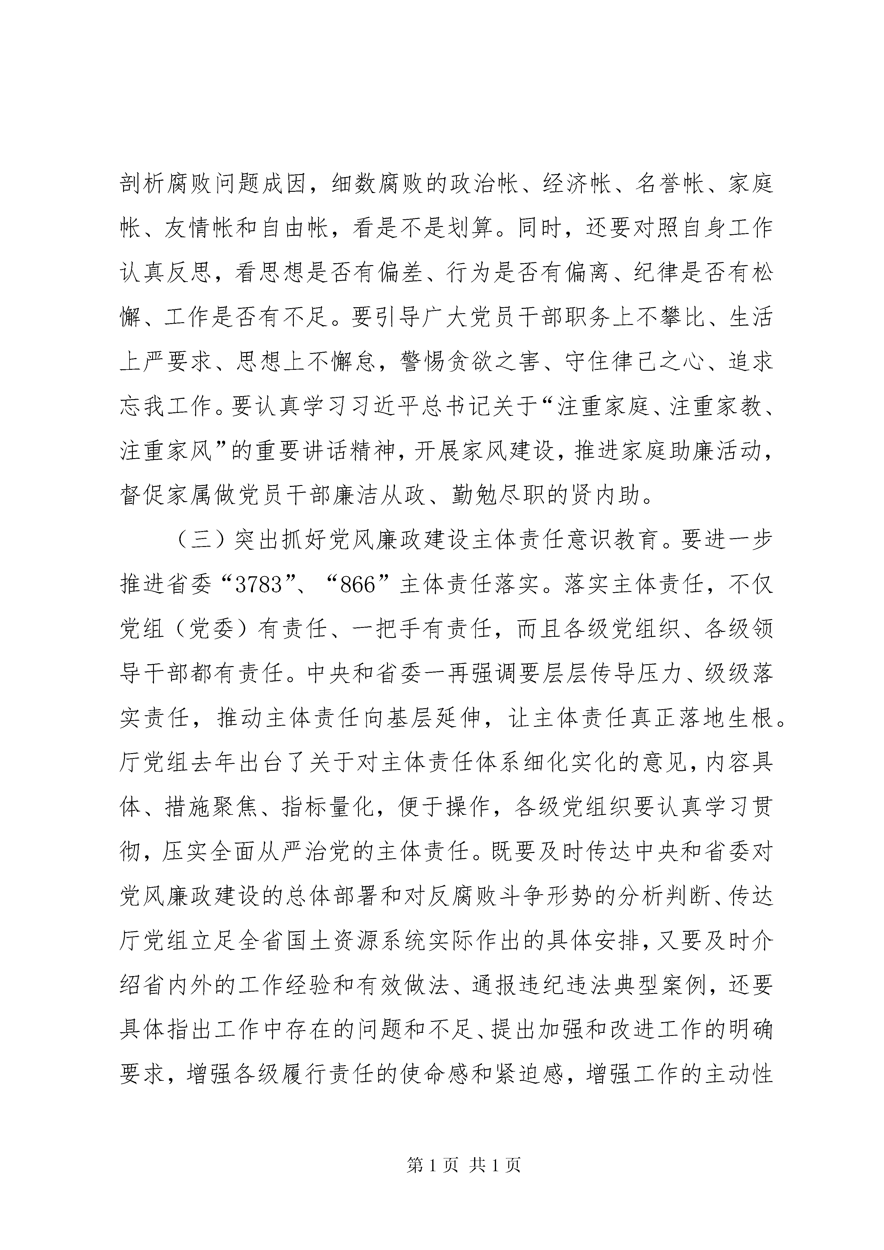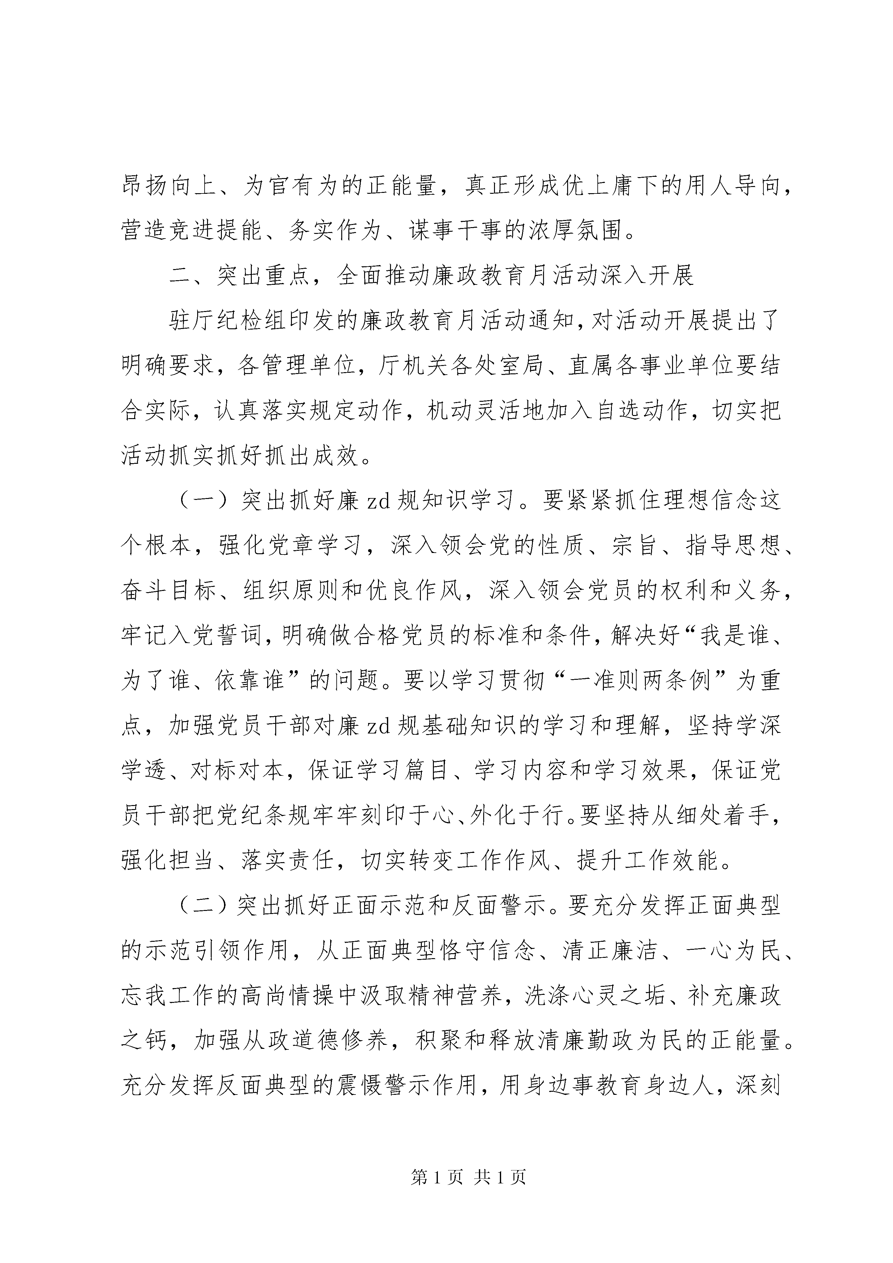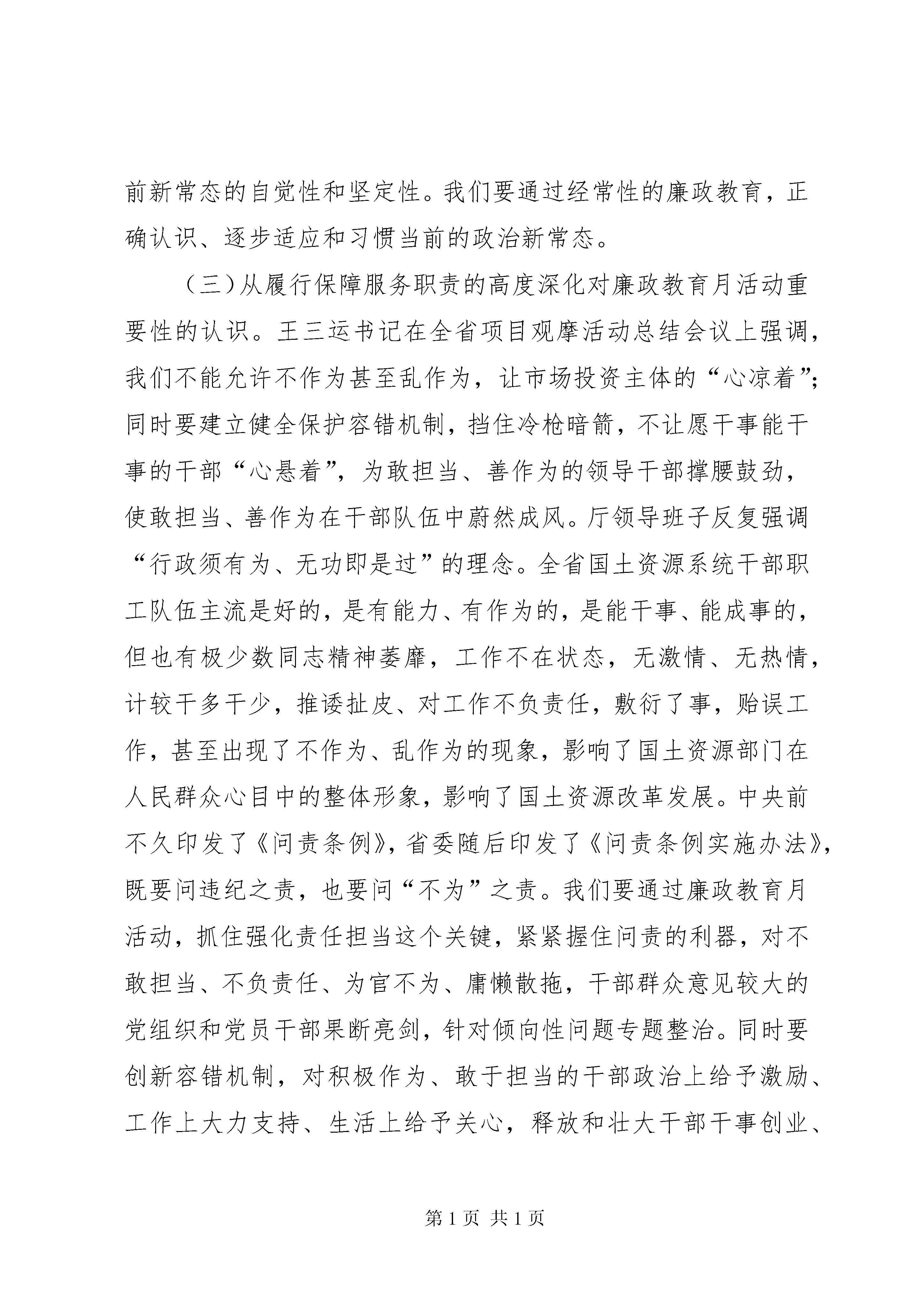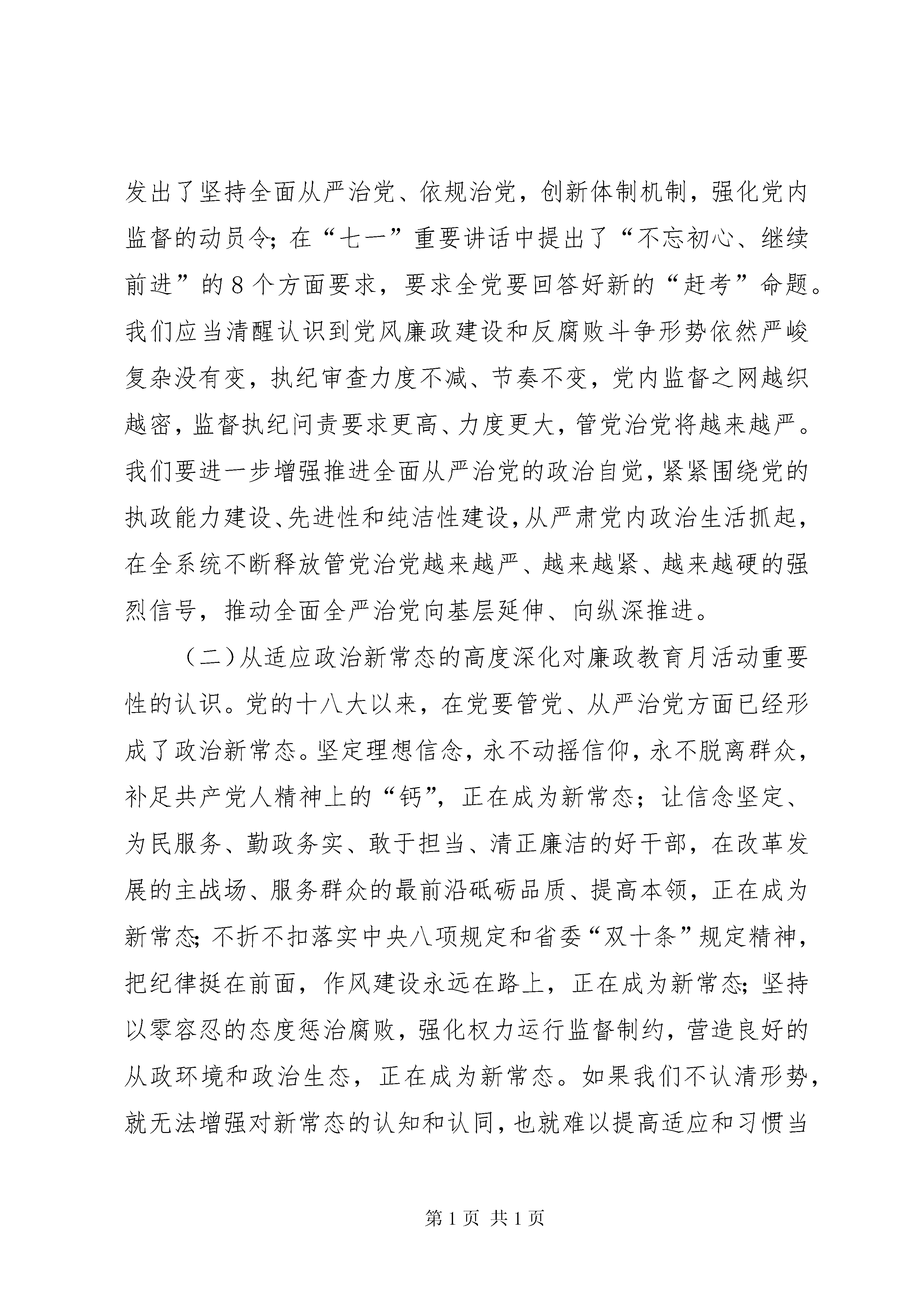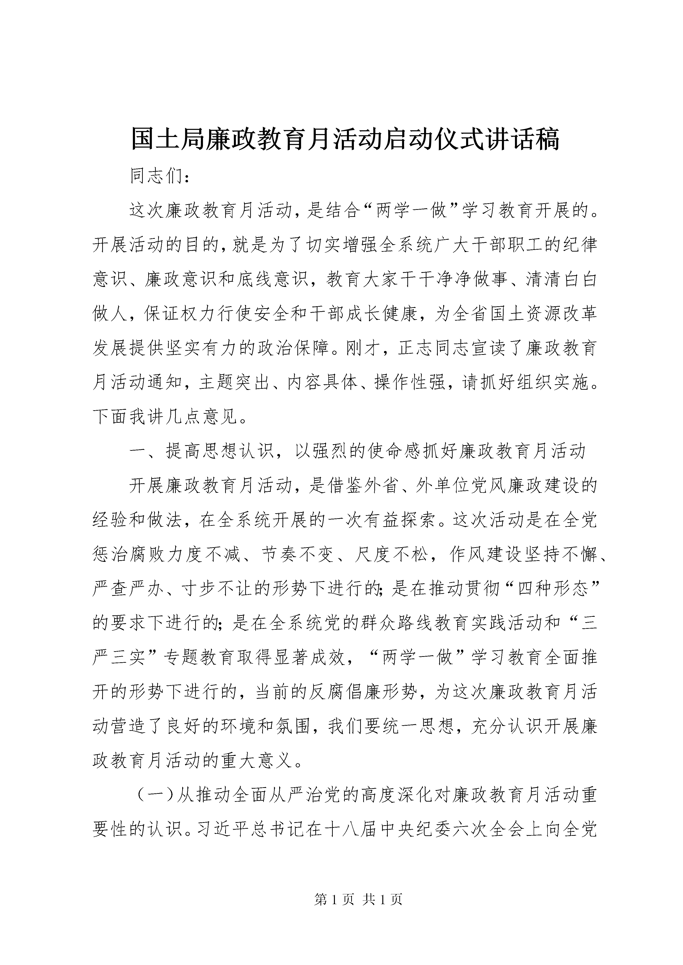 国土局廉政教育月活动启动仪式讲话稿同志们:这次廉政教育月活动,是结合“两学一做”学习教育开展的。开展活动的目的,就是为了切实增强全系统广大干部职工的纪律意识、廉政意识和底线意识,教育大家干干净净做事、清清白白做人,保证权力行使安全和干部成长健康,为全省国土资源改革发展提供坚实有力的政治保障。刚才,正志同志宣读了廉政教育月活动通知,主题突出、内容具体、操作性强,请抓好组织实施。下面我讲几点意见。一、提高思想认识,以强烈的使命感抓好廉政教育月活动开展廉政教育月活动,是借鉴外省、外单位党风廉政建设的经验和做法,在全系统开展的一次有益探索。这次活动是在全党惩治腐败力度不减、节奏不变、尺度不松,作风建设坚持不懈、严查严办、寸步不让的形势下进行的;是在推动贯彻“四种形态”的要求下进行的;是在全系统党的群众路线教育实践活动和“三严三实”专题教育取得显著成效,“两学一做”学习教育全面推开的形势下进行的,当前的反腐倡廉形势,为这次廉政教育月活动营造了良好的环境和氛围,我们要统一思想,充分认识开展廉政教育月活动的重大意义。(一)从推动全面从严治党的高度深化对廉政教育月活动重要性的认识。习近平总书记在十八届中央纪委六次全会上向全党发出了坚持全面从严治党、依规治党,创新体制机制,强化党内监督的动员令;在“七一”重要讲话中提出了“不忘初心、继续前进”的8个方面要求,要求全党要回答好新的“赶考”命题。我们应当清醒认识到党风廉政建设和反腐败斗争形势依然严峻复杂没有变,执纪审查力度不减、节奏不变,党内监督之网越织越密,监督执纪问责要求更高、力度更大,管党治党将越来越严。我们要进一步增强推进全面从严治党的政治自觉,紧紧围绕党的执政能力建设、先进性和纯洁性建设,从严肃党内政治生活抓起,在全系统不断释放管党治党越来越严、越来越紧、越来越硬的强烈信号,推动全面全严治党向基层延伸、向纵深推进。(二)从适应政治新常态的高度深化对廉政教育月活动重要性的认识。党的十八大以来,在党要管党、从严治党方面已经形成了政治新常态。坚定理想信念,永不动摇信仰,永不脱离群众,补足共产党人精神上的“钙”,正在成为新常态;让信念坚定、为民服务、勤政务实、敢于担当、清正廉洁的好干部,在改革发展的主战场、服务群众的最前沿砥砺品质、提高本领,正在成为新常态;不折不扣落实中央八项规定和省委“双十条”规定精神,把纪律挺在前面,作风建设永远在路上,正在成为新常态;坚持以零容忍的态度惩治腐败,强化权力运行监督制约,营造良好的从政环境和政治生态,正在成为新常态。如果我们不认清形势,就无法增强对新常态的认知和认同,也就难以提高适应和习惯当前新常态的自觉性和坚定性。我们要通过经常性的廉政教育,正确认识、逐步适应和习惯当前的政治新常态。(三)从履行保障服务职责的高度深化对廉政教育月活动重要性的认识。王三运书记在全省项目观摩活动总结会议上强调,我们不能允许不作为甚至乱作为,让市场投资主体的“心凉着”;同时要建立健全保护容错机制,挡住冷枪暗箭,不让愿干事能干事的干部“心悬着”,为敢担当、善作为的领导干部撑腰鼓劲,使敢担当、善作为在干部队伍中蔚然成风。厅领导班子反复强调“行政须有为、无功即是过”的理念。全省国土资源系统干部职工队伍主流是好的,是有能力、有作为的,是能干事、能成事的,但也有极少数同志精神萎靡,工作不在状态,无激情、无热情,计较干多干少,推诿扯皮、对工作不负责任,敷衍了事,贻误工作,甚至出现了不作为、乱作为的现象,影响了国土资源部门在人民群众心目中的整体形象,影响了国土资源改革发展。中央前不久印发了《问责条例》,省委随后印发了《问责条例实施办法》,既要问违纪之责,也要问“不为”之责。我们要通过廉政教育月活动,抓住强化责任担当这个关键,紧紧握住问责的利器,对不敢担当、不负责任、为官不为、庸懒散拖,干部群众意见较大的党组织和党员干部果断亮剑,针对倾向性问题专题整治。同时要创新容错机制,对积极作为、敢于担当的干部政治上给予激励、工作上大力支持、生活上给予关心,释放和壮大干部干事创业、昂扬向上、为官有为的正能量,真正形成优上庸下的用人导向,营造竞进提能、务实作为、谋事干事的浓厚氛围。二、突出重点,全面推动廉政教育月活动深入开展驻厅纪检组印发的廉政教育月活动通知,对活动开展提出了明确要求,各管理单位,厅机关各处室局、直属各事业单位要结合实际,认真落实规定动作,机动灵活地加入自选动作,切实把活动抓实抓好抓出成效。(一)突出抓好廉zd规知识学习。要紧紧抓住理想信念这个根本,强化党章学习,深入领会党的性质、宗旨、指导思想、奋斗目标、组织原则和优良作风,深入领会党员的权利和义务,牢记入党誓词,明确做合格党员的标准和条件,解决好“我是谁、为了谁、依靠谁”的问题。要以学习贯彻“一准则两条例”为重点,加强