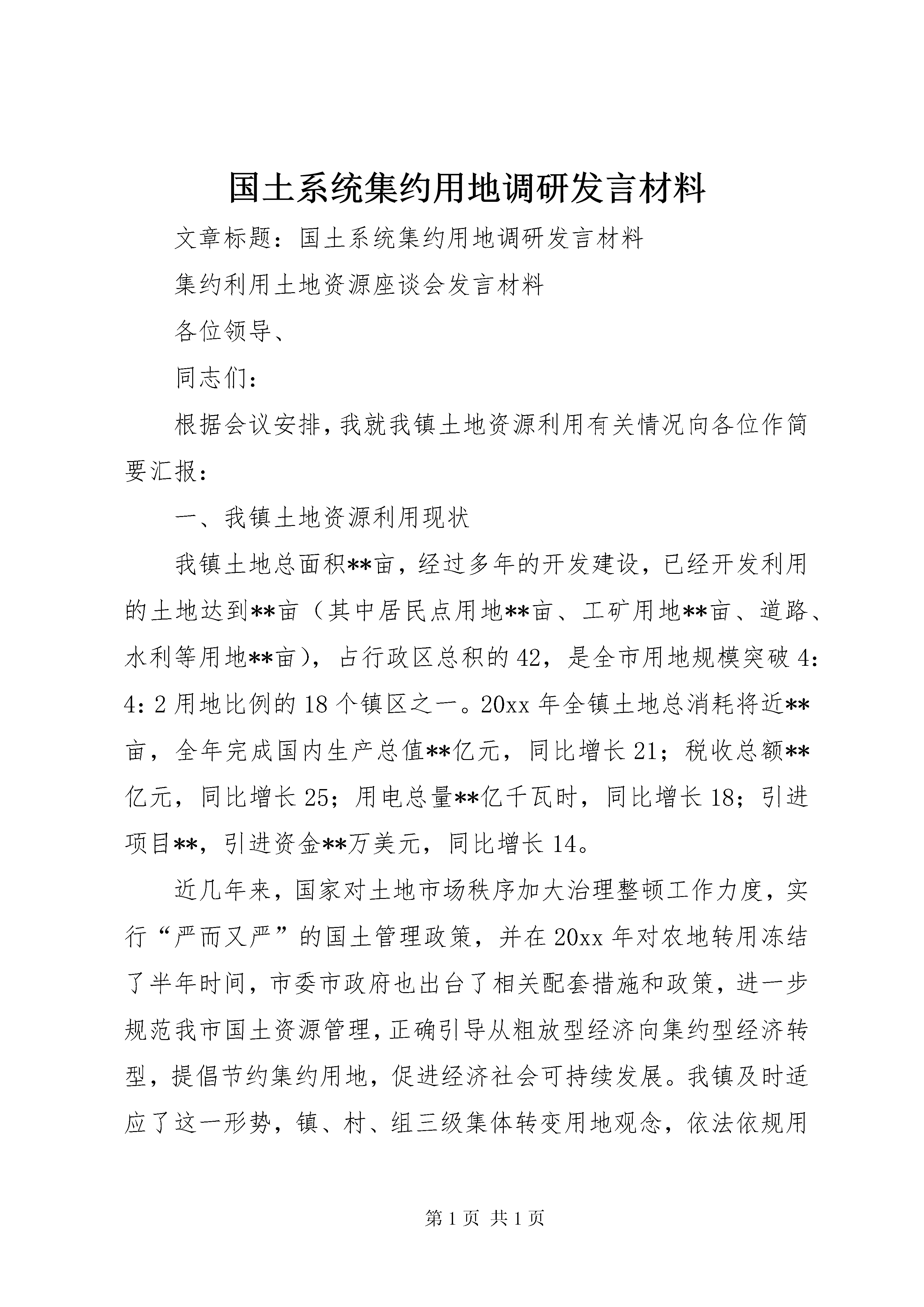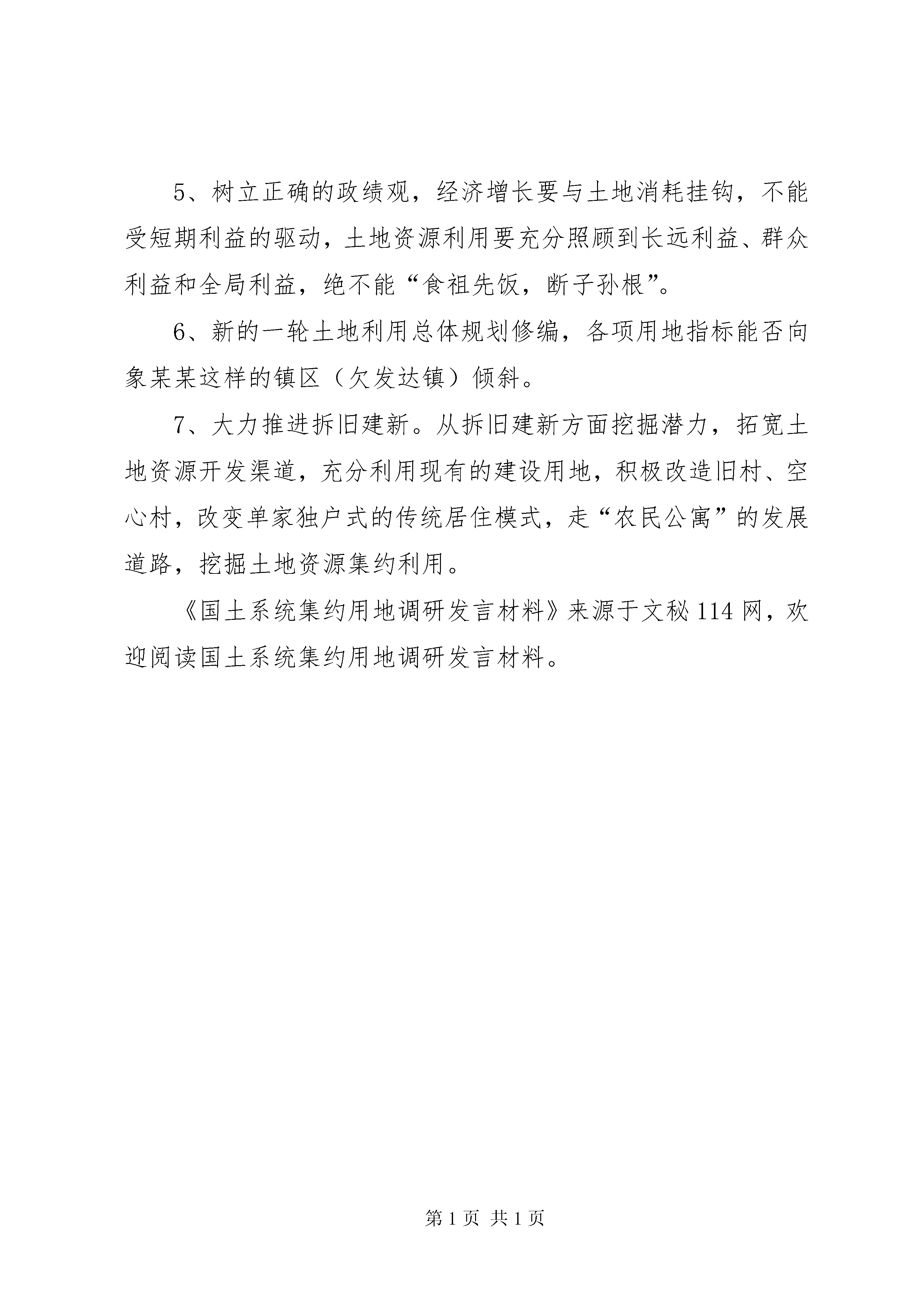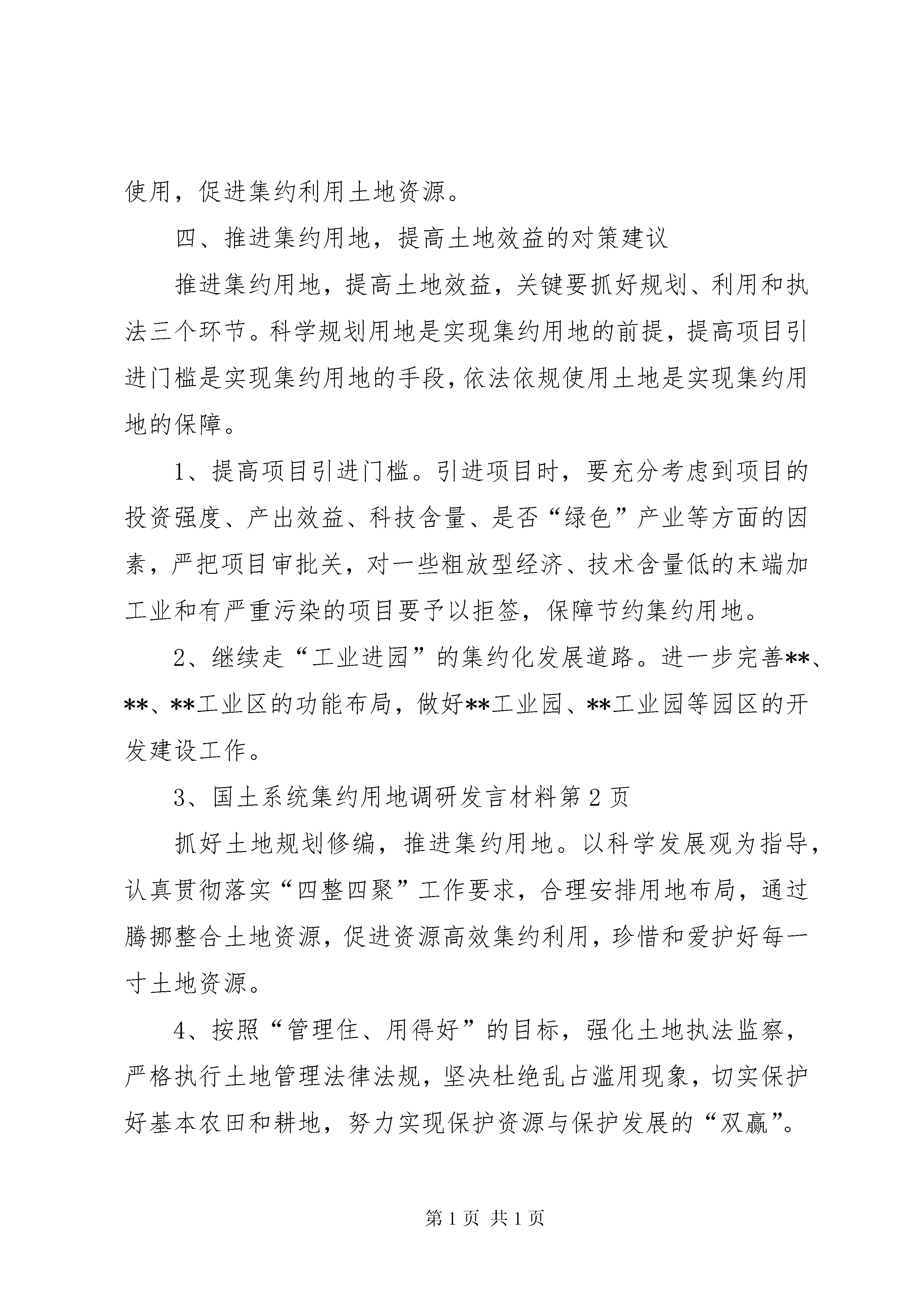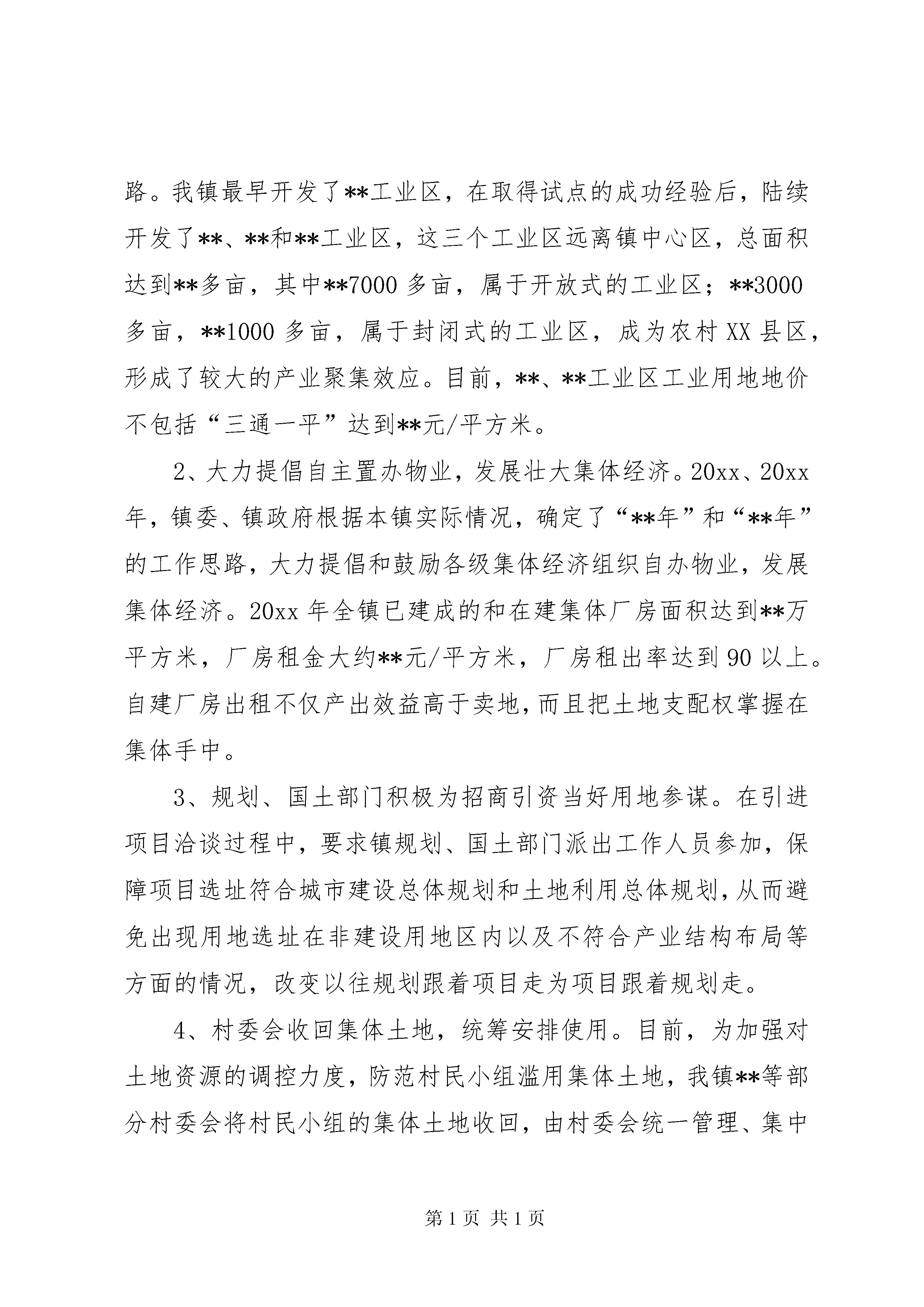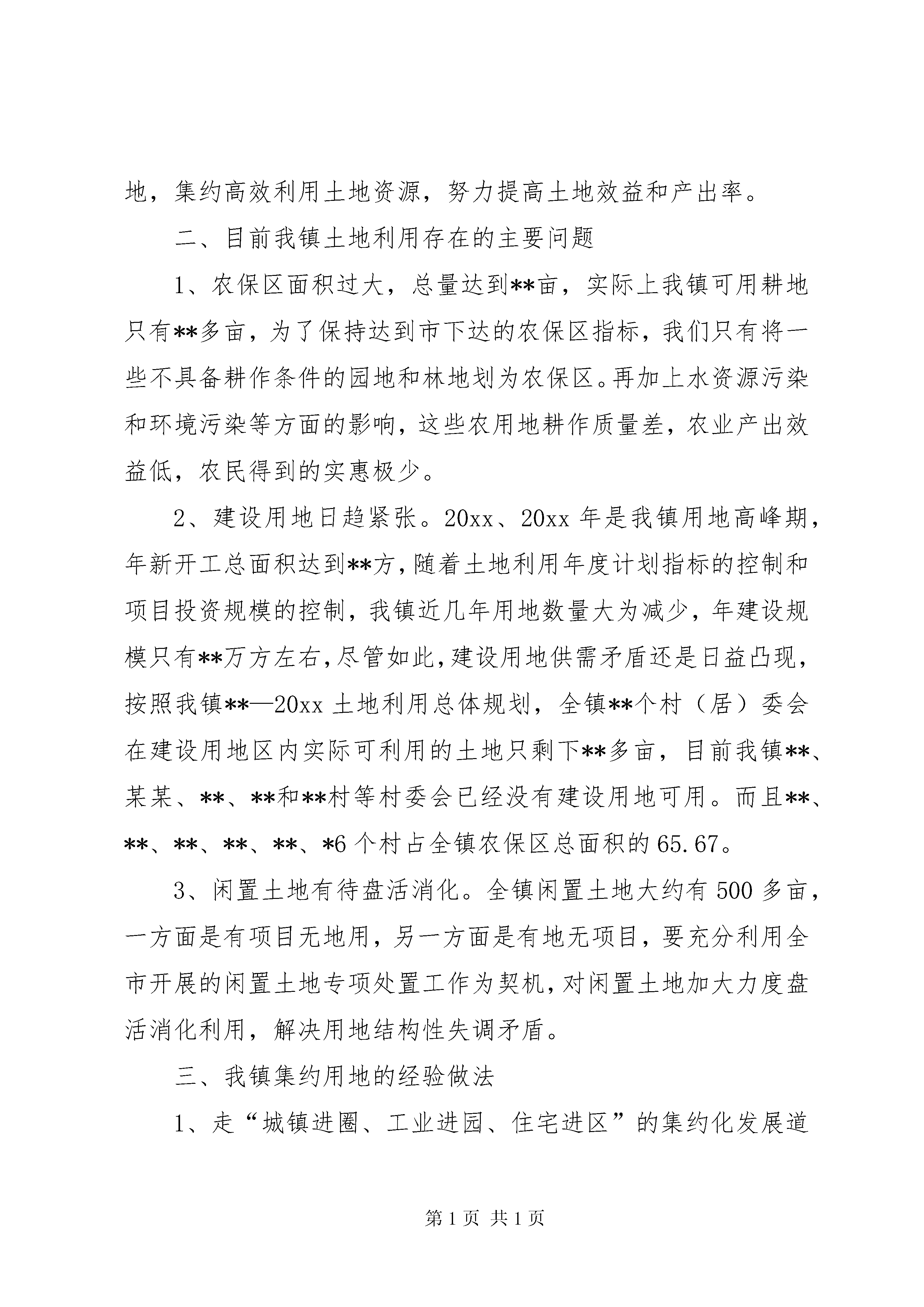 国土系统集约用地调研发言材料文章标题:国土系统集约用地调研发言材料集约利用土地资源座谈会发言材料各位领导、同志们:根据会议安排,我就我镇土地资源利用有关情况向各位作简要汇报:一、我镇土地资源利用现状我镇土地总面积**亩,经过多年的开发建设,已经开发利用的土地达到**亩(其中居民点用地**亩、工矿用地**亩、道路、水利等用地**亩),占行政区总积的42,是全市用地规模突破4:4:2用地比例的18个镇区之一。20xx年全镇土地总消耗将近**亩,全年完成国内生产总值**亿元,同比增长21;税收总额**亿元,同比增长25;用电总量**亿千瓦时,同比增长18;引进项目**,引进资金**万美元,同比增长14。近几年来,国家对土地市场秩序加大治理整顿工作力度,实行“严而又严”的国土管理政策,并在20xx年对农地转用冻结了半年时间,市委市政府也出台了相关配套措施和政策,进一步规范我市国土资源管理,正确引导从粗放型经济向集约型经济转型,提倡节约集约用地,促进经济社会可持续发展。我镇及时适应了这一形势,镇、村、组三级集体转变用地观念,依法依规用地,集约高效利用土地资源,努力提高土地效益和产出率。二、目前我镇土地利用存在的主要问题1、农保区面积过大,总量达到**亩,实际上我镇可用耕地只有**多亩,为了保持达到市下达的农保区指标,我们只有将一些不具备耕作条件的园地和林地划为农保区。再加上水资源污染和环境污染等方面的影响,这些农用地耕作质量差,农业产出效益低,农民得到的实惠极少。2、建设用地日趋紧张。20xx、20xx年是我镇用地高峰期,年新开工总面积达到**方,随着土地利用年度计划指标的控制和项目投资规模的控制,我镇近几年用地数量大为减少,年建设规模只有**万方左右,尽管如此,建设用地供需矛盾还是日益凸现,按照我镇**—20xx土地利用总体规划,全镇**个村(居)委会在建设用地区内实际可利用的土地只剩下**多亩,目前我镇**、某某、**、**和**村等村委会已经没有建设用地可用。而且**、**、**、**、**、*6个村占全镇农保区总面积的65.67。3、闲置土地有待盘活消化。全镇闲置土地大约有500多亩,一方面是有项目无地用,另一方面是有地无项目,要充分利用全市开展的闲置土地专项处置工作为契机,对闲置土地加大力度盘活消化利用,解决用地结构性失调矛盾。三、我镇集约用地的经验做法1、走“城镇进圈、工业进园、住宅进区”的集约化发展道路。我镇最早开发了**工业区,在取得试点的成功经验后,陆续开发了**、**和**工业区,这三个工业区远离镇中心区,总面积达到**多亩,其中**7000多亩,属于开放式的工业区;**3000多亩,**1000多亩,属于封闭式的工业区,成为农村XX县区,形成了较大的产业聚集效应。目前,**、**工业区工业用地地价不包括“三通一平”达到**元/平方米。2、大力提倡自主置办物业,发展壮大集体经济。20xx、20xx年,镇委、镇政府根据本镇实际情况,确定了“**年”和“**年”的工作思路,大力提倡和鼓励各级集体经济组织自办物业,发展集体经济。20xx年全镇已建成的和在建集体厂房面积达到**万平方米,厂房租金大约**元/平方米,厂房租出率达到90以上。自建厂房出租不仅产出效益高于卖地,而且把土地支配权掌握在集体手中。3、规划、国土部门积极为招商引资当好用地参谋。在引进项目洽谈过程中,要求镇规划、国土部门派出工作人员参加,保障项目选址符合城市建设总体规划和土地利用总体规划,从而避免出现用地选址在非建设用地区内以及不符合产业结构布局等方面的情况,改变以往规划跟着项目走为项目跟着规划走。4、村委会收回集体土地,统筹安排使用。目前,为加强对土地资源的调控力度,防范村民小组滥用集体土地,我镇**等部分村委会将村民小组的集体土地收回,由村委会统一管理、集中使用,促进集约利用土地资源。四、推进集约用地,提高土地效益的对策建议推进集约用地,提高土地效益,关键要抓好规划、利用和执法三个环节。科学规划用地是实现集约用地的前提,提高项目引进门槛是实现集约用地的手段,依法依规使用土地是实现集约用地的保障。1、提高项目引进门槛。引进项目时,要充分考虑到项目的投资强度、产出效益、科技含量、是否“绿色”产业等方面的因素,严把项目审批关,对一些粗放型经济、技术含量低的末端加工业和有严重污染的项目要予以拒签,保障节约集约用地。2、继续走“工业进园”的集约化发展道路。进一步完善**、**、**工业区的功能布局,做好**工业园、**工业园等园区的开发建设工作。3、国土系统集约用地调研发言材料抓好土地规划修编,推进集约用地。以科学发展观为指导,认真贯彻落实“四整四聚”工作要求,合理安排用地布局,通过腾挪整合土地资源,促进资源高效集约利用,珍惜和爱
