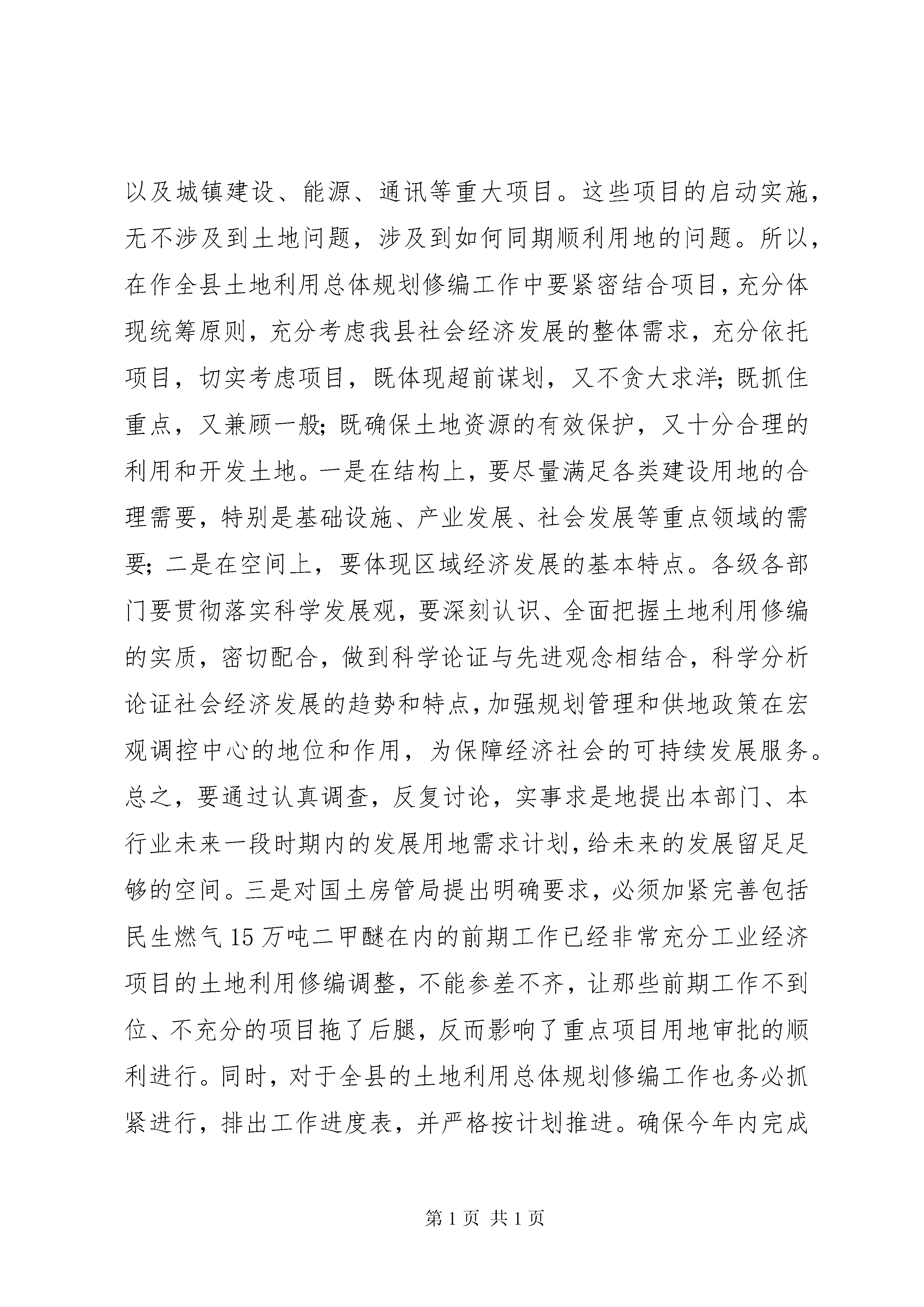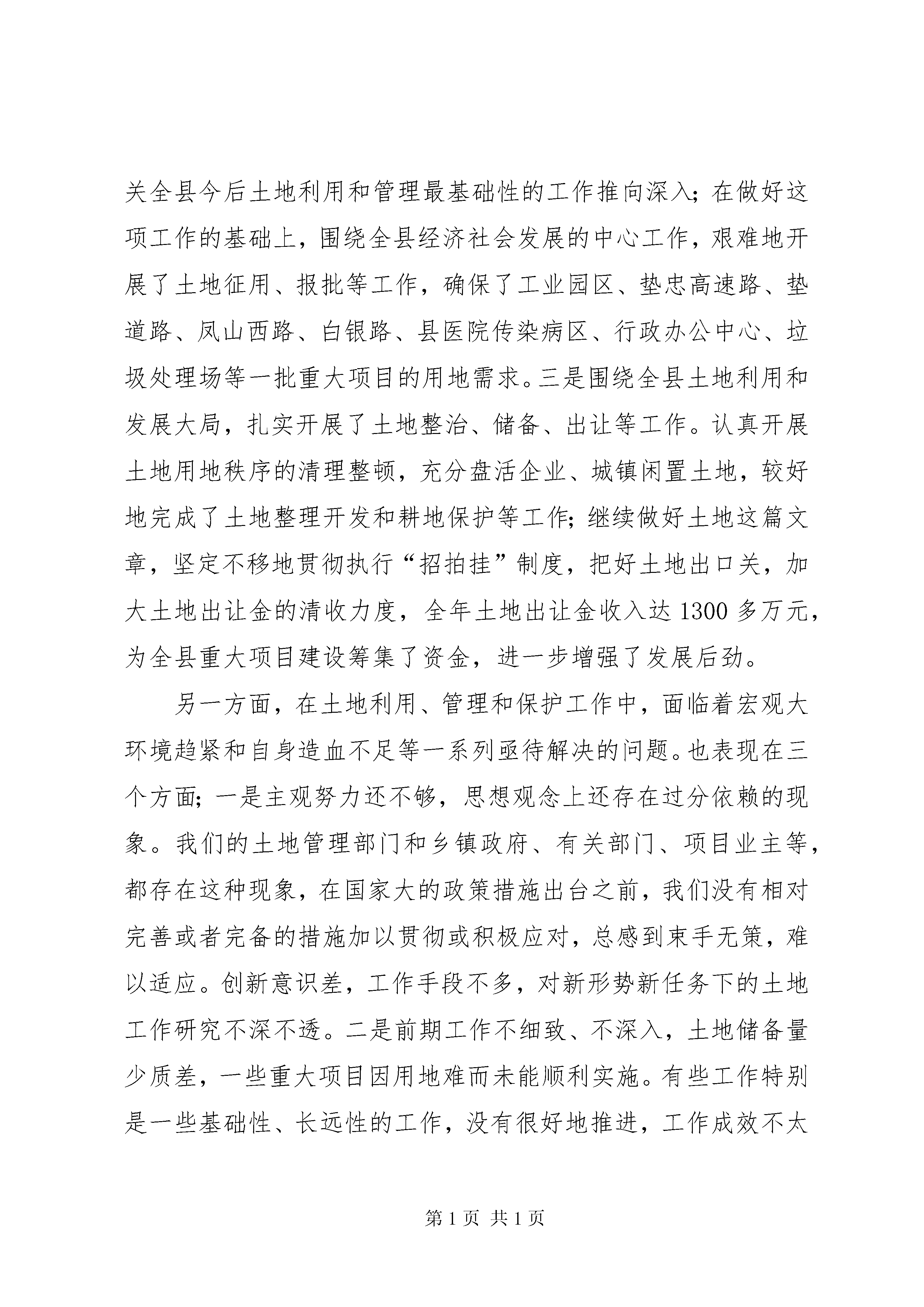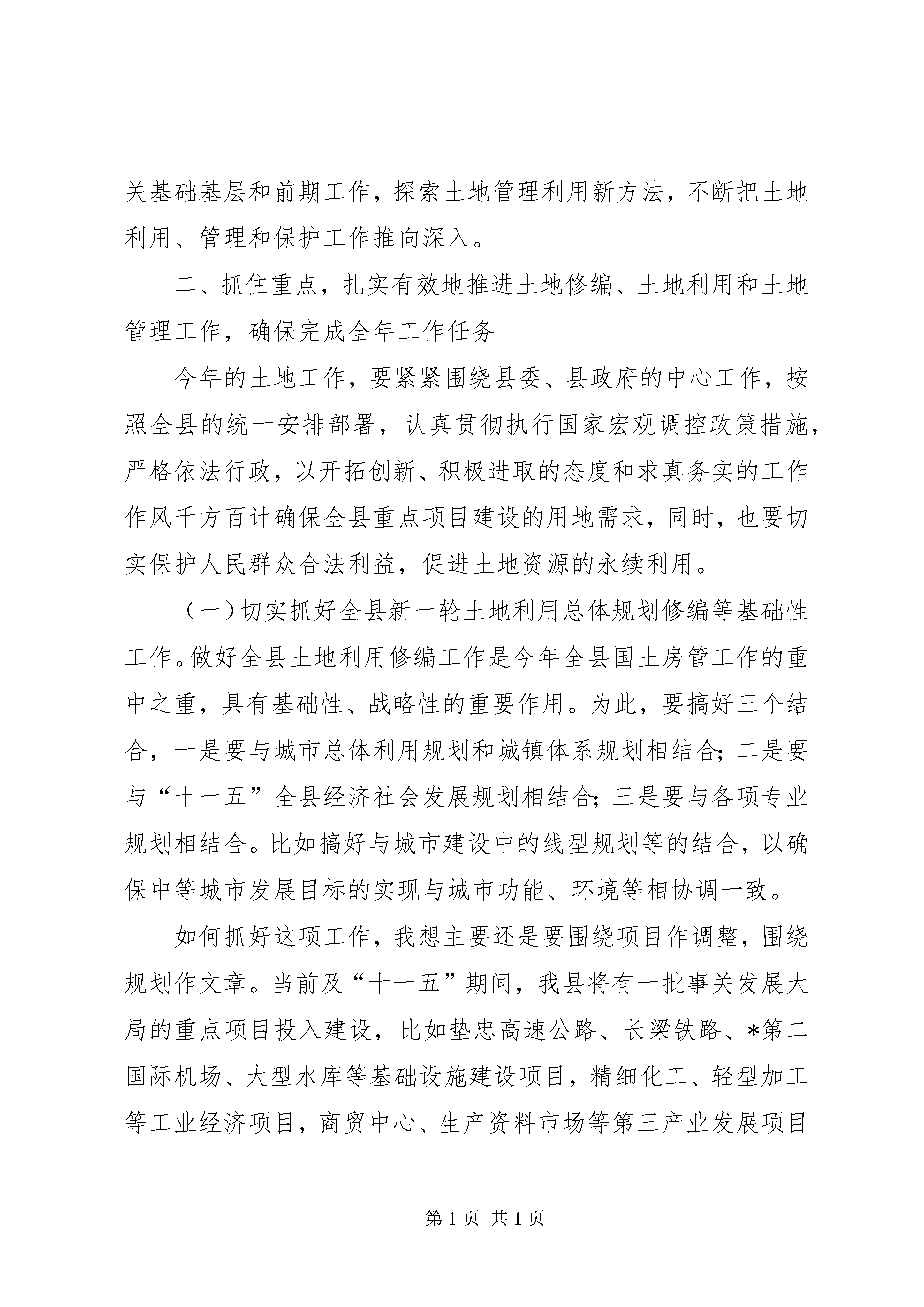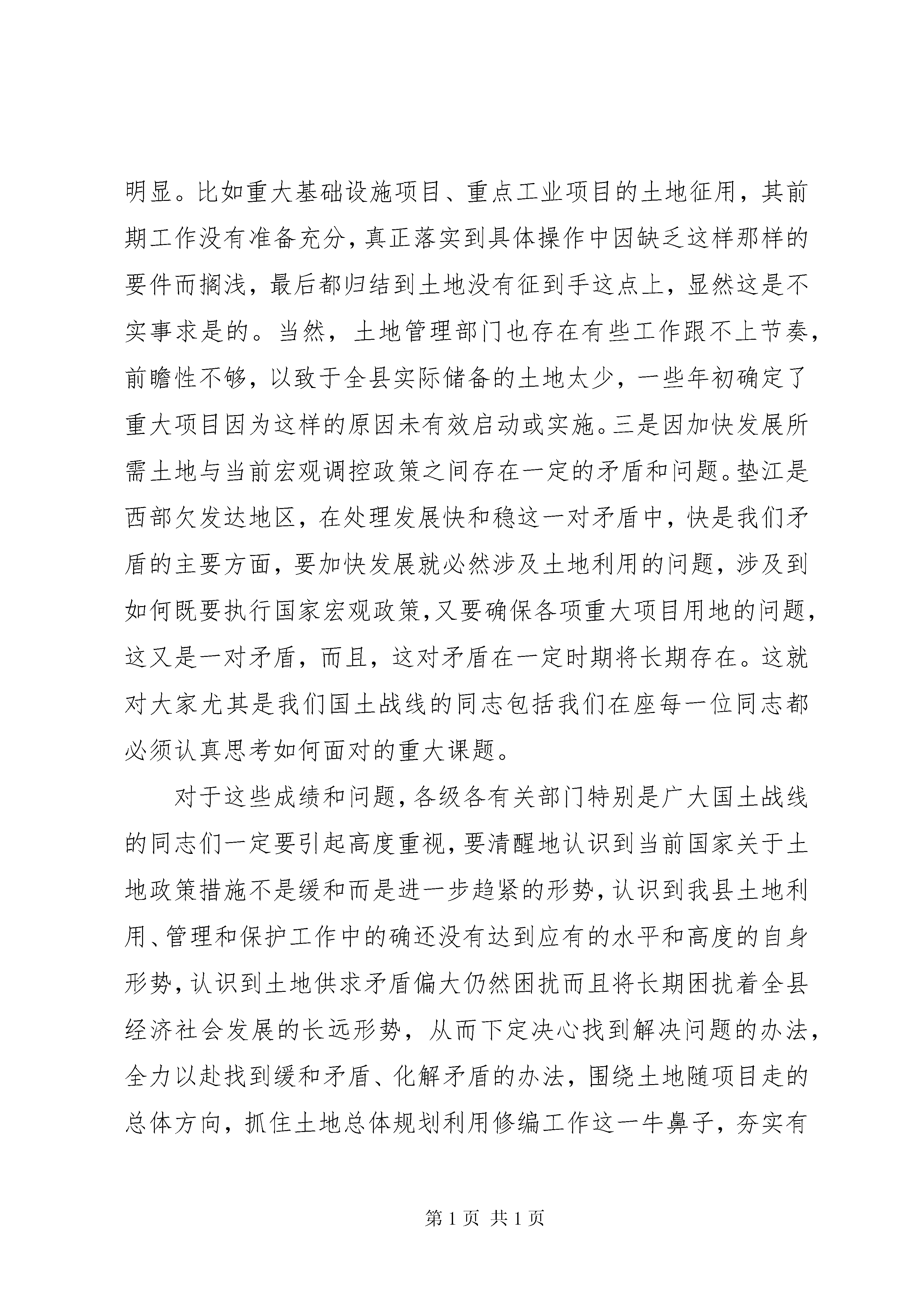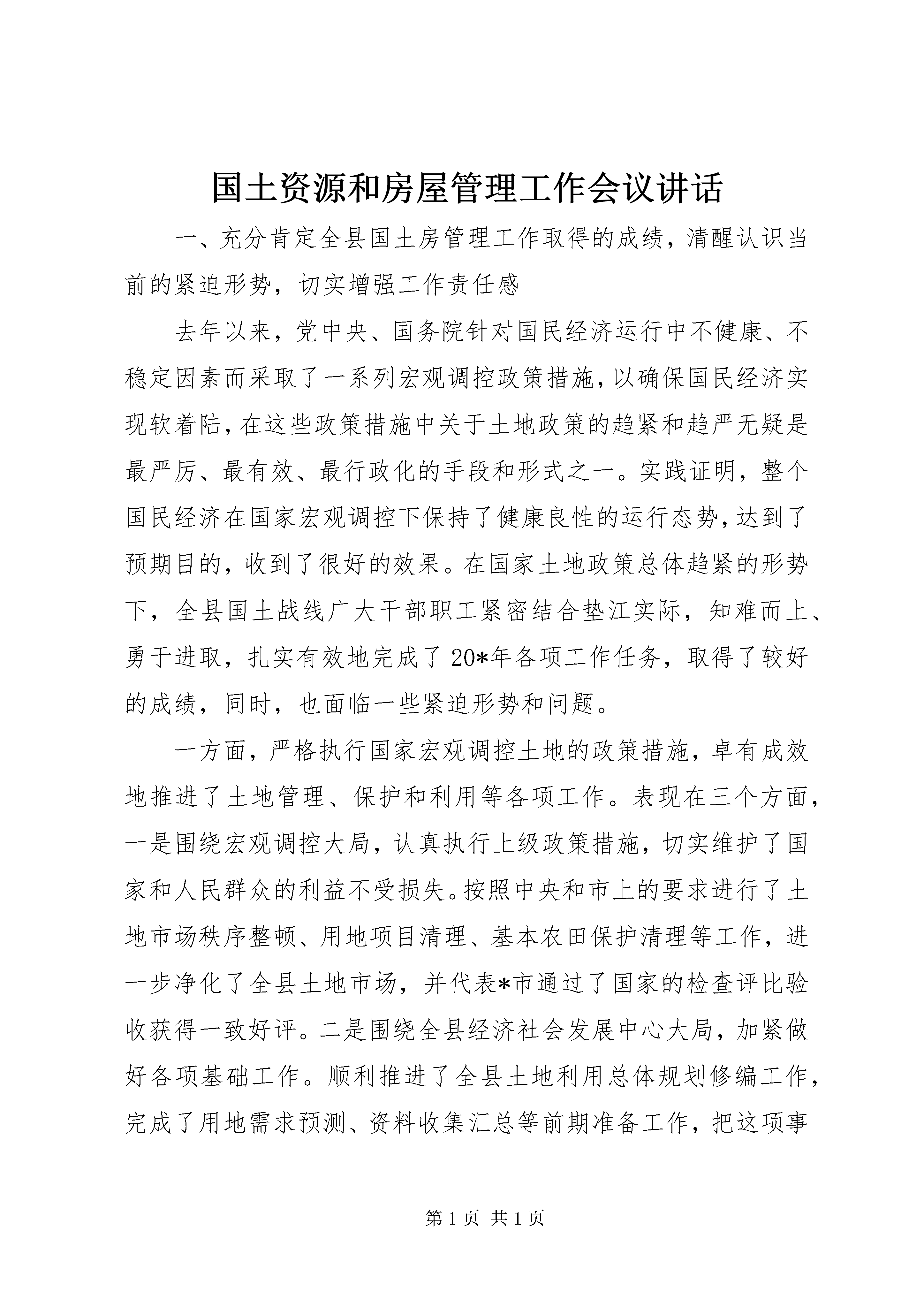国土资源和房屋管理工作会议讲话一、充分肯定全县国土房管理工作取得的成绩,清醒认识当前的紧迫形势,切实增强工作责任感去年以来,党中央、国务院针对国民经济运行中不健康、不稳定因素而采取了一系列宏观调控政策措施,以确保国民经济实现软着陆,在这些政策措施中关于土地政策的趋紧和趋严无疑是最严厉、最有效、最行政化的手段和形式之一。实践证明,整个国民经济在国家宏观调控下保持了健康良性的运行态势,达到了预期目的,收到了很好的效果。在国家土地政策总体趋紧的形势下,全县国土战线广大干部职工紧密结合垫江实际,知难而上、勇于进取,扎实有效地完成了20*年各项工作任务,取得了较好的成绩,同时,也面临一些紧迫形势和问题。一方面,严格执行国家宏观调控土地的政策措施,卓有成效地推进了土地管理、保护和利用等各项工作。表现在三个方面,一是围绕宏观调控大局,认真执行上级政策措施,切实维护了国家和人民群众的利益不受损失。按照中央和市上的要求进行了土地市场秩序整顿、用地项目清理、基本农田保护清理等工作,进一步净化了全县土地市场,并代表*市通过了国家的检查评比验收获得一致好评。二是围绕全县经济社会发展中心大局,加紧做好各项基础工作。顺利推进了全县土地利用总体规划修编工作,完成了用地需求预测、资料收集汇总等前期准备工作,把这项事关全县今后土地利用和管理最基础性的工作推向深入;在做好这项工作的基础上,围绕全县经济社会发展的中心工作,艰难地开展了土地征用、报批等工作,确保了工业园区、垫忠高速路、垫道路、凤山西路、白银路、县医院传染病区、行政办公中心、垃圾处理场等一批重大项目的用地需求。三是围绕全县土地利用和发展大局,扎实开展了土地整治、储备、出让等工作。认真开展土地用地秩序的清理整顿,充分盘活企业、城镇闲置土地,较好地完成了土地整理开发和耕地保护等工作;继续做好土地这篇文章,坚定不移地贯彻执行“招拍挂”制度,把好土地出口关,加大土地出让金的清收力度,全年土地出让金收入达1300多万元,为全县重大项目建设筹集了资金,进一步增强了发展后劲。另一方面,在土地利用、管理和保护工作中,面临着宏观大环境趋紧和自身造血不足等一系列亟待解决的问题。也表现在三个方面;一是主观努力还不够,思想观念上还存在过分依赖的现象。我们的土地管理部门和乡镇政府、有关部门、项目业主等,都存在这种现象,在国家大的政策措施出台之前,我们没有相对完善或者完备的措施加以贯彻或积极应对,总感到束手无策,难以适应。创新意识差,工作手段不多,对新形势新任务下的土地工作研究不深不透。二是前期工作不细致、不深入,土地储备量少质差,一些重大项目因用地难而未能顺利实施。有些工作特别是一些基础性、长远性的工作,没有很好地推进,工作成效不太明显。比如重大基础设施项目、重点工业项目的土地征用,其前期工作没有准备充分,真正落实到具体操作中因缺乏这样那样的要件而搁浅,最后都归结到土地没有征到手这点上,显然这是不实事求是的。当然,土地管理部门也存在有些工作跟不上节奏,前瞻性不够,以致于全县实际储备的土地太少,一些年初确定了重大项目因为这样的原因未有效启动或实施。三是因加快发展所需土地与当前宏观调控政策之间存在一定的矛盾和问题。垫江是西部欠发达地区,在处理发展快和稳这一对矛盾中,快是我们矛盾的主要方面,要加快发展就必然涉及土地利用的问题,涉及到如何既要执行国家宏观政策,又要确保各项重大项目用地的问题,这又是一对矛盾,而且,这对矛盾在一定时期将长期存在。这就对大家尤其是我们国土战线的同志包括我们在座每一位同志都必须认真思考如何面对的重大课题。对于这些成绩和问题,各级各有关部门特别是广大国土战线的同志们一定要引起高度重视,要清醒地认识到当前国家关于土地政策措施不是缓和而是进一步趋紧的形势,认识到我县土地利用、管理和保护工作中的确还没有达到应有的水平和高度的自身形势,认识到土地供求矛盾偏大仍然困扰而且将长期困扰着全县经济社会发展的长远形势,从而下定决心找到解决问题的办法,全力以赴找到缓和矛盾、化解矛盾的办法,围绕土地随项目走的总体方向,抓住土地总体规划利用修编工作这一牛鼻子,夯实有关基础基层和前期工作,探索土地管理利用新方法,不断把土地利用、管理和保护工作推向深入。二、抓住重点,扎实有效地推进土地修编、土地利用和土地管理工作,确保完成全年工作任务今年的土地工作,要紧紧围绕县委、县政府的中心工作,按照全县的统一安排部署,认真贯彻执行国家宏观调控政策措施,严格依法行政,以开拓创新、积极进取的态度和求真务实的工作作风千方百计确保全县重点项目建设的用地需求,同时,也要切实保护人民群众合法利益,促进土地资源的永续利用。(一)切实抓好全县新一轮土地利用总体规划修编等基础性工作。做好全县土地利用修编工作是今年全县国土房管工作的重中之重,具