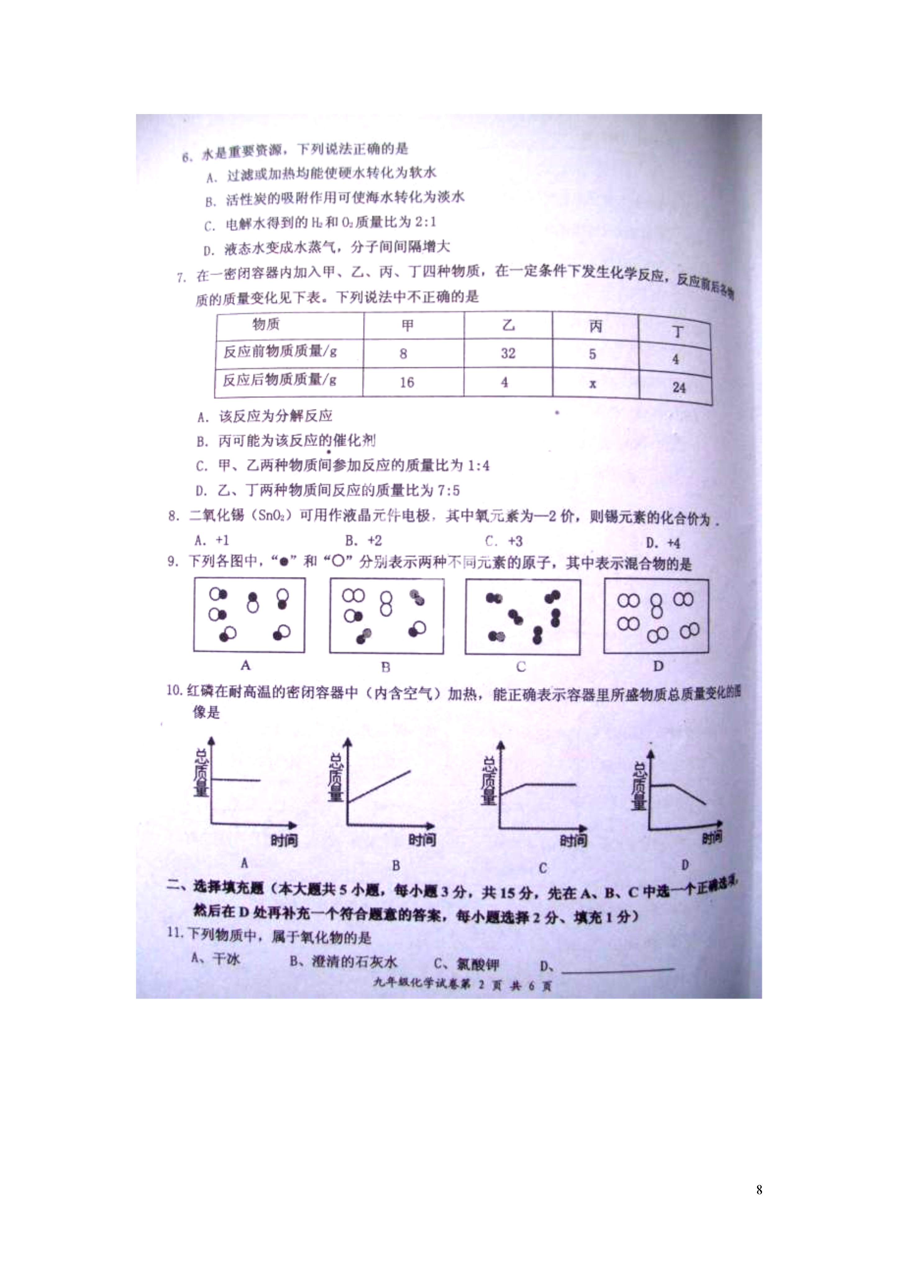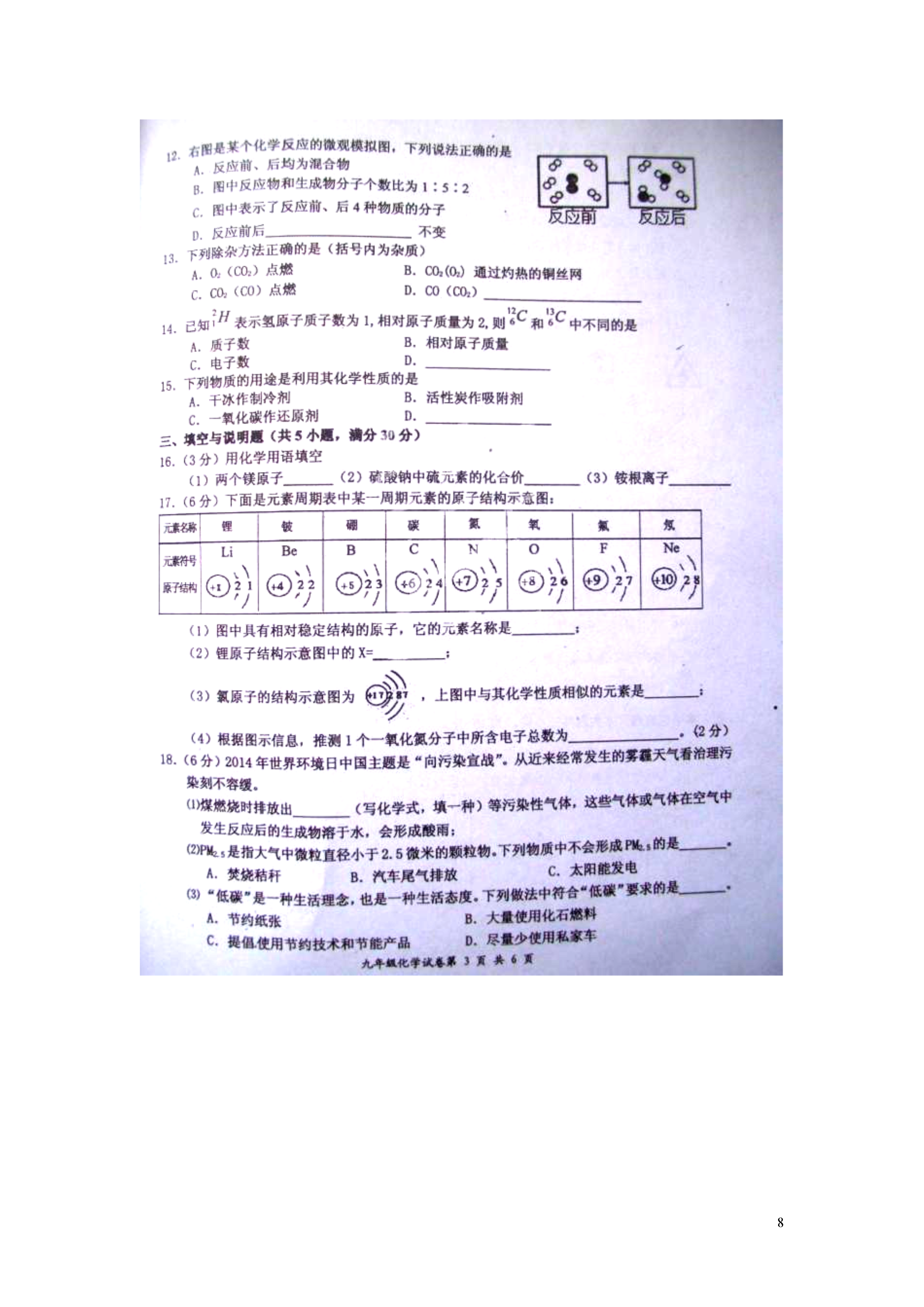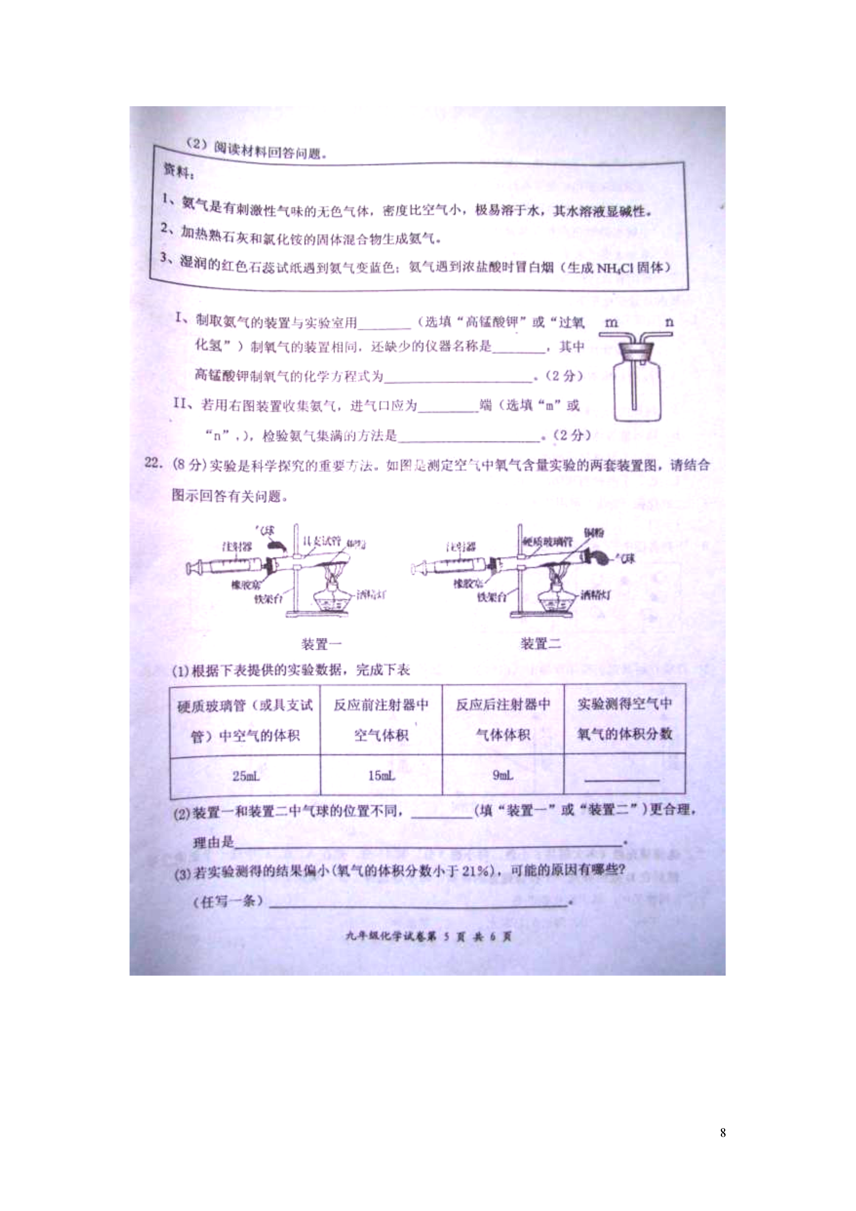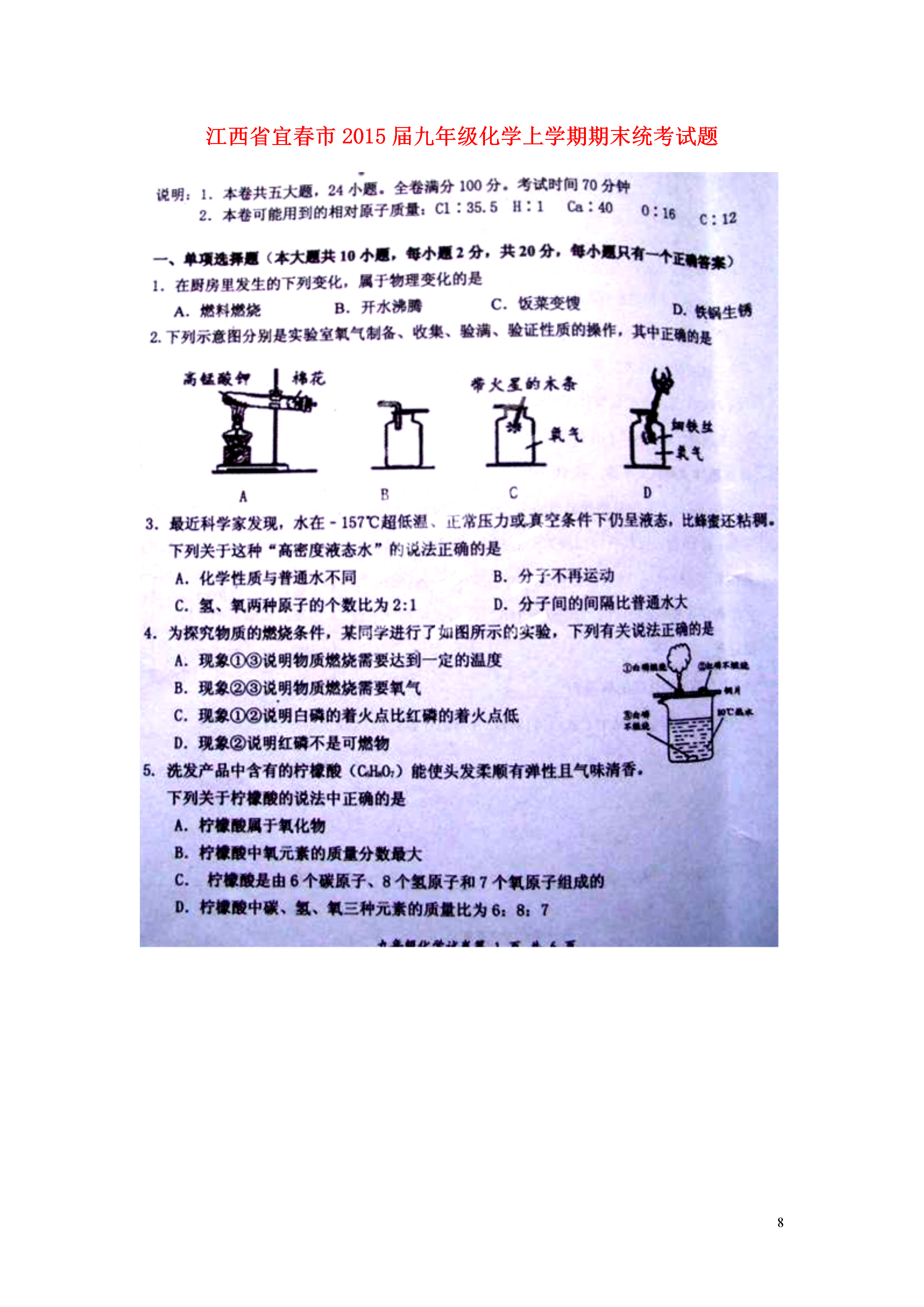 8江西省宜春市2015届九年级化学上学期期末统考试题2014-2015学年度上学期宜春市期末考试化学试卷参考答案19.(7分)(1)CH4+2O2CO2+2H2O(2分)(2)②遇到明火(3)H2(4)(B)(5)节约资源(2分)20.(8分)(1)Cu(2)CO+CuOCu+CO2(3)化合(4)作燃料等四、实验探究题(本大题共三小题,共25分)21.(9分)(1)①②⑥⑦(2分)(2)I、高锰酸钾酒精灯2KMnO4K2MnO4+MnO2+O2↑(2分)II、n将湿润的红色石蕊试纸放在m处,试纸变蓝(2分)22.(8分)(1)15%(2)装置二能让空气更易流通,全部通过铜粉,使氧气与铜粉充分反应(3)铜粉的量不足(合理答案均可)23.(8分)(1)长颈漏斗(2)有气泡产生(3)C+CO22CO(2分)还原(4)CO2+Ca(OH)2=CaCO3+H2O(2分)(5)集中火焰并提高温度五、计算题(本大题共1小题,共10分)24.(1)8.8g(2)0.4g(列式计算)(3)增大接触面积