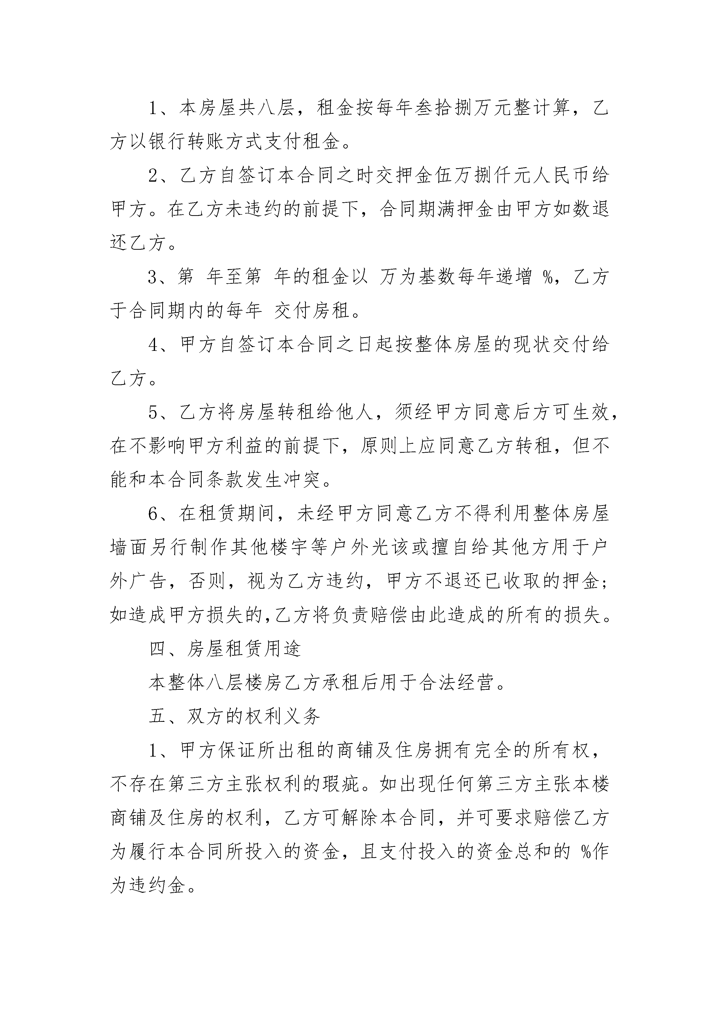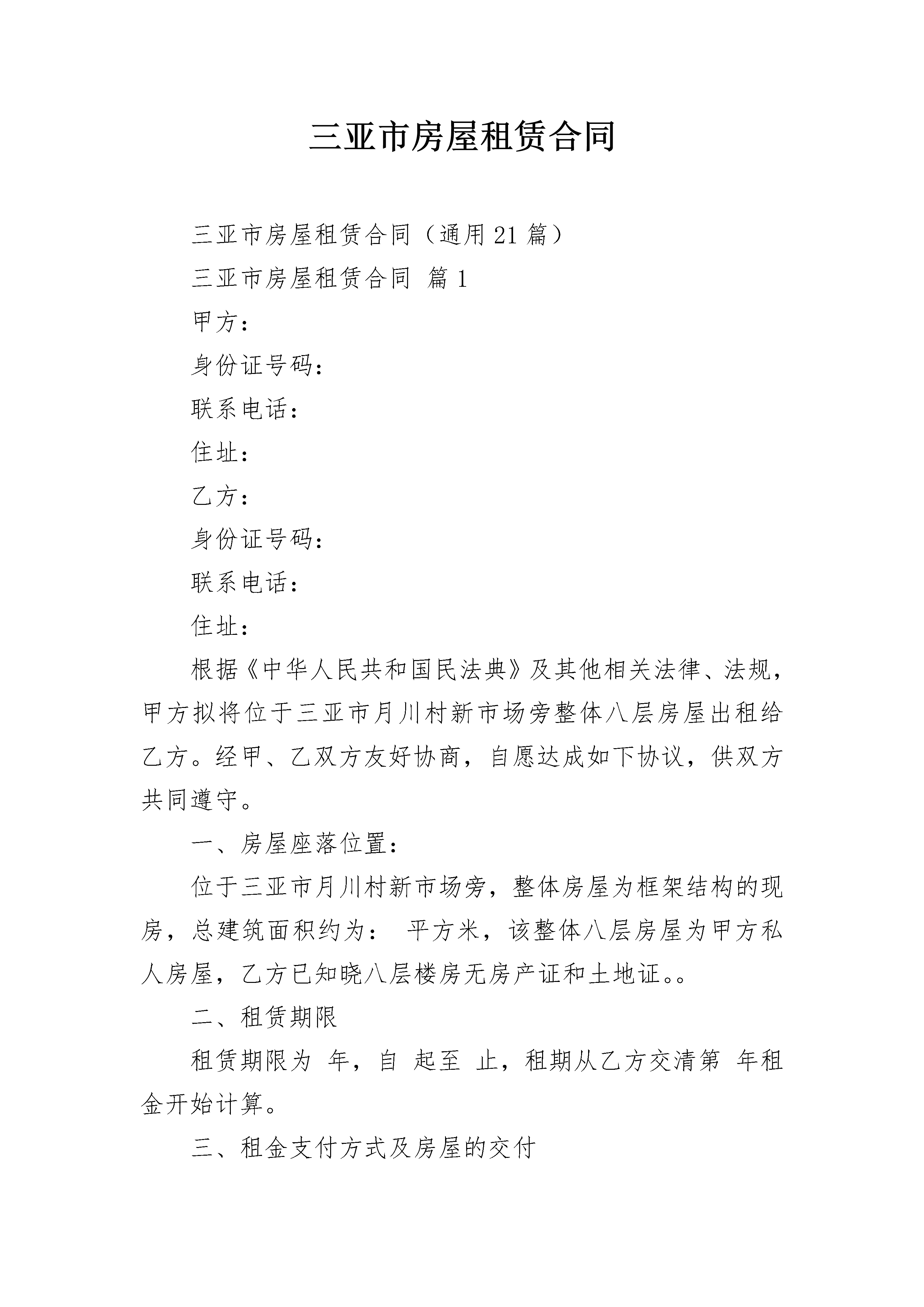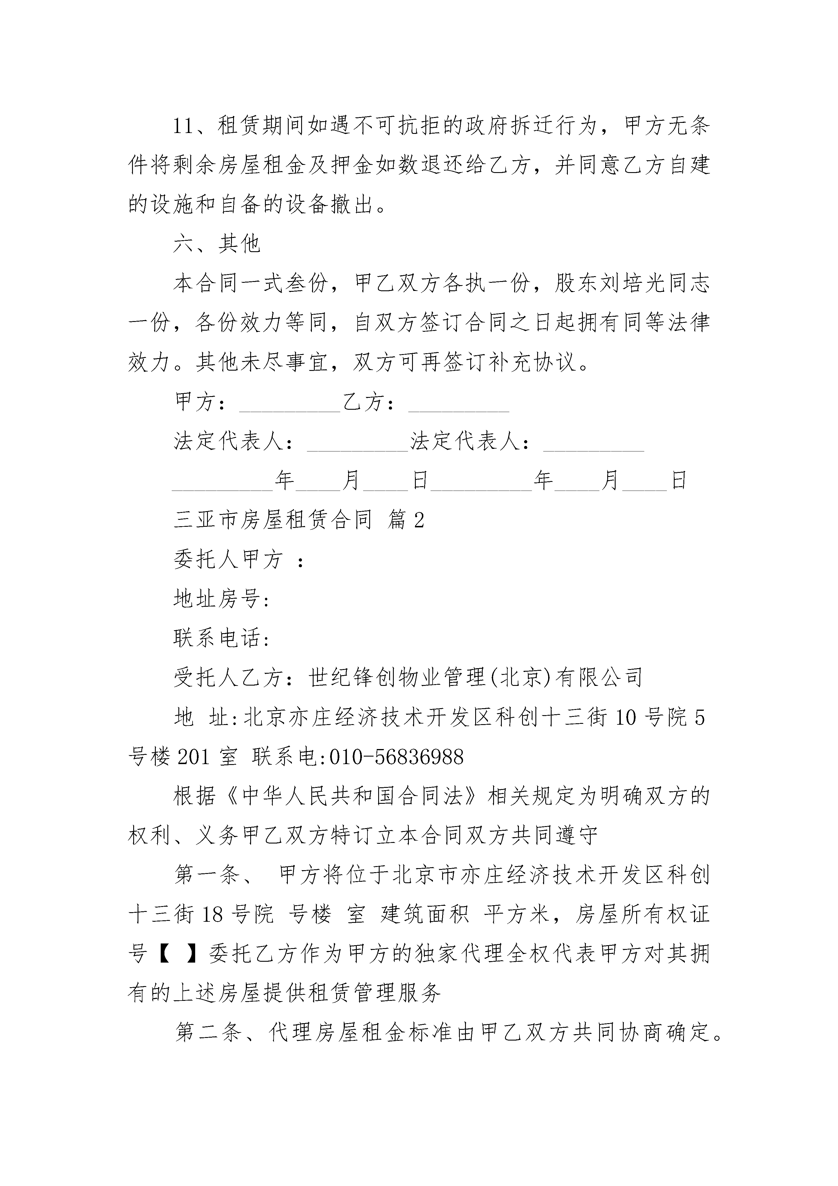 三亚市房屋租赁合同三亚市房屋租赁合同(通用21篇)三亚市房屋租赁合同篇1甲方:身份证号码:联系电话:住址:乙方:身份证号码:联系电话:住址:根据《中华人民共和国民法典》及其他相关法律、法规,甲方拟将位于三亚市月川村新市场旁整体八层房屋出租给乙方。经甲、乙双方友好协商,自愿达成如下协议,供双方共同遵守。一、房屋座落位置:位于三亚市月川村新市场旁,整体房屋为框架结构的现房,总建筑面积约为:平方米,该整体八层房屋为甲方私人房屋,乙方已知晓八层楼房无房产证和土地证。。二、租赁期限租赁期限为年,自起至止,租期从乙方交清第年租金开始计算。三、租金支付方式及房屋的交付1、本房屋共八层,租金按每年叁拾捌万元整计算,乙方以银行转账方式支付租金。2、乙方自签订本合同之时交押金伍万捌仟元人民币给甲方。在乙方未违约的前提下,合同期满押金由甲方如数退还乙方。3、第年至第年的租金以万为基数每年递增%,乙方于合同期内的每年交付房租。4、甲方自签订本合同之日起按整体房屋的现状交付给乙方。5、乙方将房屋转租给他人,须经甲方同意后方可生效,在不影响甲方利益的前提下,原则上应同意乙方转租,但不能和本合同条款发生冲突。6、在租赁期间,未经甲方同意乙方不得利用整体房屋墙面另行制作其他楼宇等户外光该或擅自给其他方用于户外广告,否则,视为乙方违约,甲方不退还已收取的押金;如造成甲方损失的,乙方将负责赔偿由此造成的所有的损失。四、房屋租赁用途本整体八层楼房乙方承租后用于合法经营。五、双方的权利义务1、甲方保证所出租的商铺及住房拥有完全的所有权,不存在第三方主张权利的瑕疵。如出现任何第三方主张本楼商铺及住房的权利,乙方可解除本合同,并可要求赔偿乙方为履行本合同所投入的资金,且支付投入的资金总和的%作为违约金。2、承租期内甲方不得任意干涉乙方日常经营,并不得将本整体房屋以任意方式抵押、转让、承包给他人。3、租赁期间,甲方不得无故解除本合同,否则,视为甲方违约,并赔偿乙方为履行本合同所投入的资金,并支付投入的资金总和的%作为违约金。4、在承租期内,国家允许经营的行政审批所有手续和各种水电费用、税收费用等所有的费用由乙方自行办理和承担。5、租赁期满后,如甲方继续出租的话乙方在同等条件下享有优先承租权。6、租赁期间,乙方使用经营中所发生的一切税费与甲方无关,由乙方自行负担,如需交纳房屋出租税,甲方出示托管书,房屋出租税金由乙方负责。7、在租赁期间,所属人员房屋里的防火、防盗安全责任由乙方负责,与甲方无关。8、乙方在装饰、装修施工期内,甲方有义务协助乙方顺利完成装修及其他拆除事宜,如遇有市综合执法局或其他政府部门干涉的,甲方应出面协助乙方妥善解决。9、租赁期满后,乙方不再续租的,不得就该整体房屋所做的不可分割的装修、装饰或改建部分要求甲方补偿装饰、修改建部分的费用,甲方不做任何补偿;对未形成不可分割的部分,由乙方自行拆除,恢复原状。10、对未经甲方同意装修、装饰或改建的部分,甲方有权要求恢复原状或赔偿损失。11、租赁期间如遇不可抗拒的政府拆迁行为,甲方无条件将剩余房屋租金及押金如数退还给乙方,并同意乙方自建的设施和自备的设备撤出。六、其他本合同一式叁份,甲乙双方各执一份,股东刘培光同志一份,各份效力等同,自双方签订合同之日起拥有同等法律效力。其他未尽事宜,双方可再签订补充协议。甲方:_________乙方:_________法定代表人:_________法定代表人:__________________年____月____日_________年____月____日三亚市房屋租赁合同篇2委托人甲方:地址房号:联系电话:受托人乙方:世纪锋创物业管理(北京)有限公司地址:北京亦庄经济技术开发区科创十三街10号院5号楼201室联系电:010-56836988根据《中华人民共和国合同法》相关规定为明确双方的权利、义务甲乙双方特订立本合同双方共同遵守第一条、甲方将位于北京市亦庄经济技术开发区科创十三街18号院号楼室建筑面积平方米,房屋所有权证号【】委托乙方作为甲方的独家代理全权代表甲方对其拥有的上述房屋提供租赁管理服务第二条、代理房屋租金标准由甲乙双方共同协商确定。甲方应根据一年租期支付相等于一个月房租全款的代理服务佣金给乙方。其中包括但不仅限于应支付给第三方的因房屋代理服务所产生的费用。如有其它费用支出甲乙双方另行协商。甲方应在该房屋出租7个工作日内支付代理费。第三条、甲方责任1、若甲方在租赁期内出售该房屋需提前两个月以书面形式告知乙方则本合同在甲方与新买受人之间的房屋买卖合同生效后自动结束但如房屋已出租的甲方应保证新买受人继续履行就该房屋签订的房屋租赁协议。2、甲方将协助乙方出具关于每个出租单位的有关收房、出租、交税、办理产权、租户办公注册等事项的委托书和相关文件、证明并委托乙方代替其签署在