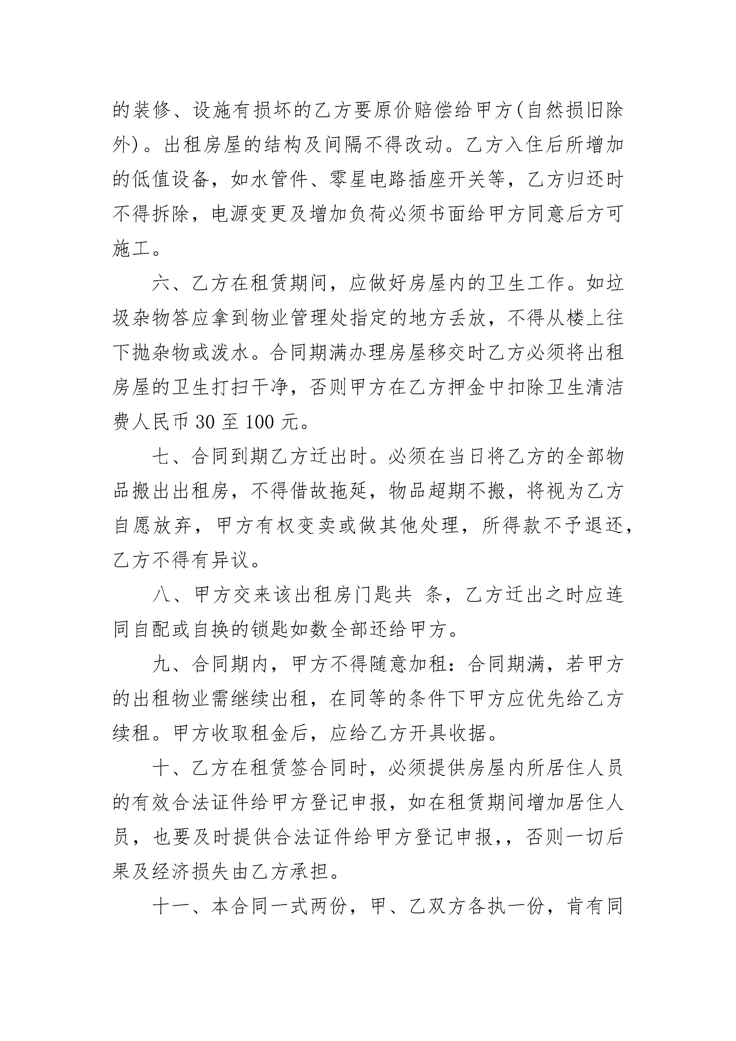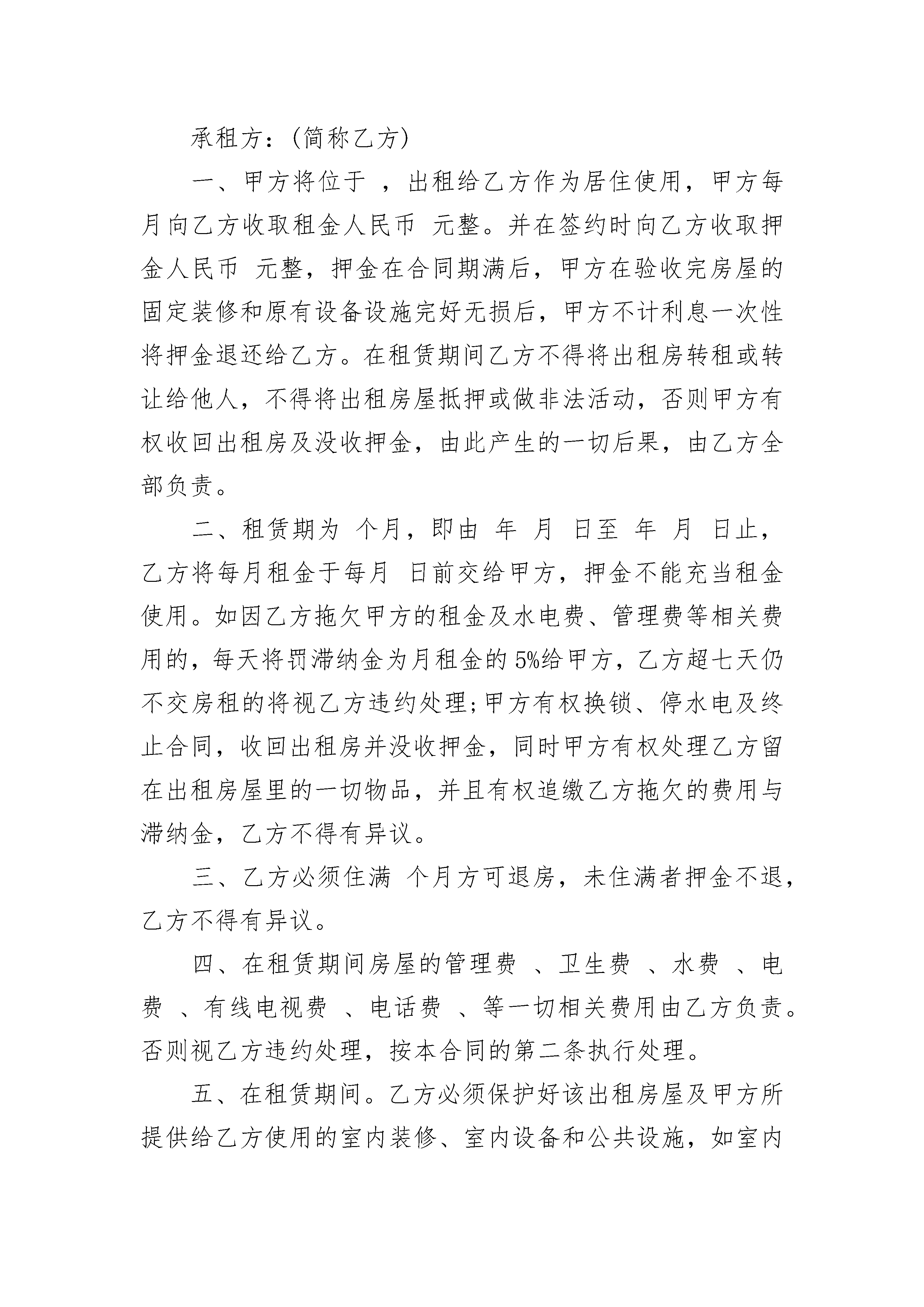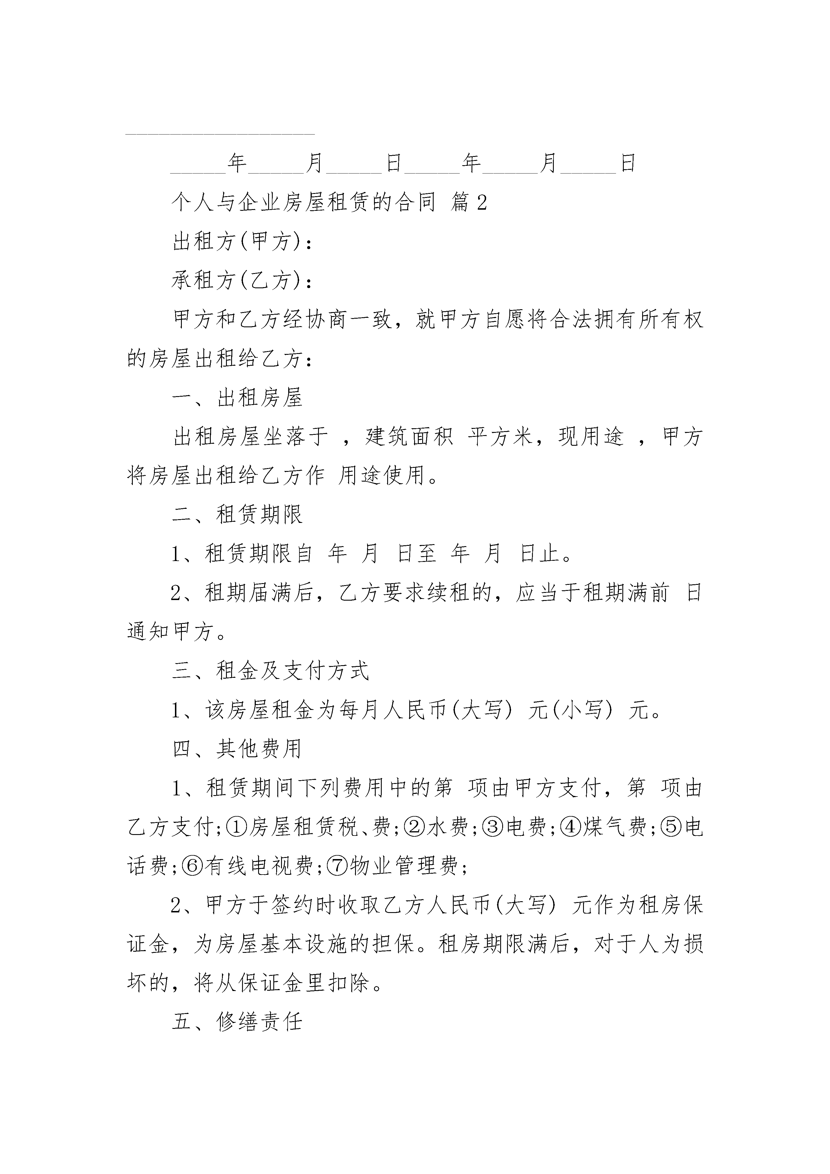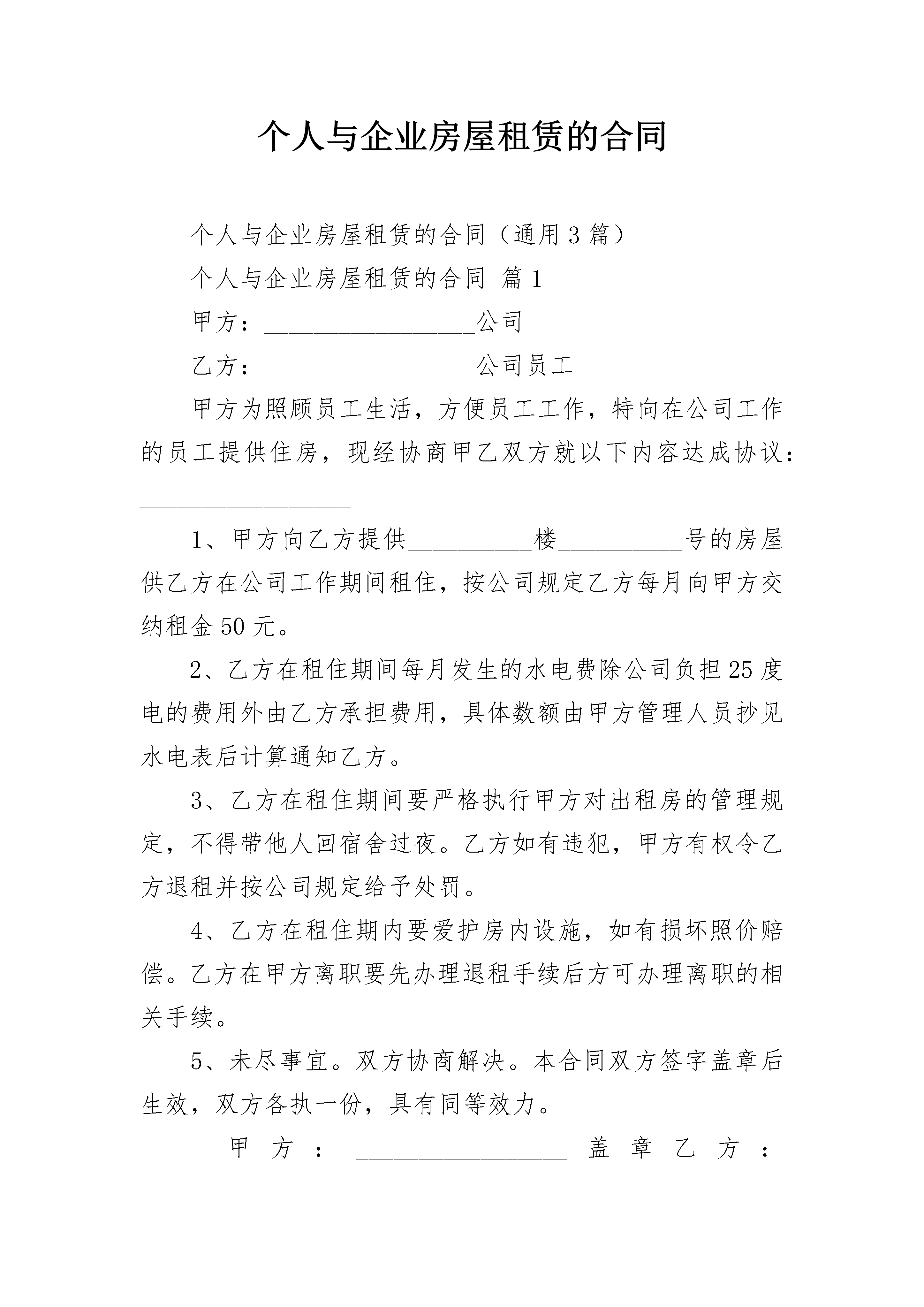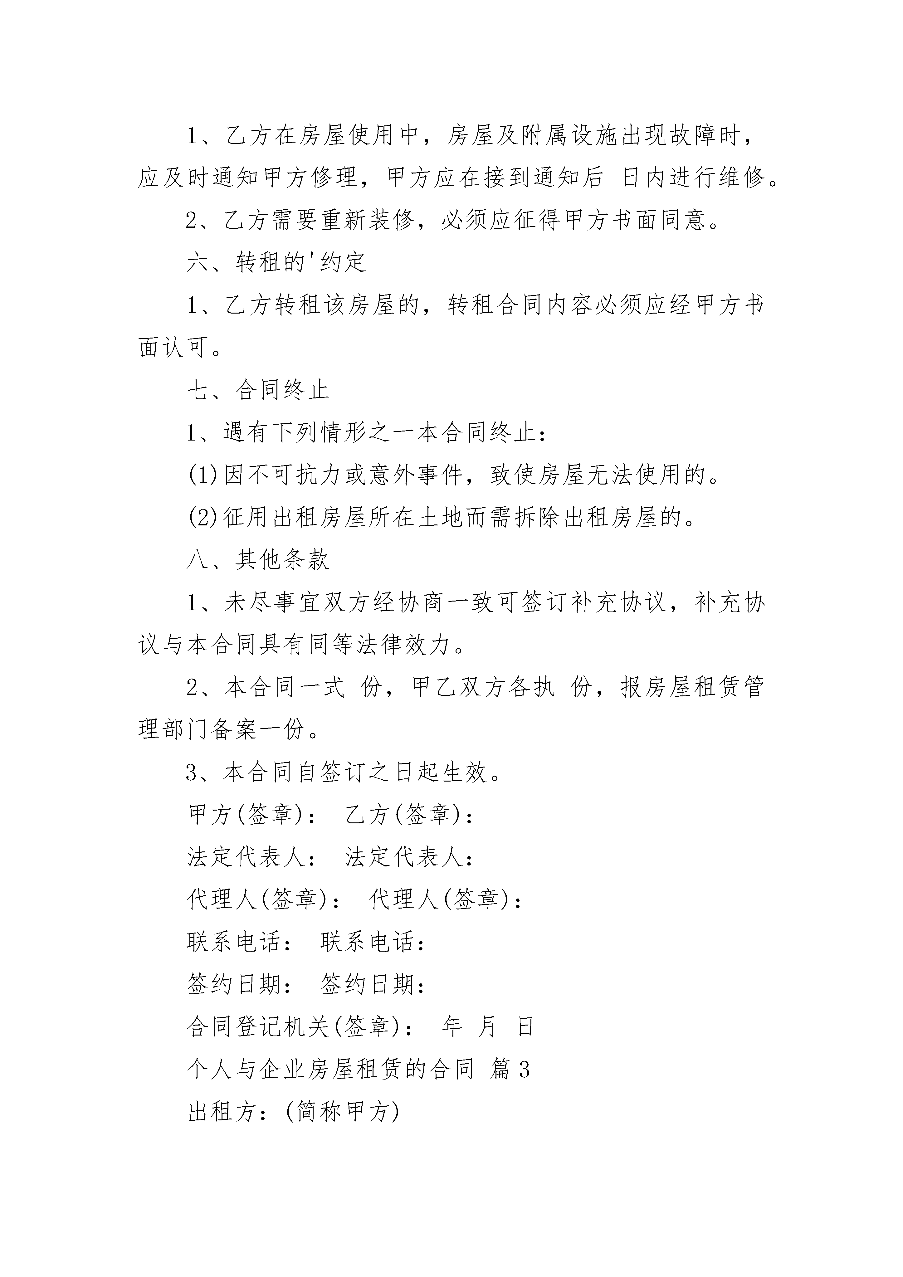 个人与企业房屋租赁的合同个人与企业房屋租赁的合同(通用3篇)个人与企业房屋租赁的合同篇1甲方:_________________公司乙方:_________________公司员工_______________甲方为照顾员工生活,方便员工工作,特向在公司工作的员工提供住房,现经协商甲乙双方就以下内容达成协议:_________________1、甲方向乙方提供__________楼__________号的房屋供乙方在公司工作期间租住,按公司规定乙方每月向甲方交纳租金50元。2、乙方在租住期间每月发生的水电费除公司负担25度电的费用外由乙方承担费用,具体数额由甲方管理人员抄见水电表后计算通知乙方。3、乙方在租住期间要严格执行甲方对出租房的管理规定,不得带他人回宿舍过夜。乙方如有违犯,甲方有权令乙方退租并按公司规定给予处罚。4、乙方在租住期内要爱护房内设施,如有损坏照价赔偿。乙方在甲方离职要先办理退租手续后方可办理离职的相关手续。5、未尽事宜。双方协商解决。本合同双方签字盖章后生效,双方各执一份,具有同等效力。甲方:_________________盖章乙方:______________________年_____月_____日_____年_____月_____日个人与企业房屋租赁的合同篇2出租方(甲方):承租方(乙方):甲方和乙方经协商一致,就甲方自愿将合法拥有所有权的房屋出租给乙方:一、出租房屋出租房屋坐落于,建筑面积平方米,现用途,甲方将房屋出租给乙方作用途使用。二、租赁期限1、租赁期限自年月日至年月日止。2、租期届满后,乙方要求续租的,应当于租期满前日通知甲方。三、租金及支付方式1、该房屋租金为每月人民币(大写)元(小写)元。四、其他费用1、租赁期间下列费用中的第项由甲方支付,第项由乙方支付;①房屋租赁税、费;②水费;③电费;④煤气费;⑤电话费;⑥有线电视费;⑦物业管理费;2、甲方于签约时收取乙方人民币(大写)元作为租房保证金,为房屋基本设施的担保。租房期限满后,对于人为损坏的,将从保证金里扣除。五、修缮责任1、乙方在房屋使用中,房屋及附属设施出现故障时,应及时通知甲方修理,甲方应在接到通知后日内进行维修。2、乙方需要重新装修,必须应征得甲方书面同意。六、转租的'约定1、乙方转租该房屋的,转租合同内容必须应经甲方书面认可。七、合同终止1、遇有下列情形之一本合同终止:(1)因不可抗力或意外事件,致使房屋无法使用的。(2)征用出租房屋所在土地而需拆除出租房屋的。八、其他条款1、未尽事宜双方经协商一致可签订补充协议,补充协议与本合同具有同等法律效力。2、本合同一式份,甲乙双方各执份,报房屋租赁管理部门备案一份。3、本合同自签订之日起生效。甲方(签章):乙方(签章):法定代表人:法定代表人:代理人(签章):代理人(签章):联系电话:联系电话:签约日期:签约日期:合同登记机关(签章):年月日个人与企业房屋租赁的合同篇3出租方:(简称甲方)承租方:(简称乙方)一、甲方将位于,出租给乙方作为居住使用,甲方每月向乙方收取租金人民币元整。并在签约时向乙方收取押金人民币元整,押金在合同期满后,甲方在验收完房屋的固定装修和原有设备设施完好无损后,甲方不计利息一次性将押金退还给乙方。在租赁期间乙方不得将出租房转租或转让给他人,不得将出租房屋抵押或做非法活动,否则甲方有权收回出租房及没收押金,由此产生的一切后果,由乙方全部负责。二、租赁期为个月,即由年月日至年月日止,乙方将每月租金于每月日前交给甲方,押金不能充当租金使用。如因乙方拖欠甲方的租金及水电费、管理费等相关费用的,每天将罚滞纳金为月租金的5%给甲方,乙方超七天仍不交房租的将视乙方违约处理;甲方有权换锁、停水电及终止合同,收回出租房并没收押金,同时甲方有权处理乙方留在出租房屋里的一切物品,并且有权追缴乙方拖欠的费用与滞纳金,乙方不得有异议。三、乙方必须住满个月方可退房,未住满者押金不退,乙方不得有异议。四、在租赁期间房屋的管理费、卫生费、水费、电费、有线电视费、电话费、等一切相关费用由乙方负责。否则视乙方违约处理,按本合同的第二条执行处理。五、在租赁期间。乙方必须保护好该出租房屋及甲方所提供给乙方使用的室内装修、室内设备和公共设施,如室内的装修、设施有损坏的乙方要原价赔偿给甲方(自然损旧除外)。出租房屋的结构及间隔不得改动。乙方入住后所增加的低值设备,如水管件、零星电路插座开关等,乙方归还时不得拆除,电源变更及增加负荷必须书面给甲方同意后方可施工。六、乙方在租赁期间,应做好房屋内的卫生工作。如垃圾杂物答应拿到物业管理处指定的地方丢放,不得从楼上往下抛杂物或泼水。合同期满办理房屋移交时乙方必须将出租房屋的卫生打扫干净,否则甲方在乙方押金中扣除卫生清洁费人民币30至100元。七、合同到期乙方