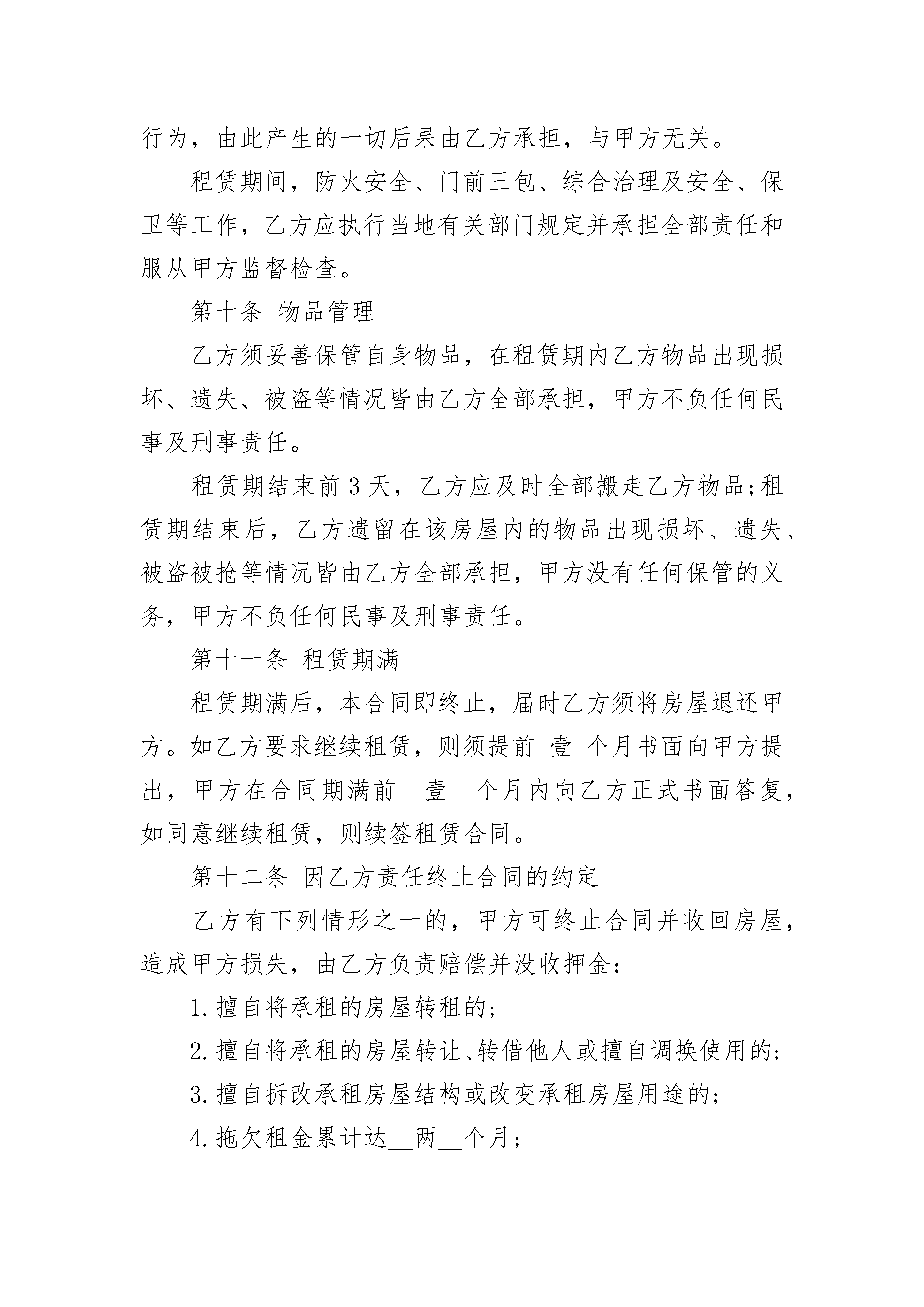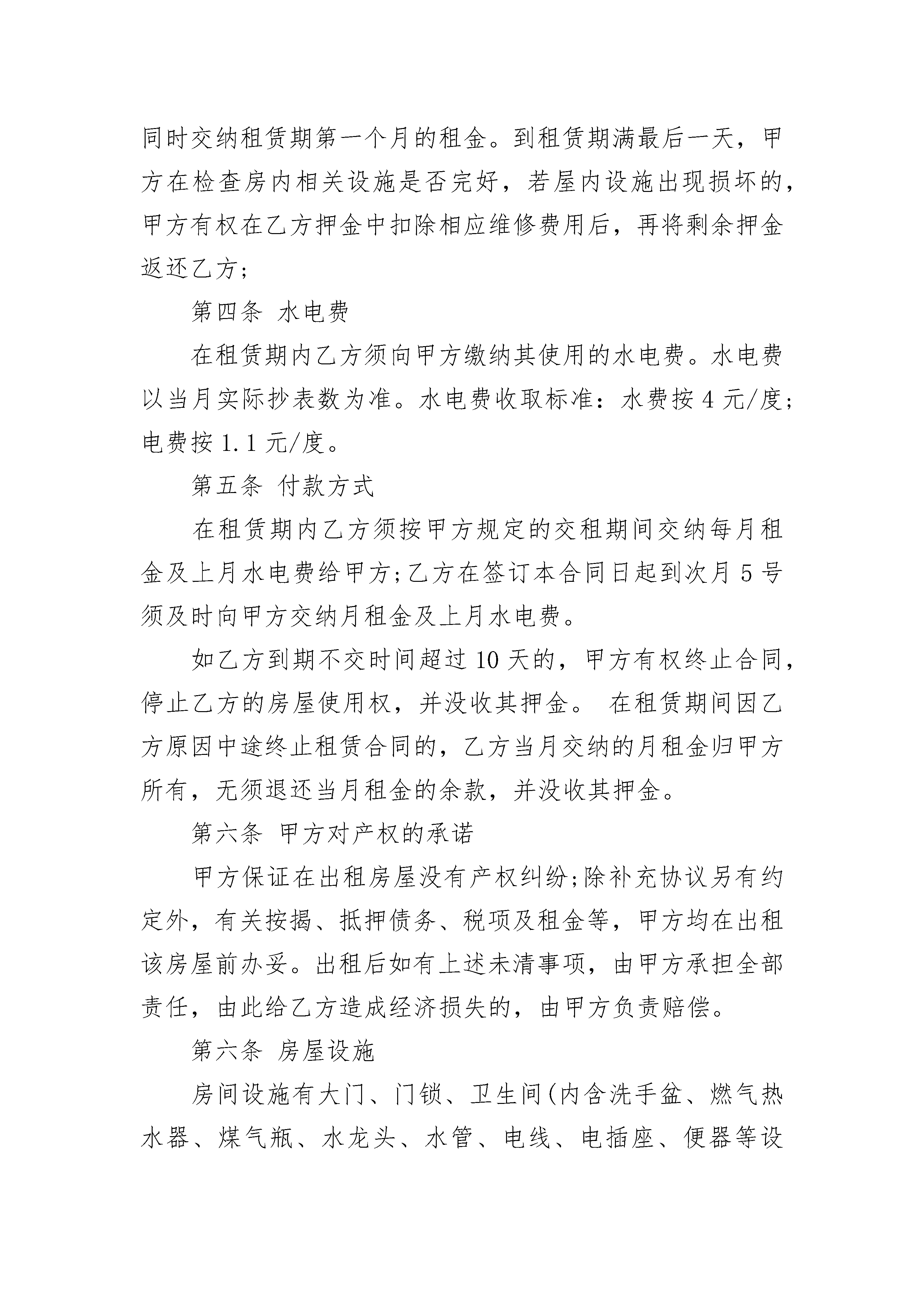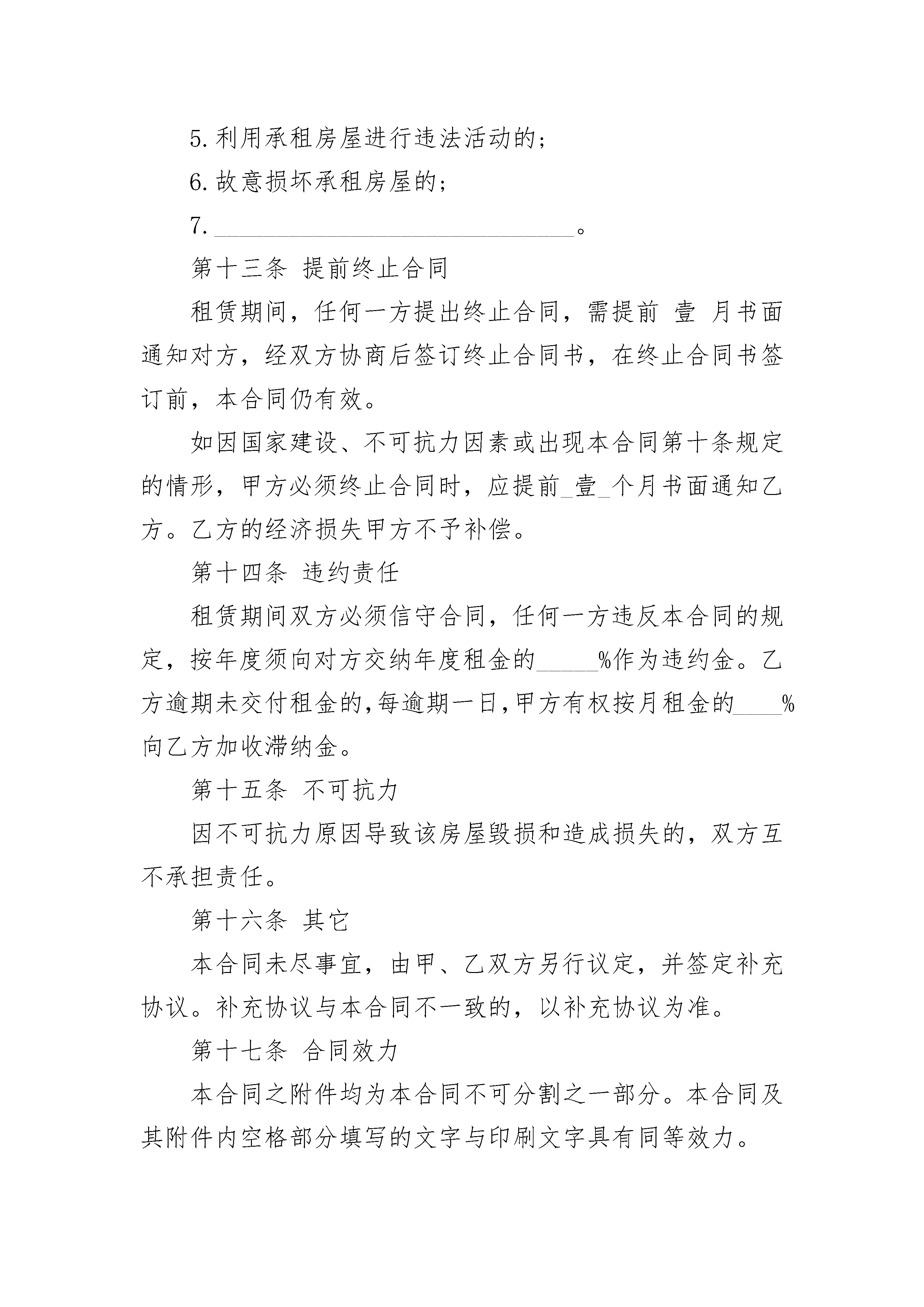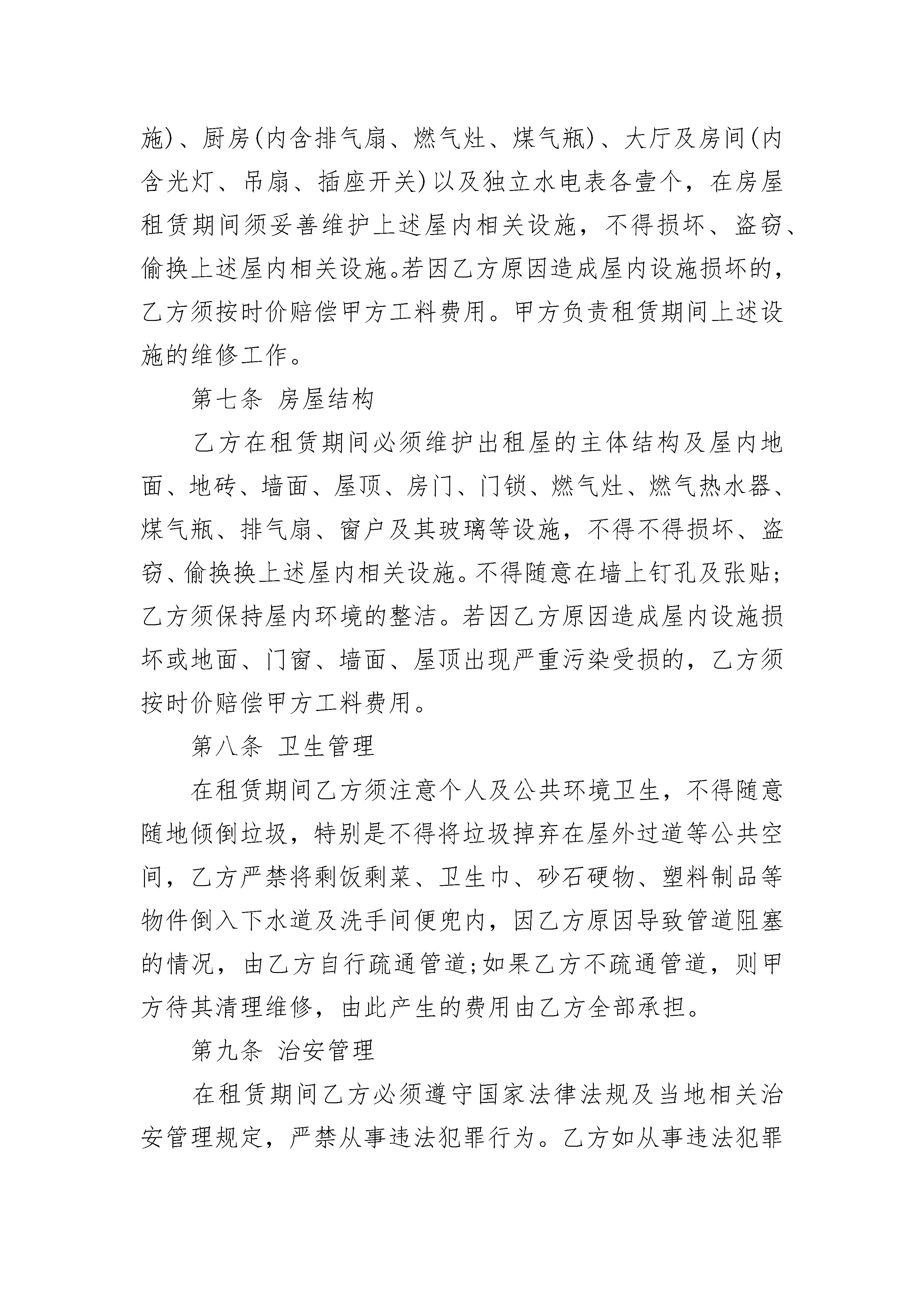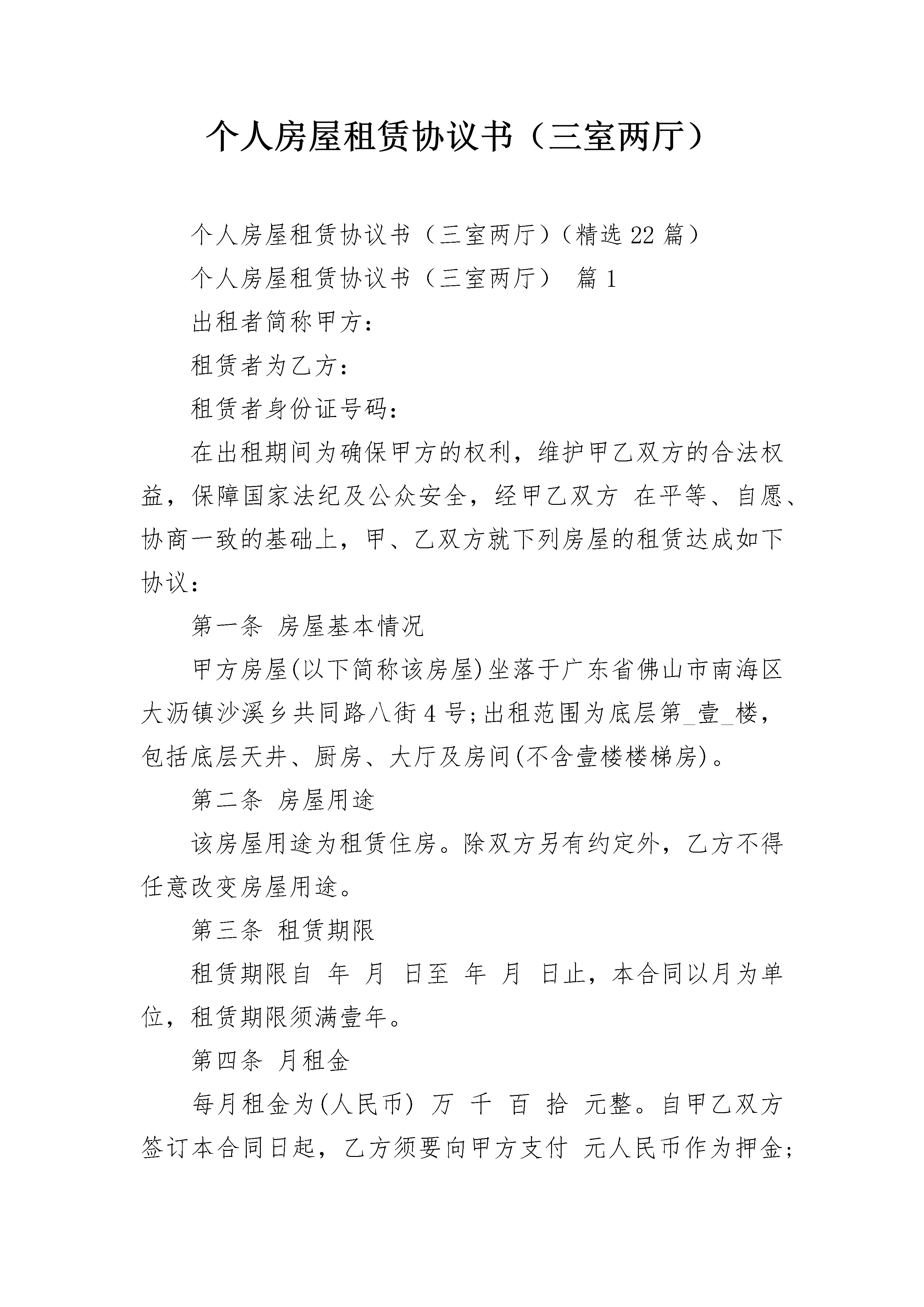 个人房屋租赁协议书(三室两厅)个人房屋租赁协议书(三室两厅)(精选22篇)个人房屋租赁协议书(三室两厅)篇1出租者简称甲方:租赁者为乙方:租赁者身份证号码:在出租期间为确保甲方的权利,维护甲乙双方的合法权益,保障国家法纪及公众安全,经甲乙双方在平等、自愿、协商一致的基础上,甲、乙双方就下列房屋的租赁达成如下协议:第一条房屋基本情况甲方房屋(以下简称该房屋)坐落于广东省佛山市南海区大沥镇沙溪乡共同路八街4号;出租范围为底层第_壹_楼,包括底层天井、厨房、大厅及房间(不含壹楼楼梯房)。第二条房屋用途该房屋用途为租赁住房。除双方另有约定外,乙方不得任意改变房屋用途。第三条租赁期限租赁期限自年月日至年月日止,本合同以月为单位,租赁期限须满壹年。第四条月租金每月租金为(人民币)万千百拾元整。自甲乙双方签订本合同日起,乙方须要向甲方支付元人民币作为押金;同时交纳租赁期第一个月的租金。到租赁期满最后一天,甲方在检查房内相关设施是否完好,若屋内设施出现损坏的,甲方有权在乙方押金中扣除相应维修费用后,再将剩余押金返还乙方;第四条水电费在租赁期内乙方须向甲方缴纳其使用的水电费。水电费以当月实际抄表数为准。水电费收取标准:水费按4元/度;电费按1.1元/度。第五条付款方式在租赁期内乙方须按甲方规定的交租期间交纳每月租金及上月水电费给甲方;乙方在签订本合同日起到次月5号须及时向甲方交纳月租金及上月水电费。如乙方到期不交时间超过10天的,甲方有权终止合同,停止乙方的房屋使用权,并没收其押金。在租赁期间因乙方原因中途终止租赁合同的,乙方当月交纳的月租金归甲方所有,无须退还当月租金的余款,并没收其押金。第六条甲方对产权的承诺甲方保证在出租房屋没有产权纠纷;除补充协议另有约定外,有关按揭、抵押债务、税项及租金等,甲方均在出租该房屋前办妥。出租后如有上述未清事项,由甲方承担全部责任,由此给乙方造成经济损失的,由甲方负责赔偿。第六条房屋设施房间设施有大门、门锁、卫生间(内含洗手盆、燃气热水器、煤气瓶、水龙头、水管、电线、电插座、便器等设施)、厨房(内含排气扇、燃气灶、煤气瓶)、大厅及房间(内含光灯、吊扇、插座开关)以及独立水电表各壹个,在房屋租赁期间须妥善维护上述屋内相关设施,不得损坏、盗窃、偷换上述屋内相关设施。若因乙方原因造成屋内设施损坏的,乙方须按时价赔偿甲方工料费用。甲方负责租赁期间上述设施的维修工作。第七条房屋结构乙方在租赁期间必须维护出租屋的主体结构及屋内地面、地砖、墙面、屋顶、房门、门锁、燃气灶、燃气热水器、煤气瓶、排气扇、窗户及其玻璃等设施,不得不得损坏、盗窃、偷换换上述屋内相关设施。不得随意在墙上钉孔及张贴;乙方须保持屋内环境的整洁。若因乙方原因造成屋内设施损坏或地面、门窗、墙面、屋顶出现严重污染受损的,乙方须按时价赔偿甲方工料费用。第八条卫生管理在租赁期间乙方须注意个人及公共环境卫生,不得随意随地倾倒垃圾,特别是不得将垃圾掉弃在屋外过道等公共空间,乙方严禁将剩饭剩菜、卫生巾、砂石硬物、塑料制品等物件倒入下水道及洗手间便兜内,因乙方原因导致管道阻塞的情况,由乙方自行疏通管道;如果乙方不疏通管道,则甲方待其清理维修,由此产生的费用由乙方全部承担。第九条治安管理在租赁期间乙方必须遵守国家法律法规及当地相关治安管理规定,严禁从事违法犯罪行为。乙方如从事违法犯罪行为,由此产生的一切后果由乙方承担,与甲方无关。租赁期间,防火安全、门前三包、综合治理及安全、保卫等工作,乙方应执行当地有关部门规定并承担全部责任和服从甲方监督检查。第十条物品管理乙方须妥善保管自身物品,在租赁期内乙方物品出现损坏、遗失、被盗等情况皆由乙方全部承担,甲方不负任何民事及刑事责任。租赁期结束前3天,乙方应及时全部搬走乙方物品;租赁期结束后,乙方遗留在该房屋内的物品出现损坏、遗失、被盗被抢等情况皆由乙方全部承担,甲方没有任何保管的义务,甲方不负任何民事及刑事责任。第十一条租赁期满租赁期满后,本合同即终止,届时乙方须将房屋退还甲方。如乙方要求继续租赁,则须提前_壹_个月书面向甲方提出,甲方在合同期满前__壹__个月内向乙方正式书面答复,如同意继续租赁,则续签租赁合同。第十二条因乙方责任终止合同的约定乙方有下列情形之一的,甲方可终止合同并收回房屋,造成甲方损失,由乙方负责赔偿并没收押金:1.擅自将承租的房屋转租的;2.擅自将承租的房屋转让、转借他人或擅自调换使用的;3.擅自拆改承租房屋结构或改变承租房屋用途的;4.拖欠租金累计达__两__个月;5.利用承租房屋进行违法活动的;6.故意损坏承租房屋的;7._____________________________。第十三条提前终止合同租赁期间,任何一方提出终止合同,需提前壹月书面通知对方,经双方协商后签订终止合同书,在终止合同书签订前,本