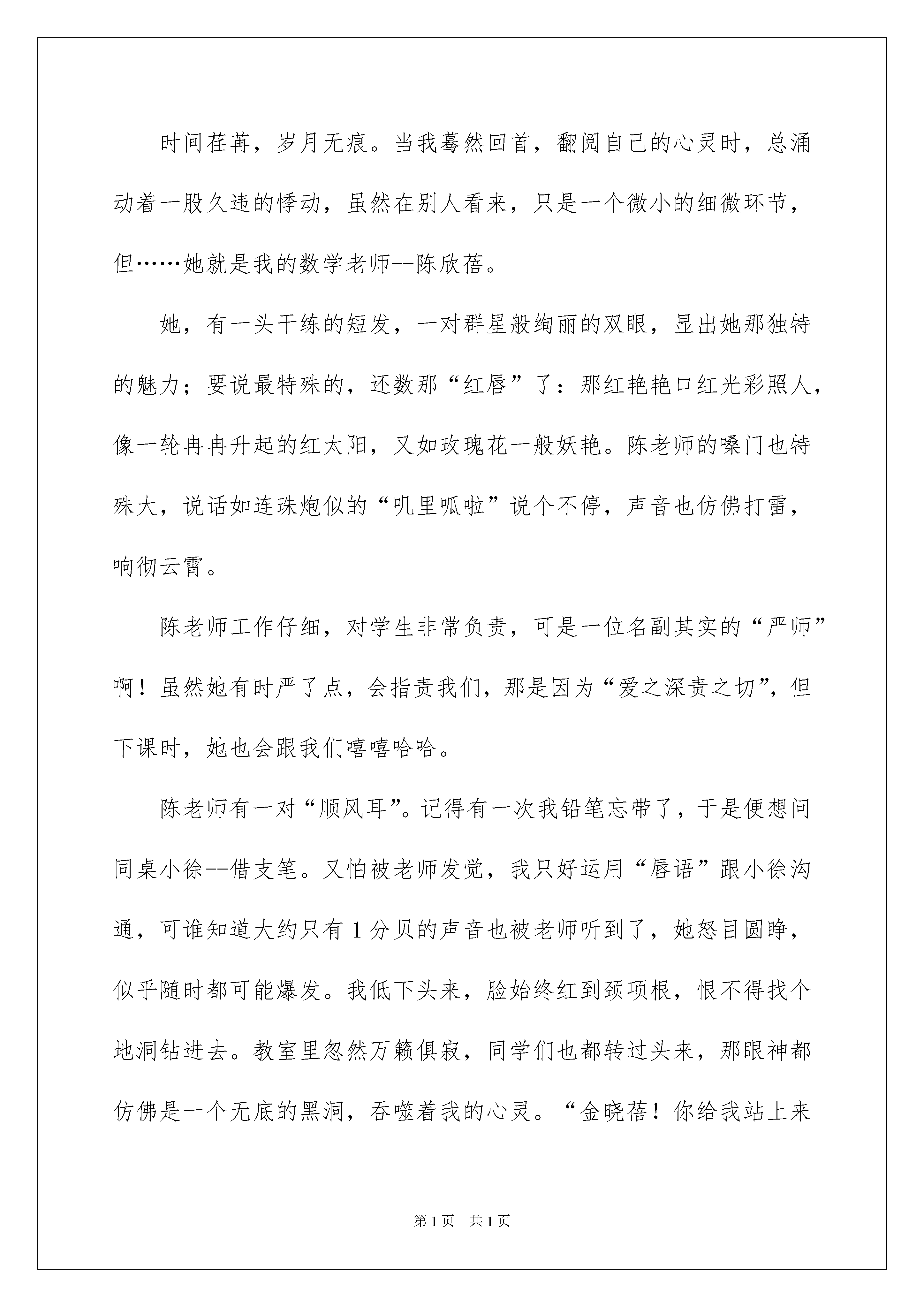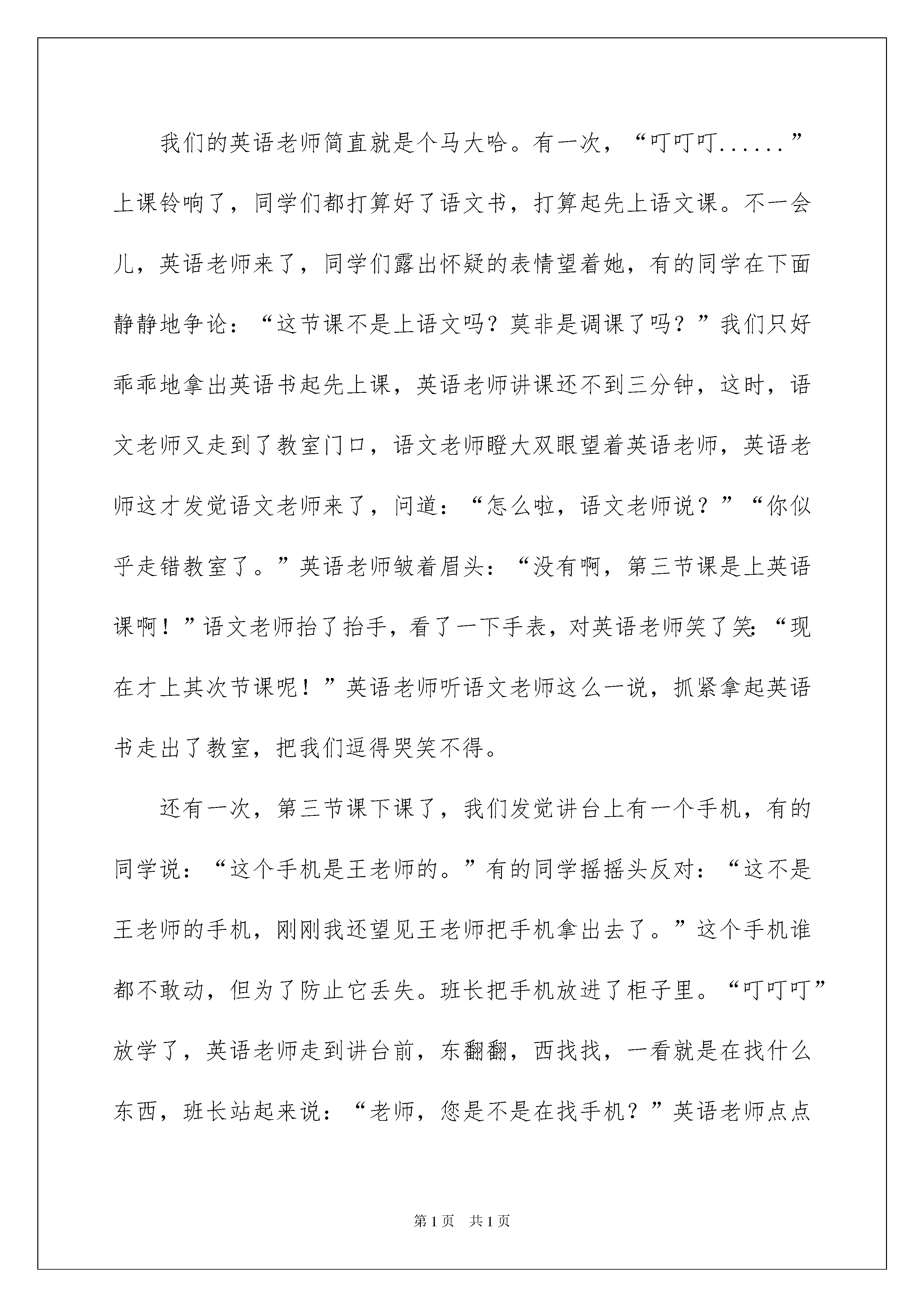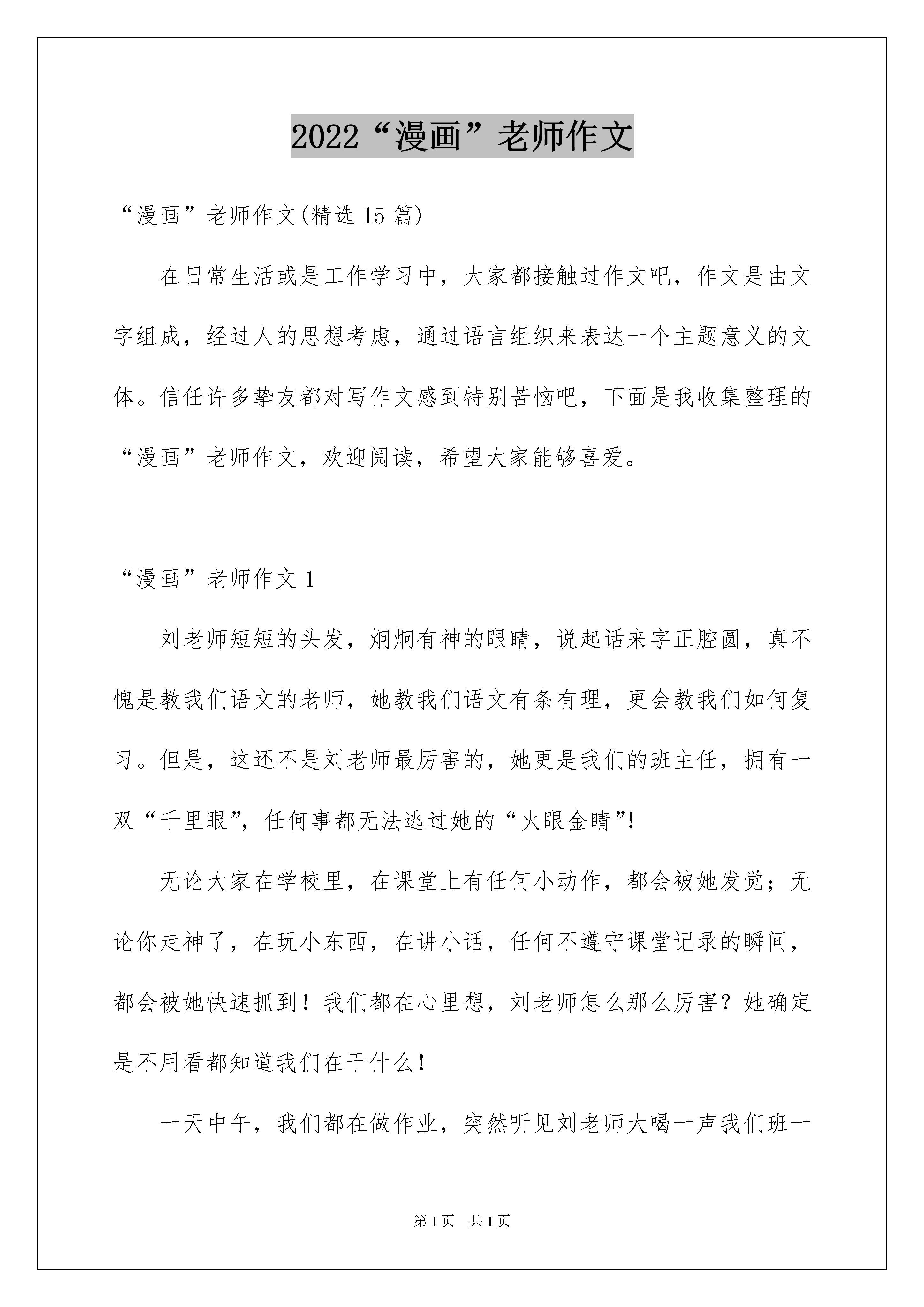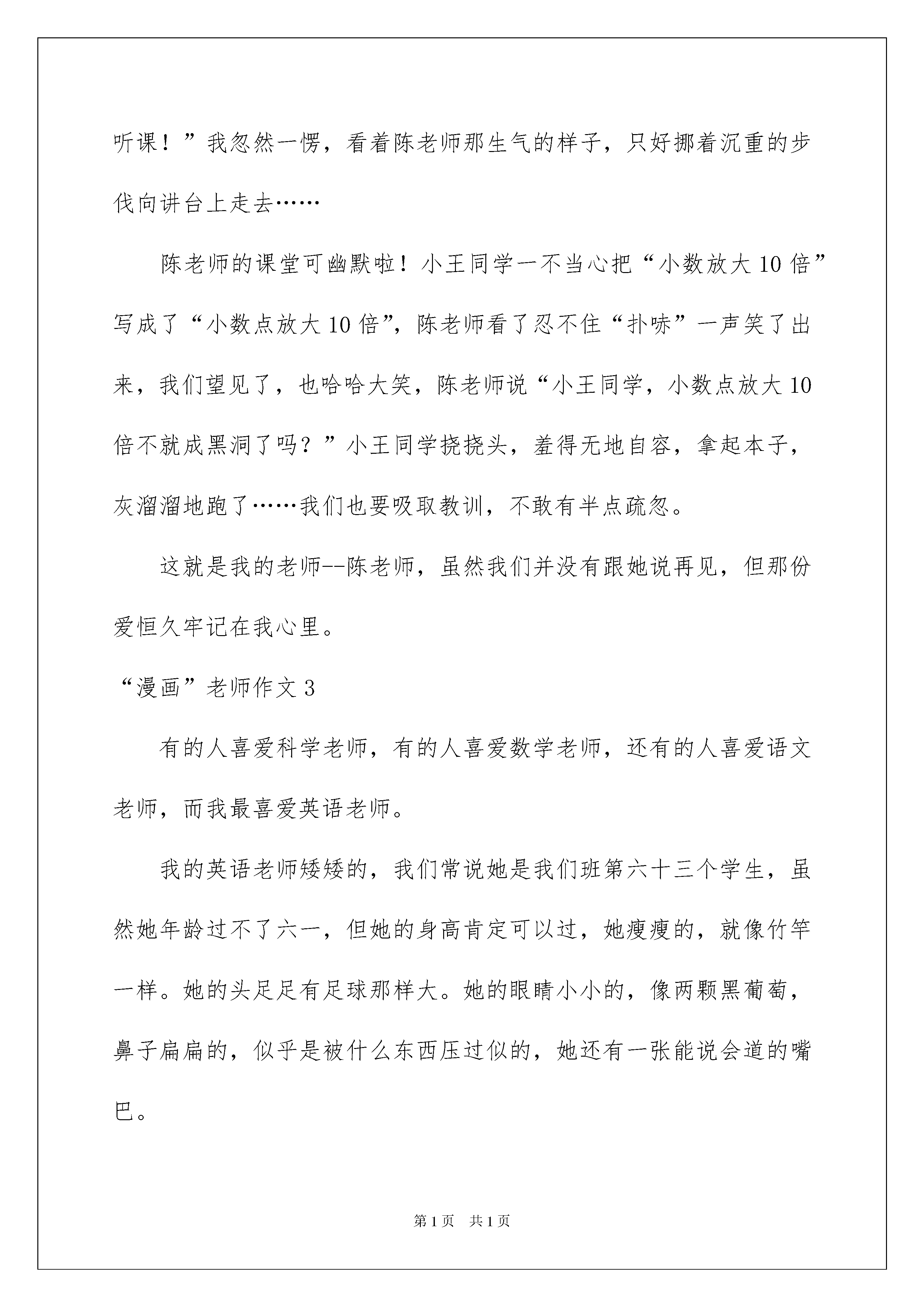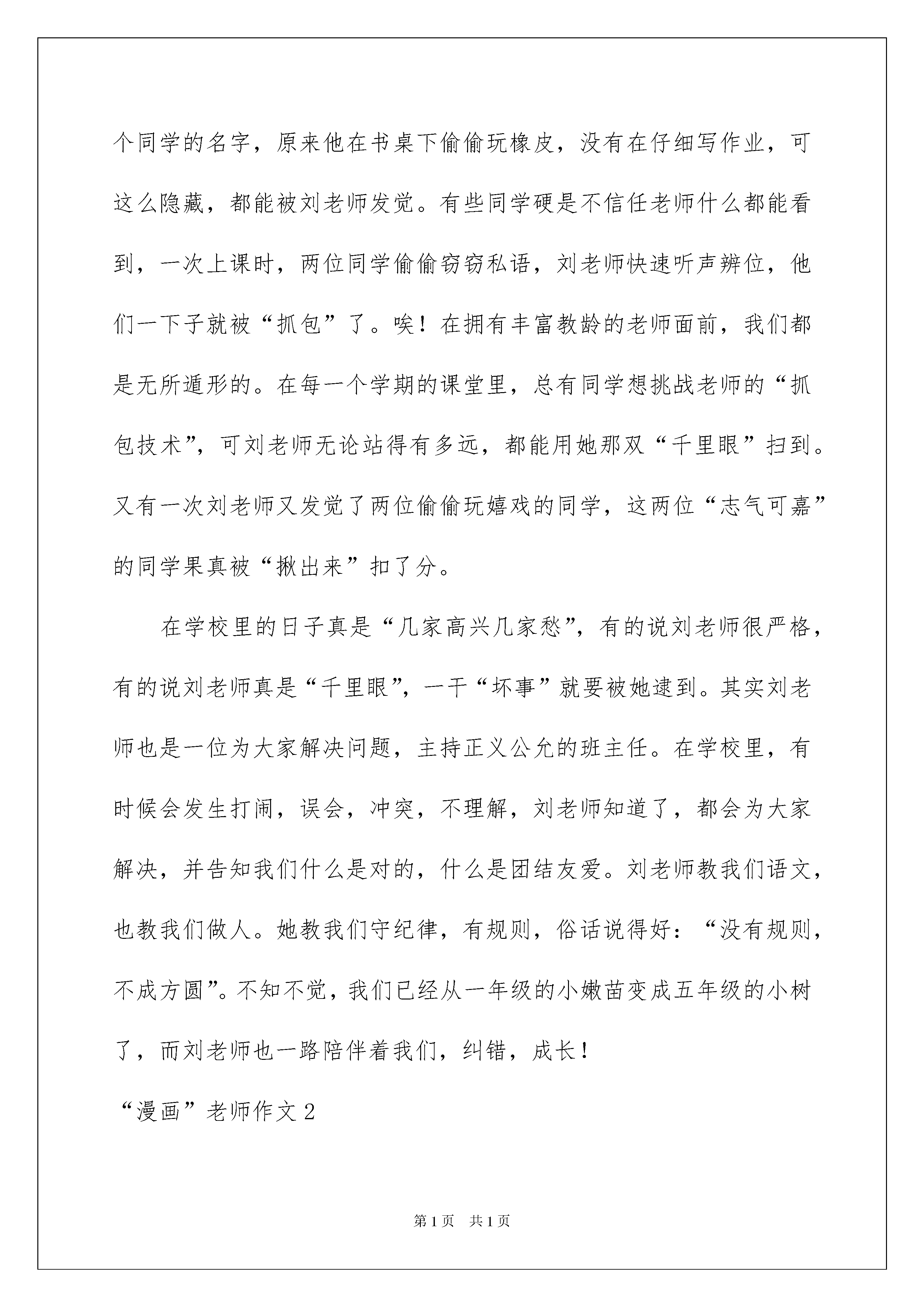 2022“漫画”老师作文“漫画”老师作文(精选15篇)在日常生活或是工作学习中,大家都接触过作文吧,作文是由文字组成,经过人的思想考虑,通过语言组织来表达一个主题意义的文体。信任许多挚友都对写作文感到特别苦恼吧,下面是我收集整理的“漫画”老师作文,欢迎阅读,希望大家能够喜爱。“漫画”老师作文1刘老师短短的头发,炯炯有神的眼睛,说起话来字正腔圆,真不愧是教我们语文的老师,她教我们语文有条有理,更会教我们如何复习。但是,这还不是刘老师最厉害的,她更是我们的班主任,拥有一双“千里眼”,任何事都无法逃过她的“火眼金睛”!无论大家在学校里,在课堂上有任何小动作,都会被她发觉;无论你走神了,在玩小东西,在讲小话,任何不遵守课堂记录的瞬间,都会被她快速抓到!我们都在心里想,刘老师怎么那么厉害?她确定是不用看都知道我们在干什么!一天中午,我们都在做作业,突然听见刘老师大喝一声我们班一个同学的名字,原来他在书桌下偷偷玩橡皮,没有在仔细写作业,可这么隐藏,都能被刘老师发觉。有些同学硬是不信任老师什么都能看到,一次上课时,两位同学偷偷窃窃私语,刘老师快速听声辨位,他们一下子就被“抓包”了。唉!在拥有丰富教龄的老师面前,我们都是无所遁形的。在每一个学期的课堂里,总有同学想挑战老师的“抓包技术”,可刘老师无论站得有多远,都能用她那双“千里眼”扫到。又有一次刘老师又发觉了两位偷偷玩嬉戏的同学,这两位“志气可嘉”的同学果真被“揪出来”扣了分。在学校里的日子真是“几家高兴几家愁”,有的说刘老师很严格,有的说刘老师真是“千里眼”,一干“坏事”就要被她逮到。其实刘老师也是一位为大家解决问题,主持正义公允的班主任。在学校里,有时候会发生打闹,误会,冲突,不理解,刘老师知道了,都会为大家解决,并告知我们什么是对的,什么是团结友爱。刘老师教我们语文,也教我们做人。她教我们守纪律,有规则,俗话说得好:“没有规则,不成方圆”。不知不觉,我们已经从一年级的小嫩苗变成五年级的小树了,而刘老师也一路陪伴着我们,纠错,成长!“漫画”老师作文2时间荏苒,岁月无痕。当我蓦然回首,翻阅自己的心灵时,总涌动着一股久违的悸动,虽然在别人看来,只是一个微小的细微环节,但……她就是我的数学老师--陈欣蓓。她,有一头干练的短发,一对群星般绚丽的双眼,显出她那独特的魅力;要说最特殊的,还数那“红唇”了:那红艳艳口红光彩照人,像一轮冉冉升起的红太阳,又如玫瑰花一般妖艳。陈老师的嗓门也特殊大,说话如连珠炮似的“叽里呱啦”说个不停,声音也仿佛打雷,响彻云霄。陈老师工作仔细,对学生非常负责,可是一位名副其实的“严师”啊!虽然她有时严了点,会指责我们,那是因为“爱之深责之切”,但下课时,她也会跟我们嘻嘻哈哈。陈老师有一对“顺风耳”。记得有一次我铅笔忘带了,于是便想问同桌小徐--借支笔。又怕被老师发觉,我只好运用“唇语”跟小徐沟通,可谁知道大约只有1分贝的声音也被老师听到了,她怒目圆睁,似乎随时都可能爆发。我低下头来,脸始终红到颈项根,恨不得找个地洞钻进去。教室里忽然万籁俱寂,同学们也都转过头来,那眼神都仿佛是一个无底的黑洞,吞噬着我的心灵。“金晓蓓!你给我站上来听课!”我忽然一愣,看着陈老师那生气的样子,只好挪着沉重的步伐向讲台上走去……陈老师的课堂可幽默啦!小王同学一不当心把“小数放大10倍”写成了“小数点放大10倍”,陈老师看了忍不住“扑哧”一声笑了出来,我们望见了,也哈哈大笑,陈老师说“小王同学,小数点放大10倍不就成黑洞了吗?”小王同学挠挠头,羞得无地自容,拿起本子,灰溜溜地跑了……我们也要吸取教训,不敢有半点疏忽。这就是我的老师--陈老师,虽然我们并没有跟她说再见,但那份爱恒久牢记在我心里。“漫画”老师作文3有的人喜爱科学老师,有的人喜爱数学老师,还有的人喜爱语文老师,而我最喜爱英语老师。我的英语老师矮矮的,我们常说她是我们班第六十三个学生,虽然她年龄过不了六一,但她的身高肯定可以过,她瘦瘦的,就像竹竿一样。她的头足足有足球那样大。她的眼睛小小的,像两颗黑葡萄,鼻子扁扁的,似乎是被什么东西压过似的,她还有一张能说会道的嘴巴。我们的英语老师简直就是个马大哈。有一次,“叮叮叮......”上课铃响了,同学们都打算好了语文书,打算起先上语文课。不一会儿,英语老师来了,同学们露出怀疑的表情望着她,有的同学在下面静静地争论:“这节课不是上语文吗?莫非是调课了吗?”我们只好乖乖地拿出英语书起先上课,英语老师讲课还不到三分钟,这时,语文老师又走到了教室门口,语文老师瞪大双眼望着英语老师,英语老师这才发觉语文老师来了,问道:“怎么啦,语文老师说?”“你似乎走