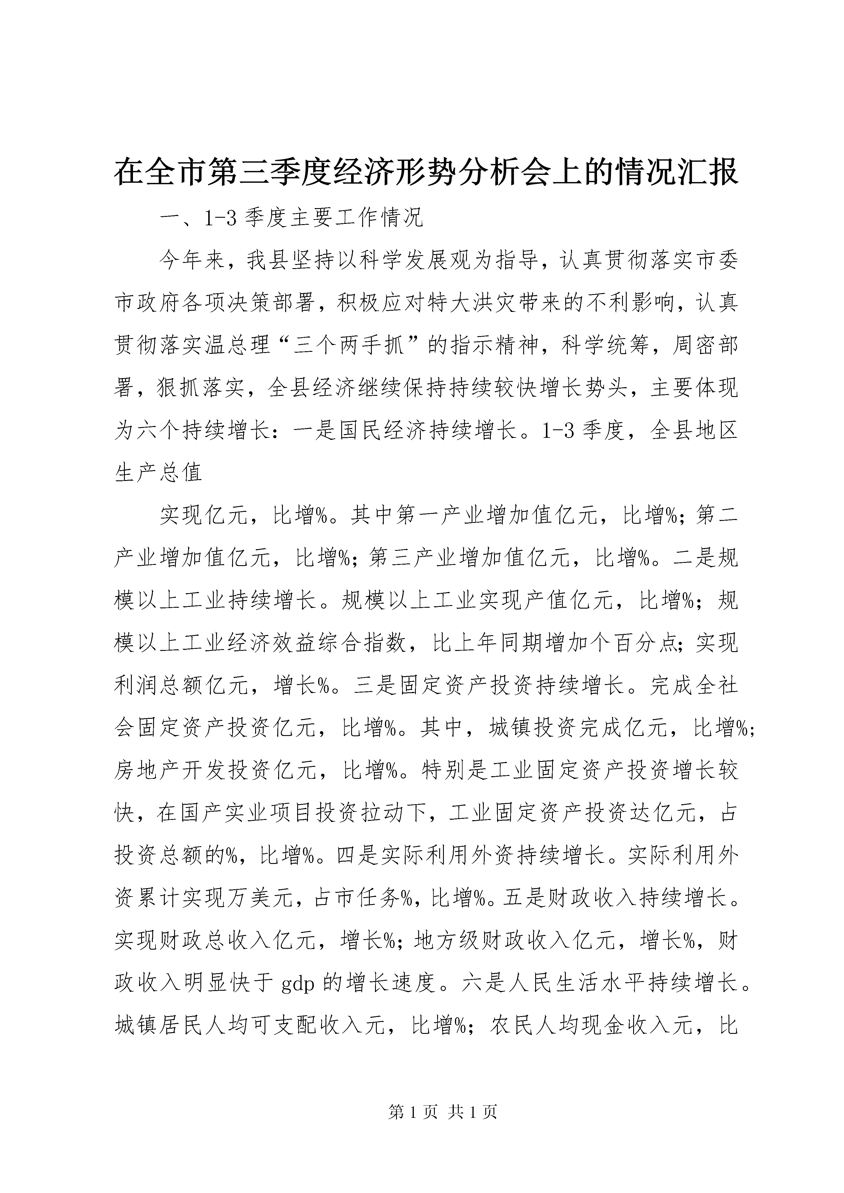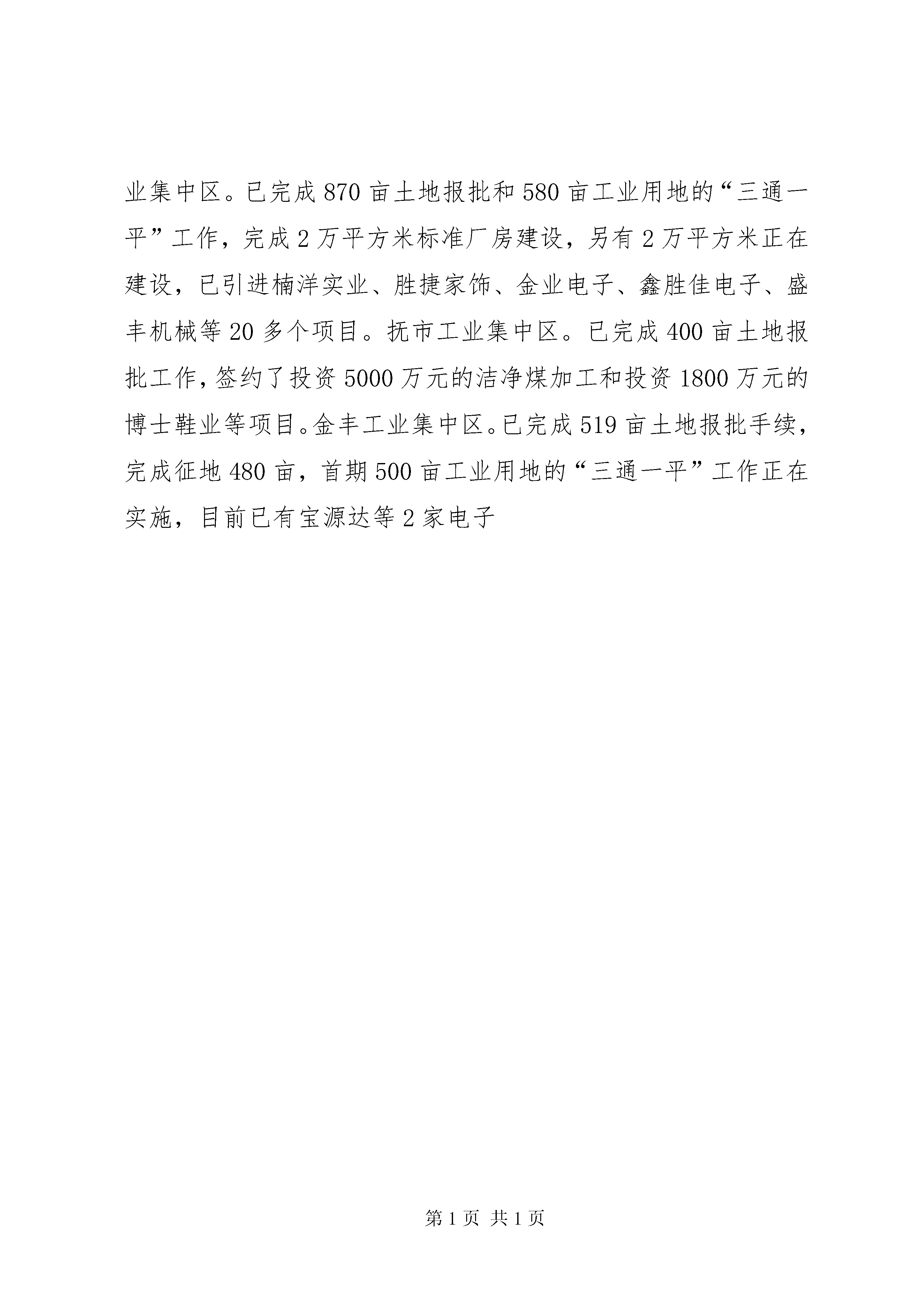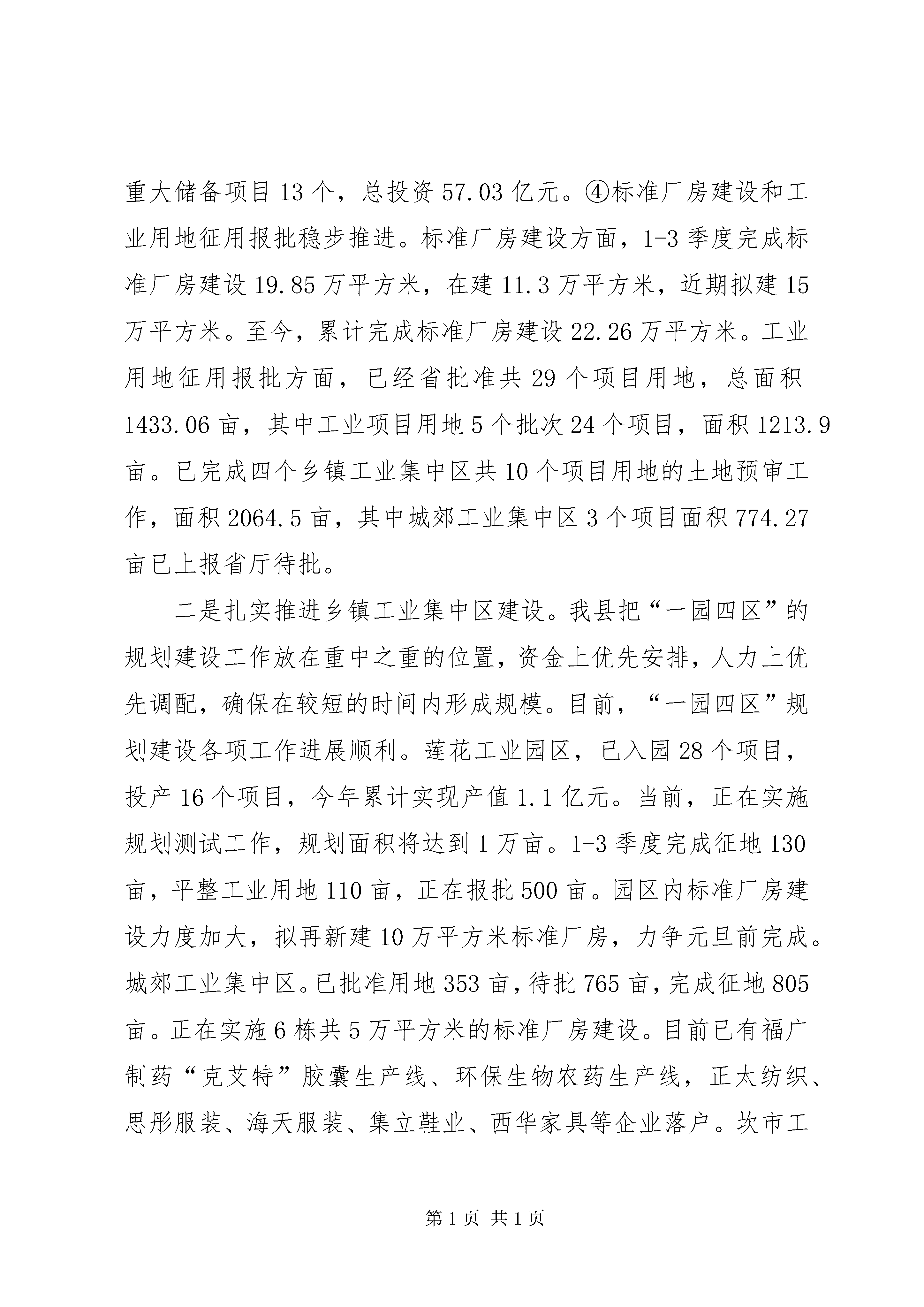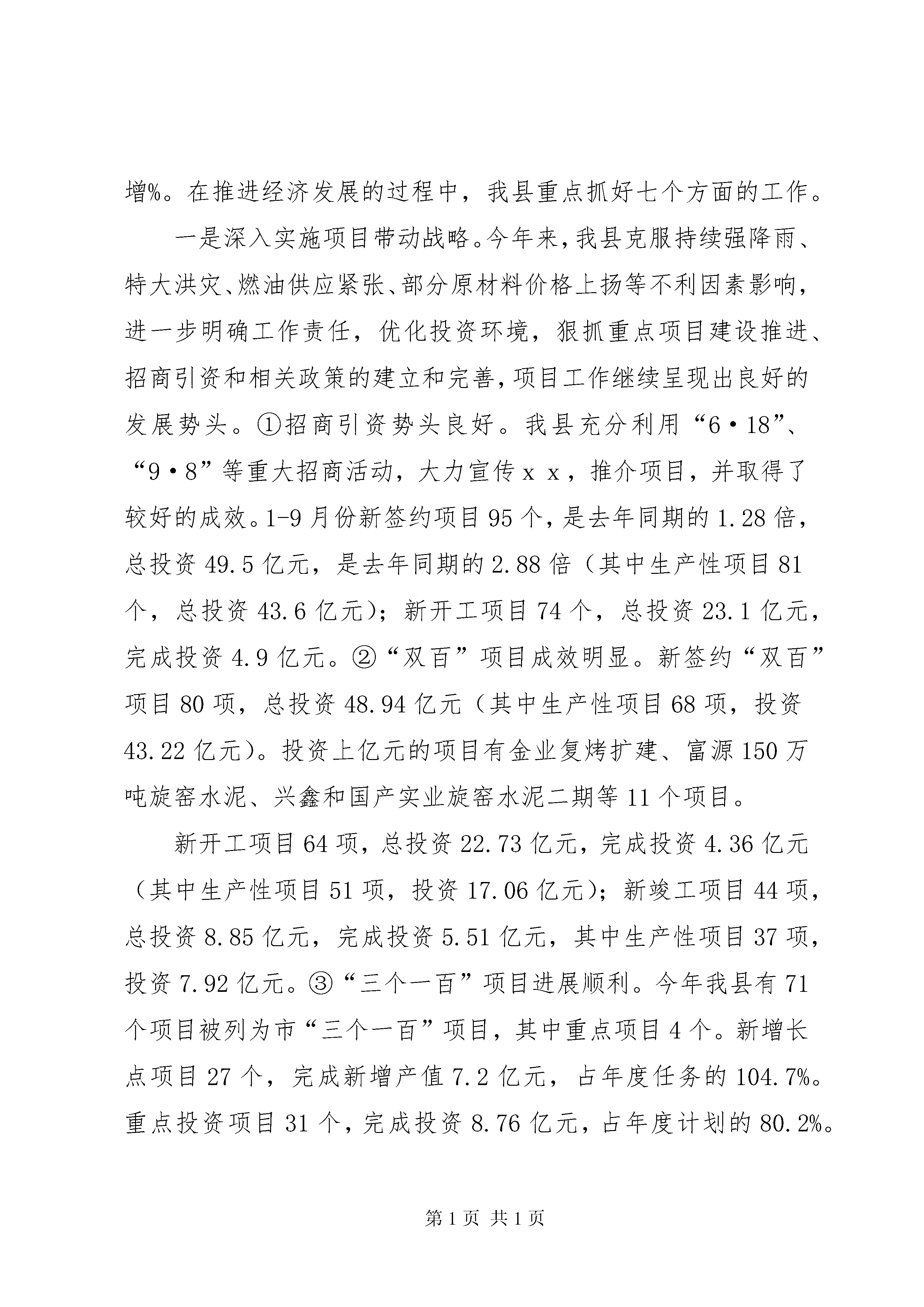 在全市第三季度经济形势分析会上的情况汇报一、1-3季度主要工作情况今年来,我县坚持以科学发展观为指导,认真贯彻落实市委市政府各项决策部署,积极应对特大洪灾带来的不利影响,认真贯彻落实温总理“三个两手抓”的指示精神,科学统筹,周密部署,狠抓落实,全县经济继续保持持续较快增长势头,主要体现为六个持续增长:一是国民经济持续增长。1-3季度,全县地区生产总值实现亿元,比增%。其中第一产业增加值亿元,比增%;第二产业增加值亿元,比增%;第三产业增加值亿元,比增%。二是规模以上工业持续增长。规模以上工业实现产值亿元,比增%;规模以上工业经济效益综合指数,比上年同期增加个百分点;实现利润总额亿元,增长%。三是固定资产投资持续增长。完成全社会固定资产投资亿元,比增%。其中,城镇投资完成亿元,比增%;房地产开发投资亿元,比增%。特别是工业固定资产投资增长较快,在国产实业项目投资拉动下,工业固定资产投资达亿元,占投资总额的%,比增%。四是实际利用外资持续增长。实际利用外资累计实现万美元,占市任务%,比增%。五是财政收入持续增长。实现财政总收入亿元,增长%;地方级财政收入亿元,增长%,财政收入明显快于gdp的增长速度。六是人民生活水平持续增长。城镇居民人均可支配收入元,比增%;农民人均现金收入元,比增%。在推进经济发展的过程中,我县重点抓好七个方面的工作。一是深入实施项目带动战略。今年来,我县克服持续强降雨、特大洪灾、燃油供应紧张、部分原材料价格上扬等不利因素影响,进一步明确工作责任,优化投资环境,狠抓重点项目建设推进、招商引资和相关政策的建立和完善,项目工作继续呈现出良好的发展势头。①招商引资势头良好。我县充分利用“6·18”、“9·8”等重大招商活动,大力宣传xx,推介项目,并取得了较好的成效。1-9月份新签约项目95个,是去年同期的1.28倍,总投资49.5亿元,是去年同期的2.88倍(其中生产性项目81个,总投资43.6亿元);新开工项目74个,总投资23.1亿元,完成投资4.9亿元。②“双百”项目成效明显。新签约“双百”项目80项,总投资48.94亿元(其中生产性项目68项,投资43.22亿元)。投资上亿元的项目有金业复烤扩建、富源150万吨旋窑水泥、兴鑫和国产实业旋窑水泥二期等11个项目。新开工项目64项,总投资22.73亿元,完成投资4.36亿元(其中生产性项目51项,投资17.06亿元);新竣工项目44项,总投资8.85亿元,完成投资5.51亿元,其中生产性项目37项,投资7.92亿元。③“三个一百”项目进展顺利。今年我县有71个项目被列为市“三个一百”项目,其中重点项目4个。新增长点项目27个,完成新增产值7.2亿元,占年度任务的104.7%。重点投资项目31个,完成投资8.76亿元,占年度计划的80.2%。重大储备项目13个,总投资57.03亿元。④标准厂房建设和工业用地征用报批稳步推进。标准厂房建设方面,1-3季度完成标准厂房建设19.85万平方米,在建11.3万平方米,近期拟建15万平方米。至今,累计完成标准厂房建设22.26万平方米。工业用地征用报批方面,已经省批准共29个项目用地,总面积1433.06亩,其中工业项目用地5个批次24个项目,面积1213.9亩。已完成四个乡镇工业集中区共10个项目用地的土地预审工作,面积2064.5亩,其中城郊工业集中区3个项目面积774.27亩已上报省厅待批。二是扎实推进乡镇工业集中区建设。我县把“一园四区”的规划建设工作放在重中之重的位置,资金上优先安排,人力上优先调配,确保在较短的时间内形成规模。目前,“一园四区”规划建设各项工作进展顺利。莲花工业园区,已入园28个项目,投产16个项目,今年累计实现产值1.1亿元。当前,正在实施规划测试工作,规划面积将达到1万亩。1-3季度完成征地130亩,平整工业用地110亩,正在报批500亩。园区内标准厂房建设力度加大,拟再新建10万平方米标准厂房,力争元旦前完成。城郊工业集中区。已批准用地353亩,待批765亩,完成征地805亩。正在实施6栋共5万平方米的标准厂房建设。目前已有福广制药“克艾特”胶囊生产线、环保生物农药生产线,正太纺织、思彤服装、海天服装、集立鞋业、西华家具等企业落户。坎市工业集中区。已完成870亩土地报批和580亩工业用地的“三通一平”工作,完成2万平方米标准厂房建设,另有2万平方米正在建设,已引进楠洋实业、胜捷家饰、金业电子、鑫胜佳电子、盛丰机械等20多个项目。抚市工业集中区。已完成400亩土地报批工作,签约了投资5000万元的洁净煤加工和投资1800万元的博士鞋业等项目。金丰工业集中区。已完成519亩土地报批手续,完成征地480亩,首期500亩工业用地的“三通一平”工作正在实施,目前已有宝源达等2