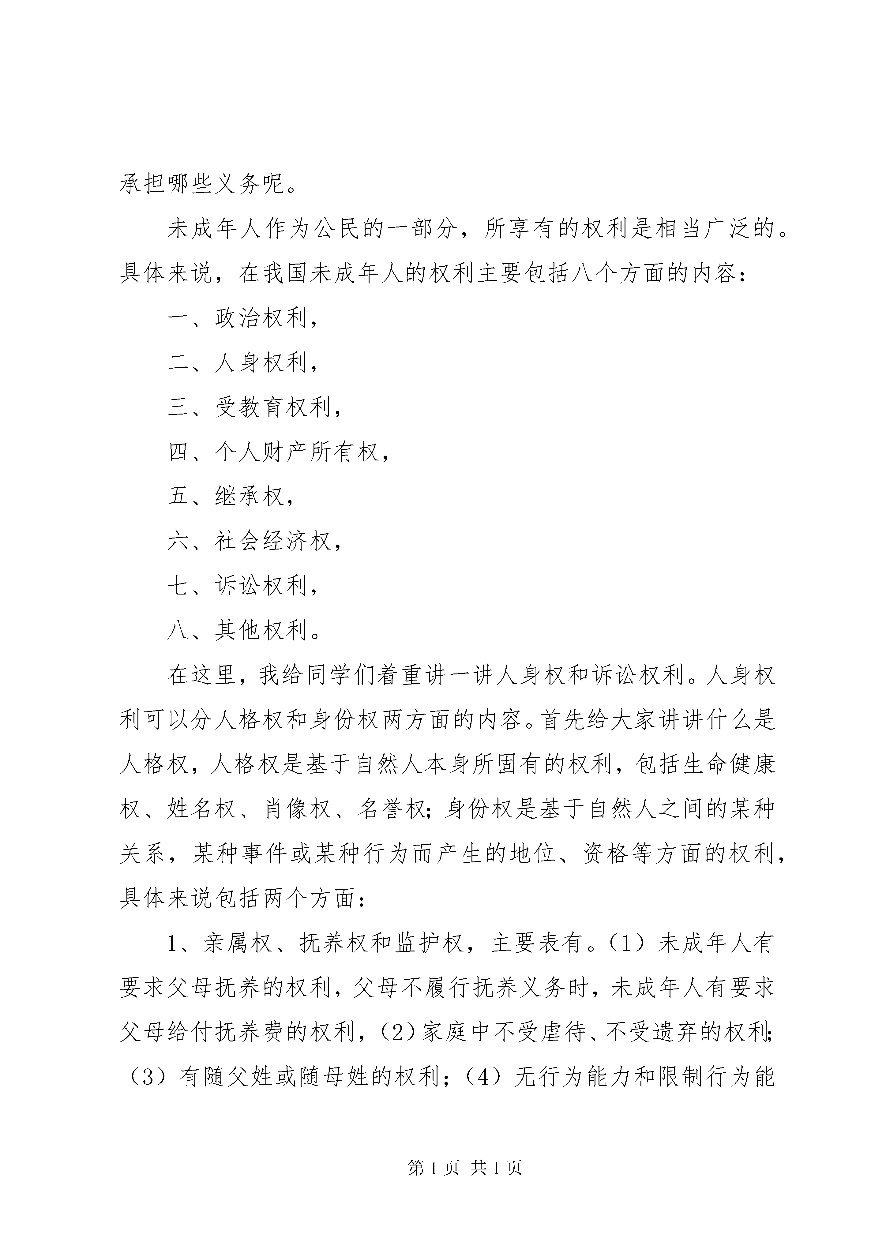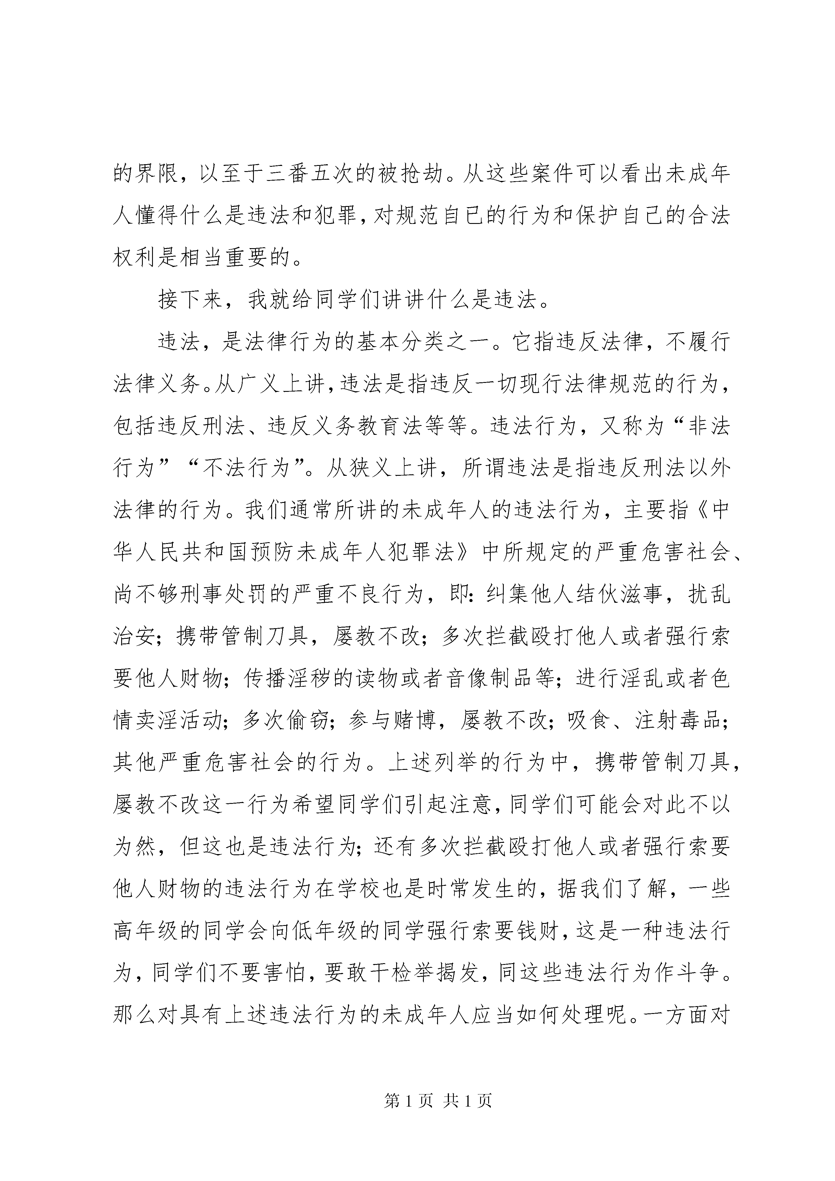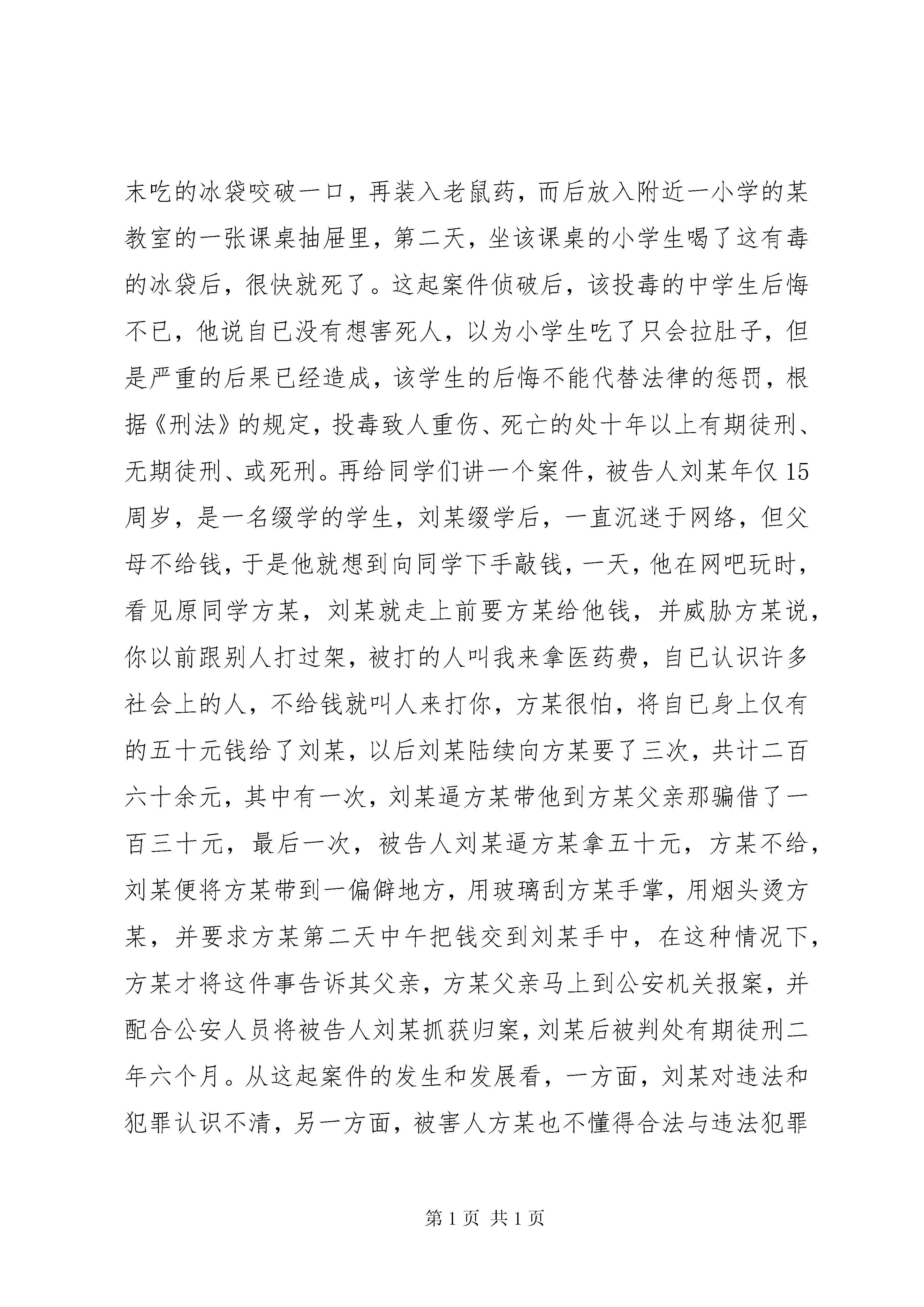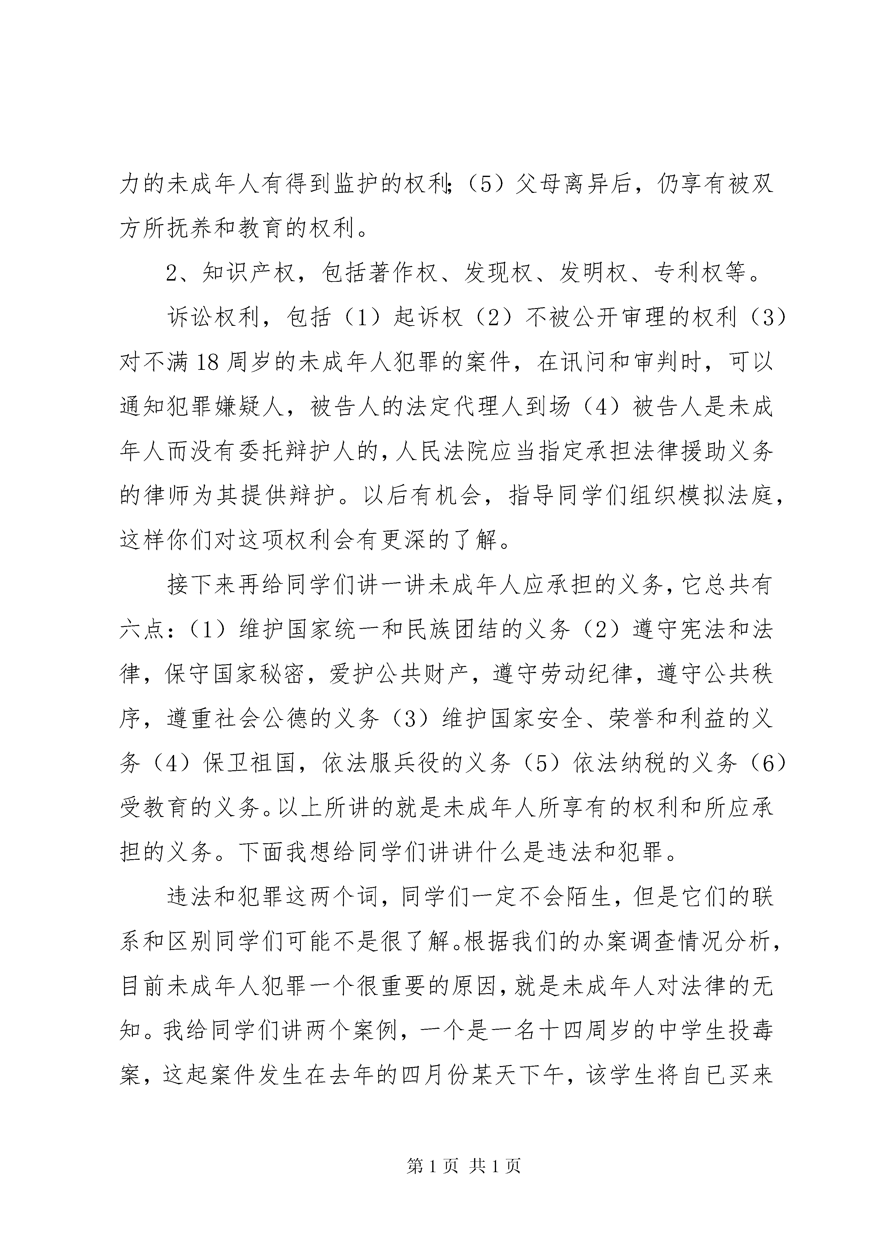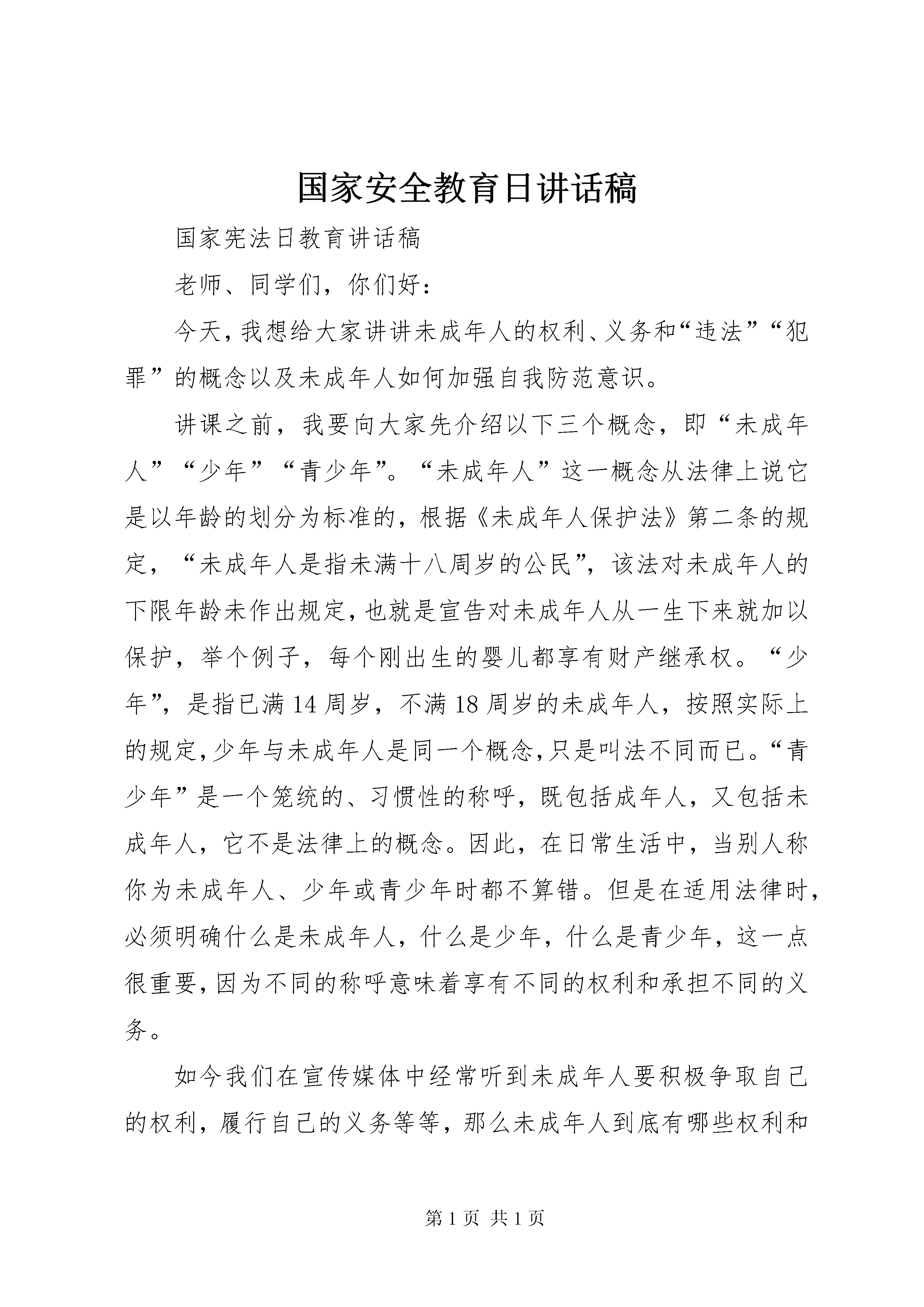 国家安全教育日讲话稿国家宪法日教育讲话稿老师、同学们,你们好:今天,我想给大家讲讲未成年人的权利、义务和“违法”“犯罪”的概念以及未成年人如何加强自我防范意识。讲课之前,我要向大家先介绍以下三个概念,即“未成年人”“少年”“青少年”。“未成年人”这一概念从法律上说它是以年龄的划分为标准的,根据《未成年人保护法》第二条的规定,“未成年人是指未满十八周岁的公民”,该法对未成年人的下限年龄未作出规定,也就是宣告对未成年人从一生下来就加以保护,举个例子,每个刚出生的婴儿都享有财产继承权。“少年”,是指已满14周岁,不满18周岁的未成年人,按照实际上的规定,少年与未成年人是同一个概念,只是叫法不同而已。“青少年”是一个笼统的、习惯性的称呼,既包括成年人,又包括未成年人,它不是法律上的概念。因此,在日常生活中,当别人称你为未成年人、少年或青少年时都不算错。但是在适用法律时,必须明确什么是未成年人,什么是少年,什么是青少年,这一点很重要,因为不同的称呼意味着享有不同的权利和承担不同的义务。如今我们在宣传媒体中经常听到未成年人要积极争取自己的权利,履行自己的义务等等,那么未成年人到底有哪些权利和承担哪些义务呢。未成年人作为公民的一部分,所享有的权利是相当广泛的。具体来说,在我国未成年人的权利主要包括八个方面的内容:一、政治权利,二、人身权利,三、受教育权利,四、个人财产所有权,五、继承权,六、社会经济权,七、诉讼权利,八、其他权利。在这里,我给同学们着重讲一讲人身权和诉讼权利。人身权利可以分人格权和身份权两方面的内容。首先给大家讲讲什么是人格权,人格权是基于自然人本身所固有的权利,包括生命健康权、姓名权、肖像权、名誉权;身份权是基于自然人之间的某种关系,某种事件或某种行为而产生的地位、资格等方面的权利,具体来说包括两个方面:1、亲属权、抚养权和监护权,主要表有。(1)未成年人有要求父母抚养的权利,父母不履行抚养义务时,未成年人有要求父母给付抚养费的权利,(2)家庭中不受虐待、不受遗弃的权利;(3)有随父姓或随母姓的权利;(4)无行为能力和限制行为能力的未成年人有得到监护的权利;(5)父母离异后,仍享有被双方所抚养和教育的权利。2、知识产权,包括著作权、发现权、发明权、专利权等。诉讼权利,包括(1)起诉权(2)不被公开审理的权利(3)对不满18周岁的未成年人犯罪的案件,在讯问和审判时,可以通知犯罪嫌疑人,被告人的法定代理人到场(4)被告人是未成年人而没有委托辩护人的,人民法院应当指定承担法律援助义务的律师为其提供辩护。以后有机会,指导同学们组织模拟法庭,这样你们对这项权利会有更深的了解。接下来再给同学们讲一讲未成年人应承担的义务,它总共有六点:(1)维护国家统一和民族团结的义务(2)遵守宪法和法律,保守国家秘密,爱护公共财产,遵守劳动纪律,遵守公共秩序,遵重社会公德的义务(3)维护国家安全、荣誉和利益的义务(4)保卫祖国,依法服兵役的义务(5)依法纳税的义务(6)受教育的义务。以上所讲的就是未成年人所享有的权利和所应承担的义务。下面我想给同学们讲讲什么是违法和犯罪。违法和犯罪这两个词,同学们一定不会陌生,但是它们的联系和区别同学们可能不是很了解。根据我们的办案调查情况分析,目前未成年人犯罪一个很重要的原因,就是未成年人对法律的无知。我给同学们讲两个案例,一个是一名十四周岁的中学生投毒案,这起案件发生在去年的四月份某天下午,该学生将自已买来末吃的冰袋咬破一口,再装入老鼠药,而后放入附近一小学的某教室的一张课桌抽屉里,第二天,坐该课桌的小学生喝了这有毒的冰袋后,很快就死了。这起案件侦破后,该投毒的中学生后悔不已,他说自已没有想害死人,以为小学生吃了只会拉肚子,但是严重的后果已经造成,该学生的后悔不能代替法律的惩罚,根据《刑法》的规定,投毒致人重伤、死亡的处十年以上有期徒刑、无期徒刑、或死刑。再给同学们讲一个案件,被告人刘某年仅15周岁,是一名缀学的学生,刘某缀学后,一直沉迷于网络,但父母不给钱,于是他就想到向同学下手敲钱,一天,他在网吧玩时,看见原同学方某,刘某就走上前要方某给他钱,并威胁方某说,你以前跟别人打过架,被打的人叫我来拿医药费,自已认识许多社会上的人,不给钱就叫人来打你,方某很怕,将自已身上仅有的五十元钱给了刘某,以后刘某陆续向方某要了三次,共计二百六十余元,其中有一次,刘某逼方某带他到方某父亲那骗借了一百三十元,最后一次,被告人刘某逼方某拿五十元,方某不给,刘某便将方某带到一偏僻地方,用玻璃刮方某手掌,用烟头烫方某,并要求方某第二天中午把钱交到刘某手中,在这种情况下,方某才将这件事告诉其父亲,方某父亲马上到公安机关报案,并配合公安人员将被告人刘某抓获归案,刘某后被判处有期徒刑二年六个月。从这起案件的发生和发展