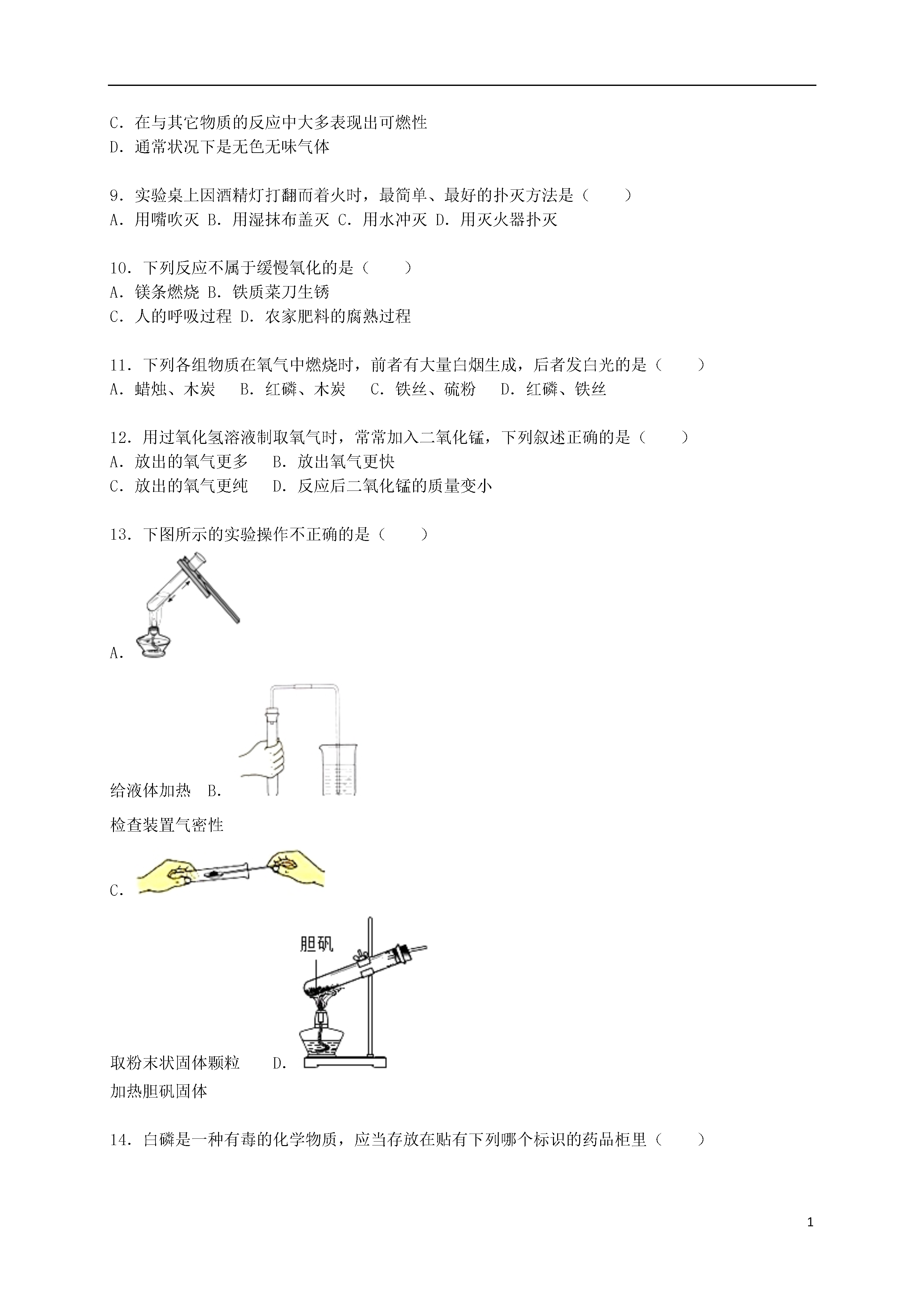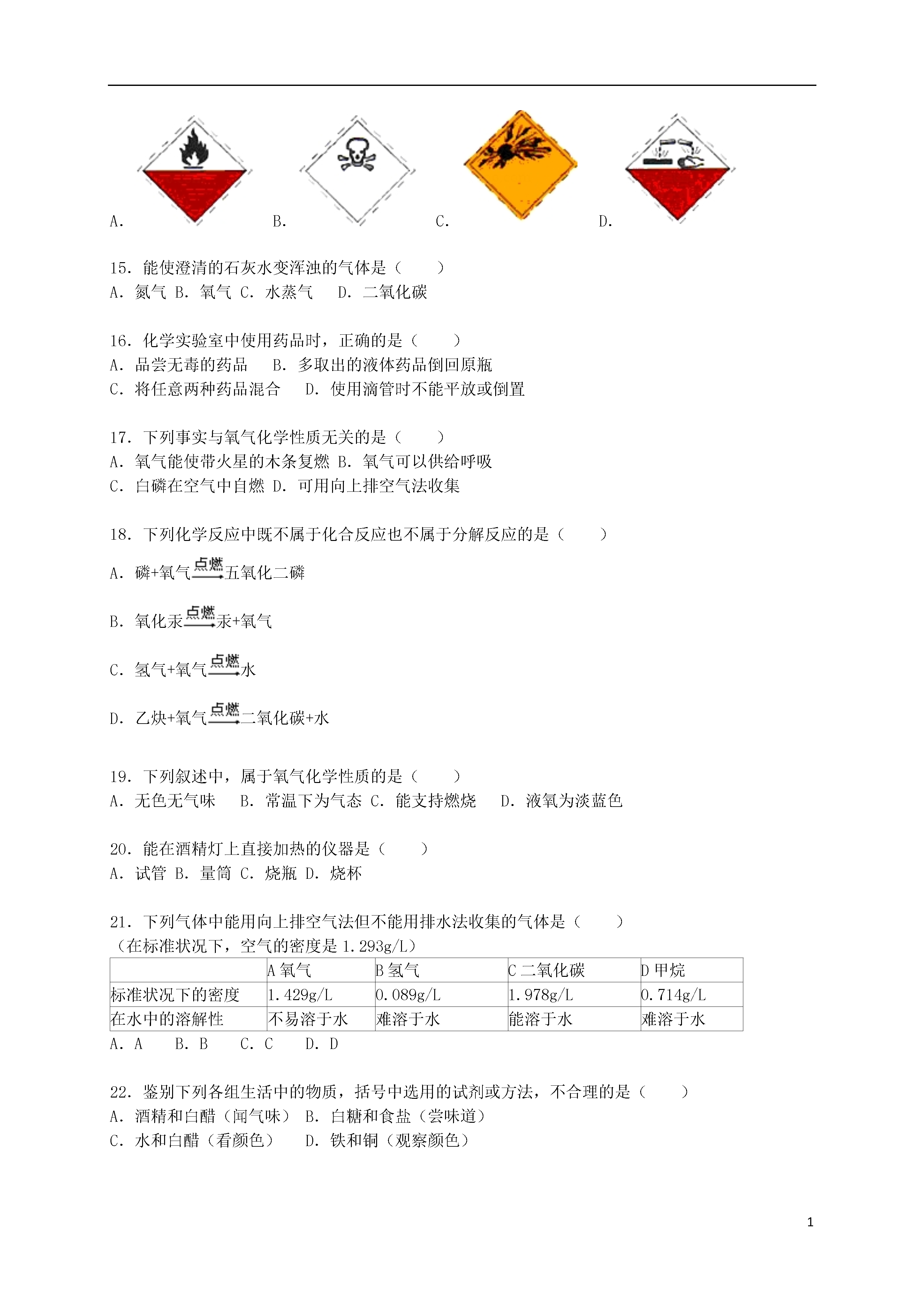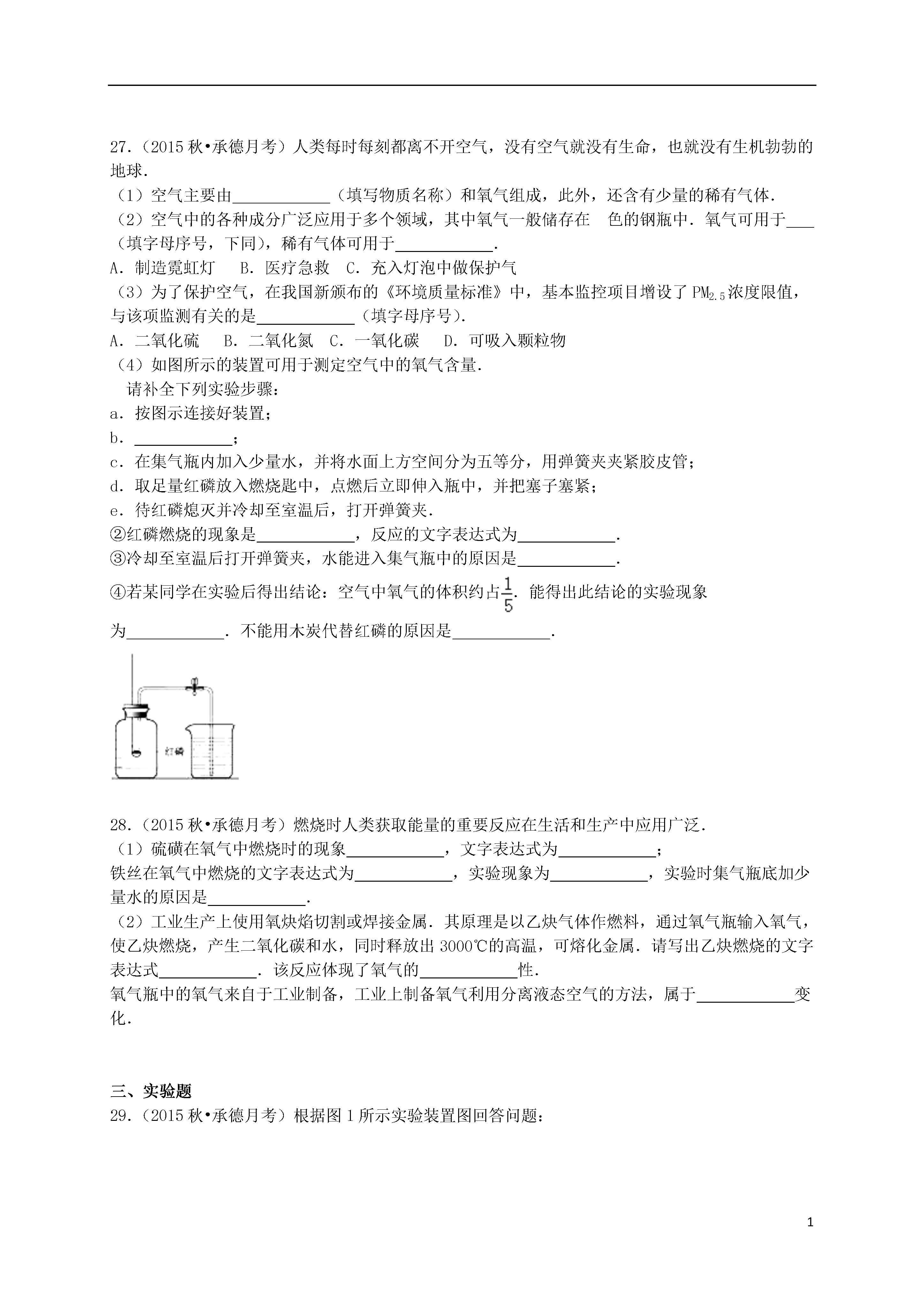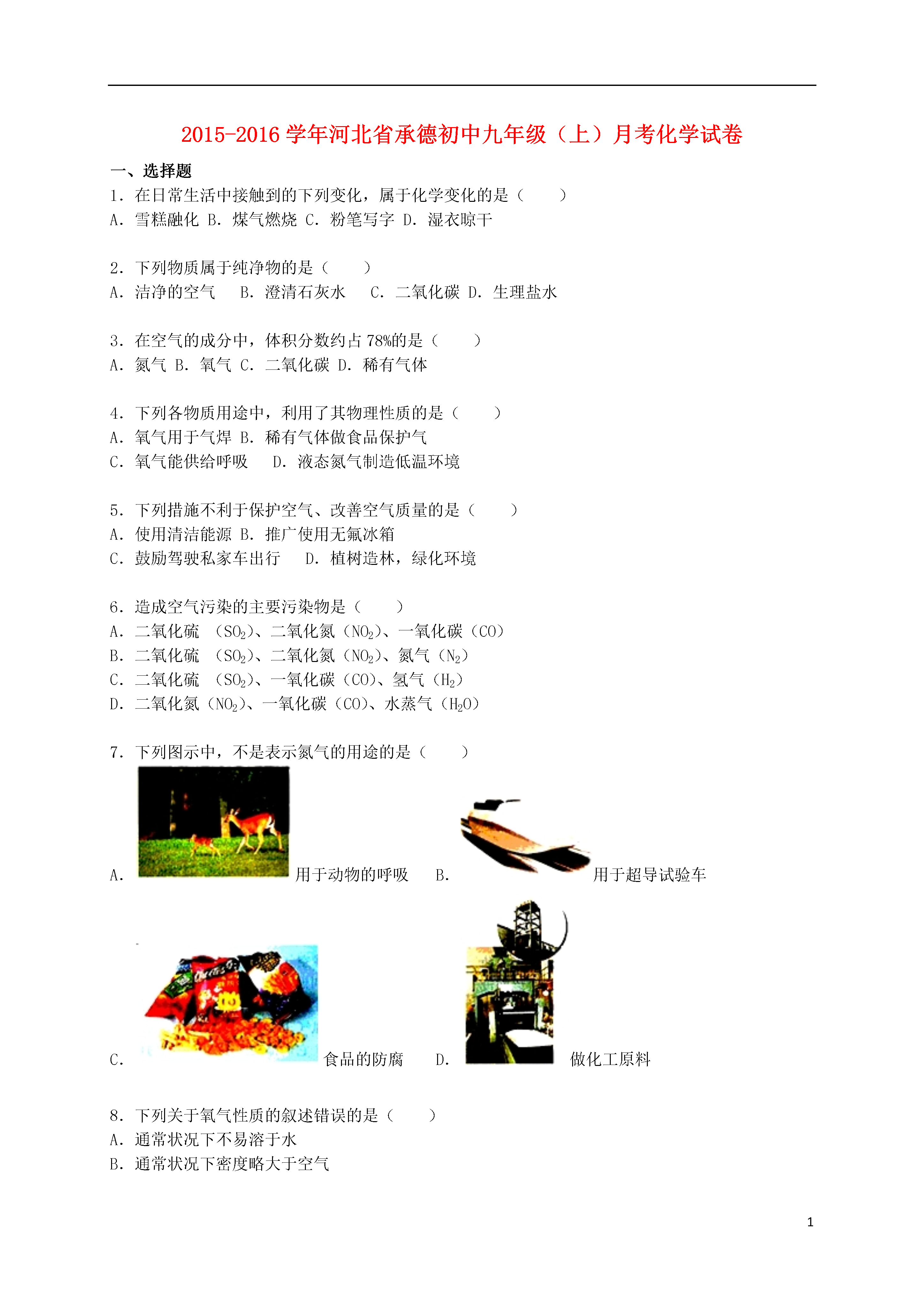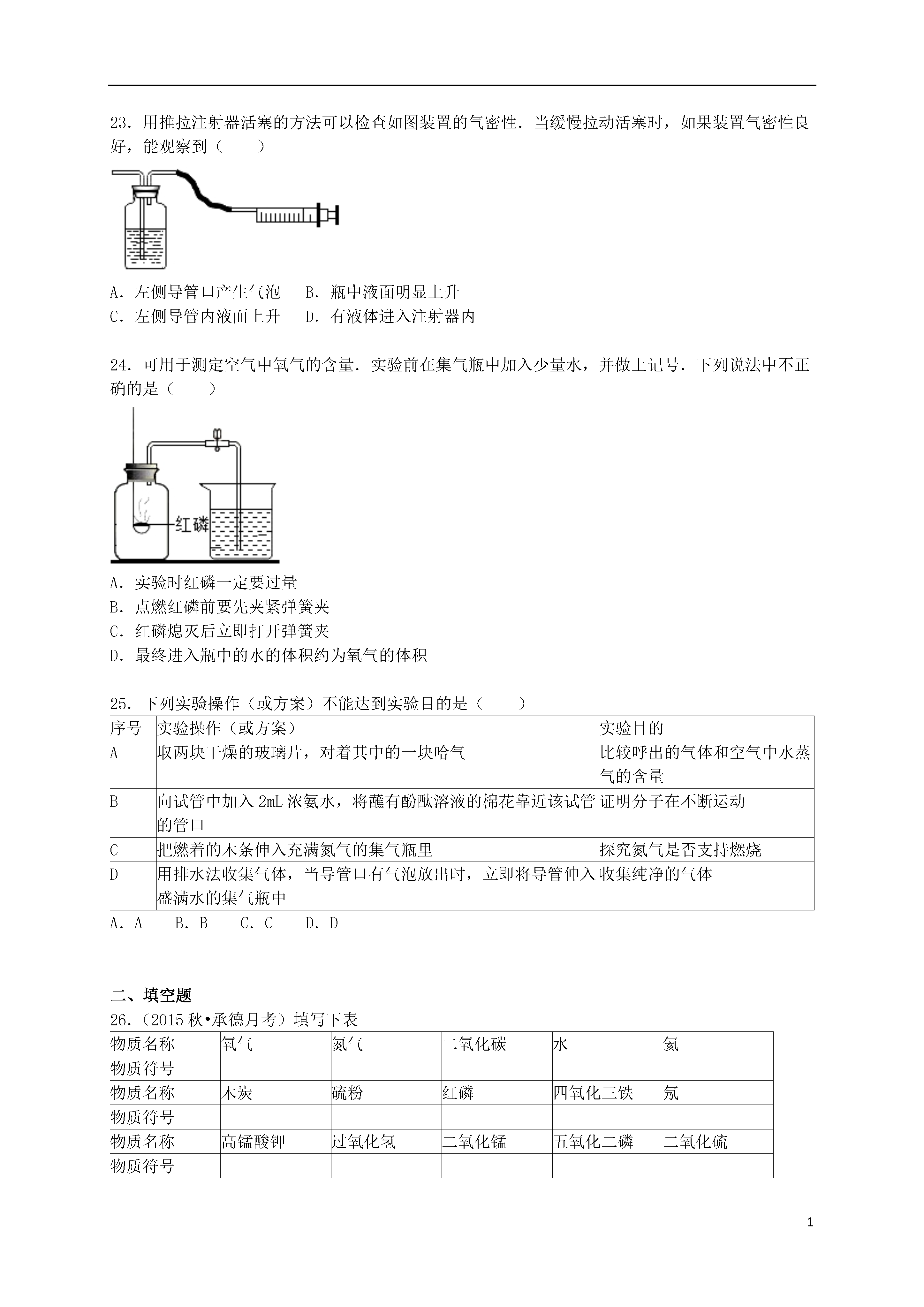 12015-2016学年河北省承德初中九年级(上)月考化学试卷一、选择题1.在日常生活中接触到的下列变化,属于化学变化的是()A.雪糕融化B.煤气燃烧C.粉笔写字D.湿衣晾干2.下列物质属于纯净物的是()A.洁净的空气B.澄清石灰水C.二氧化碳D.生理盐水3.在空气的成分中,体积分数约占78%的是()A.氮气B.氧气C.二氧化碳D.稀有气体4.下列各物质用途中,利用了其物理性质的是()A.氧气用于气焊B.稀有气体做食品保护气C.氧气能供给呼吸D.液态氮气制造低温环境5.下列措施不利于保护空气、改善空气质量的是()A.使用清洁能源B.推广使用无氟冰箱C.鼓励驾驶私家车出行D.植树造林,绿化环境6.造成空气污染的主要污染物是()A.二氧化硫(SO2)、二氧化氮(NO2)、一氧化碳(CO)B.二氧化硫(SO2)、二氧化氮(NO2)、氮气(N2)C.二氧化硫(SO2)、一氧化碳(CO)、氢气(H2)D.二氧化氮(NO2)、一氧化碳(CO)、水蒸气(H2O)7.下列图示中,不是表示氮气的用途的是()A.用于动物的呼吸B.用于超导试验车C.食品的防腐D.做化工原料8.下列关于氧气性质的叙述错误的是()A.通常状况下不易溶于水B.通常状况下密度略大于空气C.在与其它物质的反应中大多表现出可燃性D.通常状况下是无色无味气体9.实验桌上因酒精灯打翻而着火时,最简单、最好的扑灭方法是()A.用嘴吹灭B.用湿抹布盖灭C.用水冲灭D.用灭火器扑灭10.下列反应不属于缓慢氧化的是()A.镁条燃烧B.铁质菜刀生锈C.人的呼吸过程D.农家肥料的腐熟过程11.下列各组物质在氧气中燃烧时,前者有大量白烟生成,后者发白光的是()A.蜡烛、木炭B.红磷、木炭C.铁丝、硫粉D.红磷、铁丝12.用过氧化氢溶液制取氧气时,常常加入二氧化锰,下列叙述正确的是()A.放出的氧气更多B.放出氧气更快C.放出的氧气更纯D.反应后二氧化锰的质量变小13.下图所示的实验操作不正确的是()A.给液体加热B.检查装置气密性C.取粉末状固体颗粒D.加热胆矾固体14.白磷是一种有毒的化学物质,应当存放在贴有下列哪个标识的药品柜里()A.B.C.D.15.能使澄清的石灰水变浑浊的气体是()A.氮气B.氧气C.水蒸气D.二氧化碳16.化学实验室中使用药品时,正确的是()A.品尝无毒的药品B.多取出的液体药品倒回原瓶C.将任意两种药品混合D.使用滴管时不能平放或倒置17.下列事实与氧气化学性质无关的是()A.氧气能使带火星的木条复燃B.氧气可以供给呼吸C.白磷在空气中自燃D.可用向上排空气法收集18.下列化学反应中既不属于化合反应也不属于分解反应的是()A.磷+氧气五氧化二磷B.氧化汞汞+氧气C.氢气+氧气水D.乙炔+氧气二氧化碳+水19.下列叙述中,属于氧气化学性质的是()A.无色无气味B.常温下为气态C.能支持燃烧D.液氧为淡蓝色20.能在酒精灯上直接加热的仪器是()A.试管B.量筒C.烧瓶D.烧杯21.下列气体中能用向上排空气法但不能用排水法收集的气体是()(在标准状况下,空气的密度是1.293g/L)A氧气B氢气C二氧化碳D甲烷标准状况下的密度1.429g/L0.089g/L1.978g/L0.714g/L在水中的溶解性不易溶于水难溶于水能溶于水难溶于水A.AB.BC.CD.D22.鉴别下列各组生活中的物质,括号中选用的试剂或方法,不合理的是()A.酒精和白醋(闻气味)B.白糖和食盐(尝味道)C.水和白醋(看颜色)D.铁和铜(观察颜色)23.用推拉注射器活塞的方法可以检查如图装置的气密性.当缓慢拉动活塞时,如果装置气密性良好,能观察到()A.左侧导管口产生气泡B.瓶中液面明显上升C.左侧导管内液面上升D.有液体进入注射器内24.可用于测定空气中氧气的含量.实验前在集气瓶中加入少量水,并做上记号.下列说法中不正确的是()A.实验时红磷一定要过量B.点燃红磷前要先夹紧弹簧夹C.红磷熄灭后立即打开弹簧夹D.最终进入瓶中的水的体积约为氧气的体积25.下列实验操作(或方案)不能达到实验目的是()序号实验操作(或方案)实验目的A取两块干燥的玻璃片,对着其中的一块哈气比较呼出的气体和空气中水蒸气的含量B向试管中加入2mL浓氨水,将蘸有酚酞溶液的棉花靠近该试管的管口证明分子在不断运动C把燃着的木条伸入充满氮气的集气瓶里探究氮气是否支持燃烧D用排水法收集气体,当导管口有气泡放出时,立即将导管伸入盛满水的集气瓶中收集纯净的气体A.AB.BC.CD.D二、填空题26.(2015秋•