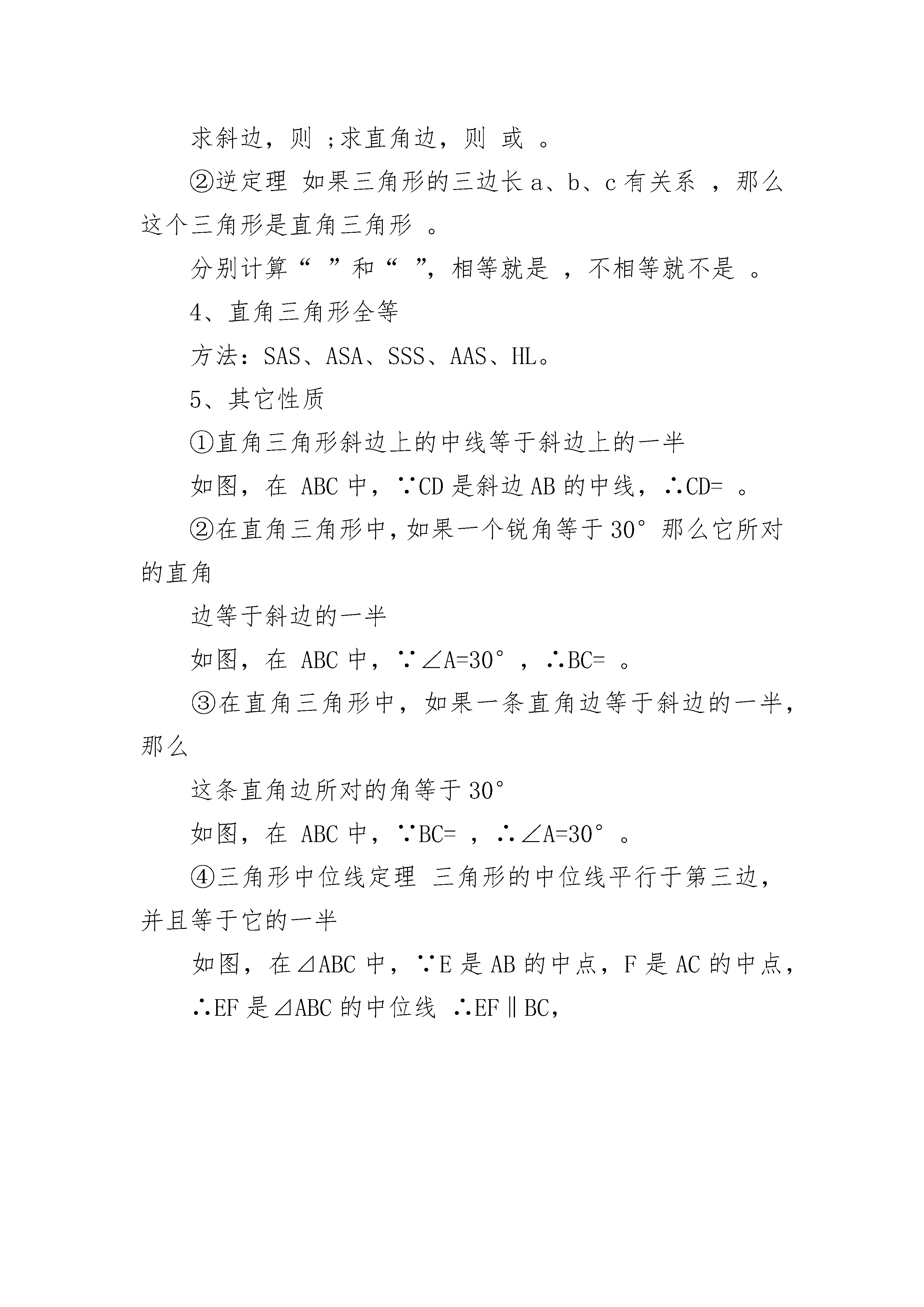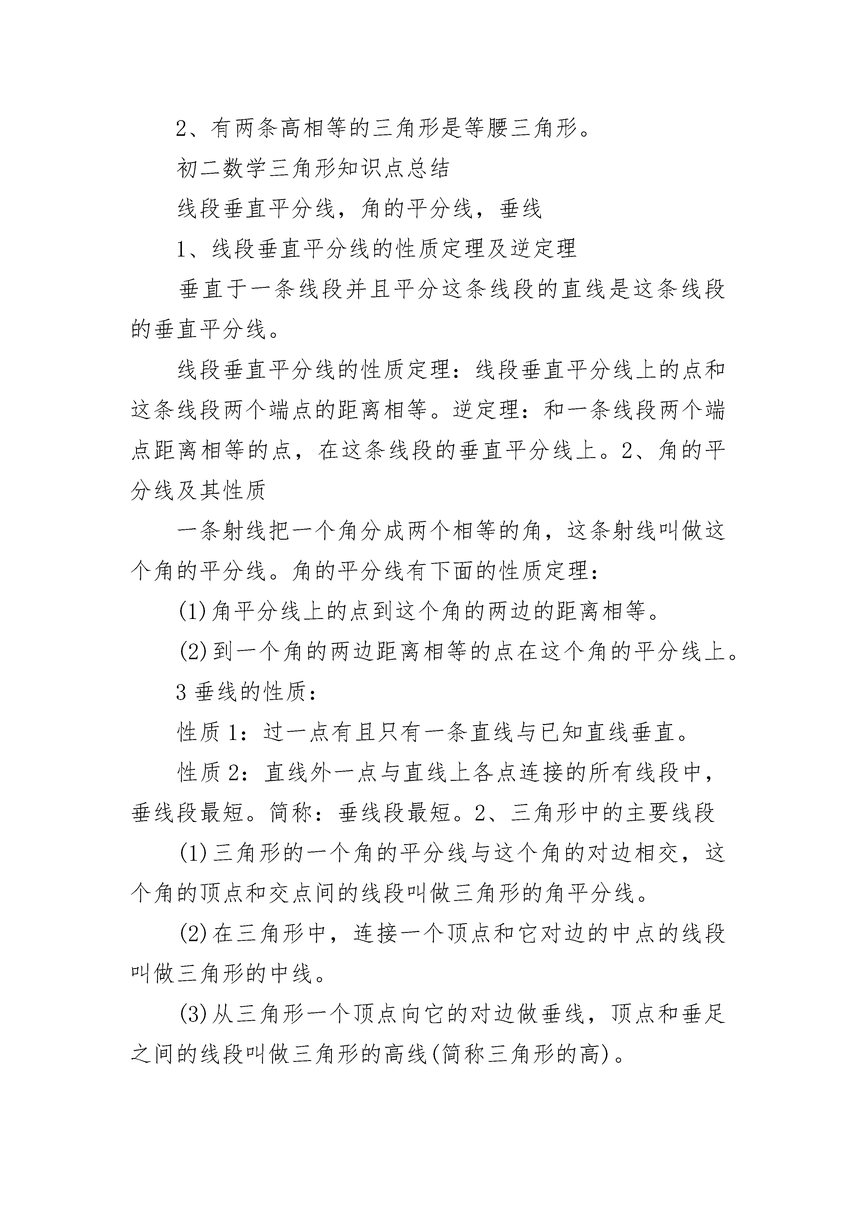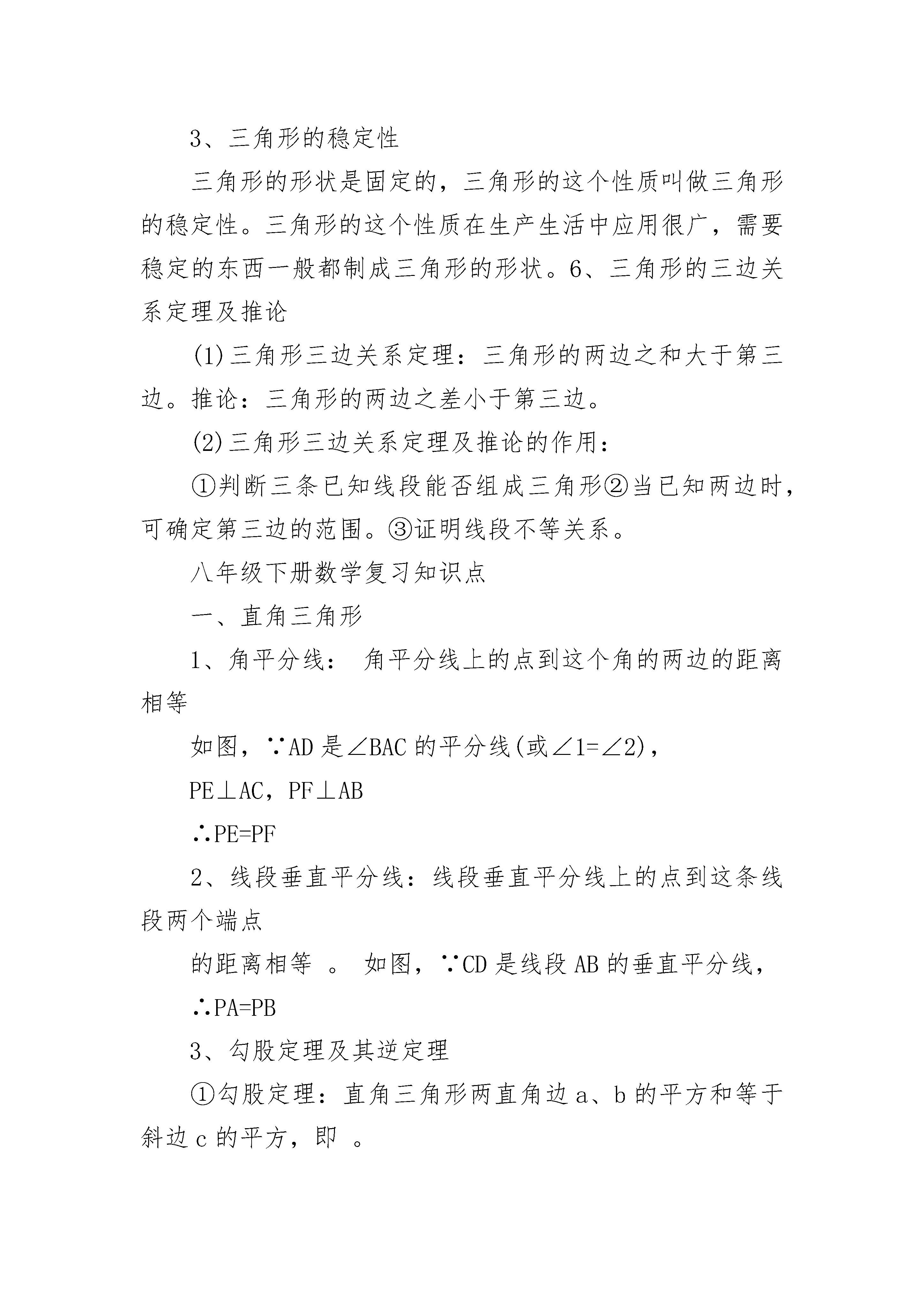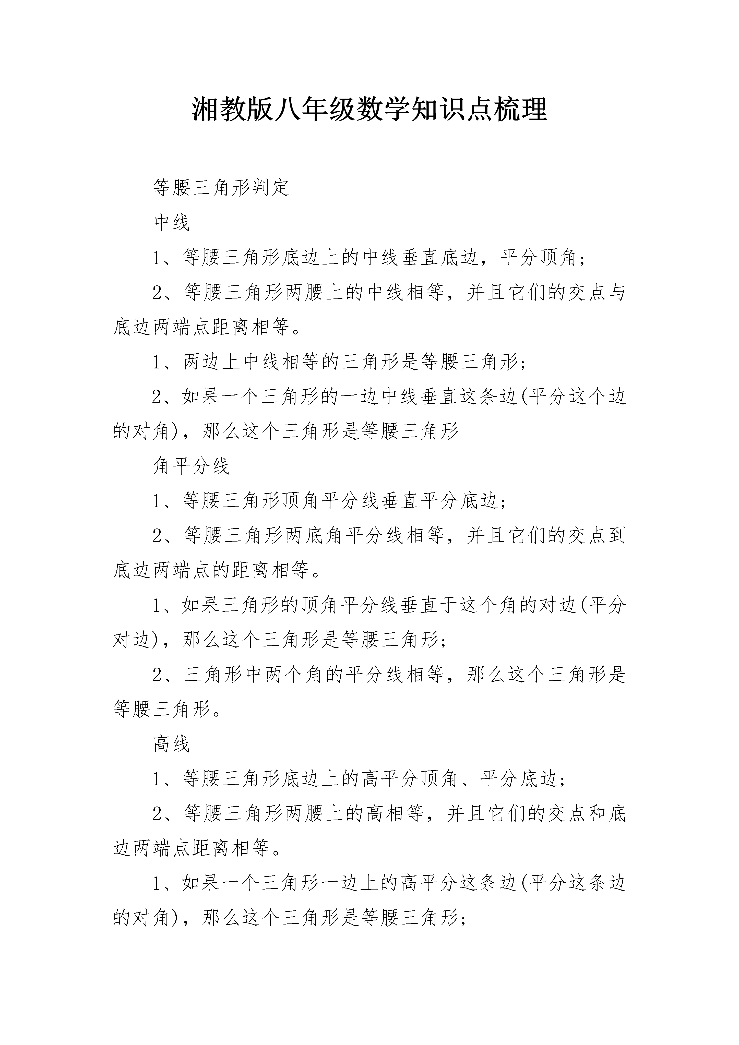 湘教版八年级数学知识点梳理等腰三角形判定中线1、等腰三角形底边上的中线垂直底边,平分顶角;2、等腰三角形两腰上的中线相等,并且它们的交点与底边两端点距离相等。1、两边上中线相等的三角形是等腰三角形;2、如果一个三角形的一边中线垂直这条边(平分这个边的对角),那么这个三角形是等腰三角形角平分线1、等腰三角形顶角平分线垂直平分底边;2、等腰三角形两底角平分线相等,并且它们的交点到底边两端点的距离相等。1、如果三角形的顶角平分线垂直于这个角的对边(平分对边),那么这个三角形是等腰三角形;2、三角形中两个角的平分线相等,那么这个三角形是等腰三角形。高线1、等腰三角形底边上的高平分顶角、平分底边;2、等腰三角形两腰上的高相等,并且它们的交点和底边两端点距离相等。1、如果一个三角形一边上的高平分这条边(平分这条边的对角),那么这个三角形是等腰三角形;2、有两条高相等的三角形是等腰三角形。初二数学三角形知识点总结线段垂直平分线,角的平分线,垂线1、线段垂直平分线的性质定理及逆定理垂直于一条线段并且平分这条线段的直线是这条线段的垂直平分线。线段垂直平分线的性质定理:线段垂直平分线上的点和这条线段两个端点的距离相等。逆定理:和一条线段两个端点距离相等的点,在这条线段的垂直平分线上。2、角的平分线及其性质一条射线把一个角分成两个相等的角,这条射线叫做这个角的平分线。角的平分线有下面的性质定理:(1)角平分线上的点到这个角的两边的距离相等。(2)到一个角的两边距离相等的点在这个角的平分线上。3垂线的性质:性质1:过一点有且只有一条直线与已知直线垂直。性质2:直线外一点与直线上各点连接的所有线段中,垂线段最短。简称:垂线段最短。2、三角形中的主要线段(1)三角形的一个角的平分线与这个角的对边相交,这个角的顶点和交点间的线段叫做三角形的角平分线。(2)在三角形中,连接一个顶点和它对边的中点的线段叫做三角形的中线。(3)从三角形一个顶点向它的对边做垂线,顶点和垂足之间的线段叫做三角形的高线(简称三角形的高)。3、三角形的稳定性三角形的形状是固定的,三角形的这个性质叫做三角形的稳定性。三角形的这个性质在生产生活中应用很广,需要稳定的东西一般都制成三角形的形状。6、三角形的三边关系定理及推论(1)三角形三边关系定理:三角形的两边之和大于第三边。推论:三角形的两边之差小于第三边。(2)三角形三边关系定理及推论的作用:①判断三条已知线段能否组成三角形②当已知两边时,可确定第三边的范围。③证明线段不等关系。八年级下册数学复习知识点一、直角三角形1、角平分线:角平分线上的点到这个角的两边的距离相等如图,∵AD是∠BAC的平分线(或∠1=∠2),PE⊥AC,PF⊥AB∴PE=PF2、线段垂直平分线:线段垂直平分线上的点到这条线段两个端点的距离相等。如图,∵CD是线段AB的垂直平分线,∴PA=PB3、勾股定理及其逆定理①勾股定理:直角三角形两直角边a、b的平方和等于斜边c的平方,即。求斜边,则;求直角边,则或。②逆定理如果三角形的三边长a、b、c有关系,那么这个三角形是直角三角形。分别计算“”和“”,相等就是,不相等就不是。4、直角三角形全等方法:SAS、ASA、SSS、AAS、HL。5、其它性质①直角三角形斜边上的中线等于斜边上的一半如图,在ABC中,∵CD是斜边AB的中线,∴CD=。②在直角三角形中,如果一个锐角等于30°那么它所对的直角边等于斜边的一半如图,在ABC中,∵∠A=30°,∴BC=。③在直角三角形中,如果一条直角边等于斜边的一半,那么这条直角边所对的角等于30°如图,在ABC中,∵BC=,∴∠A=30°。④三角形中位线定理三角形的中位线平行于第三边,并且等于它的一半如图,在⊿ABC中,∵E是AB的中点,F是AC的中点,∴EF是⊿ABC的中位线∴EF‖BC,