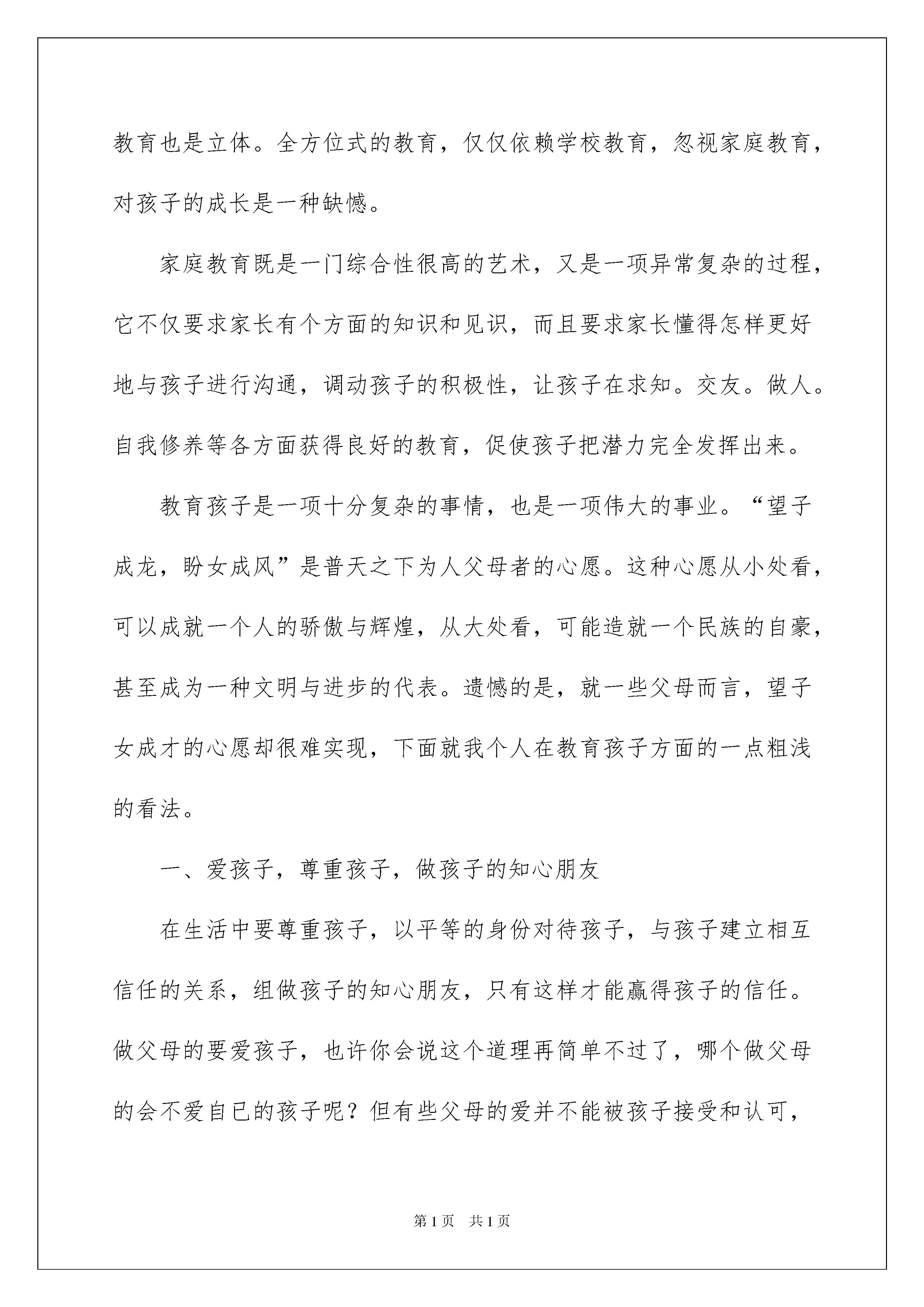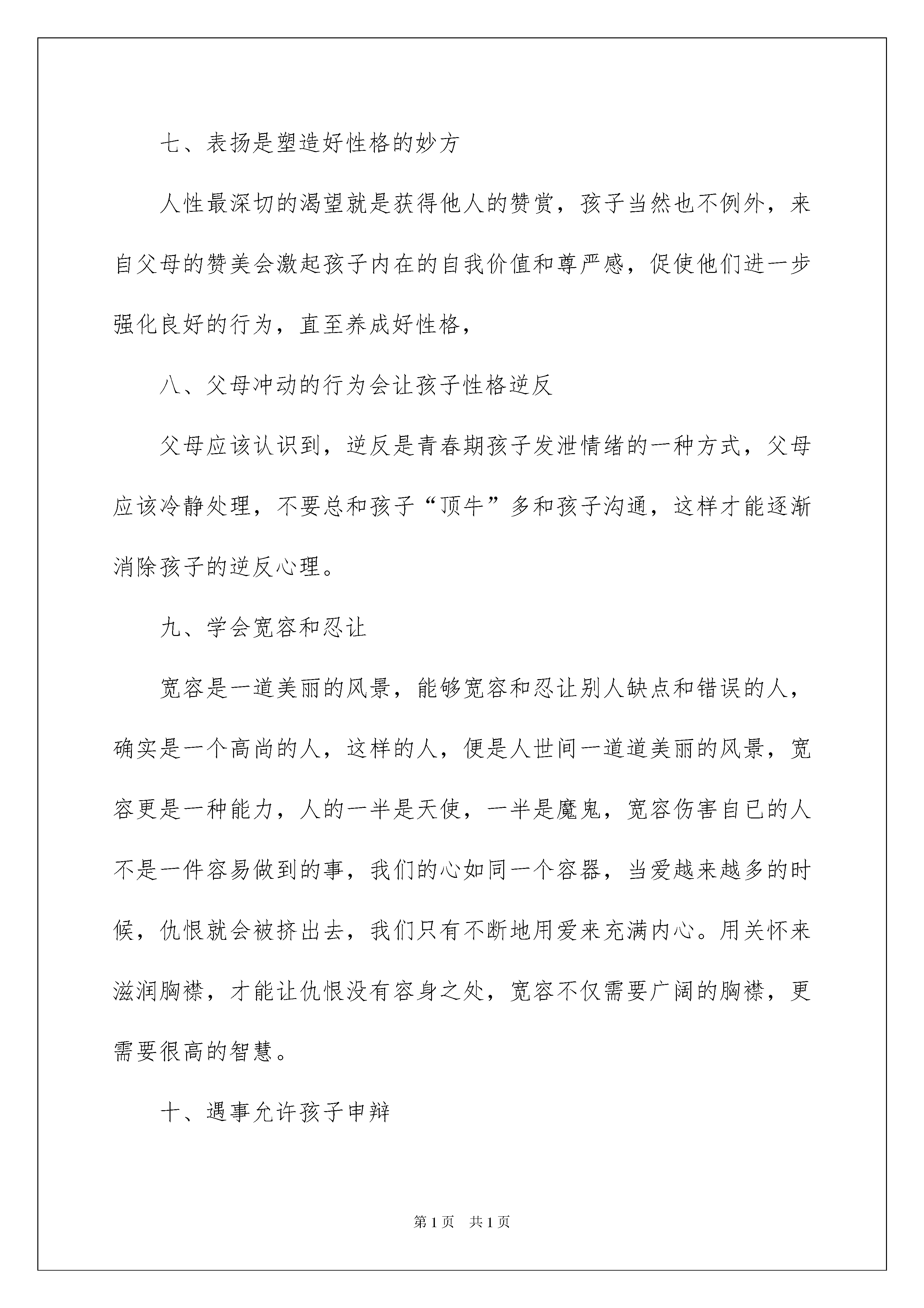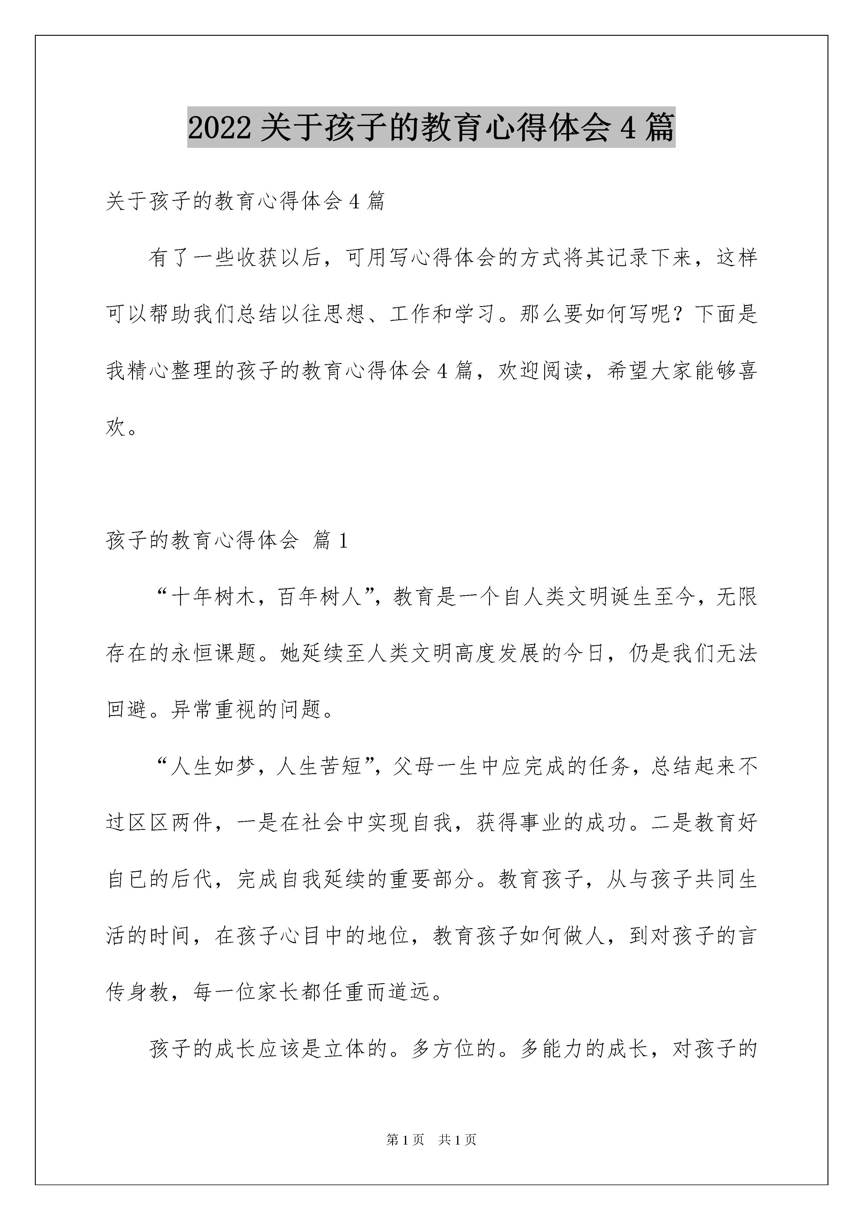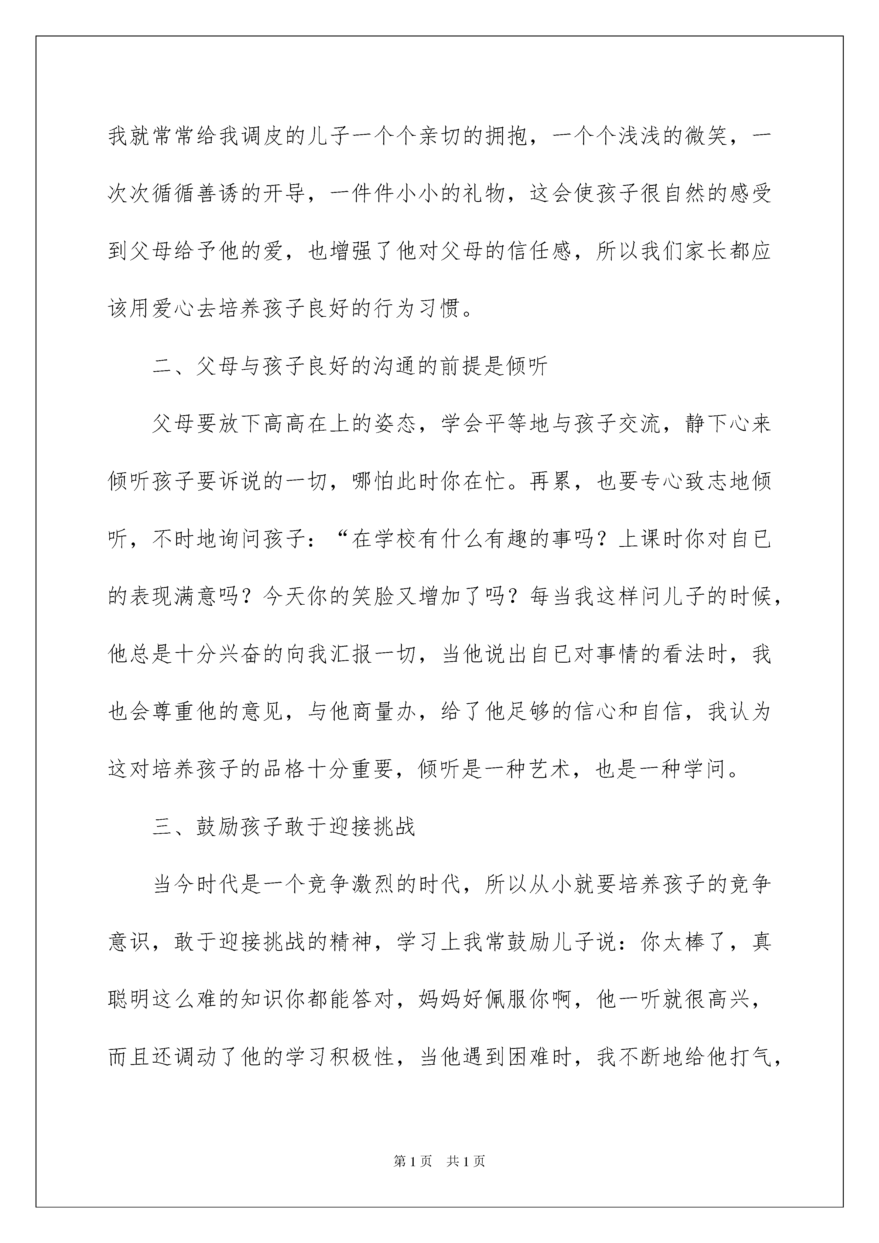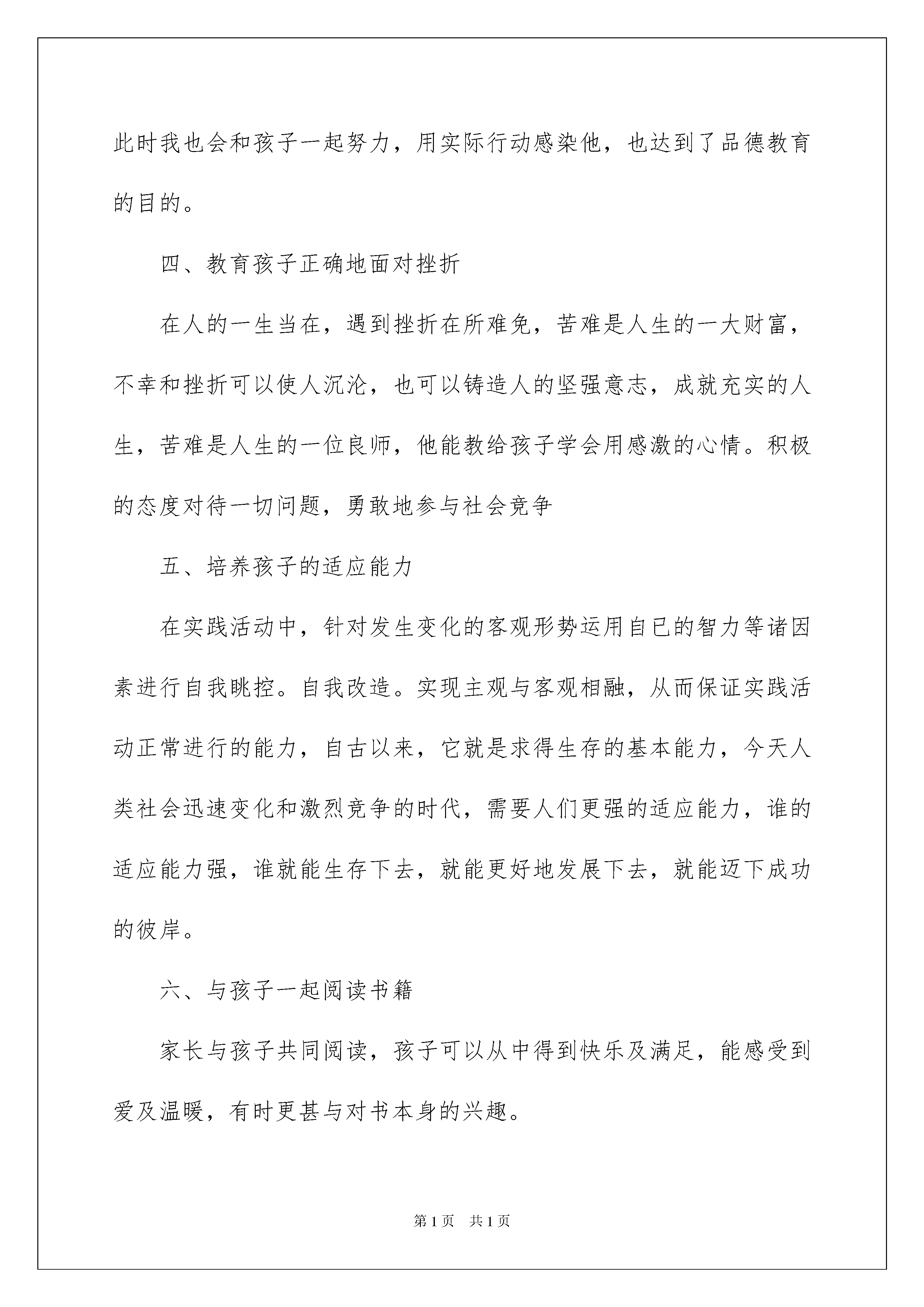 2022关于孩子的教育心得体会4篇关于孩子的教育心得体会4篇有了一些收获以后,可用写心得体会的方式将其记录下来,这样可以帮助我们总结以往思想、工作和学习。那么要如何写呢?下面是我精心整理的孩子的教育心得体会4篇,欢迎阅读,希望大家能够喜欢。孩子的教育心得体会篇1“十年树木,百年树人”,教育是一个自人类文明诞生至今,无限存在的永恒课题。她延续至人类文明高度发展的今日,仍是我们无法回避。异常重视的问题。“人生如梦,人生苦短”,父母一生中应完成的任务,总结起来不过区区两件,一是在社会中实现自我,获得事业的成功。二是教育好自已的后代,完成自我延续的重要部分。教育孩子,从与孩子共同生活的时间,在孩子心目中的地位,教育孩子如何做人,到对孩子的言传身教,每一位家长都任重而道远。孩子的成长应该是立体的。多方位的。多能力的成长,对孩子的教育也是立体。全方位式的教育,仅仅依赖学校教育,忽视家庭教育,对孩子的成长是一种缺憾。家庭教育既是一门综合性很高的艺术,又是一项异常复杂的过程,它不仅要求家长有个方面的知识和见识,而且要求家长懂得怎样更好地与孩子进行沟通,调动孩子的积极性,让孩子在求知。交友。做人。自我修养等各方面获得良好的教育,促使孩子把潜力完全发挥出来。教育孩子是一项十分复杂的事情,也是一项伟大的事业。“望子成龙,盼女成风”是普天之下为人父母者的心愿。这种心愿从小处看,可以成就一个人的骄傲与辉煌,从大处看,可能造就一个民族的自豪,甚至成为一种文明与进步的代表。遗憾的是,就一些父母而言,望子女成才的心愿却很难实现,下面就我个人在教育孩子方面的一点粗浅的看法。一、爱孩子,尊重孩子,做孩子的知心朋友在生活中要尊重孩子,以平等的身份对待孩子,与孩子建立相互信任的关系,组做孩子的知心朋友,只有这样才能赢得孩子的信任。做父母的要爱孩子,也许你会说这个道理再简单不过了,哪个做父母的会不爱自已的孩子呢?但有些父母的爱并不能被孩子接受和认可,我就常常给我调皮的儿子一个个亲切的拥抱,一个个浅浅的微笑,一次次循循善诱的开导,一件件小小的礼物,这会使孩子很自然的感受到父母给予他的爱,也增强了他对父母的信任感,所以我们家长都应该用爱心去培养孩子良好的行为习惯。二、父母与孩子良好的沟通的前提是倾听父母要放下高高在上的姿态,学会平等地与孩子交流,静下心来倾听孩子要诉说的一切,哪怕此时你在忙。再累,也要专心致志地倾听,不时地询问孩子:“在学校有什么有趣的事吗?上课时你对自已的表现满意吗?今天你的笑脸又增加了吗?每当我这样问儿子的时候,他总是十分兴奋的向我汇报一切,当他说出自已对事情的看法时,我也会尊重他的意见,与他商量办,给了他足够的信心和自信,我认为这对培养孩子的品格十分重要,倾听是一种艺术,也是一种学问。三、鼓励孩子敢于迎接挑战当今时代是一个竞争激烈的时代,所以从小就要培养孩子的竞争意识,敢于迎接挑战的精神,学习上我常鼓励儿子说:你太棒了,真聪明这么难的知识你都能答对,妈妈好佩服你啊,他一听就很高兴,而且还调动了他的学习积极性,当他遇到困难时,我不断地给他打气,此时我也会和孩子一起努力,用实际行动感染他,也达到了品德教育的目的。四、教育孩子正确地面对挫折在人的一生当在,遇到挫折在所难免,苦难是人生的一大财富,不幸和挫折可以使人沉沦,也可以铸造人的坚强意志,成就充实的人生,苦难是人生的一位良师,他能教给孩子学会用感激的心情。积极的态度对待一切问题,勇敢地参与社会竞争五、培养孩子的适应能力在实践活动中,针对发生变化的客观形势运用自已的智力等诸因素进行自我眺控。自我改造。实现主观与客观相融,从而保证实践活动正常进行的能力,自古以来,它就是求得生存的基本能力,今天人类社会迅速变化和激烈竞争的时代,需要人们更强的适应能力,谁的适应能力强,谁就能生存下去,就能更好地发展下去,就能迈下成功的彼岸。六、与孩子一起阅读书籍家长与孩子共同阅读,孩子可以从中得到快乐及满足,能感受到爱及温暖,有时更甚与对书本身的兴趣。七、表扬是塑造好性格的妙方人性最深切的渴望就是获得他人的赞赏,孩子当然也不例外,来自父母的赞美会激起孩子内在的自我价值和尊严感,促使他们进一步强化良好的行为,直至养成好性格,八、父母冲动的行为会让孩子性格逆反父母应该认识到,逆反是青春期孩子发泄情绪的一种方式,父母应该冷静处理,不要总和孩子“顶牛”多和孩子沟通,这样才能逐渐消除孩子的逆反心理。九、学会宽容和忍让宽容是一道美丽的风景,能够宽容和忍让别人缺点和错误的人,确实是一个高尚的人,这样的人,便是人世间一道道美丽的风景,宽容更是一种能力,人的一半是天使,一半是魔鬼,宽容伤害