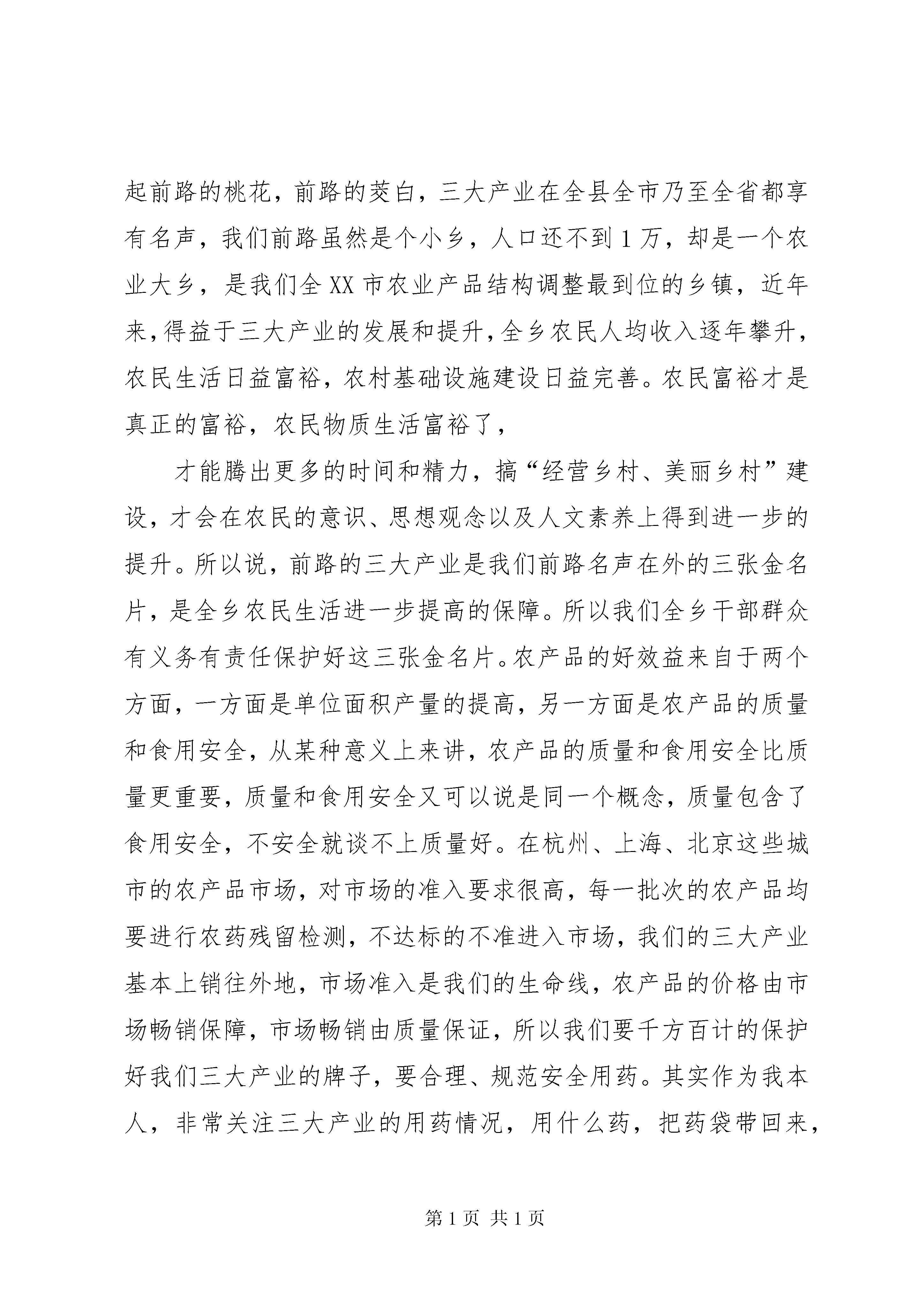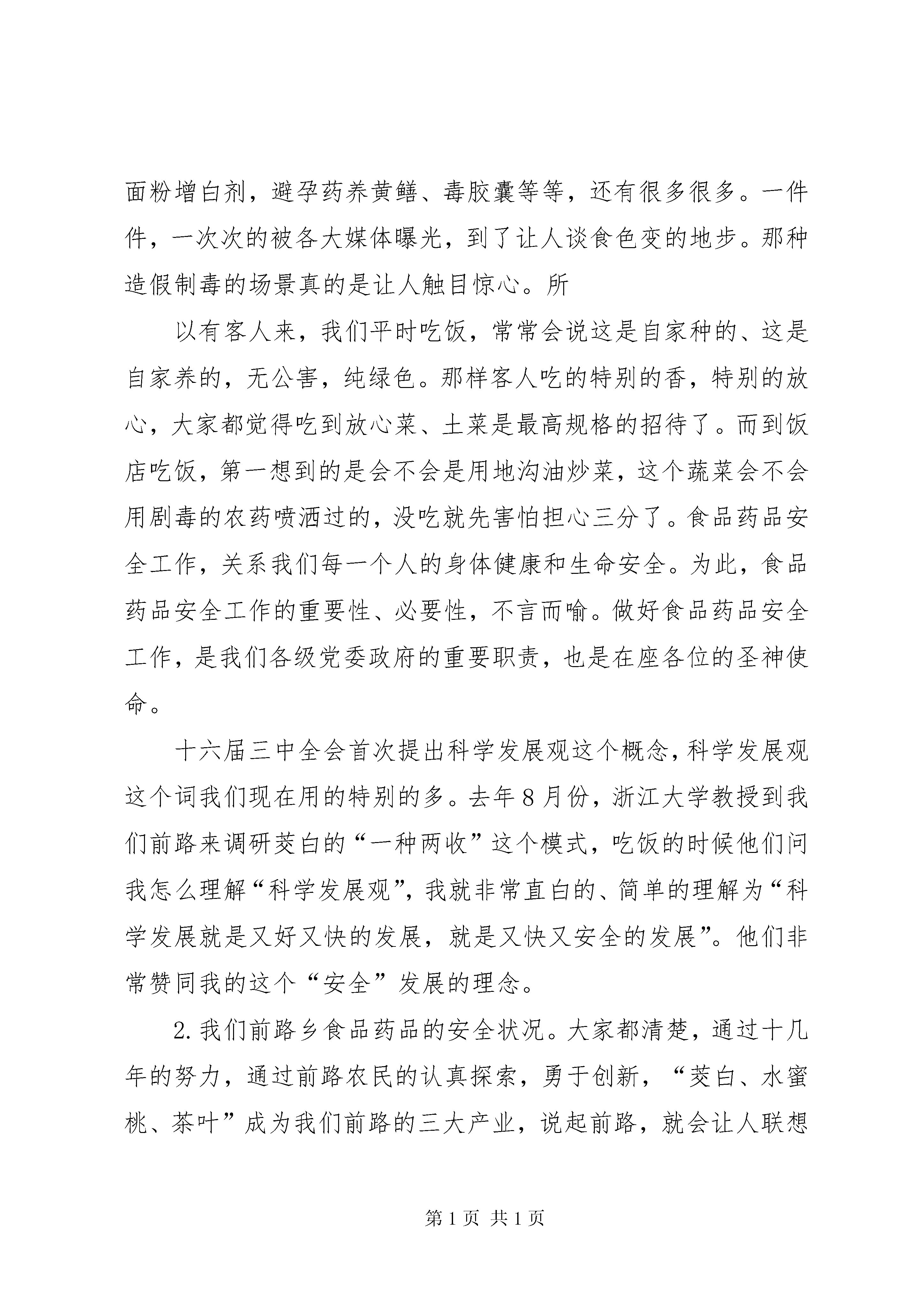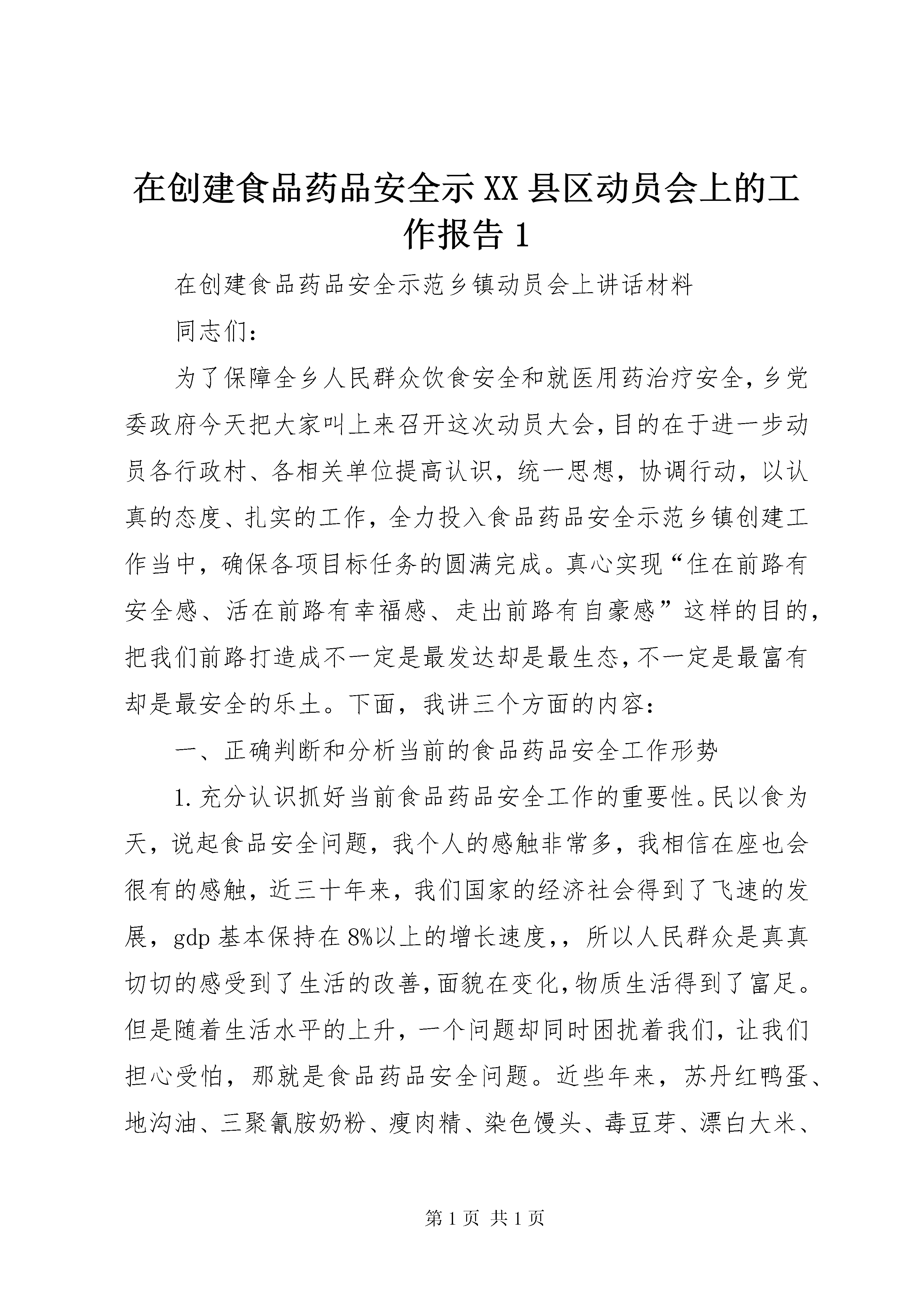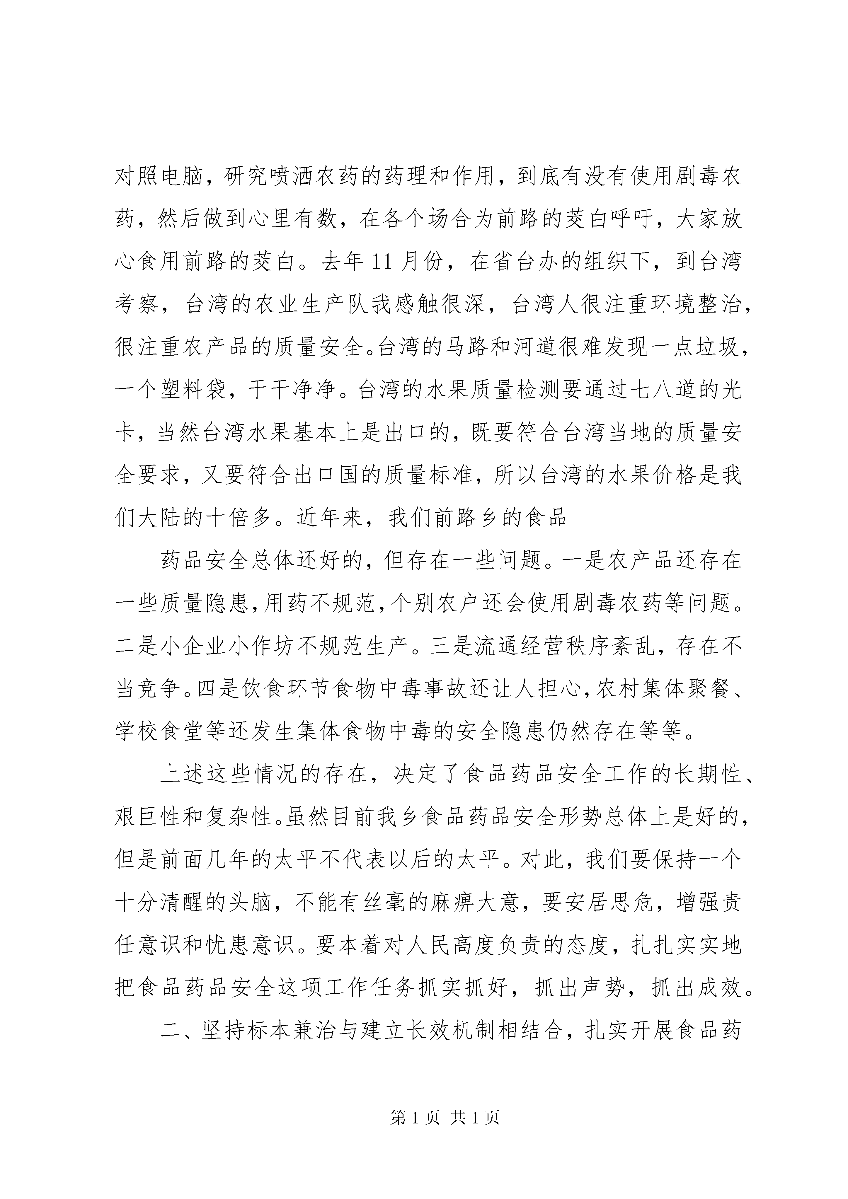 在创建食品药品安全示XX县区动员会上的工作报告1在创建食品药品安全示范乡镇动员会上讲话材料同志们:为了保障全乡人民群众饮食安全和就医用药治疗安全,乡党委政府今天把大家叫上来召开这次动员大会,目的在于进一步动员各行政村、各相关单位提高认识,统一思想,协调行动,以认真的态度、扎实的工作,全力投入食品药品安全示范乡镇创建工作当中,确保各项目标任务的圆满完成。真心实现“住在前路有安全感、活在前路有幸福感、走出前路有自豪感”这样的目的,把我们前路打造成不一定是最发达却是最生态,不一定是最富有却是最安全的乐土。下面,我讲三个方面的内容:一、正确判断和分析当前的食品药品安全工作形势1.充分认识抓好当前食品药品安全工作的重要性。民以食为天,说起食品安全问题,我个人的感触非常多,我相信在座也会很有的感触,近三十年来,我们国家的经济社会得到了飞速的发展,gdp基本保持在8%以上的增长速度,,所以人民群众是真真切切的感受到了生活的改善,面貌在变化,物质生活得到了富足。但是随着生活水平的上升,一个问题却同时困扰着我们,让我们担心受怕,那就是食品药品安全问题。近些年来,苏丹红鸭蛋、地沟油、三聚氰胺奶粉、瘦肉精、染色馒头、毒豆芽、漂白大米、面粉增白剂,避孕药养黄鳝、毒胶囊等等,还有很多很多。一件件,一次次的被各大媒体曝光,到了让人谈食色变的地步。那种造假制毒的场景真的是让人触目惊心。所以有客人来,我们平时吃饭,常常会说这是自家种的、这是自家养的,无公害,纯绿色。那样客人吃的特别的香,特别的放心,大家都觉得吃到放心菜、土菜是最高规格的招待了。而到饭店吃饭,第一想到的是会不会是用地沟油炒菜,这个蔬菜会不会用剧毒的农药喷洒过的,没吃就先害怕担心三分了。食品药品安全工作,关系我们每一个人的身体健康和生命安全。为此,食品药品安全工作的重要性、必要性,不言而喻。做好食品药品安全工作,是我们各级党委政府的重要职责,也是在座各位的圣神使命。十六届三中全会首次提出科学发展观这个概念,科学发展观这个词我们现在用的特别的多。去年8月份,浙江大学教授到我们前路来调研茭白的“一种两收”这个模式,吃饭的时候他们问我怎么理解“科学发展观”,我就非常直白的、简单的理解为“科学发展就是又好又快的发展,就是又快又安全的发展”。他们非常赞同我的这个“安全”发展的理念。2.我们前路乡食品药品的安全状况。大家都清楚,通过十几年的努力,通过前路农民的认真探索,勇于创新,“茭白、水蜜桃、茶叶”成为我们前路的三大产业,说起前路,就会让人联想起前路的桃花,前路的茭白,三大产业在全县全市乃至全省都享有名声,我们前路虽然是个小乡,人口还不到1万,却是一个农业大乡,是我们全XX市农业产品结构调整最到位的乡镇,近年来,得益于三大产业的发展和提升,全乡农民人均收入逐年攀升,农民生活日益富裕,农村基础设施建设日益完善。农民富裕才是真正的富裕,农民物质生活富裕了,才能腾出更多的时间和精力,搞“经营乡村、美丽乡村”建设,才会在农民的意识、思想观念以及人文素养上得到进一步的提升。所以说,前路的三大产业是我们前路名声在外的三张金名片,是全乡农民生活进一步提高的保障。所以我们全乡干部群众有义务有责任保护好这三张金名片。农产品的好效益来自于两个方面,一方面是单位面积产量的提高,另一方面是农产品的质量和食用安全,从某种意义上来讲,农产品的质量和食用安全比质量更重要,质量和食用安全又可以说是同一个概念,质量包含了食用安全,不安全就谈不上质量好。在杭州、上海、北京这些城市的农产品市场,对市场的准入要求很高,每一批次的农产品均要进行农药残留检测,不达标的不准进入市场,我们的三大产业基本上销往外地,市场准入是我们的生命线,农产品的价格由市场畅销保障,市场畅销由质量保证,所以我们要千方百计的保护好我们三大产业的牌子,要合理、规范安全用药。其实作为我本人,非常关注三大产业的用药情况,用什么药,把药袋带回来,对照电脑,研究喷洒农药的药理和作用,到底有没有使用剧毒农药,然后做到心里有数,在各个场合为前路的茭白呼吁,大家放心食用前路的茭白。去年11月份,在省台办的组织下,到台湾考察,台湾的农业生产队我感触很深,台湾人很注重环境整治,很注重农产品的质量安全。台湾的马路和河道很难发现一点垃圾,一个塑料袋,干干净净。台湾的水果质量检测要通过七八道的光卡,当然台湾水果基本上是出口的,既要符合台湾当地的质量安全要求,又要符合出口国的质量标准,所以台湾的水果价格是我们大陆的十倍多。近年来,我们前路乡的食品药品安全总体还好的,但存在一些问题。一是农产品还存在一些质量隐患,用药不规范,个别农户还会使用剧毒农药等问题。二是小企业小作坊不规范生产。三是流通经营秩序紊乱,存在不当竞争。四是饮食环节食物中毒事故还让人担心,农村集体聚餐、学校食堂