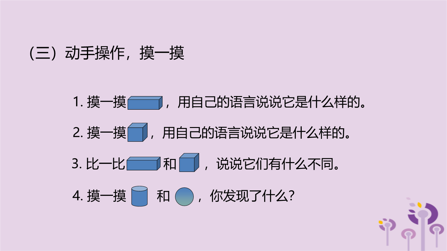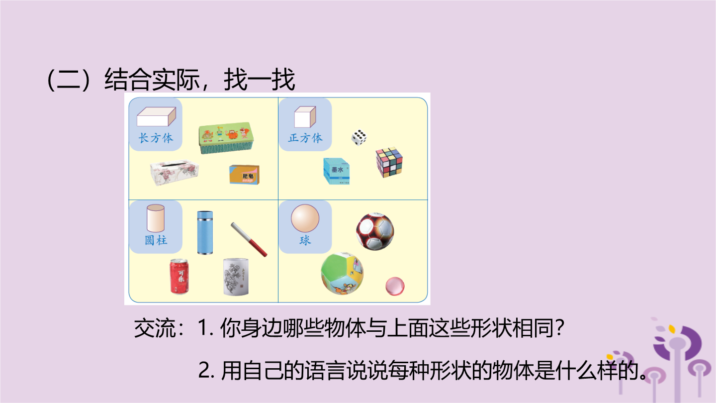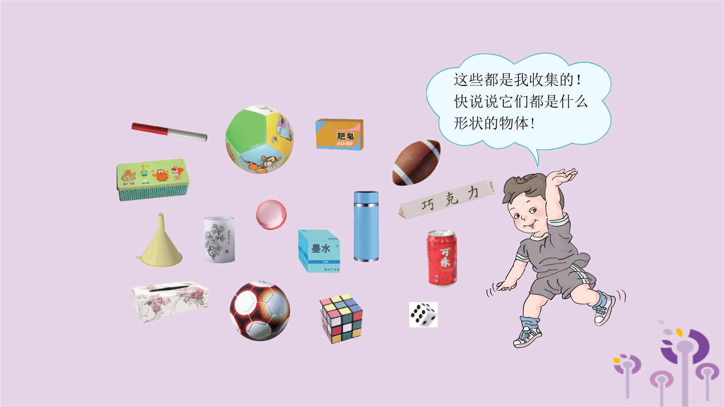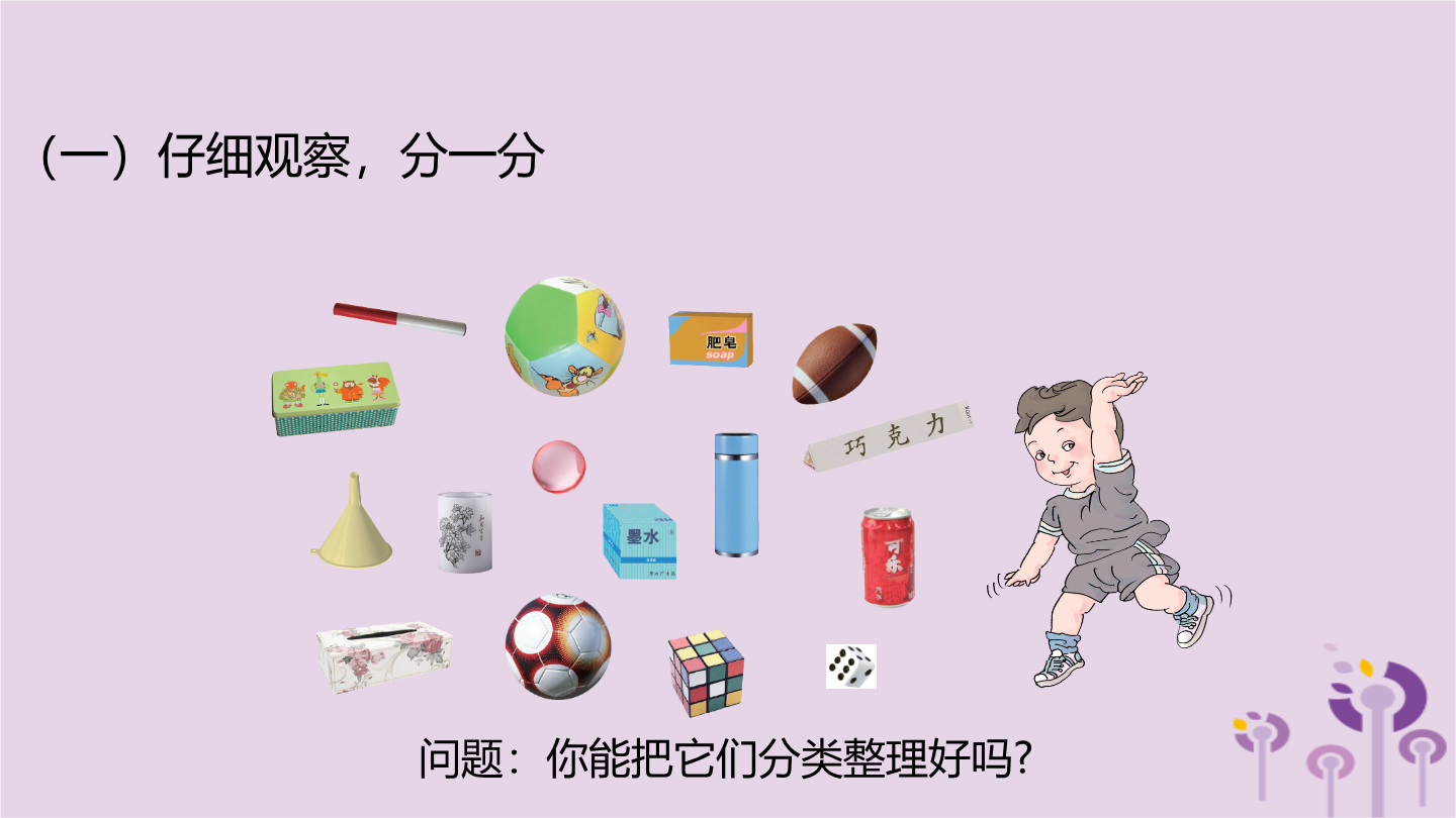 这些都是我收集的!快说说它们都是什么形状的物体!问题:你能把它们分类整理好吗?(二)结合实际,找一找(三)动手操作,摸一摸连一连数一数圆圆鼓鼓小淘气,滚来滚去不费力。找一找,我是用哪些形状的物体制作的机器人呢?