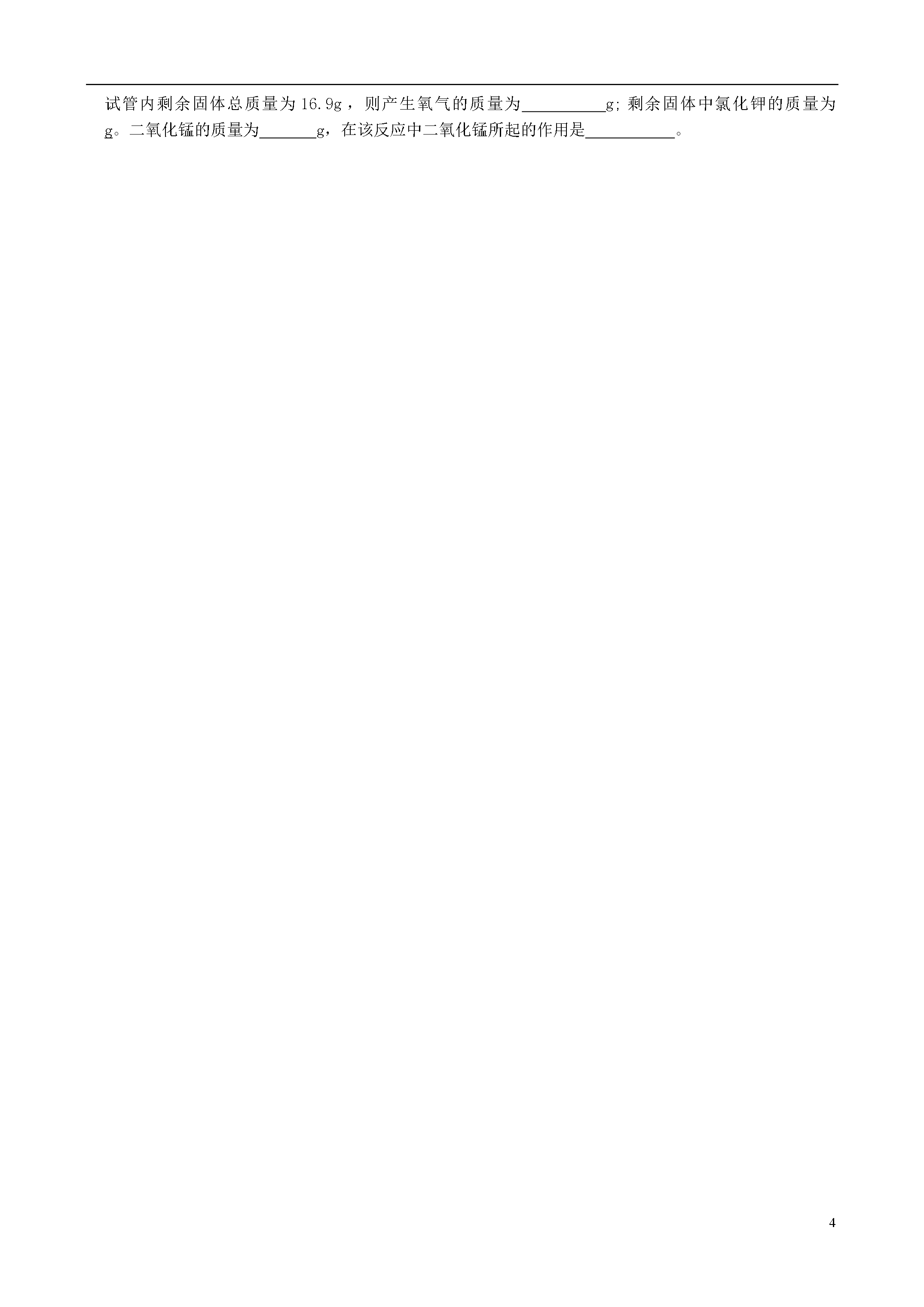 5河南省上蔡县第一初级中学2015届九年级化学上学期期中试题题号一二三四总分得分相对原子质量:H-1C-12N-14O-16Cl-35.5K-39一、选择题(本题包括12个小题,每题只有一个选项符合题意,每小题1分,共12分)1.生活中的下列变化,属于物理变化的是()A、木柴燃烧B、铁钉生锈C、酿酒制醋D、水的蒸发2.下列各组物质中,都由分子构成的一组是()A、铁和金刚石B、水和氧气C、氯化钠和汞D、硫酸铜和金3、下列各组物质,按单质、氧化物、混合物顺序排列的一组是()A、水、二氧化碳、石灰水B、液氧,冰、水共存物,空气C、铁、高锰酸钾、糖水D、氧化铁、二氧化锰、矿泉水4、下列有关化学实验的说法中,不正确的是()A、用高锰酸钾制O2时,反应试管的管口要略向下倾斜B、做铁丝在O2中燃烧的实验时,集气瓶应先放少量水或细沙C、用燃烧法测定空气中O2的含量时,可用木炭代替红磷D、点燃氢气之前,要先检验氢气的纯度5、下列结构示意图表示的粒子中,属于阳离子的是()ABCD6.硝酸银(AgNO3)见光或加热时能发生分解反应,生成银,氧气和一种有刺激性气味的气体,该气体可能是()A、NH3B、N2C、SO2D、NO27、茶叶中含有丰富的茶碱(化学式C14H14NO2),适量饮茶有益身体健康,下列有关茶碱的说法正确的是()A、茶碱是由碳原子、氢原子、氮原子、氧分子构成的B、茶碱的相对分子质量为230C、茶碱中氢元素的质量分数大于氮元素的质量分数D、茶碱是由碳元素、氢元素、氮元素、氧元素组成的8、植物的光合作用可表示为二氧化碳+水淀粉+氧气,根据以上信息,下列关于淀粉组成的说法中正确的是()A、一定含有碳元素,氢元素、可能含有氧元素B、只含碳、氢元素、不含氧元素C、含有碳、氢、氧三种元素D、无法判断9、已知在反应A+B=C+D中,参加反应的A与B的质量比为3:4,若生成C和D总质量为28g,则参加反应B的质量为()A、12gB、14gC、16gD、18g10、发射火箭常用高氯酸铵(NH4ClO4)分解提供动力,反应的化学方程式2NH4ClO4N2↑+2O2↑+4X↑则X化学式为()A、NH3B、H2OC、H2D、HCl11、下列含硫物质中①S、②Na2S、③H2SO4④SO2按硫的化合价由高到低排列的顺序为()A、③④①②B、②①③④C、①②④③D、②①④③12、在密闭容器内有A、B、C、D四种物质,在一定条件下充分反应,测得反应前后各物质的质量如下,对该反应下列说法正确的是()物质ABCD反应前质量/g6.800.31反应后质量/g03.63.51A、物质D一定是该反应的催化剂B、该反应为分解反应C、物质B、C质量变化比为:36:35D、物质A可能是单质二、填空题(本题包括6个小题,每空1分,共16分)13、空气中体积分数最大的物质是,地壳中含量最多的金属元素是,它与氧元素组成的化合物化学式为。BA元素符号元素名称14、元素周期表是学习化学的重要工具,右图是表中的一格,其中A表示;B表示。15、区分硬水和软水,可以选用的物质是,常用方法使硬水软化,常用的净水方法有(填两种即可)16、不同元素最本质的区别是不同;与元素化学性质关系最密切的是其原子的。17、用数字和化学符号表示:2个氮原子;3个钙离子2个二氧化硫分子。18、从分子的角度说,气体比液体容易压缩是因为它们;举一事例说明分子在不断运动;构成并保持二氧化碳化学性质的最小粒子是。三、简答题(本题包括4个小题,共12分)19、(1分)根据质量守恒定律解释:镁在空气中燃烧后,生成物氧化镁的质量比参加反应的镁的质量增大。20、(4分)用化学方程式表示下列反应原理。(1)氢气用作燃料。(2)大型运动会中火炬使用的燃料是丙烷(化学式C3H8),丙烷在空气中完全燃烧生成二氧化碳和水。(3)实验室分解高锰酸钾制氧气。(4)铁在氧气中剧烈燃烧。21、(3分)如右图装置可用于测定空气中氧气的含量(1)写出该反应的化学方程式(1)该实验的目的是什么?(2)写出该反应的化学方程式。(3)若正极相连的试管产生5ml的气体,则负极相连的试管产生ml的另一种气体。(4)该反应中没有变化的粒子是。(填具体的粒子)四、综合应用题(共10分)23、学习化学的一个重要途径是科学探究。实验是科学探究的重要手段。(1)过滤操作中需要用到的玻璃仪器有(写出两种即可)(2)某化学小组在实验室中选用下图装置制取气体。①甲同学用分解氯酸钾方法制O2,应选择的发生装置是,写出该反应的化学方程式.②乙同学选用B制取氧气的化学方程式。③若用C收集氧气,气体应从端通入?如何检验氧气是否集满?④若甲同学称量24.5g氯酸钾与2g二氧化锰,混合均匀后放入大试管中,加热充分反应后,冷却称量,试管内剩余固体总质量为16.9g,则产生氧气的质量为g;剩余固