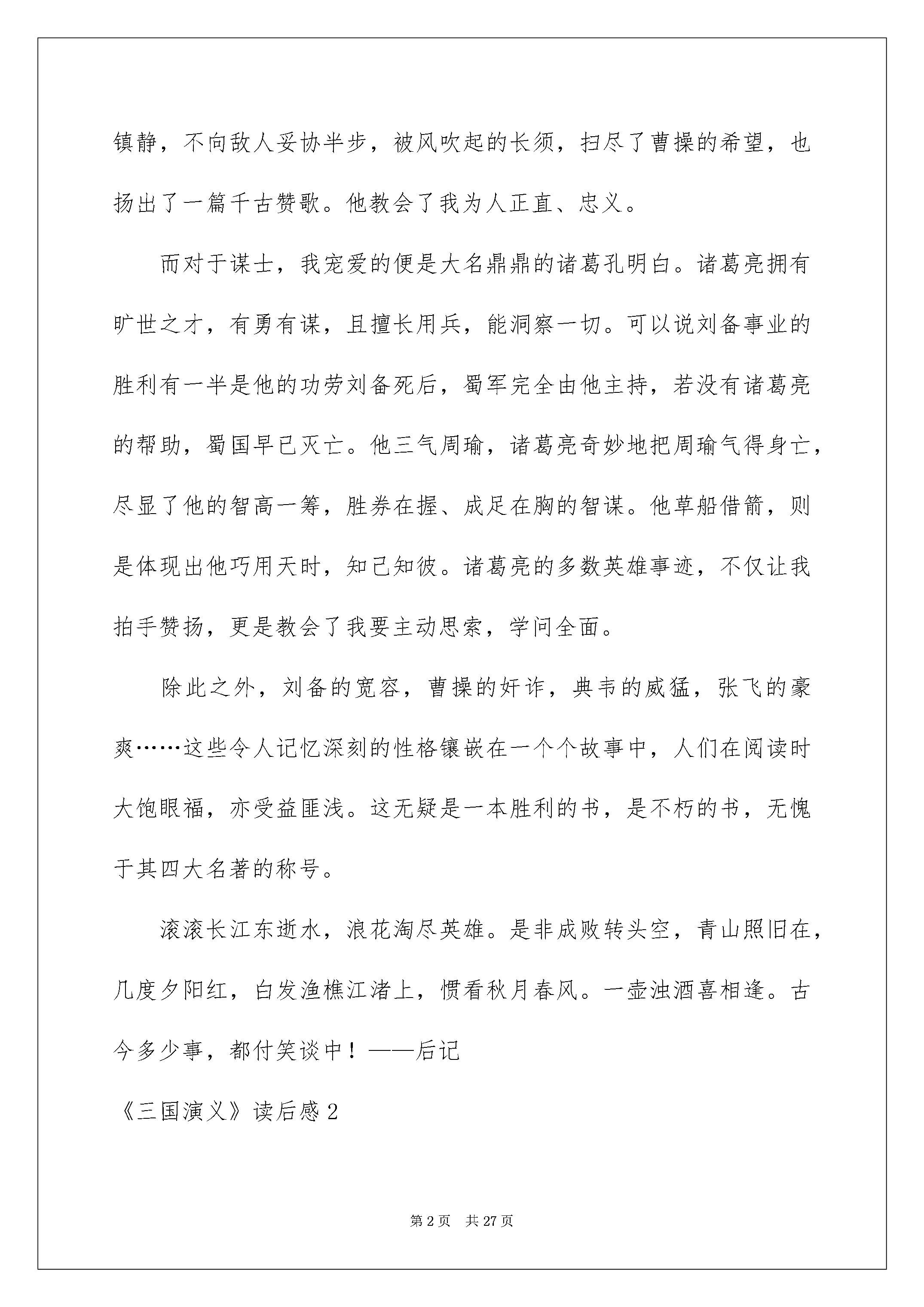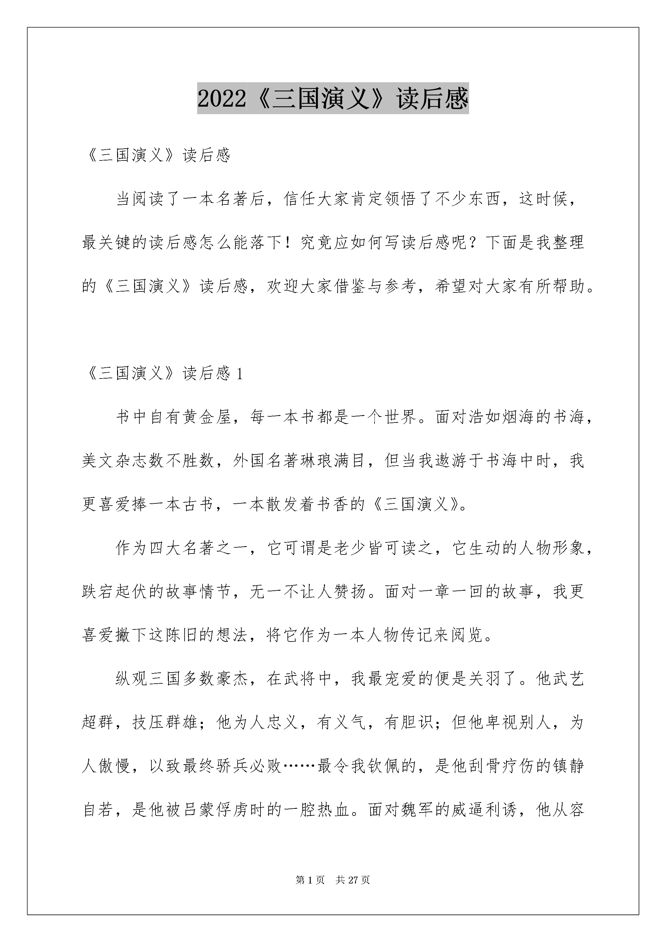 2022《三国演义》读后感《三国演义》读后感当阅读了一本名著后,信任大家肯定领悟了不少东西,这时候,最关键的读后感怎么能落下!究竟应如何写读后感呢?下面是我整理的《三国演义》读后感,欢迎大家借鉴与参考,希望对大家有所帮助。《三国演义》读后感1书中自有黄金屋,每一本书都是一个世界。面对浩如烟海的书海,美文杂志数不胜数,外国名著琳琅满目,但当我遨游于书海中时,我更喜爱捧一本古书,一本散发着书香的《三国演义》。作为四大名著之一,它可谓是老少皆可读之,它生动的人物形象,跌宕起伏的故事情节,无一不让人赞扬。面对一章一回的故事,我更喜爱撇下这陈旧的想法,将它作为一本人物传记来阅览。纵观三国多数豪杰,在武将中,我最宠爱的便是关羽了。他武艺超群,技压群雄;他为人忠义,有义气,有胆识;但他卑视别人,为人傲慢,以致最终骄兵必败……最令我钦佩的,是他刮骨疗伤的镇静自若,是他被吕蒙俘虏时的一腔热血。面对魏军的威逼利诱,他从容镇静,不向敌人妥协半步,被风吹起的长须,扫尽了曹操的希望,也扬出了一篇千古赞歌。他教会了我为人正直、忠义。而对于谋士,我宠爱的便是大名鼎鼎的诸葛孔明白。诸葛亮拥有旷世之才,有勇有谋,且擅长用兵,能洞察一切。可以说刘备事业的胜利有一半是他的功劳刘备死后,蜀军完全由他主持,若没有诸葛亮的帮助,蜀国早已灭亡。他三气周瑜,诸葛亮奇妙地把周瑜气得身亡,尽显了他的智高一筹,胜券在握、成足在胸的智谋。他草船借箭,则是体现出他巧用天时,知己知彼。诸葛亮的多数英雄事迹,不仅让我拍手赞扬,更是教会了我要主动思索,学问全面。除此之外,刘备的宽容,曹操的奸诈,典韦的威猛,张飞的豪爽……这些令人记忆深刻的性格镶嵌在一个个故事中,人们在阅读时大饱眼福,亦受益匪浅。这无疑是一本胜利的书,是不朽的书,无愧于其四大名著的称号。滚滚长江东逝水,浪花淘尽英雄。是非成败转头空,青山照旧在,几度夕阳红,白发渔樵江渚上,惯看秋月春风。一壶浊酒喜相逢。古今多少事,都付笑谈中!——后记《三国演义》读后感2暑假里,我有幸读到了四大名著之一:《三国演义》。《三国演义》讲的是:刘备原来是一位卖草鞋为生的人,因为听说幽州太守刘焉招兵,于是就去投奔刘焉。在路上与张飞、关羽相遇并结为兄弟,他们三人一起投奔刘焉去了。刘焉死了以后刘备也招了点人马,驻扎在了新野,起先自己的事业。他们又“三顾茅庐”请来了诸葛亮来当军师,帮助出谋划策。起先关羽和张飞不服诸葛亮,直到诸葛亮打了一场大胜仗,他俩才心服口服。之后,通过刘、关、张三人的努力,他们与曹操、孙权一起形成了三国鼎立的局面。刘备国号为蜀,曹操国号为魏,孙权国号为吴。后来,关羽因为太过于傲慢了,就把他把守的荆州给丢了,还被捉到吴王孙权的手里,被杀了。张飞因为和关羽结为了兄弟,所以想报仇,可是却被手下给害死了。刘备看到两个兄弟都因为吴国而死了,就不顾诸葛亮的苦苦劝说,发动一百万军马去打吴国,最终被战胜了,刘备也因此得了病去世了。太子刘禅继承了父亲的霸业。可他乐不思蜀,成天和奸臣一起吃喝玩乐,蜀国只好由诸葛亮来管理,过了一段时间,诸葛亮也因为身体不好病死了。刘禅因为没有实力,就被抓到曹操那里去了,从今,三国鼎立的局面就这样完了……在这个历史故事里,我最喜爱的人物是诸葛亮——诸葛亮字孔明,他对刘备赤胆忠心,对蜀汉赤胆忠心,自己死也想着蜀汉,这也是鞠躬尽瘁,死而后已的一种体现。诸葛亮特别聪慧,打仗时不靠武力,靠智谋,也打了许多胜仗。我们的学习也是一样的,不能死记硬背,要用一种好方法来记,这样才能记得快。在这个历史故事里,刘备告知我们做人要和善,要擅长听取别人的看法。关羽告知我们做人不能太傲慢,否则就会象关羽一样,丢了荆州又丢了性命。张飞告知我们不要太心急,心急吃不了热豆腐。《三国演义》读后感3《三国演义》是我国古代历史上四大文学名著之一。这本书由罗贯中以陈寿的《三国志》,范晔的《后汉书》及元代的《三国志》为依据,经过熔裁在元末明初创作的。它描述了近90多年的重大历史事务及历史人物的活动,展示了三国兴亡的历史画卷,形象地再现了这一风云变化而又动荡担心地历史时代,生动地揭示了统治集团内部钩心斗角、勾心斗角、相互勾结而又相互争夺的关系,向读者呈现了一副精彩壮阔的历史画卷。其中有庸主献帝刘禅,气量狭隘的周瑜,忠厚的鲁肃,威猛的张飞,重义的关羽,纳贤的刘备等等,无不个极其态。这些人物给了我很深的教化。虽有这些人物,但最令我有所感受的是这本书当中所描述的几个英雄人物。先说关羽。他夜读春秋、秉烛达旦、千里走单骑、过五关斩六将、古城斩蔡阳,在华容道义释曹操。他忠于故主,因战败降敌,但一得知主公消息,毅然投奔主公,是一