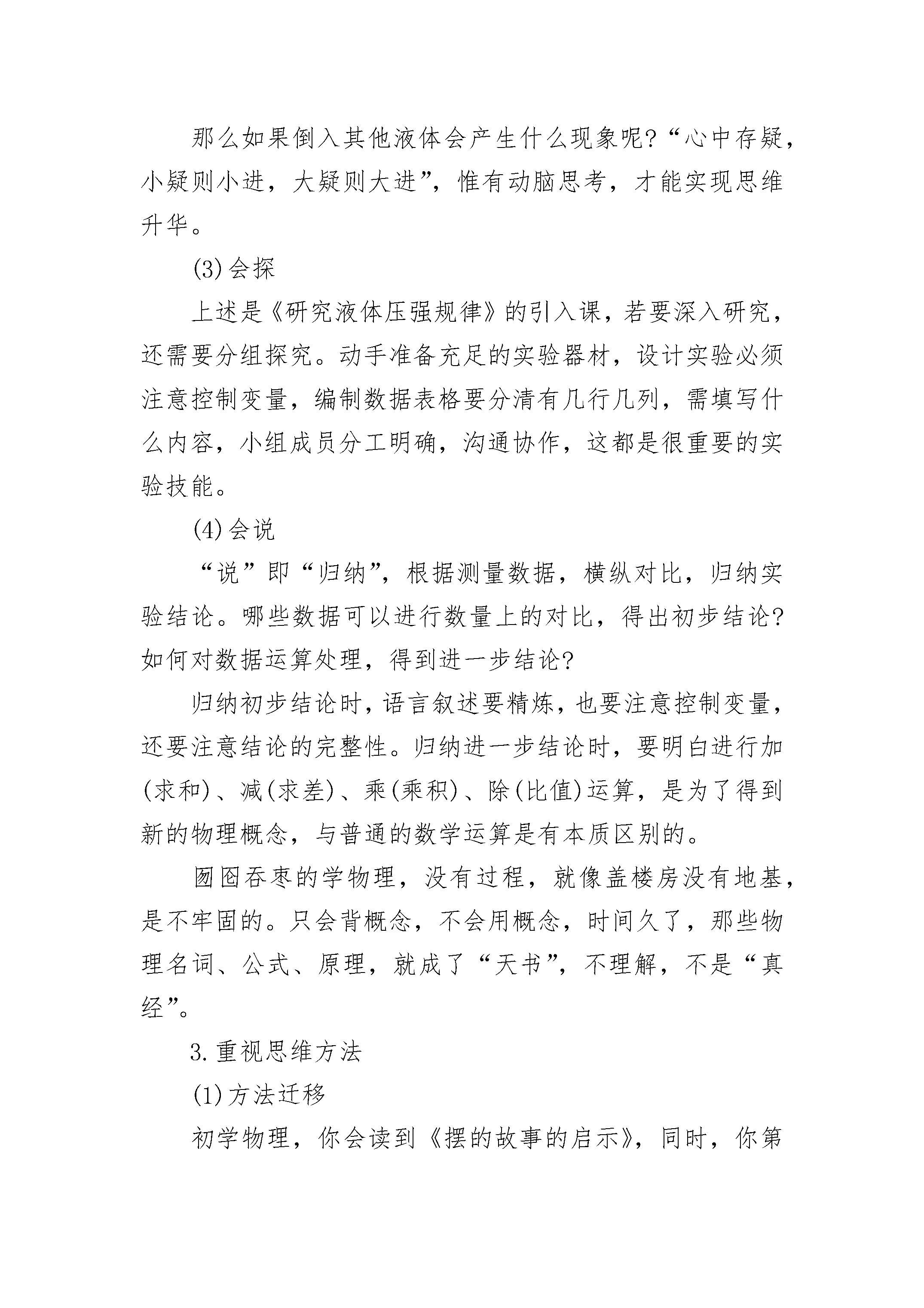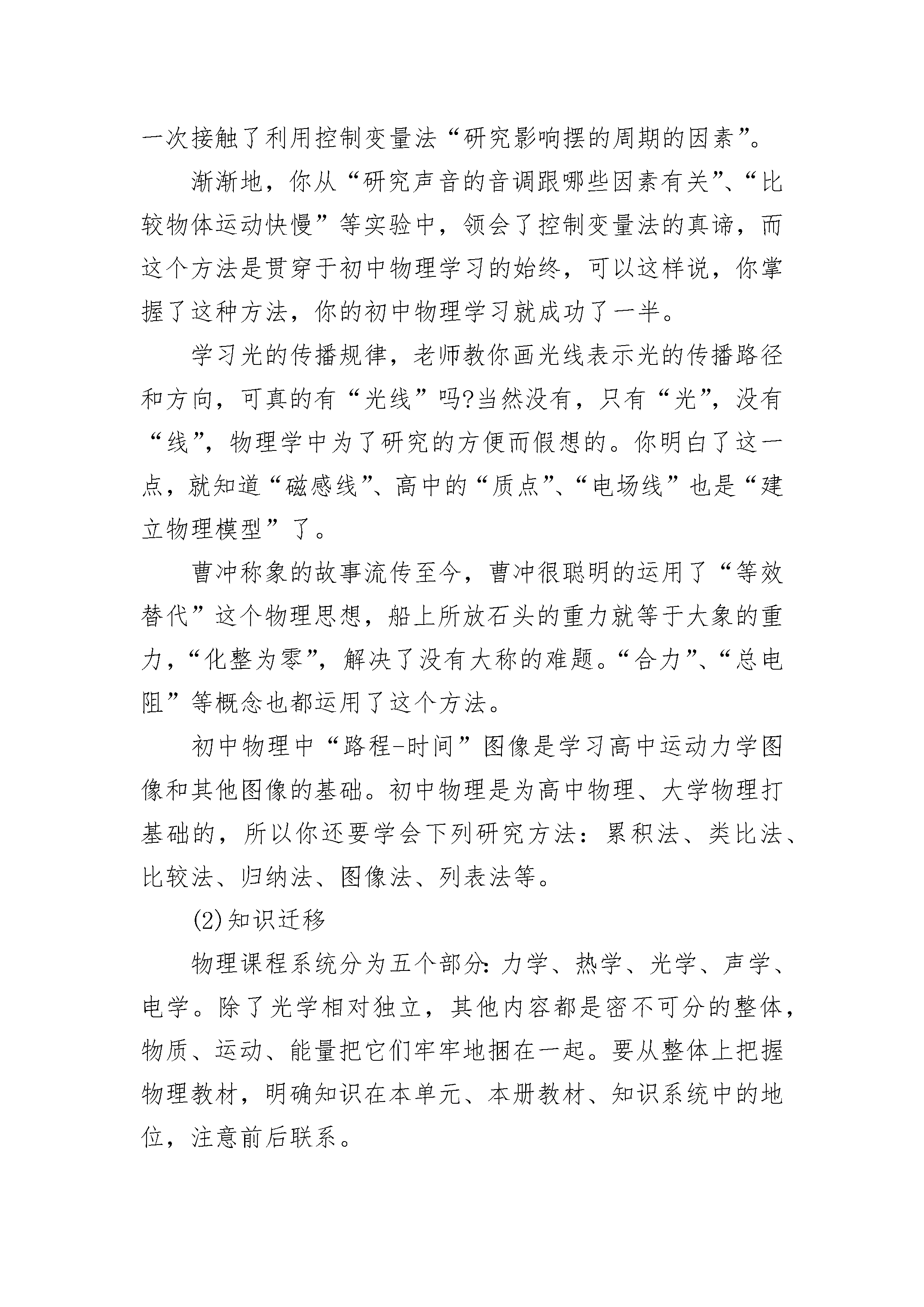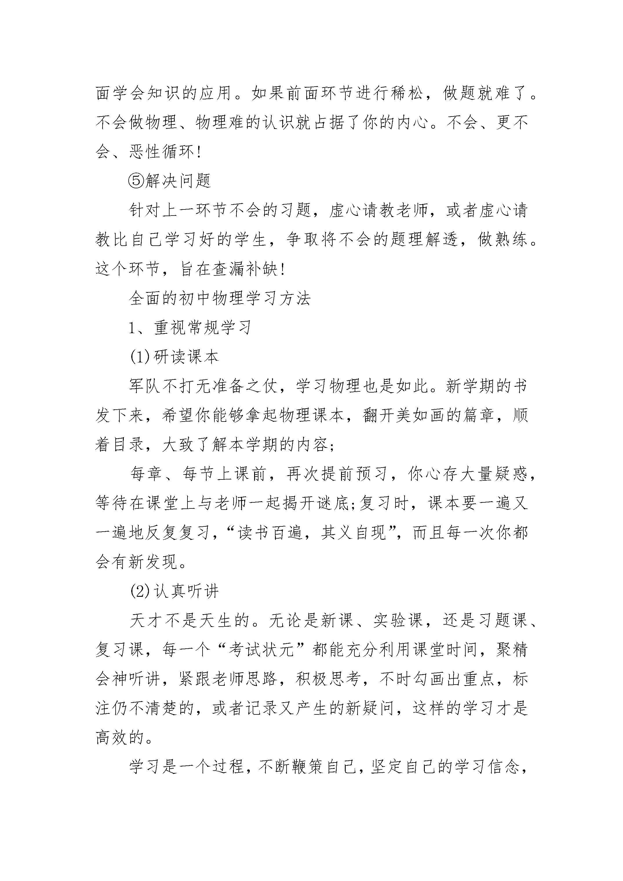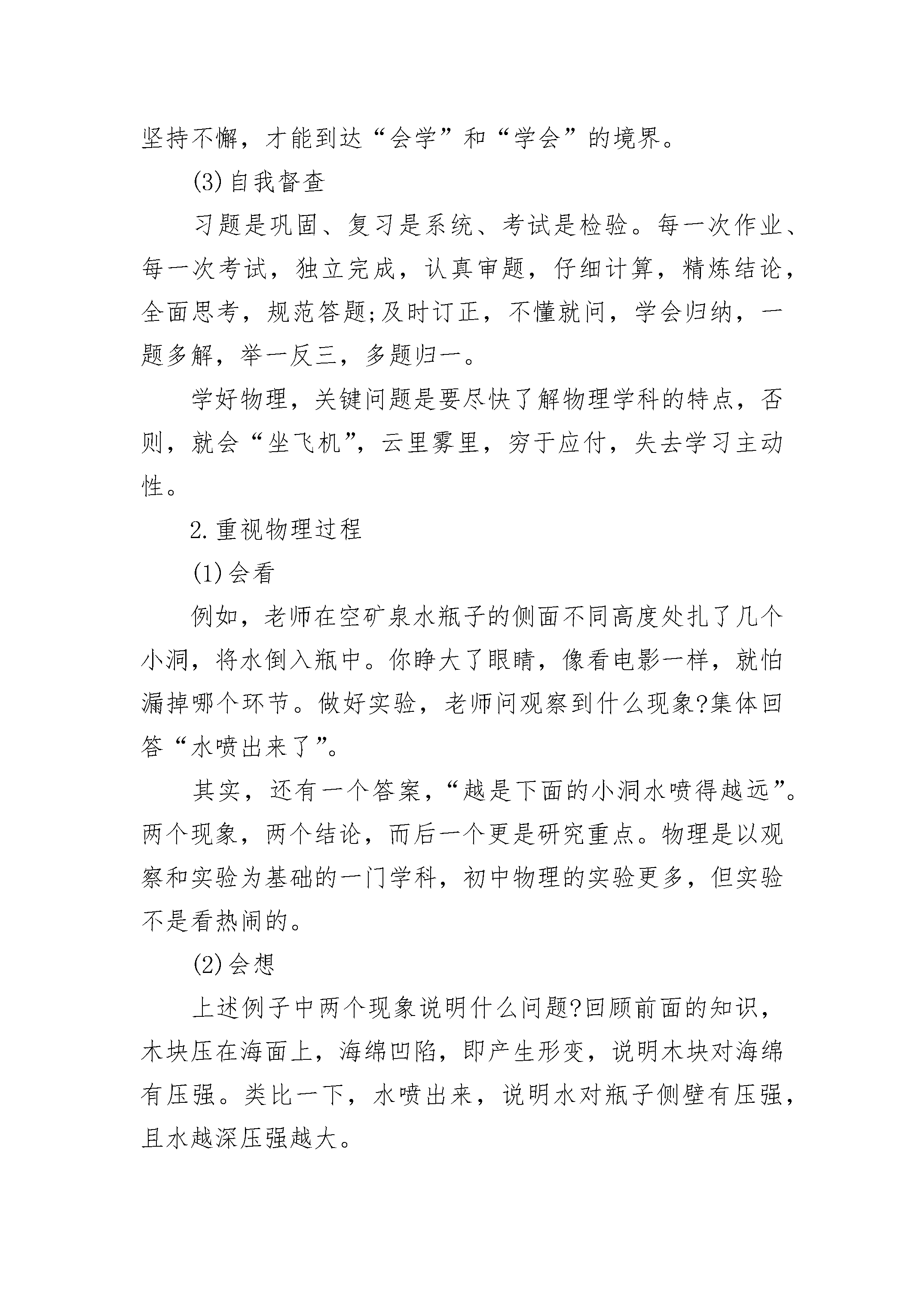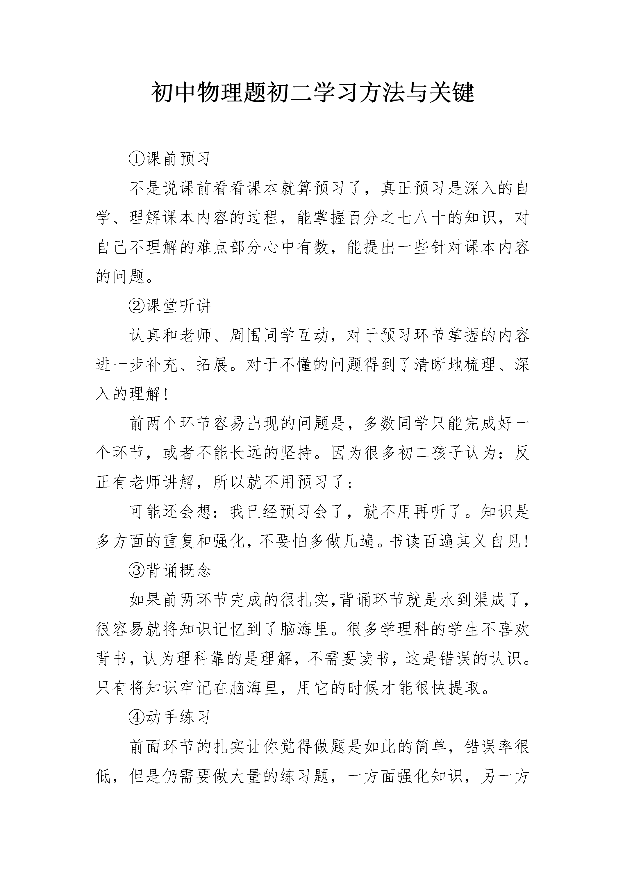 初中物理题初二学习方法与关键①课前预习不是说课前看看课本就算预习了,真正预习是深入的自学、理解课本内容的过程,能掌握百分之七八十的知识,对自己不理解的难点部分心中有数,能提出一些针对课本内容的问题。②课堂听讲认真和老师、周围同学互动,对于预习环节掌握的内容进一步补充、拓展。对于不懂的问题得到了清晰地梳理、深入的理解!前两个环节容易出现的问题是,多数同学只能完成好一个环节,或者不能长远的坚持。因为很多初二孩子认为:反正有老师讲解,所以就不用预习了;可能还会想:我已经预习会了,就不用再听了。知识是多方面的重复和强化,不要怕多做几遍。书读百遍其义自见!③背诵概念如果前两环节完成的很扎实,背诵环节就是水到渠成了,很容易就将知识记忆到了脑海里。很多学理科的学生不喜欢背书,认为理科靠的是理解,不需要读书,这是错误的认识。只有将知识牢记在脑海里,用它的时候才能很快提取。④动手练习前面环节的扎实让你觉得做题是如此的简单,错误率很低,但是仍需要做大量的练习题,一方面强化知识,另一方面学会知识的应用。如果前面环节进行稀松,做题就难了。不会做物理、物理难的认识就占据了你的内心。不会、更不会、恶性循环!⑤解决问题针对上一环节不会的习题,虚心请教老师,或者虚心请教比自己学习好的学生,争取将不会的题理解透,做熟练。这个环节,旨在查漏补缺!全面的初中物理学习方法1、重视常规学习(1)研读课本军队不打无准备之仗,学习物理也是如此。新学期的书发下来,希望你能够拿起物理课本,翻开美如画的篇章,顺着目录,大致了解本学期的内容;每章、每节上课前,再次提前预习,你心存大量疑惑,等待在课堂上与老师一起揭开谜底;复习时,课本要一遍又一遍地反复复习,“读书百遍,其义自现”,而且每一次你都会有新发现。(2)认真听讲天才不是天生的。无论是新课、实验课,还是习题课、复习课,每一个“考试状元”都能充分利用课堂时间,聚精会神听讲,紧跟老师思路,积极思考,不时勾画出重点,标注仍不清楚的,或者记录又产生的新疑问,这样的学习才是高效的。学习是一个过程,不断鞭策自己,坚定自己的学习信念,坚持不懈,才能到达“会学”和“学会”的境界。(3)自我督查习题是巩固、复习是系统、考试是检验。每一次作业、每一次考试,独立完成,认真审题,仔细计算,精炼结论,全面思考,规范答题;及时订正,不懂就问,学会归纳,一题多解,举一反三,多题归一。学好物理,关键问题是要尽快了解物理学科的特点,否则,就会“坐飞机”,云里雾里,穷于应付,失去学习主动性。2.重视物理过程(1)会看例如,老师在空矿泉水瓶子的侧面不同高度处扎了几个小洞,将水倒入瓶中。你睁大了眼睛,像看电影一样,就怕漏掉哪个环节。做好实验,老师问观察到什么现象?集体回答“水喷出来了”。其实,还有一个答案,“越是下面的小洞水喷得越远”。两个现象,两个结论,而后一个更是研究重点。物理是以观察和实验为基础的一门学科,初中物理的实验更多,但实验不是看热闹的。(2)会想上述例子中两个现象说明什么问题?回顾前面的知识,木块压在海面上,海绵凹陷,即产生形变,说明木块对海绵有压强。类比一下,水喷出来,说明水对瓶子侧壁有压强,且水越深压强越大。那么如果倒入其他液体会产生什么现象呢?“心中存疑,小疑则小进,大疑则大进”,惟有动脑思考,才能实现思维升华。(3)会探上述是《研究液体压强规律》的引入课,若要深入研究,还需要分组探究。动手准备充足的实验器材,设计实验必须注意控制变量,编制数据表格要分清有几行几列,需填写什么内容,小组成员分工明确,沟通协作,这都是很重要的实验技能。(4)会说“说”即“归纳”,根据测量数据,横纵对比,归纳实验结论。哪些数据可以进行数量上的对比,得出初步结论?如何对数据运算处理,得到进一步结论?归纳初步结论时,语言叙述要精炼,也要注意控制变量,还要注意结论的完整性。归纳进一步结论时,要明白进行加(求和)、减(求差)、乘(乘积)、除(比值)运算,是为了得到新的物理概念,与普通的数学运算是有本质区别的。囫囵吞枣的学物理,没有过程,就像盖楼房没有地基,是不牢固的。只会背概念,不会用概念,时间久了,那些物理名词、公式、原理,就成了“天书”,不理解,不是“真经”。3.重视思维方法(1)方法迁移初学物理,你会读到《摆的故事的启示》,同时,你第一次接触了利用控制变量法“研究影响摆的周期的因素”。渐渐地,你从“研究声音的音调跟哪些因素有关”、“比较物体运动快慢”等实验中,领会了控制变量法的真谛,而这个方法是贯穿于初中物理学习的始终,可以这样说,你掌握了这种方法,你的初中物理学习就成功了一半。学习光的传播规律,老师教你画光线表示光的传播路径和方向,可真的有“光线”吗?当然没有,只有“光”,没有“线”,物理学中为了研究的方便而假想的。你明白了这一点,就知道“磁感线”、高中的“质点”