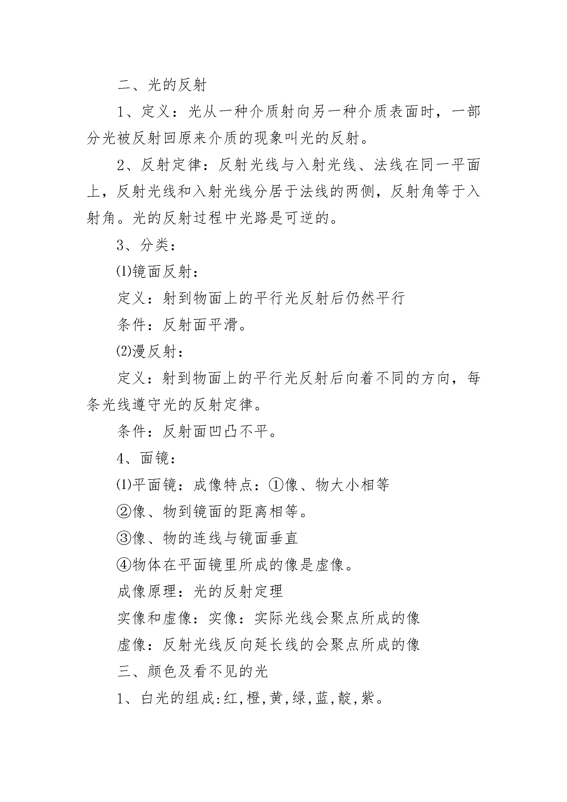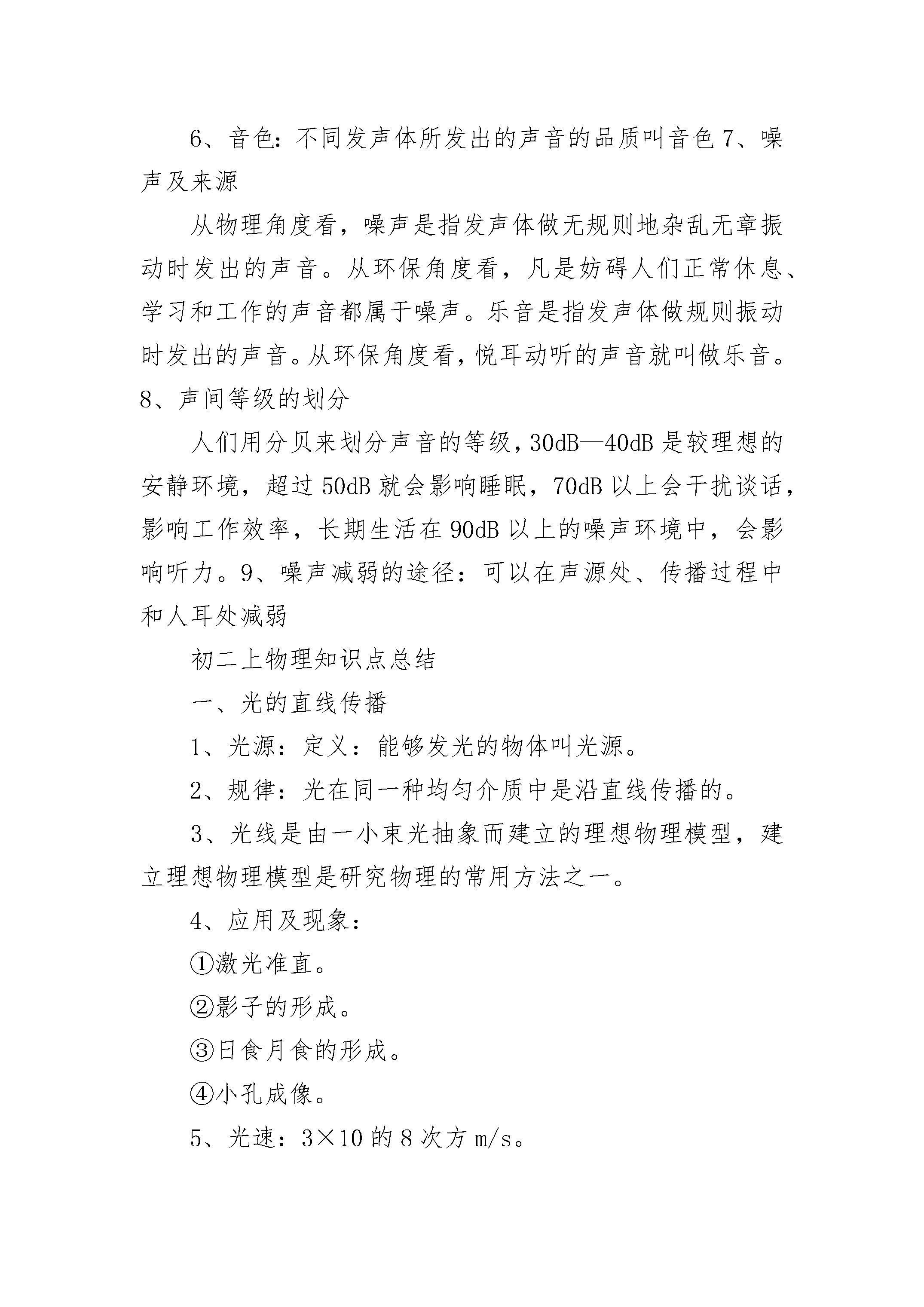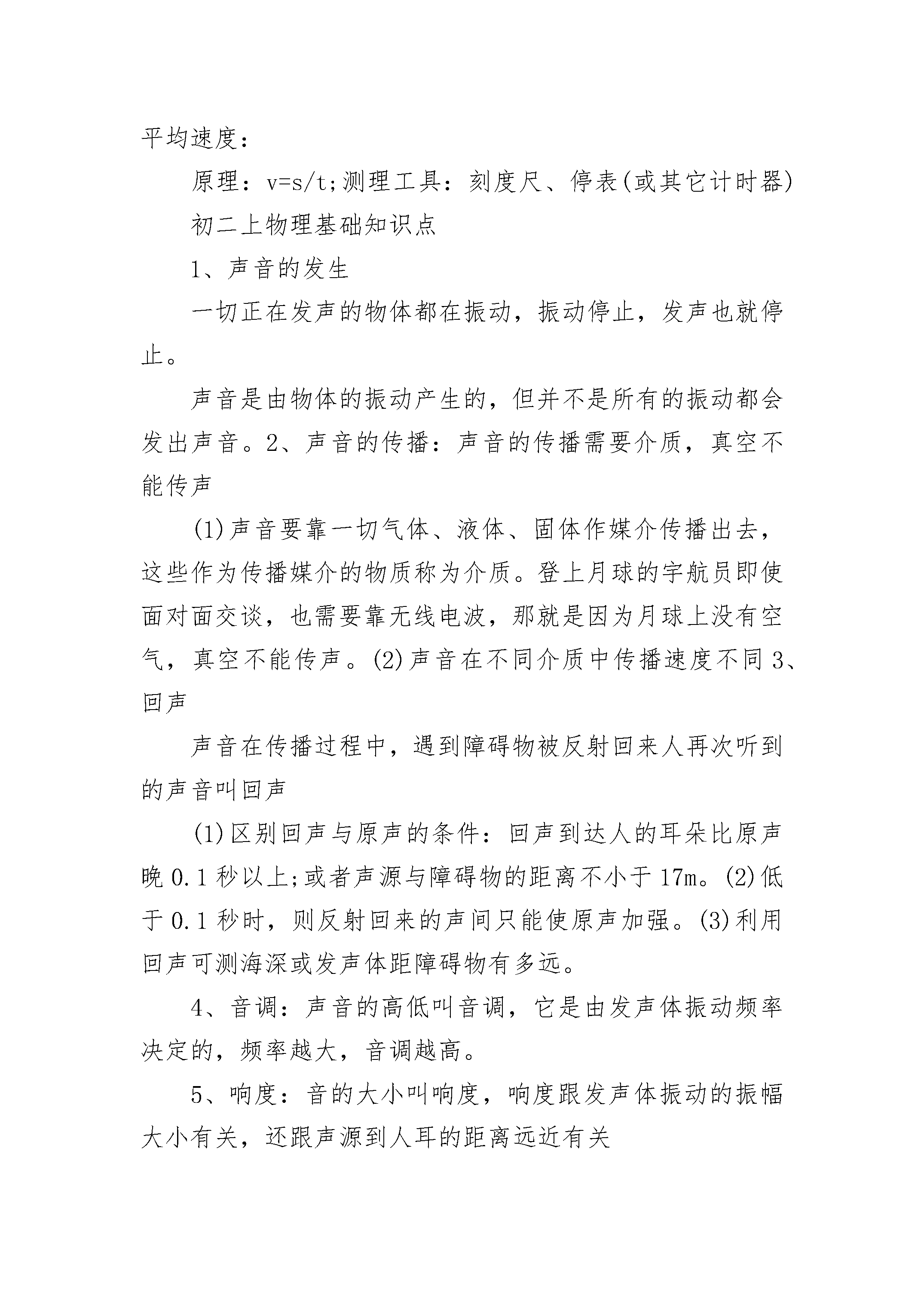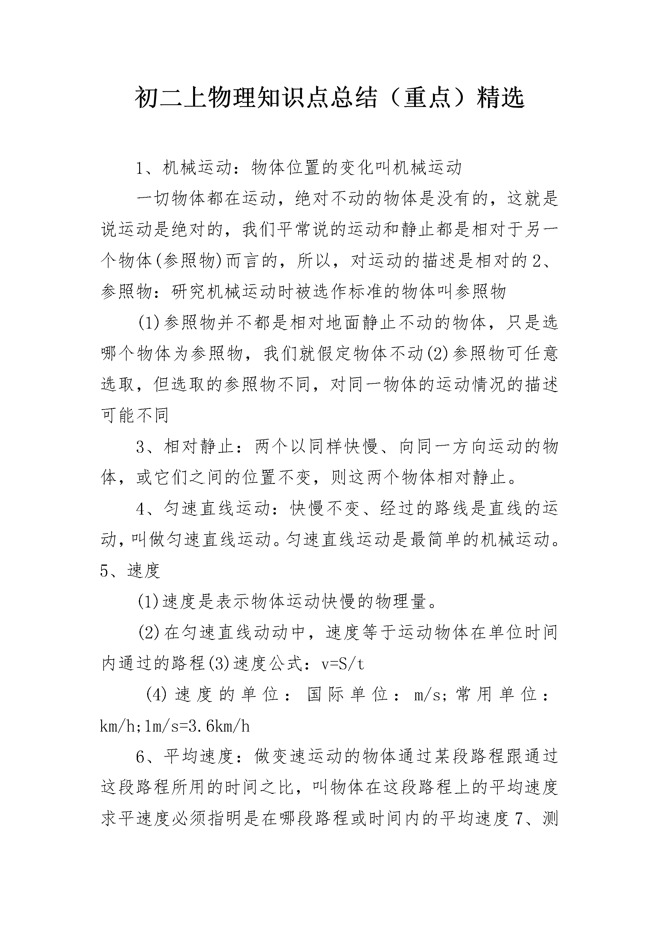 初二上物理知识点总结(重点)精选1、机械运动:物体位置的变化叫机械运动一切物体都在运动,绝对不动的物体是没有的,这就是说运动是绝对的,我们平常说的运动和静止都是相对于另一个物体(参照物)而言的,所以,对运动的描述是相对的2、参照物:研究机械运动时被选作标准的物体叫参照物(1)参照物并不都是相对地面静止不动的物体,只是选哪个物体为参照物,我们就假定物体不动(2)参照物可任意选取,但选取的参照物不同,对同一物体的运动情况的描述可能不同3、相对静止:两个以同样快慢、向同一方向运动的物体,或它们之间的位置不变,则这两个物体相对静止。4、匀速直线运动:快慢不变、经过的路线是直线的运动,叫做匀速直线运动。匀速直线运动是最简单的机械运动。5、速度(1)速度是表示物体运动快慢的物理量。(2)在匀速直线动动中,速度等于运动物体在单位时间内通过的路程(3)速度公式:v=S/t(4)速度的单位:国际单位:m/s;常用单位:km/h;1m/s=3.6km/h6、平均速度:做变速运动的物体通过某段路程跟通过这段路程所用的时间之比,叫物体在这段路程上的平均速度求平速度必须指明是在哪段路程或时间内的平均速度7、测平均速度:原理:v=s/t;测理工具:刻度尺、停表(或其它计时器)初二上物理基础知识点1、声音的发生一切正在发声的物体都在振动,振动停止,发声也就停止。声音是由物体的振动产生的,但并不是所有的振动都会发出声音。2、声音的传播:声音的传播需要介质,真空不能传声(1)声音要靠一切气体、液体、固体作媒介传播出去,这些作为传播媒介的物质称为介质。登上月球的宇航员即使面对面交谈,也需要靠无线电波,那就是因为月球上没有空气,真空不能传声。(2)声音在不同介质中传播速度不同3、回声声音在传播过程中,遇到障碍物被反射回来人再次听到的声音叫回声(1)区别回声与原声的条件:回声到达人的耳朵比原声晚0.1秒以上;或者声源与障碍物的距离不小于17m。(2)低于0.1秒时,则反射回来的声间只能使原声加强。(3)利用回声可测海深或发声体距障碍物有多远。4、音调:声音的高低叫音调,它是由发声体振动频率决定的,频率越大,音调越高。5、响度:音的大小叫响度,响度跟发声体振动的振幅大小有关,还跟声源到人耳的距离远近有关6、音色:不同发声体所发出的声音的品质叫音色7、噪声及来源从物理角度看,噪声是指发声体做无规则地杂乱无章振动时发出的声音。从环保角度看,凡是妨碍人们正常休息、学习和工作的声音都属于噪声。乐音是指发声体做规则振动时发出的声音。从环保角度看,悦耳动听的声音就叫做乐音。8、声间等级的划分人们用分贝来划分声音的等级,30dB—40dB是较理想的安静环境,超过50dB就会影响睡眠,70dB以上会干扰谈话,影响工作效率,长期生活在90dB以上的噪声环境中,会影响听力。9、噪声减弱的途径:可以在声源处、传播过程中和人耳处减弱初二上物理知识点总结一、光的直线传播1、光源:定义:能够发光的物体叫光源。2、规律:光在同一种均匀介质中是沿直线传播的。3、光线是由一小束光抽象而建立的理想物理模型,建立理想物理模型是研究物理的常用方法之一。4、应用及现象:①激光准直。②影子的形成。③日食月食的形成。④小孔成像。5、光速:3×10的8次方m/s。二、光的反射1、定义:光从一种介质射向另一种介质表面时,一部分光被反射回原来介质的现象叫光的反射。2、反射定律:反射光线与入射光线、法线在同一平面上,反射光线和入射光线分居于法线的两侧,反射角等于入射角。光的反射过程中光路是可逆的。3、分类:⑴镜面反射:定义:射到物面上的平行光反射后仍然平行条件:反射面平滑。⑵漫反射:定义:射到物面上的平行光反射后向着不同的方向,每条光线遵守光的反射定律。条件:反射面凹凸不平。4、面镜:⑴平面镜:成像特点:①像、物大小相等②像、物到镜面的距离相等。③像、物的连线与镜面垂直④物体在平面镜里所成的像是虚像。成像原理:光的反射定理实像和虚像:实像:实际光线会聚点所成的像虚像:反射光线反向延长线的会聚点所成的像三、颜色及看不见的光1、白光的组成:红,橙,黄,绿,蓝,靛,紫。2、看不见的光:红外线,紫外线。