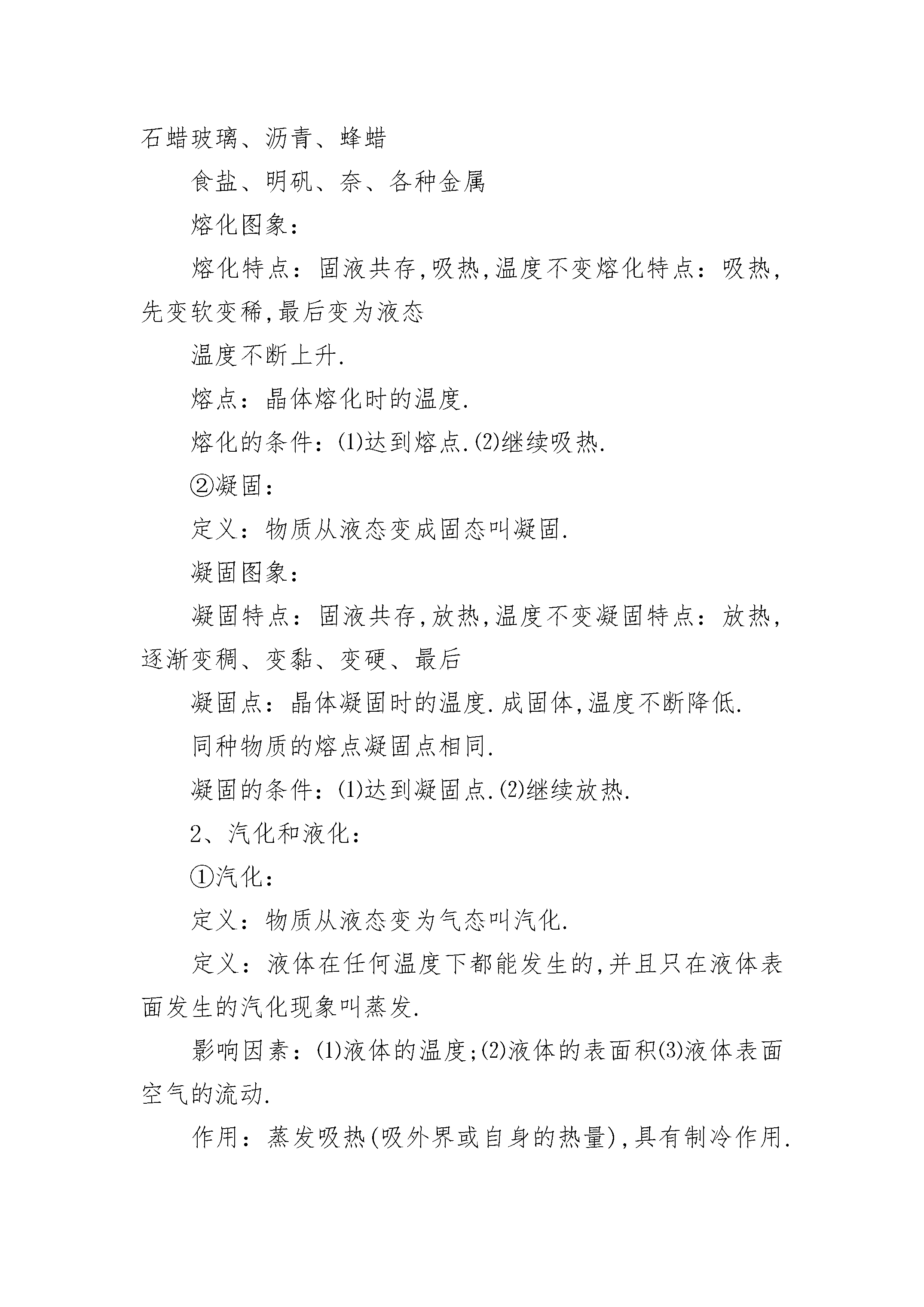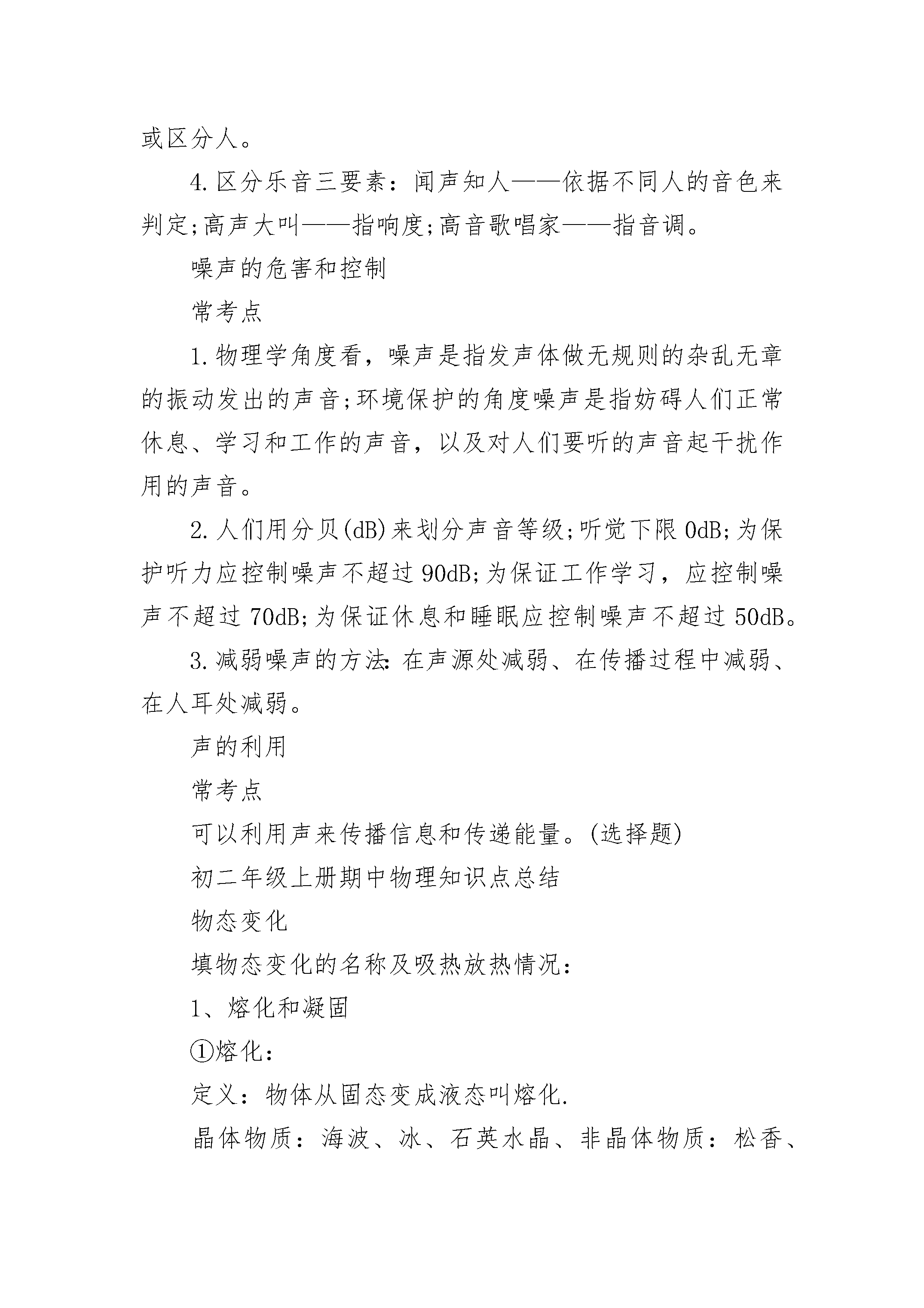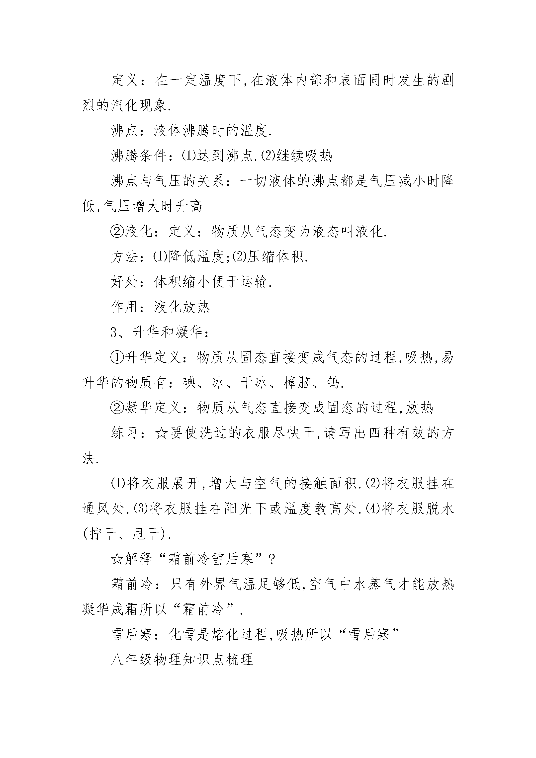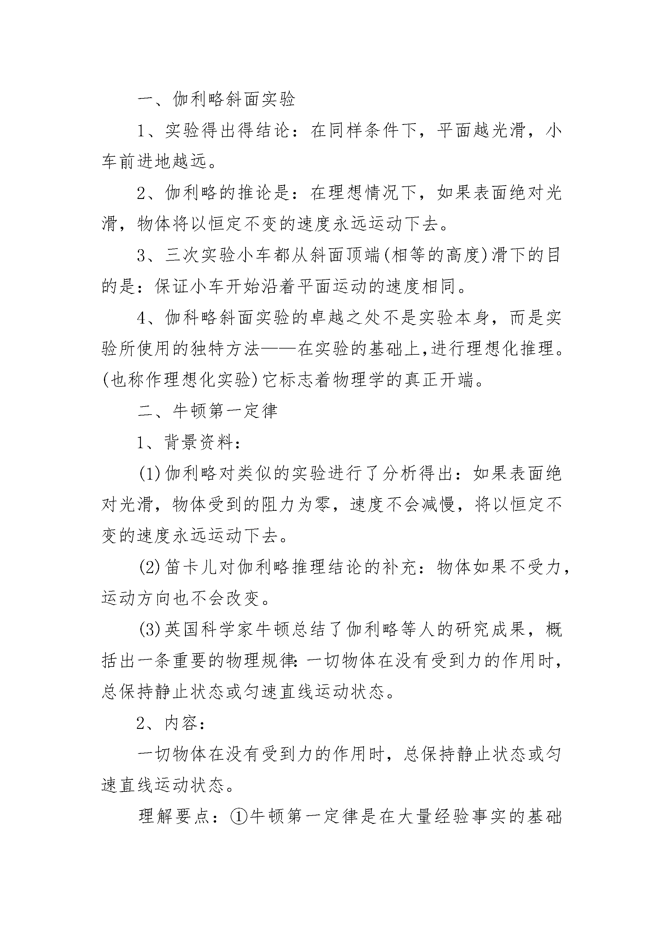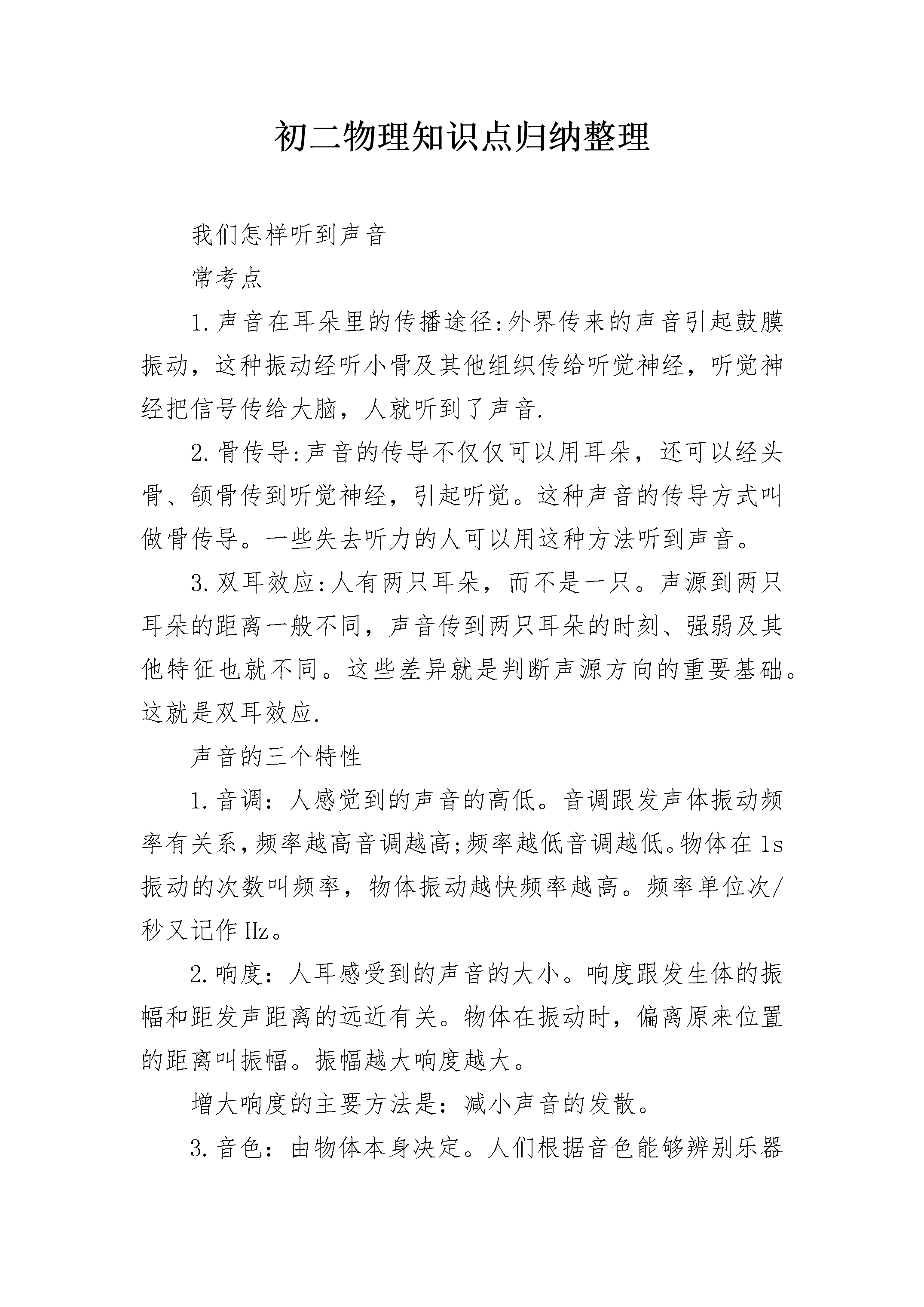 初二物理知识点归纳整理我们怎样听到声音常考点1.声音在耳朵里的传播途径:外界传来的声音引起鼓膜振动,这种振动经听小骨及其他组织传给听觉神经,听觉神经把信号传给大脑,人就听到了声音.2.骨传导:声音的传导不仅仅可以用耳朵,还可以经头骨、颌骨传到听觉神经,引起听觉。这种声音的传导方式叫做骨传导。一些失去听力的人可以用这种方法听到声音。3.双耳效应:人有两只耳朵,而不是一只。声源到两只耳朵的距离一般不同,声音传到两只耳朵的时刻、强弱及其他特征也就不同。这些差异就是判断声源方向的重要基础。这就是双耳效应.声音的三个特性1.音调:人感觉到的声音的高低。音调跟发声体振动频率有关系,频率越高音调越高;频率越低音调越低。物体在1s振动的次数叫频率,物体振动越快频率越高。频率单位次/秒又记作Hz。2.响度:人耳感受到的声音的大小。响度跟发生体的振幅和距发声距离的远近有关。物体在振动时,偏离原来位置的距离叫振幅。振幅越大响度越大。增大响度的主要方法是:减小声音的发散。3.音色:由物体本身决定。人们根据音色能够辨别乐器或区分人。4.区分乐音三要素:闻声知人——依据不同人的音色来判定;高声大叫——指响度;高音歌唱家——指音调。噪声的危害和控制常考点1.物理学角度看,噪声是指发声体做无规则的杂乱无章的振动发出的声音;环境保护的角度噪声是指妨碍人们正常休息、学习和工作的声音,以及对人们要听的声音起干扰作用的声音。2.人们用分贝(dB)来划分声音等级;听觉下限0dB;为保护听力应控制噪声不超过90dB;为保证工作学习,应控制噪声不超过70dB;为保证休息和睡眠应控制噪声不超过50dB。3.减弱噪声的方法:在声源处减弱、在传播过程中减弱、在人耳处减弱。声的利用常考点可以利用声来传播信息和传递能量。(选择题)初二年级上册期中物理知识点总结物态变化填物态变化的名称及吸热放热情况:1、熔化和凝固①熔化:定义:物体从固态变成液态叫熔化.晶体物质:海波、冰、石英水晶、非晶体物质:松香、石蜡玻璃、沥青、蜂蜡食盐、明矾、奈、各种金属熔化图象:熔化特点:固液共存,吸热,温度不变熔化特点:吸热,先变软变稀,最后变为液态温度不断上升.熔点:晶体熔化时的温度.熔化的条件:⑴达到熔点.⑵继续吸热.②凝固:定义:物质从液态变成固态叫凝固.凝固图象:凝固特点:固液共存,放热,温度不变凝固特点:放热,逐渐变稠、变黏、变硬、最后凝固点:晶体凝固时的温度.成固体,温度不断降低.同种物质的熔点凝固点相同.凝固的条件:⑴达到凝固点.⑵继续放热.2、汽化和液化:①汽化:定义:物质从液态变为气态叫汽化.定义:液体在任何温度下都能发生的,并且只在液体表面发生的汽化现象叫蒸发.影响因素:⑴液体的温度;⑵液体的表面积⑶液体表面空气的流动.作用:蒸发吸热(吸外界或自身的热量),具有制冷作用.定义:在一定温度下,在液体内部和表面同时发生的剧烈的汽化现象.沸点:液体沸腾时的温度.沸腾条件:⑴达到沸点.⑵继续吸热沸点与气压的关系:一切液体的沸点都是气压减小时降低,气压增大时升高②液化:定义:物质从气态变为液态叫液化.方法:⑴降低温度;⑵压缩体积.好处:体积缩小便于运输.作用:液化放热3、升华和凝华:①升华定义:物质从固态直接变成气态的过程,吸热,易升华的物质有:碘、冰、干冰、樟脑、钨.②凝华定义:物质从气态直接变成固态的过程,放热练习:☆要使洗过的衣服尽快干,请写出四种有效的方法.⑴将衣服展开,增大与空气的接触面积.⑵将衣服挂在通风处.⑶将衣服挂在阳光下或温度教高处.⑷将衣服脱水(拧干、甩干).☆解释“霜前冷雪后寒”?霜前冷:只有外界气温足够低,空气中水蒸气才能放热凝华成霜所以“霜前冷”.雪后寒:化雪是熔化过程,吸热所以“雪后寒”八年级物理知识点梳理一、伽利略斜面实验1、实验得出得结论:在同样条件下,平面越光滑,小车前进地越远。2、伽利略的推论是:在理想情况下,如果表面绝对光滑,物体将以恒定不变的速度永远运动下去。3、三次实验小车都从斜面顶端(相等的高度)滑下的目的是:保证小车开始沿着平面运动的速度相同。4、伽科略斜面实验的卓越之处不是实验本身,而是实验所使用的独特方法——在实验的基础上,进行理想化推理。(也称作理想化实验)它标志着物理学的真正开端。二、牛顿第一定律1、背景资料:(1)伽利略对类似的实验进行了分析得出:如果表面绝对光滑,物体受到的阻力为零,速度不会减慢,将以恒定不变的速度永远运动下去。(2)笛卡儿对伽利略推理结论的补充:物体如果不受力,运动方向也不会改变。(3)英国科学家牛顿总结了伽利略等人的研究成果,概括出一条重要的物理规律:一切物体在没有受到力的作用时,总保持静止状态或匀速直线运动状态。2、内容:一切物体在没有受到力的作用时,总保持静止状态或匀速直线运动状态。理解要点:①牛顿第一定律是在大量经