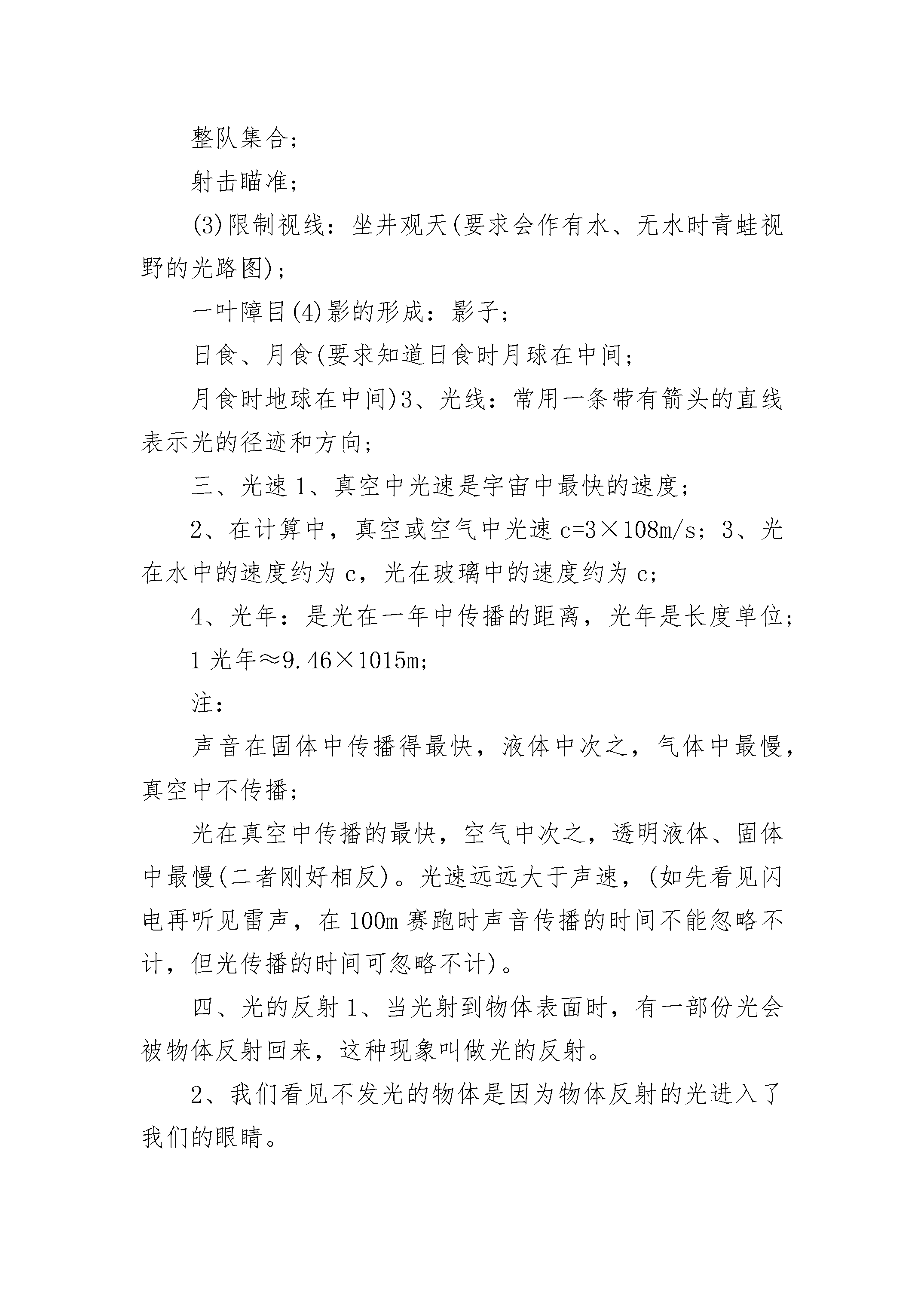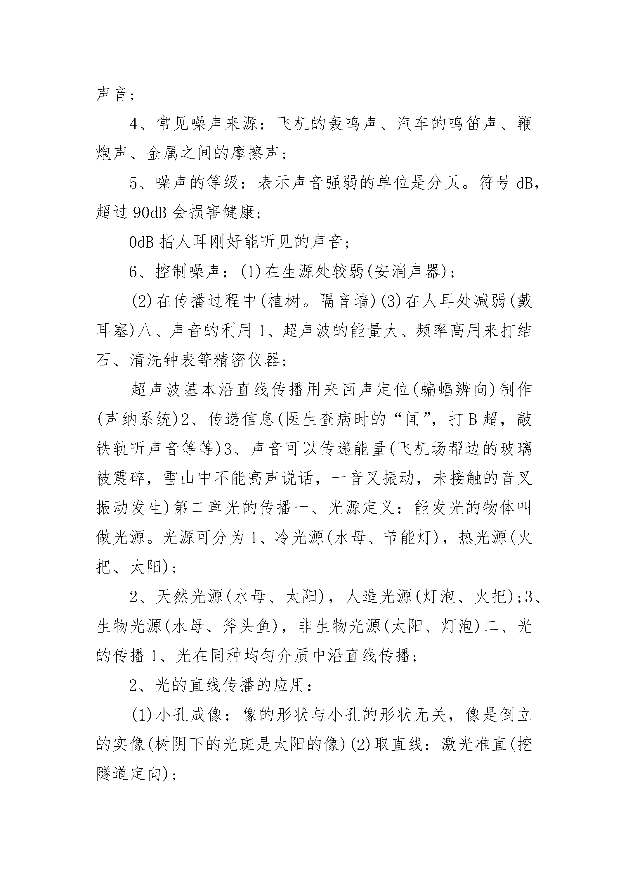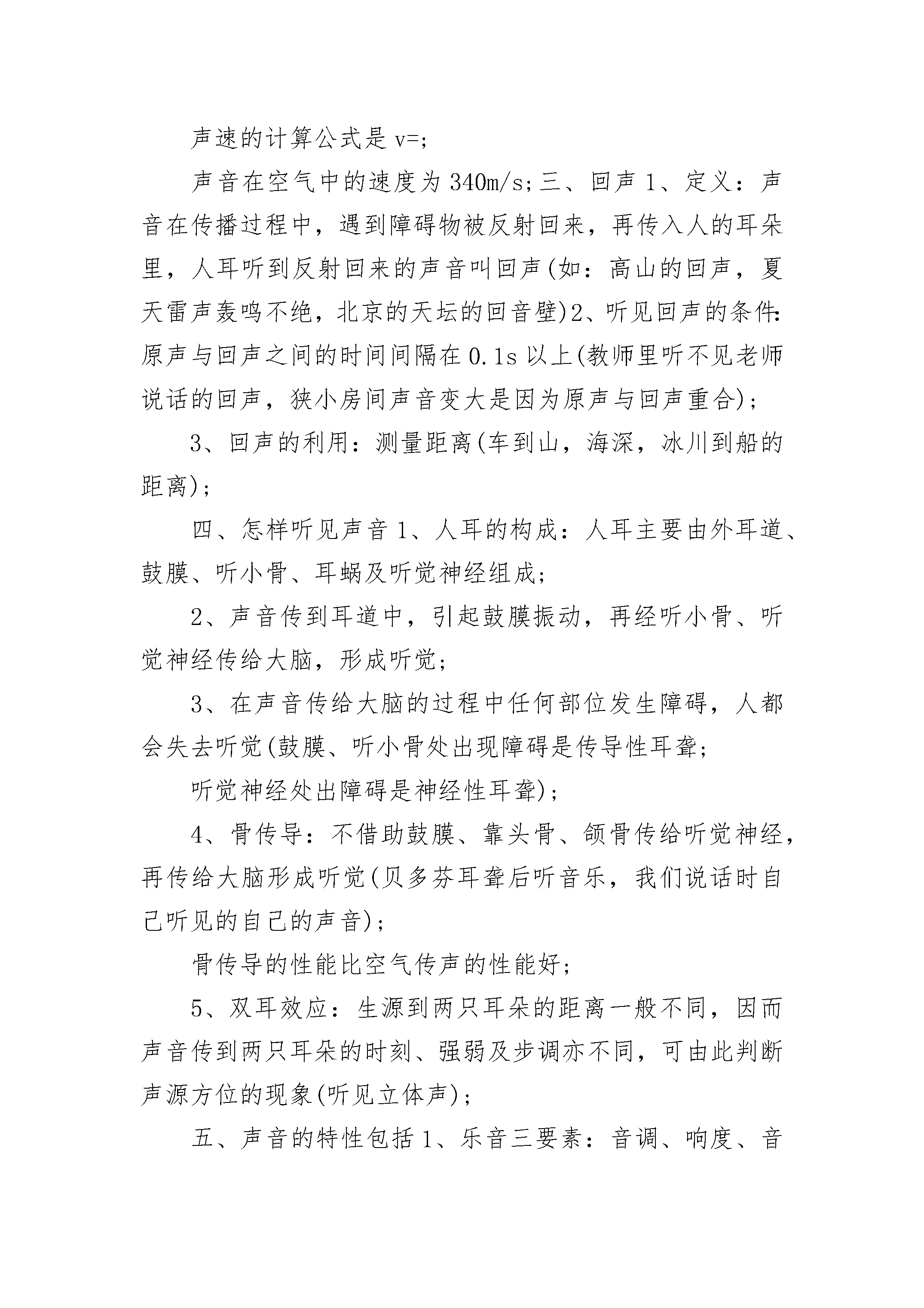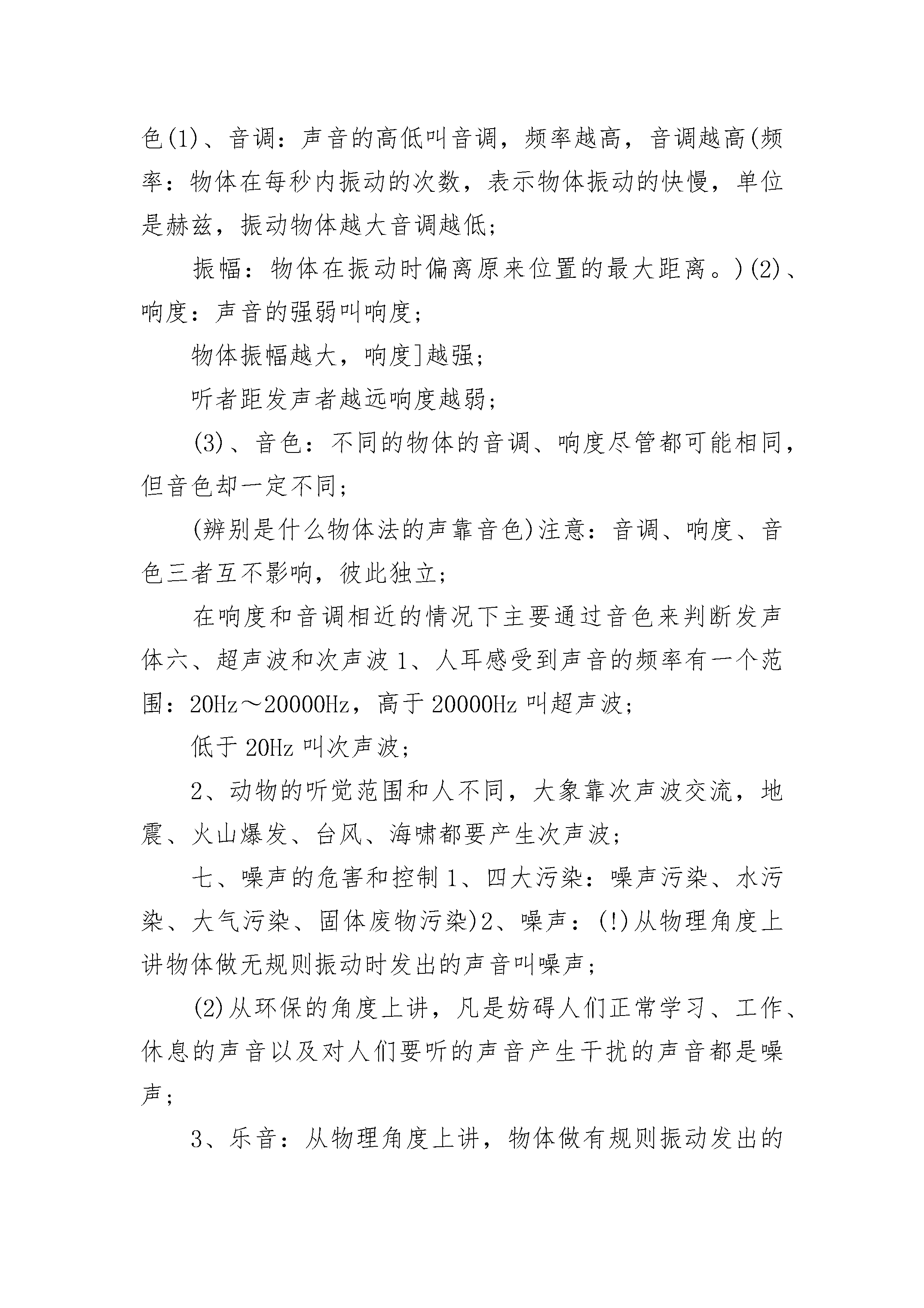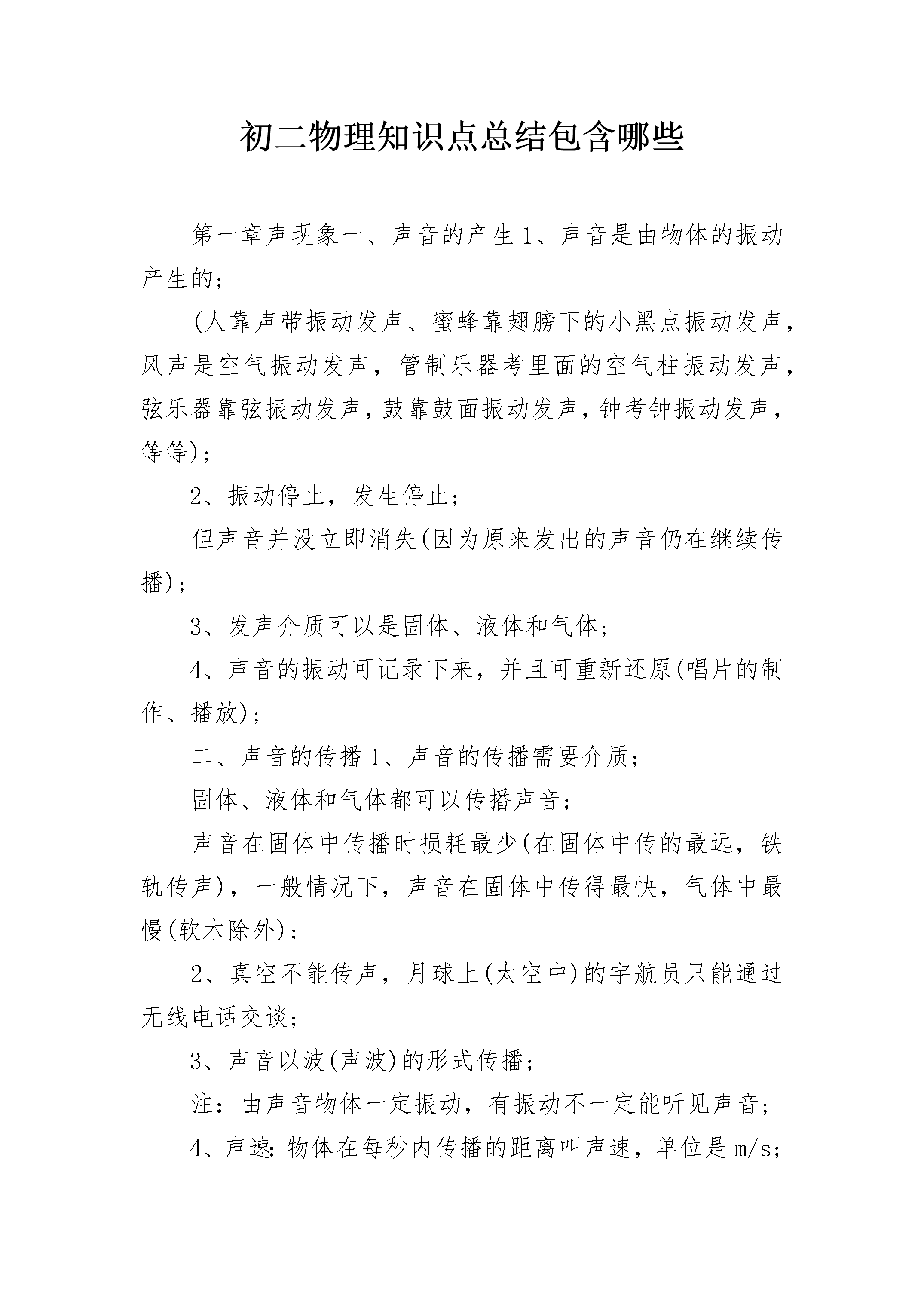 初二物理知识点总结包含哪些第一章声现象一、声音的产生1、声音是由物体的振动产生的;(人靠声带振动发声、蜜蜂靠翅膀下的小黑点振动发声,风声是空气振动发声,管制乐器考里面的空气柱振动发声,弦乐器靠弦振动发声,鼓靠鼓面振动发声,钟考钟振动发声,等等);2、振动停止,发生停止;但声音并没立即消失(因为原来发出的声音仍在继续传播);3、发声介质可以是固体、液体和气体;4、声音的振动可记录下来,并且可重新还原(唱片的制作、播放);二、声音的传播1、声音的传播需要介质;固体、液体和气体都可以传播声音;声音在固体中传播时损耗最少(在固体中传的最远,铁轨传声),一般情况下,声音在固体中传得最快,气体中最慢(软木除外);2、真空不能传声,月球上(太空中)的宇航员只能通过无线电话交谈;3、声音以波(声波)的形式传播;注:由声音物体一定振动,有振动不一定能听见声音;4、声速:物体在每秒内传播的距离叫声速,单位是m/s;声速的计算公式是v=;声音在空气中的速度为340m/s;三、回声1、定义:声音在传播过程中,遇到障碍物被反射回来,再传入人的耳朵里,人耳听到反射回来的声音叫回声(如:高山的回声,夏天雷声轰鸣不绝,北京的天坛的回音壁)2、听见回声的条件:原声与回声之间的时间间隔在0.1s以上(教师里听不见老师说话的回声,狭小房间声音变大是因为原声与回声重合);3、回声的利用:测量距离(车到山,海深,冰川到船的距离);四、怎样听见声音1、人耳的构成:人耳主要由外耳道、鼓膜、听小骨、耳蜗及听觉神经组成;2、声音传到耳道中,引起鼓膜振动,再经听小骨、听觉神经传给大脑,形成听觉;3、在声音传给大脑的过程中任何部位发生障碍,人都会失去听觉(鼓膜、听小骨处出现障碍是传导性耳聋;听觉神经处出障碍是神经性耳聋);4、骨传导:不借助鼓膜、靠头骨、颌骨传给听觉神经,再传给大脑形成听觉(贝多芬耳聋后听音乐,我们说话时自己听见的自己的声音);骨传导的性能比空气传声的性能好;5、双耳效应:生源到两只耳朵的距离一般不同,因而声音传到两只耳朵的时刻、强弱及步调亦不同,可由此判断声源方位的现象(听见立体声);五、声音的特性包括1、乐音三要素:音调、响度、音色(1)、音调:声音的高低叫音调,频率越高,音调越高(频率:物体在每秒内振动的次数,表示物体振动的快慢,单位是赫兹,振动物体越大音调越低;振幅:物体在振动时偏离原来位置的最大距离。)(2)、响度:声音的强弱叫响度;物体振幅越大,响度]越强;听者距发声者越远响度越弱;(3)、音色:不同的物体的音调、响度尽管都可能相同,但音色却一定不同;(辨别是什么物体法的声靠音色)注意:音调、响度、音色三者互不影响,彼此独立;在响度和音调相近的情况下主要通过音色来判断发声体六、超声波和次声波1、人耳感受到声音的频率有一个范围:20Hz~20000Hz,高于20000Hz叫超声波;低于20Hz叫次声波;2、动物的听觉范围和人不同,大象靠次声波交流,地震、火山爆发、台风、海啸都要产生次声波;七、噪声的危害和控制1、四大污染:噪声污染、水污染、大气污染、固体废物污染)2、噪声:(!)从物理角度上讲物体做无规则振动时发出的声音叫噪声;(2)从环保的角度上讲,凡是妨碍人们正常学习、工作、休息的声音以及对人们要听的声音产生干扰的声音都是噪声;3、乐音:从物理角度上讲,物体做有规则振动发出的声音;4、常见噪声来源:飞机的轰鸣声、汽车的鸣笛声、鞭炮声、金属之间的摩擦声;5、噪声的等级:表示声音强弱的单位是分贝。符号dB,超过90dB会损害健康;0dB指人耳刚好能听见的声音;6、控制噪声:(1)在生源处较弱(安消声器);(2)在传播过程中(植树。隔音墙)(3)在人耳处减弱(戴耳塞)八、声音的利用1、超声波的能量大、频率高用来打结石、清洗钟表等精密仪器;超声波基本沿直线传播用来回声定位(蝙蝠辨向)制作(声纳系统)2、传递信息(医生查病时的“闻”,打B超,敲铁轨听声音等等)3、声音可以传递能量(飞机场帮边的玻璃被震碎,雪山中不能高声说话,一音叉振动,未接触的音叉振动发生)第二章光的传播一、光源定义:能发光的物体叫做光源。光源可分为1、冷光源(水母、节能灯),热光源(火把、太阳);2、天然光源(水母、太阳),人造光源(灯泡、火把);3、生物光源(水母、斧头鱼),非生物光源(太阳、灯泡)二、光的传播1、光在同种均匀介质中沿直线传播;2、光的直线传播的应用:(1)小孔成像:像的形状与小孔的形状无关,像是倒立的实像(树阴下的光斑是太阳的像)(2)取直线:激光准直(挖隧道定向);整队集合;射击瞄准;(3)限制视线:坐井观天(要求会作有水、无水时青蛙视野的光路图);一叶障目(4)影的形成:影子;日食、月食(要求知道日食时月球在中间;月食时地球在中间)3、光线:常用一条带有箭头的直线表示