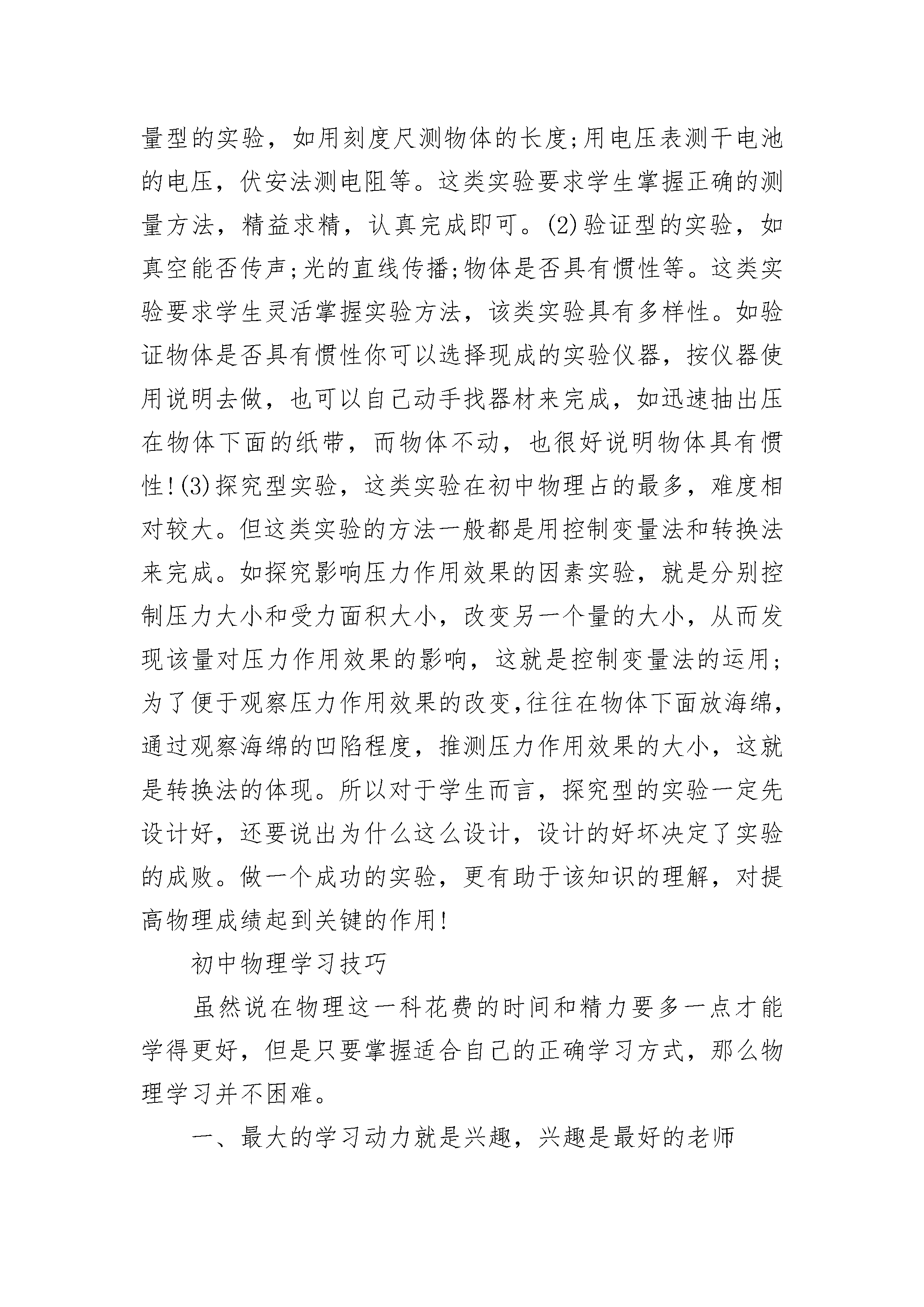提高初中物理成绩的方法1重视基础物理知识初中的物理相比于高中的物理其实难度不是一个层次的,初中生现在如果学不好物理可就要加把劲了,因为现在的物理关系到以后的高中文理分科,如果你选择理科但是物理学不好那就很吃亏的。提高物理成绩的方法,首先就是要扎实自己的基础知识,中考的考试内容不过就是围绕课本上的知识点进行的延展。初中生们只要把基础知识打好,就不用害怕后面的知识延展。2各种公式的记忆物理其实就是由各种不同的公式、知识点组成的。初中的物理其实大多数都会跟生活有关,很多时候初中生在学习物理的时候多联系一下生活,就会发现,其实物理是一门特别有意思的学科,很多课本上的知识可能在生活中都是很常见的,这个时候再去联想物理的公式就会很大程度上加深印象,初中生要想学好物理,就必须要对这些物理公式理解性的记忆。3掌握基础的解题方法基础知识扎实之后就要开始练习各种习题了,有名言说的好“掌握一种解题方法比做一百道更重要”,物理题做的多了就会发现其实这些做题的套路基本上都是大相径庭的,初中生想要提高自己的物理成绩光靠死记硬背是不可能的,必须要在做题总提高自己的水平。灵活的运用这些物理公式,并且能记住这些公式都是按照怎样的一个规律去应用的各种类型题当中的。初中生如何提高物理成绩对于学生来说,一般从八年级开始就要学习物理,作为一名工作了20年的物理老师,教过的学生大约有几千,在这几千学生中,物理成绩好的和物理成绩不好的相差非常悬殊。我所任教的学校地处农村,学生成绩总体较差,在历年的中考中,物理成绩较好的学生可以考到60分甚至65分以上,而物理成绩不好的学生,只考个位数,甚至有的只考二三分!同样的老师教,为什么物理成绩有如此大的差距呢?除了跟学生智商和学生努力程度有关之外,学习方法也起到至关重要的作用。下面我将从学习方法入手,谈谈如何提高物理的成绩。1、记忆一些知识点。虽然对物理的学习要求没有强迫学生记忆知识点,但学习物理绝对离不开记忆。像一些概念、公式、定理等需要学生牢记于心。由于学生的年龄尚小,有些知识点可能并不理解,如骨传导、比热容、托里拆利实验、飞机的升力等,这些知识点学生在理解起来比较吃力,万一理解不了其实也不可怕,我们可以采取机械的记忆,它的用法、公式、形状等牢记于心,当遇到相关问题后,即使你不能理解这些知识点,但往往并不影响你做题,当你做题多了,用的次数多了,你会发现慢慢的你理解了这些知识点。这正应了古语:书读百遍,其义自见。如果你不记忆这些知识,用到后只是机械的翻书查找,大脑缺少对该知识点的印象,也许你永远不能理解。在物理学习中有些知识必须记忆,如一些定义、定理、数值、过程方法等。所以对于物理的学习,该记忆的必须记忆,记忆也是一种学习。2、努力去理解知识点。物理知识的设计大体是按照学生年龄特征、认知水平、学习规律设计的,所以没有太难理解的知识,因此每位学生都要努力去理解这些知识点。在理解这些知识点时,要多问几个为什么,有助于你的理解。如学习“飞机的升力”知识点时,可以试着这样理解:飞机的机翼为什么设计成上凸下平的形状;流过机翼上方的空气速度为什么大于机翼下方的速度;飞机的升力和机翼上下表面受到的压力有何关系等。这样我们把复杂的问题层层分解,只要每一层你都能理解了,那么这个知识点你也就真正的理解了。物理学相当一些知识是需要理解了才能学好的,因此每位学生在学习中应该把理解放到首位。3、学习过的知识点多用多练习——温故知新。整个初中物理知识点非常多,许多的学生学了这忘了那,如学习了光学忘了声学;学了热学忘了光学等。因此,学生应该把所学的知识点多加练习,多用一用,加深印象,更不容易忘记。在我所教过的学生中,物理成绩好的学生,往往都做题特别多,不但做正在学习的章节知识,而且还不断做一些已经学过的章节练习题,我教过的一名学生,中考时她的物理考了67分(满分70),她就不断的做以前学习过的知识点,她说这样不断的做做以前的知识,知识不容易忘记,使物理知识点能够更好的衔接,更有助于新知识的学习和接受。4、认真完成实验。物理是以实验为基础得学科,实验占了半壁江山,实验做得好不好,关系到物理成绩的优劣。初中物理实验的分类比较简单,归纳起来无非就是:(1)测量型的实验,如用刻度尺测物体的长度;用电压表测干电池的电压,伏安法测电阻等。这类实验要求学生掌握正确的测量方法,精益求精,认真完成即可。(2)验证型的实验,如真空能否传声;光的直线传播;物体是否具有惯性等。这类实验要求学生灵活掌握实验方法,该类实验具有多样性。如验证物体是否具有惯性你可以选择现成的实验仪器,按仪器使用说明去做,也可以自己动手找器材来完成,如迅速抽出压在物体下面的纸带,而物体不动,也很好说明物体具有惯性!(3)探究型实验,这类实验在初中物理占的最多,难度相对较大。但这类实验的方法一般都是用控制变量法