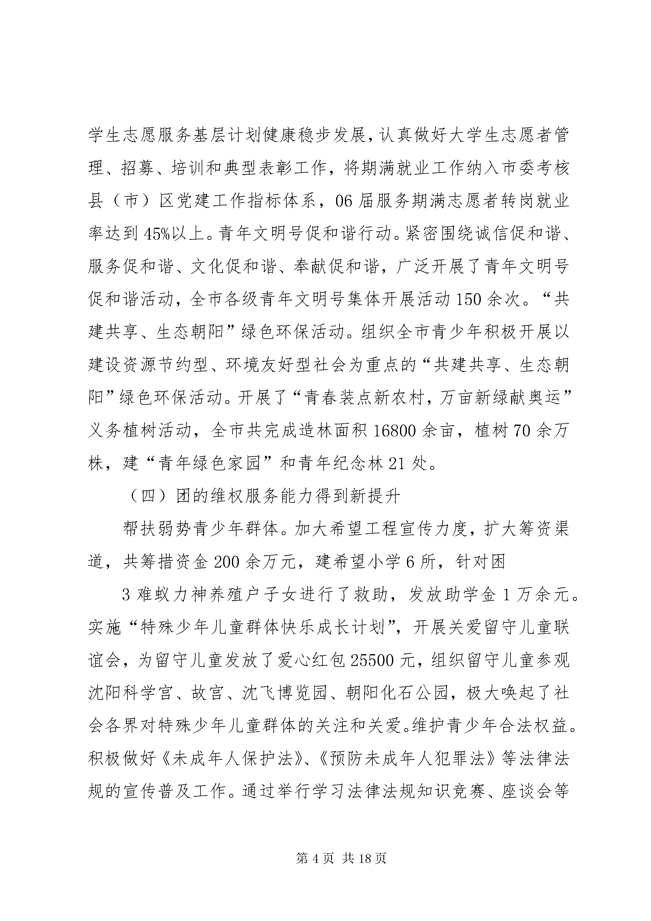 在团市委十七届二次全会上的工作报告凝心聚力真抓实干为实现“突破辽西北、建设新朝阳”贡献青春力量——在共青团XX市委七届九次全体(扩大)会议上的报告(2009年7月2日)刘力各位委员、同志们:这次全会的主要任务是。以邓小平理论和“三个代表”重要思想为指导,深入学习实践科学发展观,全面贯彻落实市委八届八次全会、全市群团工作会议及团省委十二届二次全会精神,认真总结回顾过去全市共青团工作,安排部署下一阶段工作,组织动员全市广大团员青年抢抓机遇,埋头苦干,为实现“突破辽西北、建设新朝阳”贡献青春力量。下面,我受团市委常委会委托向全委会报告工作,请予审议。一、立足实际,奋发有为,全市团的工作呈现蓬勃发展的良好态势全市各级团组织在市委和团省委的正确领导下,坚持以科学发展观为指导,全面履行团的职能,推进各项重点工作,在服务大局、服务青年中做出了积极的贡献,全市团的各项工作和青年事业取得了新的发展。(一)青少年思想教育工作迈上新台阶坚持理论武装。坚持用科学发展观、社会主义核心价值等中国特色社会主义理论体系最新成果武装青少年头脑,广泛开展了“立足新起点、创造新业绩”学习宣传教育活动,全市各级团组织通过举办专题报告会、开展主题团日等切实1有效的方式和载体,教育引导广大青少年牢固树立社会主义核心价值体系。推进道德实践。围绕清明节、五四青年节、改革开放30周年等纪念日,组织开展了祭扫烈士墓、知识竞赛、团员政治生日、诗歌朗诵会等活动。在大中学生中开展了“祖国发展我成长、我为和谐做贡献”、“迈入青春门、走好人生路”等道德实践活动,在小学中开展了理想、信念教育和迎奥运主题队会评选活动,青少年思想道德教育的载体更加丰富,教育效果有效增强。活跃青少年文化。充分结合“3〃5”、“5〃4”、“6〃1”等节庆和纪念日,举办了军地青年大团日、庆六一少先队工作总结表彰和文艺演出等丰富多彩的活动,为我市青少年展示才艺、参与社会实践、提高综合素质搭建了舞台。(二)为经济社会又好又快发展做出新贡献促进青年就业创业。不断拓宽青年就业渠道,充分依托青年创业服务中心和普惠制培训基地,开展青年就业创业技能培训,加大劳务输出力度,全市共安置青年就业2300人;就业技能培训2630人;创业能力培训780人;扶持青年创业90人;农村青年转移就业5100人;农村青年培训6100人;扶持大学生创业就业240人;进城农民工培训120人,特困家庭子女免费高技能培训280人。推动青年创新创效。结合企业对生产岗位的规范和要求,广泛开展青工技能振兴计划,培养青年技能人才。配合企业制定实施对青年技能人才培养、使用、奖励的相关制度,鼓励企业广泛开展各级各类青年职业技能大赛活动,为青年技能人才脱颖而出搭建了广阔舞台。服务新农村建设。以促进农村青年增收和提高综合素质为目标,大力开展了各类实用技能培训和乡村文化活动,培养了一大批有文化、懂技术、会经营的新型青年农民。2引领和扶助农村青年在发展县域经济过程中积极参与工业、农村服务业、优质特色农产品生产和加工基地建设。加强青年经纪人协会队伍建设,共成立各类青年经纪人协会15家,涵盖了种植业、养殖业和个体经济,有效整合了区域资源,延伸了工作手臂,拓展了工作途径。(三)服务和谐社会建设取得新进步青年志愿者行动。有效整合各类志愿服务团体,逐步完善志愿服务体系建设,开展了学雷锋、服务爱国卫生月、服务奥运等主题志愿活动,新建青年志愿服务团队200余支,招募青年志愿者3400余名。开展了“青少年节约环保志愿服务暨绿色环保志愿者招募”启动仪式,表彰了近年来我市志愿服务工作中涌现出来的先进集体和个人,推动了青年志愿服务活动的深入开展。大学生志愿服务基层计划健康稳步发展,认真做好大学生志愿者管理、招募、培训和典型表彰工作,将期满就业工作纳入市委考核县(市)区党建工作指标体系,06届服务期满志愿者转岗就业率达到45%以上。青年文明号促和谐行动。紧密围绕诚信促和谐、服务促和谐、文化促和谐、奉献促和谐,广泛开展了青年文明号促和谐活动,全市各级青年文明号集体开展活动150余次。“共建共享、生态朝阳”绿色环保活动。组织全市青少年积极开展以建设资源节约型、环境友好型社会为重点的“共建共享、生态朝阳”绿色环保活动。开展了“青春装点新农村,万亩新绿献奥运”义务植树活动,全市共完成造林面积16800余亩,植树70余万株,建“青年绿色家园”和青年纪念林21处。(四)团的维权服务能力得到新提升帮扶弱势青少年群体。加大希望工程宣传力度,扩大筹资渠道,共筹措资金200余万元,建希望小学6所,针对困3难蚁力神养殖户子女进行了救助,发放助学金1万余元。实施“特殊少年儿童群体快乐成长计划”,开展关爱留守儿童联谊会,为留守儿童发放了爱心红包25500元,组织留守儿童参观沈阳科学宫、故宫、沈飞博览园、朝阳化石公园,极大唤起