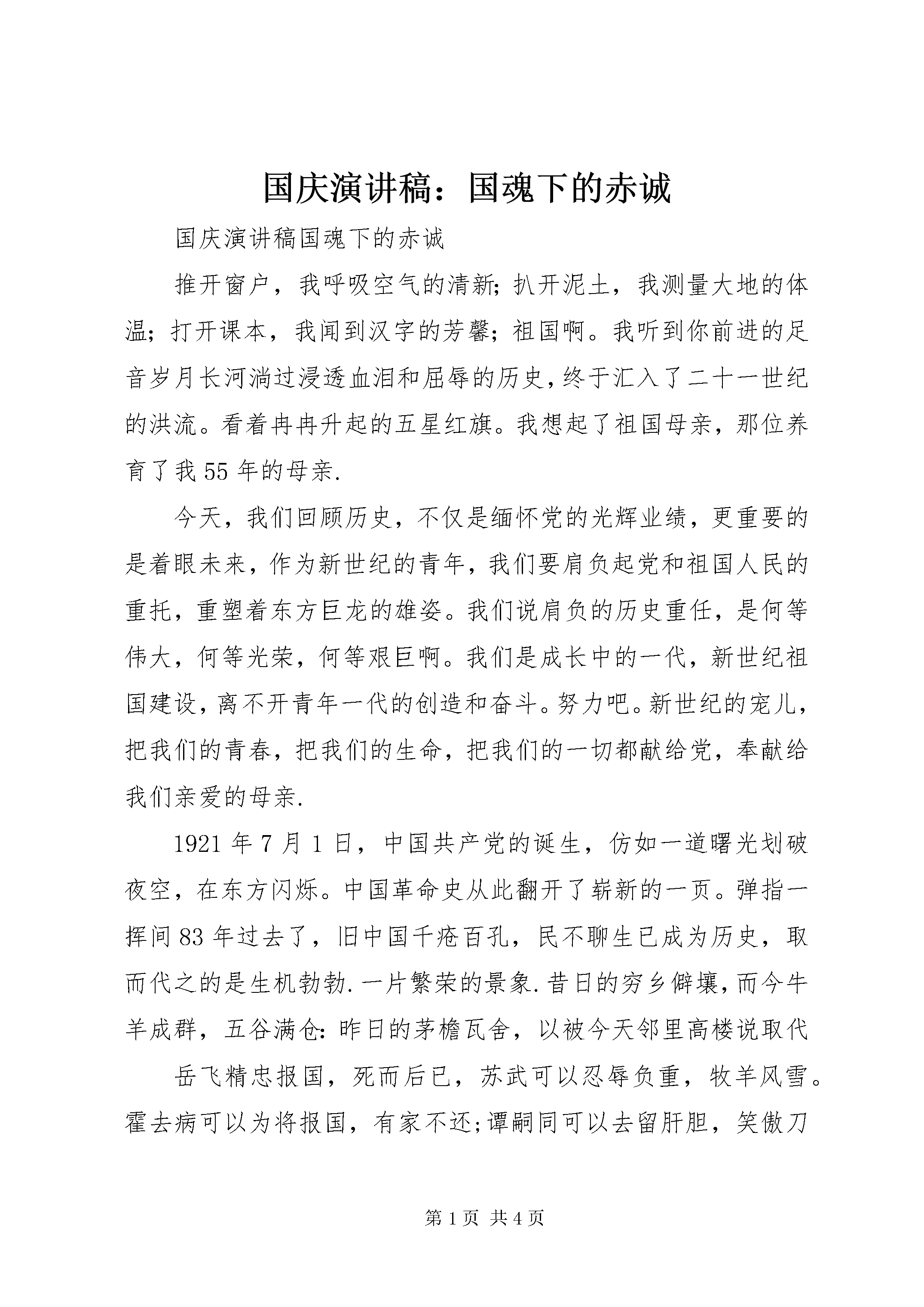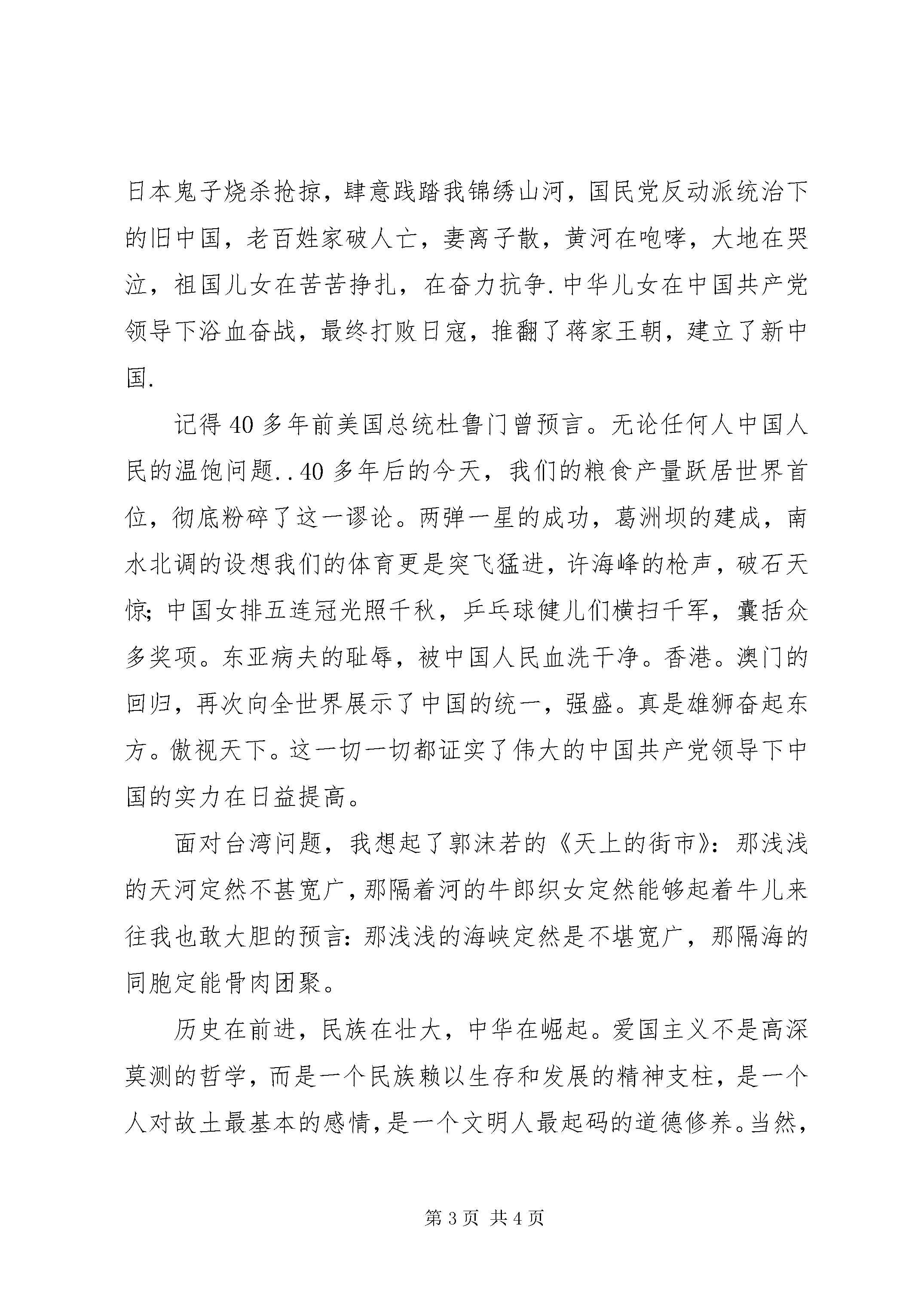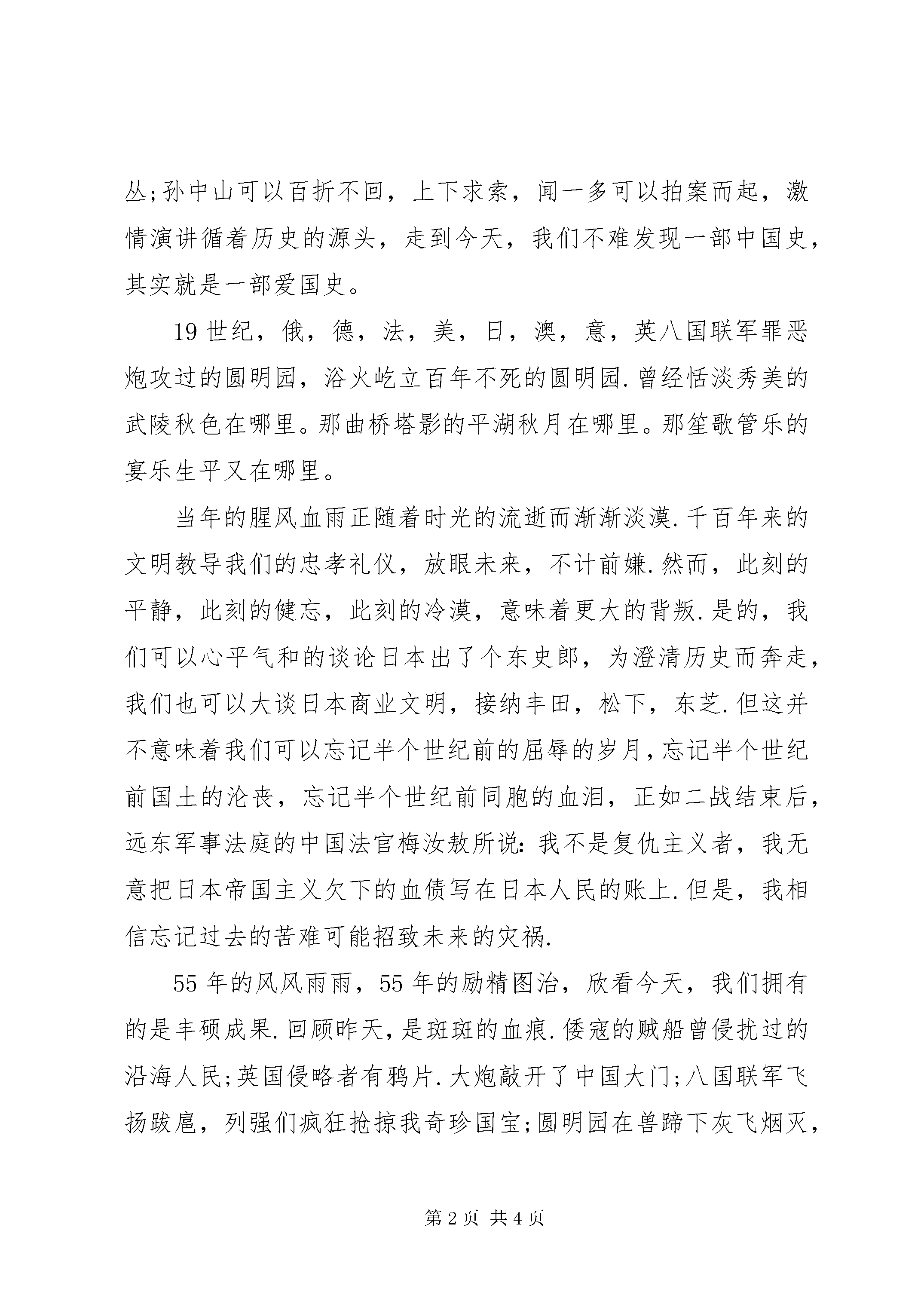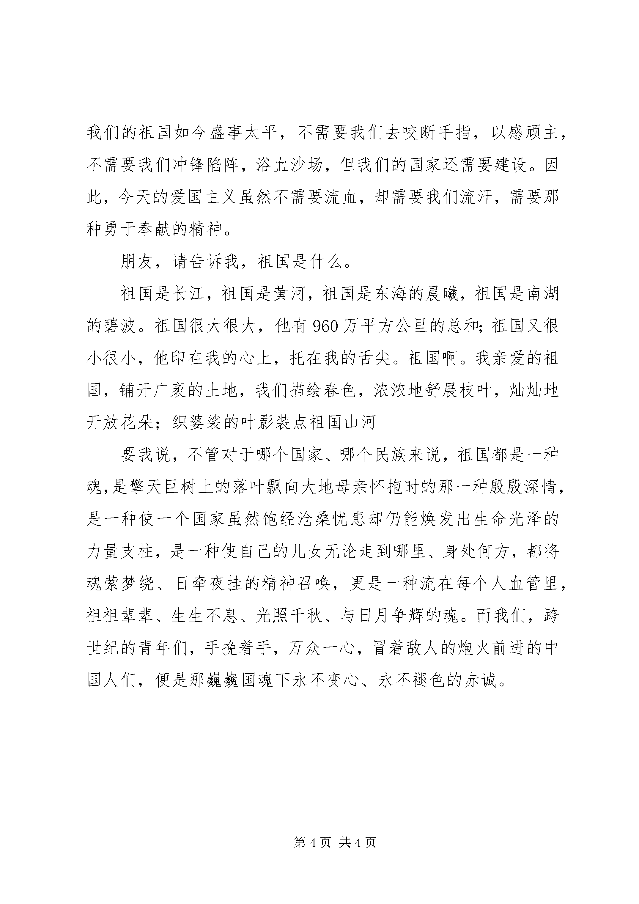 国庆演讲稿:国魂下的赤诚国庆演讲稿国魂下的赤诚推开窗户,我呼吸空气的清新;扒开泥土,我测量大地的体温;打开课本,我闻到汉字的芳馨;祖国啊。我听到你前进的足音岁月长河淌过浸透血泪和屈辱的历史,终于汇入了二十一世纪的洪流。看着冉冉升起的五星红旗。我想起了祖国母亲,那位养育了我55年的母亲.今天,我们回顾历史,不仅是缅怀党的光辉业绩,更重要的是着眼未来,作为新世纪的青年,我们要肩负起党和祖国人民的重托,重塑着东方巨龙的雄姿。我们说肩负的历史重任,是何等伟大,何等光荣,何等艰巨啊。我们是成长中的一代,新世纪祖国建设,离不开青年一代的创造和奋斗。努力吧。新世纪的宠儿,把我们的青春,把我们的生命,把我们的一切都献给党,奉献给我们亲爱的母亲.1921年7月1日,中国共产党的诞生,仿如一道曙光划破夜空,在东方闪烁。中国革命史从此翻开了崭新的一页。弹指一挥间83年过去了,旧中国千疮百孔,民不聊生已成为历史,取而代之的是生机勃勃.一片繁荣的景象.昔日的穷乡僻壤,而今牛羊成群,五谷满仓:昨日的茅檐瓦舍,以被今天邻里高楼说取代岳飞精忠报国,死而后已,苏武可以忍辱负重,牧羊风雪。霍去病可以为将报国,有家不还;谭嗣同可以去留肝胆,笑傲刀丛;孙中山可以百折不回,上下求索,闻一多可以拍案而起,激情演讲循着历史的源头,走到今天,我们不难发现一部中国史,其实就是一部爱国史。19世纪,俄,德,法,美,日,澳,意,英八国联军罪恶炮攻过的圆明园,浴火屹立百年不死的圆明园.曾经恬淡秀美的武陵秋色在哪里。那曲桥塔影的平湖秋月在哪里。那笙歌管乐的宴乐生平又在哪里。当年的腥风血雨正随着时光的流逝而渐渐淡漠.千百年来的文明教导我们的忠孝礼仪,放眼未来,不计前嫌.然而,此刻的平静,此刻的健忘,此刻的冷漠,意味着更大的背叛.是的,我们可以心平气和的谈论日本出了个东史郎,为澄清历史而奔走,我们也可以大谈日本商业文明,接纳丰田,松下,东芝.但这并不意味着我们可以忘记半个世纪前的屈辱的岁月,忘记半个世纪前国土的沦丧,忘记半个世纪前同胞的血泪,正如二战结束后,远东军事法庭的中国法官梅汝敖所说:我不是复仇主义者,我无意把日本帝国主义欠下的血债写在日本人民的账上.但是,我相信忘记过去的苦难可能招致未来的灾祸.55年的风风雨雨,55年的励精图治,欣看今天,我们拥有的是丰硕成果.回顾昨天,是斑斑的血痕.倭寇的贼船曾侵扰过的沿海人民;英国侵略者有鸦片.大炮敲开了中国大门;八国联军飞扬跋扈,列强们疯狂抢掠我奇珍国宝;圆明园在兽蹄下灰飞烟灭,日本鬼子烧杀抢掠,肆意践踏我锦绣山河,国民党反动派统治下的旧中国,老百姓家破人亡,妻离子散,黄河在咆哮,大地在哭泣,祖国儿女在苦苦挣扎,在奋力抗争.中华儿女在中国共产党领导下浴血奋战,最终打败日寇,推翻了蒋家王朝,建立了新中国.记得40多年前美国总统杜鲁门曾预言。无论任何人中国人民的温饱问题..40多年后的今天,我们的粮食产量跃居世界首位,彻底粉碎了这一谬论。两弹一星的成功,葛洲坝的建成,南水北调的设想我们的体育更是突飞猛进,许海峰的枪声,破石天惊;中国女排五连冠光照千秋,乒乓球健儿们横扫千军,囊括众多奖项。东亚病夫的耻辱,被中国人民血洗干净。香港。澳门的回归,再次向全世界展示了中国的统一,强盛。真是雄狮奋起东方。傲视天下。这一切一切都证实了伟大的中国共产党领导下中国的实力在日益提高。面对台湾问题,我想起了郭沫若的《天上的街市》:那浅浅的天河定然不甚宽广,那隔着河的牛郎织女定然能够起着牛儿来往我也敢大胆的预言:那浅浅的海峡定然是不堪宽广,那隔海的同胞定能骨肉团聚。历史在前进,民族在壮大,中华在崛起。爱国主义不是高深莫测的哲学,而是一个民族赖以生存和发展的精神支柱,是一个人对故土最基本的感情,是一个文明人最起码的道德修养。当然,我们的祖国如今盛事太平,不需要我们去咬断手指,以感顽主,不需要我们冲锋陷阵,浴血沙场,但我们的国家还需要建设。因此,今天的爱国主义虽然不需要流血,却需要我们流汗,需要那种勇于奉献的精神。朋友,请告诉我,祖国是什么。祖国是长江,祖国是黄河,祖国是东海的晨曦,祖国是南湖的碧波。祖国很大很大,他有960万平方公里的总和;祖国又很小很小,他印在我的心上,托在我的舌尖。祖国啊。我亲爱的祖国,铺开广袤的土地,我们描绘春色,浓浓地舒展枝叶,灿灿地开放花朵;织婆裟的叶影装点祖国山河要我说,不管对于哪个国家、哪个民族来说,祖国都是一种魂,是擎天巨树上的落叶飘向大地母亲怀抱时的那一种殷殷深情,是一种使一个国家虽然饱经沧桑忧患却仍能焕发出生命光泽的力量支柱,是一种使自己的儿女无论走到哪里、身处何方,都将魂萦梦绕、日牵夜挂的精神召唤,更是一种流在每个人血管里,祖祖辈辈、生生不息、光照千秋、与日月争辉的魂。而我们,跨世纪的青年们,手挽着手,万众一心,冒着敌人的炮火前进的