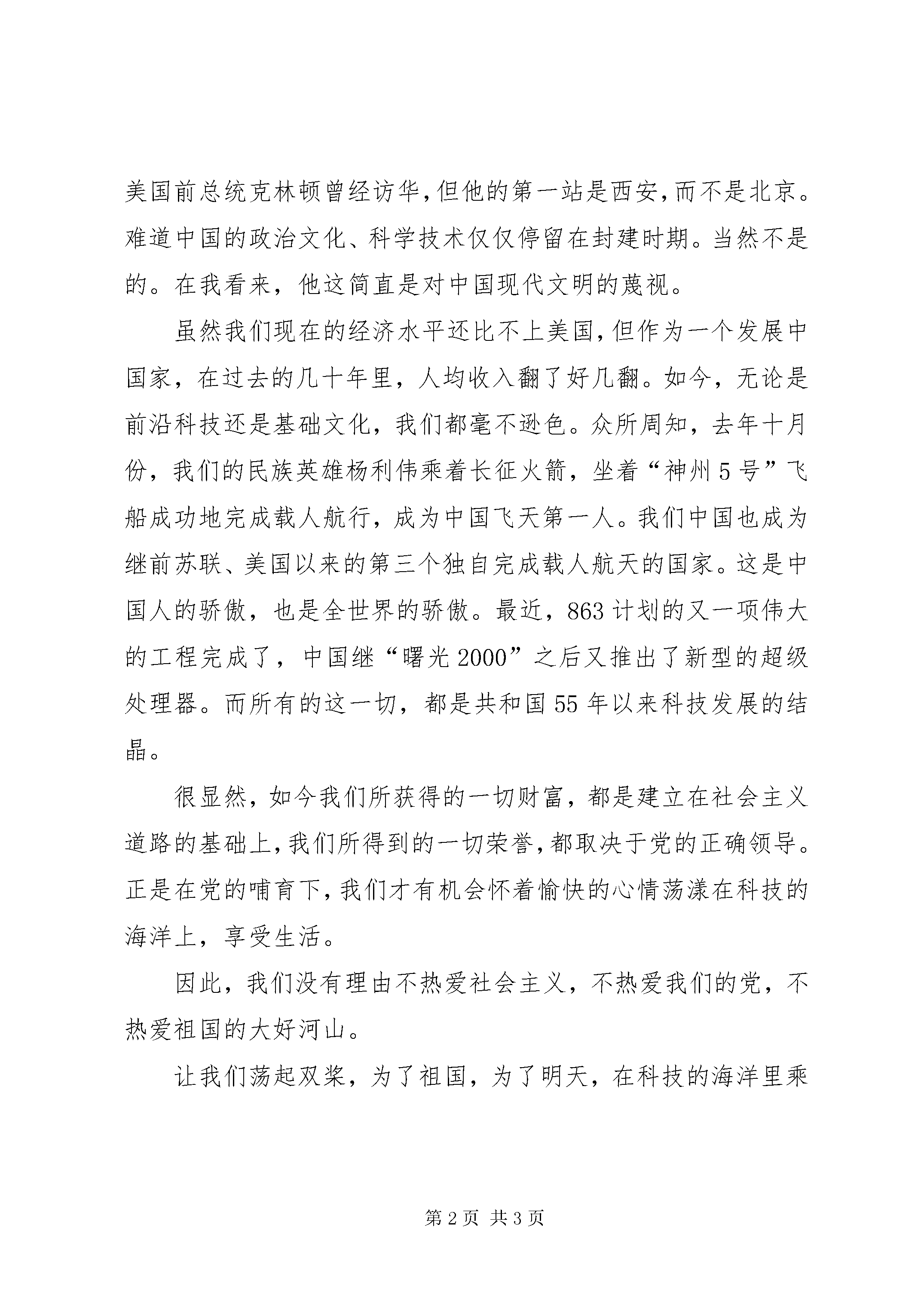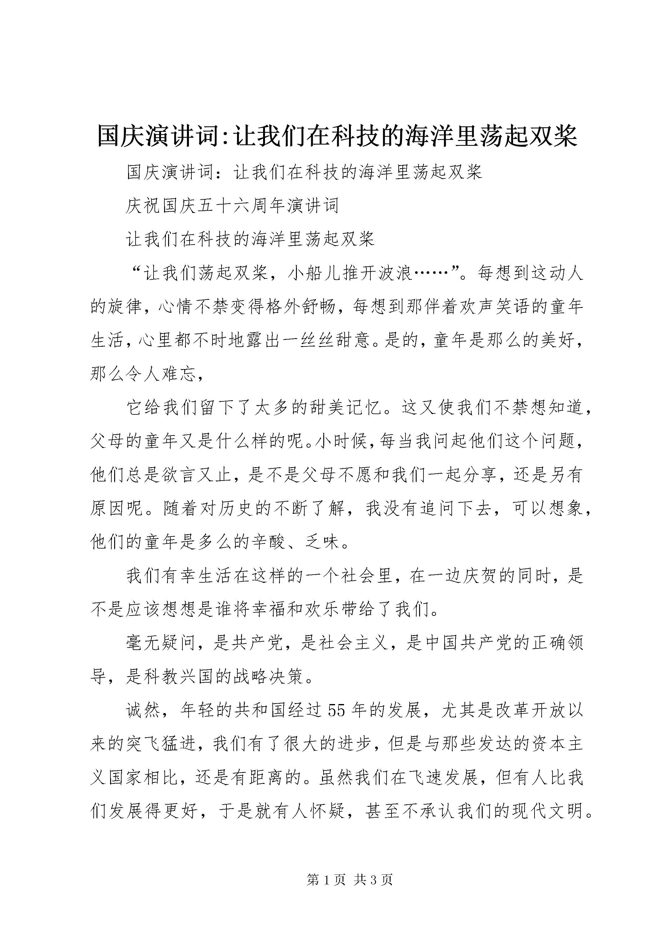 国庆演讲词:让我们在科技的海洋里荡起双桨国庆演讲词:让我们在科技的海洋里荡起双桨庆祝国庆五十六周年演讲词让我们在科技的海洋里荡起双桨“让我们荡起双桨,小船儿推开波浪……”。每想到这动人的旋律,心情不禁变得格外舒畅,每想到那伴着欢声笑语的童年生活,心里都不时地露出一丝丝甜意。是的,童年是那么的美好,那么令人难忘,它给我们留下了太多的甜美记忆。这又使我们不禁想知道,父母的童年又是什么样的呢。小时候,每当我问起他们这个问题,他们总是欲言又止,是不是父母不愿和我们一起分享,还是另有原因呢。随着对历史的不断了解,我没有追问下去,可以想象,他们的童年是多么的辛酸、乏味。我们有幸生活在这样的一个社会里,在一边庆贺的同时,是不是应该想想是谁将幸福和欢乐带给了我们。毫无疑问,是共产党,是社会主义,是中国共产党的正确领导,是科教兴国的战略决策。诚然,年轻的共和国经过55年的发展,尤其是改革开放以来的突飞猛进,我们有了很大的进步,但是与那些发达的资本主义国家相比,还是有距离的。虽然我们在飞速发展,但有人比我们发展得更好,于是就有人怀疑,甚至不承认我们的现代文明。美国前总统克林顿曾经访华,但他的第一站是西安,而不是北京。难道中国的政治文化、科学技术仅仅停留在封建时期。当然不是的。在我看来,他这简直是对中国现代文明的蔑视。虽然我们现在的经济水平还比不上美国,但作为一个发展中国家,在过去的几十年里,人均收入翻了好几翻。如今,无论是前沿科技还是基础文化,我们都毫不逊色。众所周知,去年十月份,我们的民族英雄杨利伟乘着长征火箭,坐着“神州5号”飞船成功地完成载人航行,成为中国飞天第一人。我们中国也成为继前苏联、美国以来的第三个独自完成载人航天的国家。这是中国人的骄傲,也是全世界的骄傲。最近,863计划的又一项伟大的工程完成了,中国继“曙光2000”之后又推出了新型的超级处理器。而所有的这一切,都是共和国55年以来科技发展的结晶。很显然,如今我们所获得的一切财富,都是建立在社会主义道路的基础上,我们所得到的一切荣誉,都取决于党的正确领导。正是在党的哺育下,我们才有机会怀着愉快的心情荡漾在科技的海洋上,享受生活。因此,我们没有理由不热爱社会主义,不热爱我们的党,不热爱祖国的大好河山。让我们荡起双桨,为了祖国,为了明天,在科技的海洋里乘风破浪、奋勇前进吧。