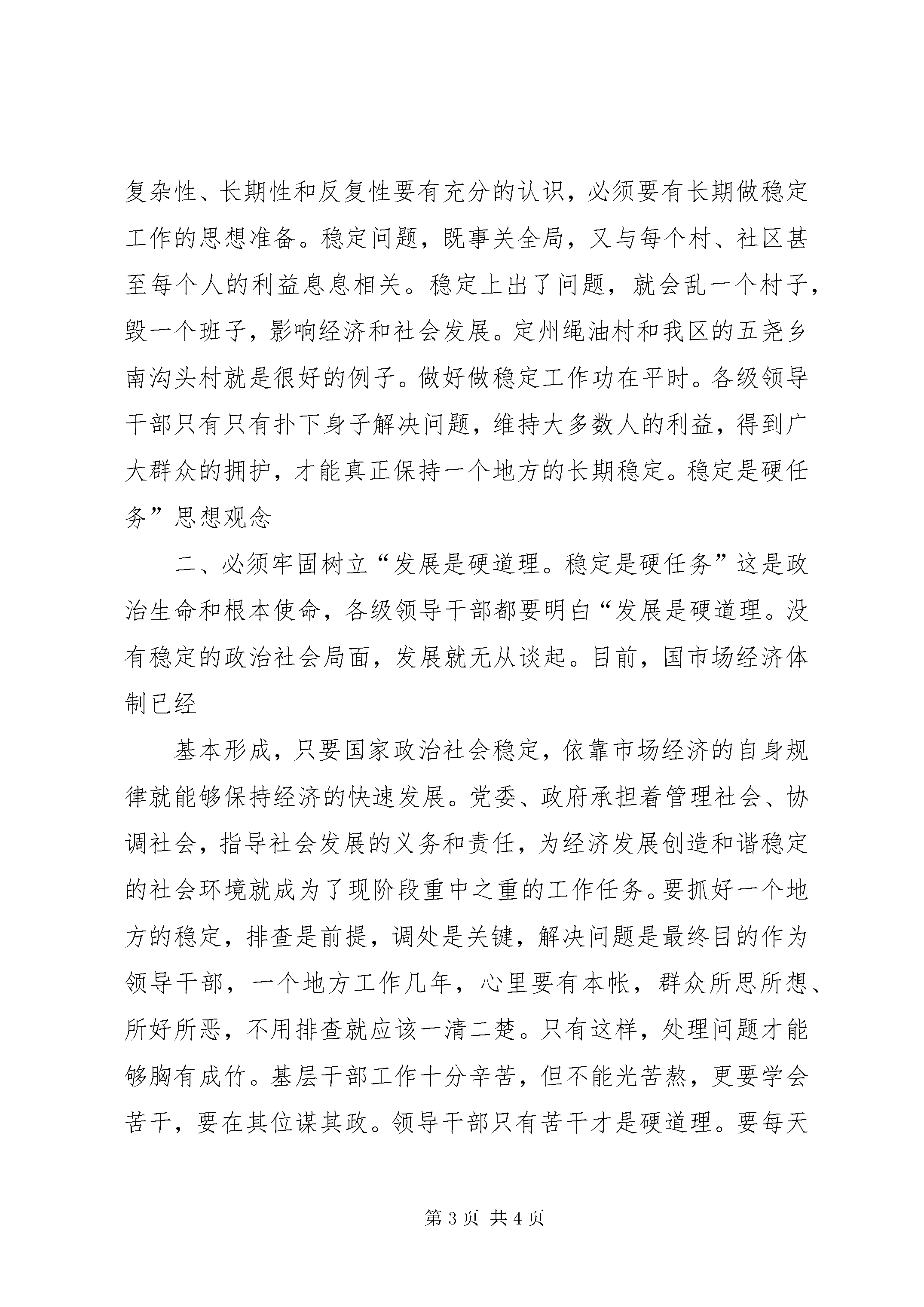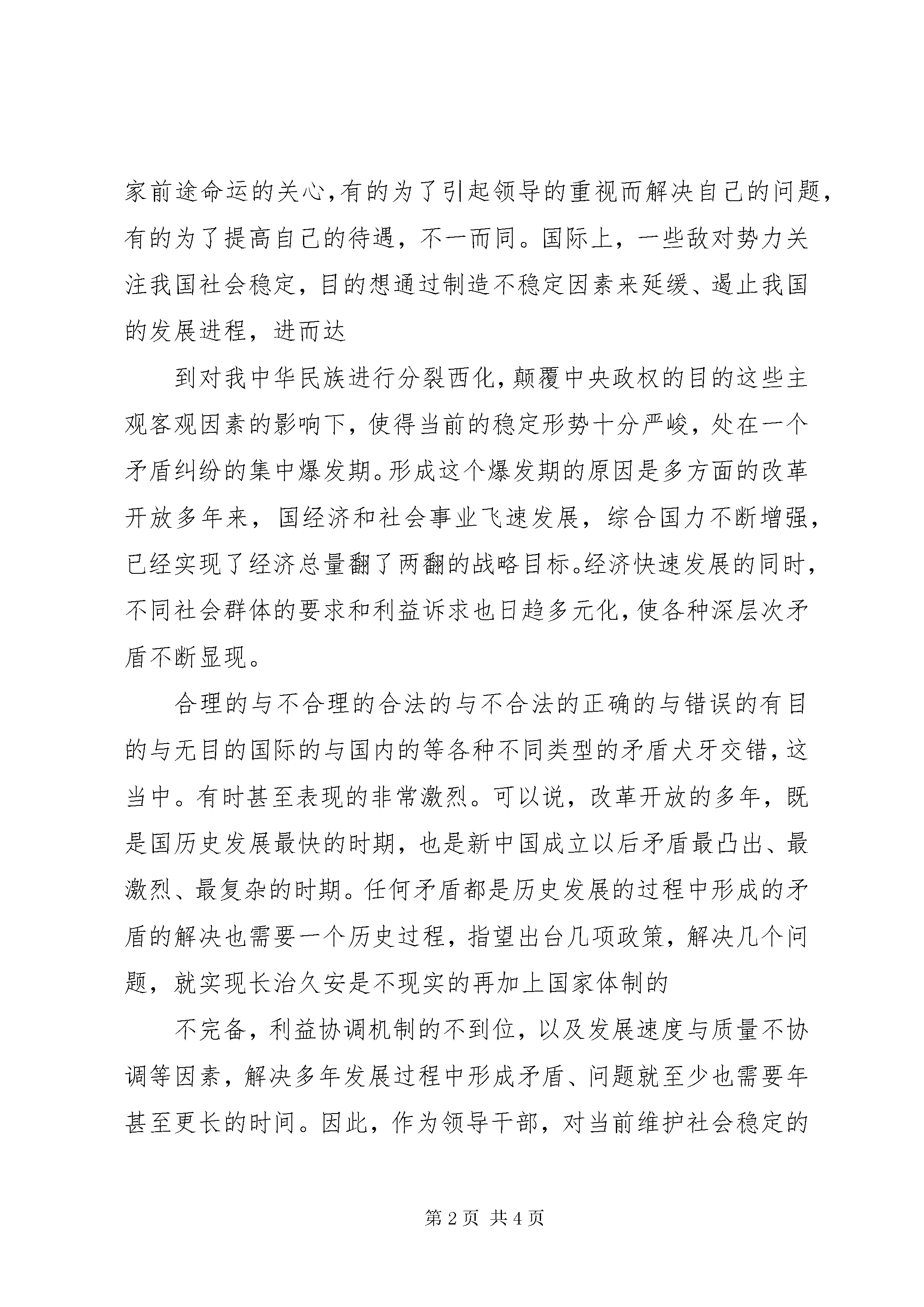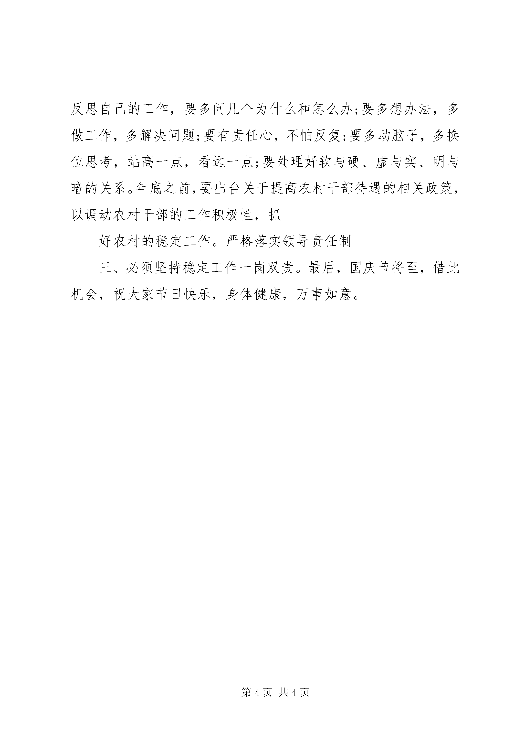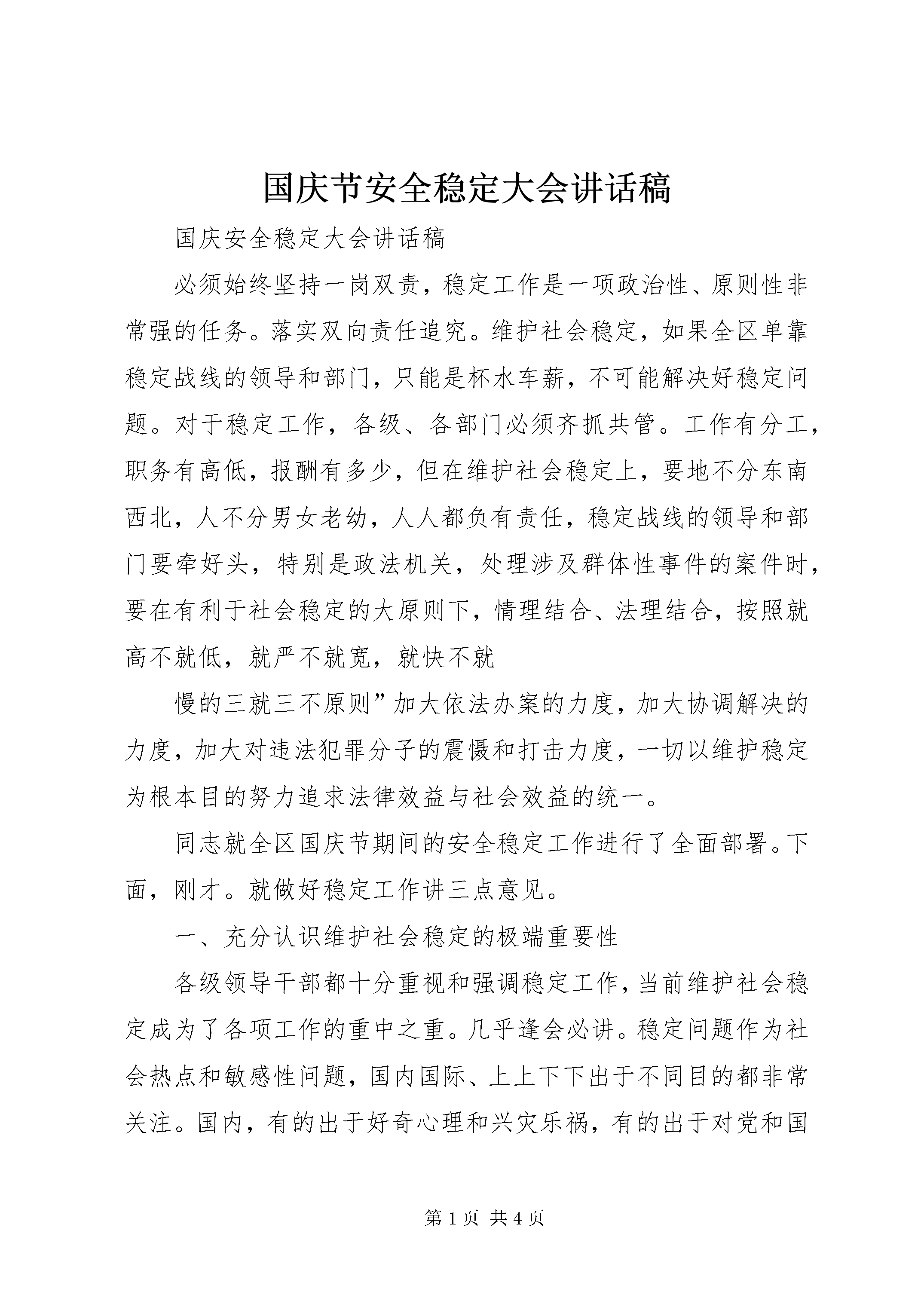 国庆节安全稳定大会讲话稿国庆安全稳定大会讲话稿必须始终坚持一岗双责,稳定工作是一项政治性、原则性非常强的任务。落实双向责任追究。维护社会稳定,如果全区单靠稳定战线的领导和部门,只能是杯水车薪,不可能解决好稳定问题。对于稳定工作,各级、各部门必须齐抓共管。工作有分工,职务有高低,报酬有多少,但在维护社会稳定上,要地不分东南西北,人不分男女老幼,人人都负有责任,稳定战线的领导和部门要牵好头,特别是政法机关,处理涉及群体性事件的案件时,要在有利于社会稳定的大原则下,情理结合、法理结合,按照就高不就低,就严不就宽,就快不就慢的三就三不原则”加大依法办案的力度,加大协调解决的力度,加大对违法犯罪分子的震慑和打击力度,一切以维护稳定为根本目的努力追求法律效益与社会效益的统一。同志就全区国庆节期间的安全稳定工作进行了全面部署。下面,刚才。就做好稳定工作讲三点意见。一、充分认识维护社会稳定的极端重要性各级领导干部都十分重视和强调稳定工作,当前维护社会稳定成为了各项工作的重中之重。几乎逢会必讲。稳定问题作为社会热点和敏感性问题,国内国际、上上下下出于不同目的都非常关注。国内,有的出于好奇心理和兴灾乐祸,有的出于对党和国家前途命运的关心,有的为了引起领导的重视而解决自己的问题,有的为了提高自己的待遇,不一而同。国际上,一些敌对势力关注我国社会稳定,目的想通过制造不稳定因素来延缓、遏止我国的发展进程,进而达到对我中华民族进行分裂西化,颠覆中央政权的目的这些主观客观因素的影响下,使得当前的稳定形势十分严峻,处在一个矛盾纠纷的集中爆发期。形成这个爆发期的原因是多方面的改革开放多年来,国经济和社会事业飞速发展,综合国力不断增强,已经实现了经济总量翻了两翻的战略目标。经济快速发展的同时,不同社会群体的要求和利益诉求也日趋多元化,使各种深层次矛盾不断显现。合理的与不合理的合法的与不合法的正确的与错误的有目的与无目的国际的与国内的等各种不同类型的矛盾犬牙交错,这当中。有时甚至表现的非常激烈。可以说,改革开放的多年,既是国历史发展最快的时期,也是新中国成立以后矛盾最凸出、最激烈、最复杂的时期。任何矛盾都是历史发展的过程中形成的矛盾的解决也需要一个历史过程,指望出台几项政策,解决几个问题,就实现长治久安是不现实的再加上国家体制的不完备,利益协调机制的不到位,以及发展速度与质量不协调等因素,解决多年发展过程中形成矛盾、问题就至少也需要年甚至更长的时间。因此,作为领导干部,对当前维护社会稳定的复杂性、长期性和反复性要有充分的认识,必须要有长期做稳定工作的思想准备。稳定问题,既事关全局,又与每个村、社区甚至每个人的利益息息相关。稳定上出了问题,就会乱一个村子,毁一个班子,影响经济和社会发展。定州绳油村和我区的五尧乡南沟头村就是很好的例子。做好做稳定工作功在平时。各级领导干部只有只有扑下身子解决问题,维持大多数人的利益,得到广大群众的拥护,才能真正保持一个地方的长期稳定。稳定是硬任务”思想观念二、必须牢固树立“发展是硬道理。稳定是硬任务”这是政治生命和根本使命,各级领导干部都要明白“发展是硬道理。没有稳定的政治社会局面,发展就无从谈起。目前,国市场经济体制已经基本形成,只要国家政治社会稳定,依靠市场经济的自身规律就能够保持经济的快速发展。党委、政府承担着管理社会、协调社会,指导社会发展的义务和责任,为经济发展创造和谐稳定的社会环境就成为了现阶段重中之重的工作任务。要抓好一个地方的稳定,排查是前提,调处是关键,解决问题是最终目的作为领导干部,一个地方工作几年,心里要有本帐,群众所思所想、所好所恶,不用排查就应该一清二楚。只有这样,处理问题才能够胸有成竹。基层干部工作十分辛苦,但不能光苦熬,更要学会苦干,要在其位谋其政。领导干部只有苦干才是硬道理。要每天反思自己的工作,要多问几个为什么和怎么办;要多想办法,多做工作,多解决问题;要有责任心,不怕反复;要多动脑子,多换位思考,站高一点,看远一点;要处理好软与硬、虚与实、明与暗的关系。年底之前,要出台关于提高农村干部待遇的相关政策,以调动农村干部的工作积极性,抓好农村的稳定工作。严格落实领导责任制三、必须坚持稳定工作一岗双责。最后,国庆节将至,借此机会,祝大家节日快乐,身体健康,万事如意。