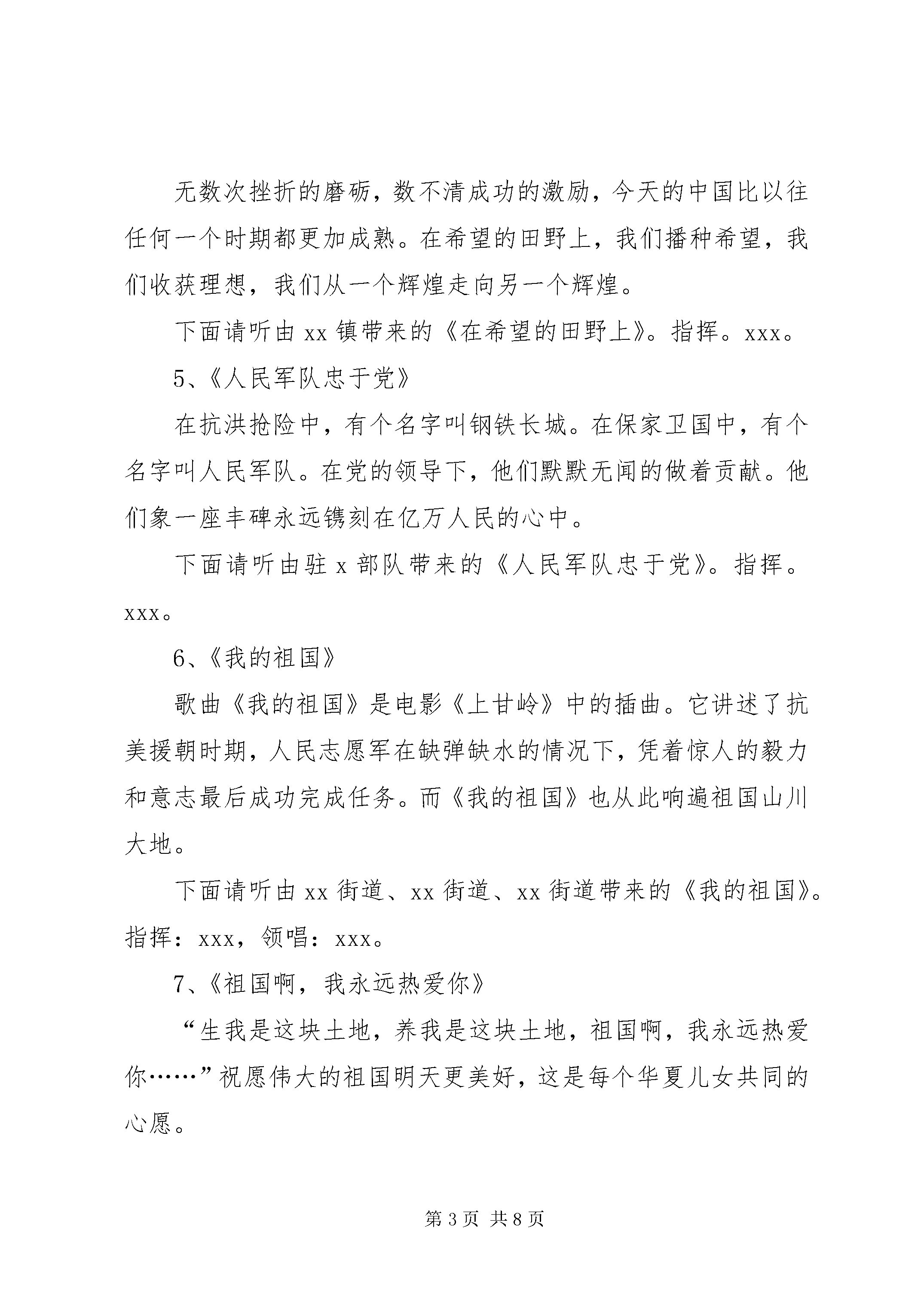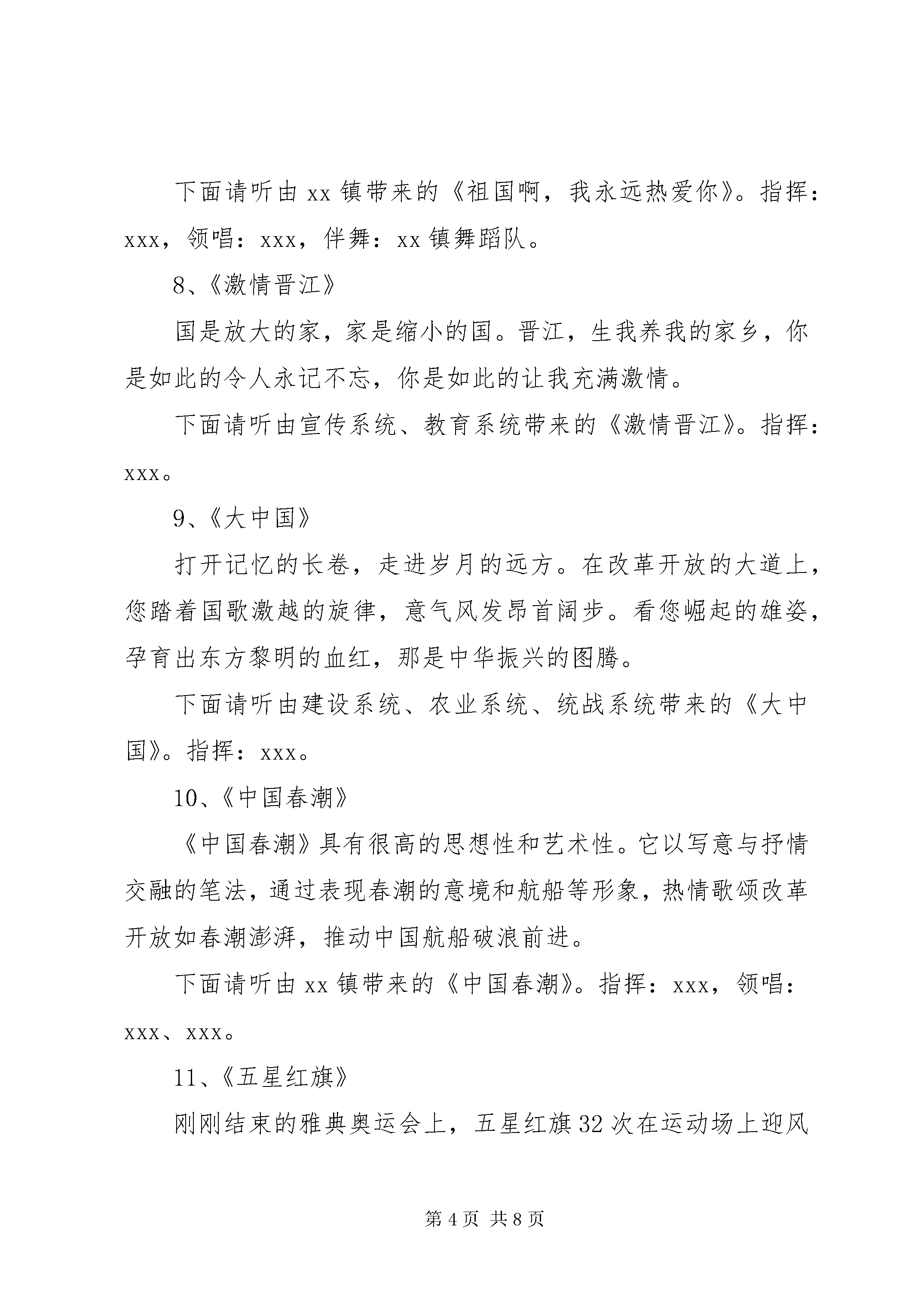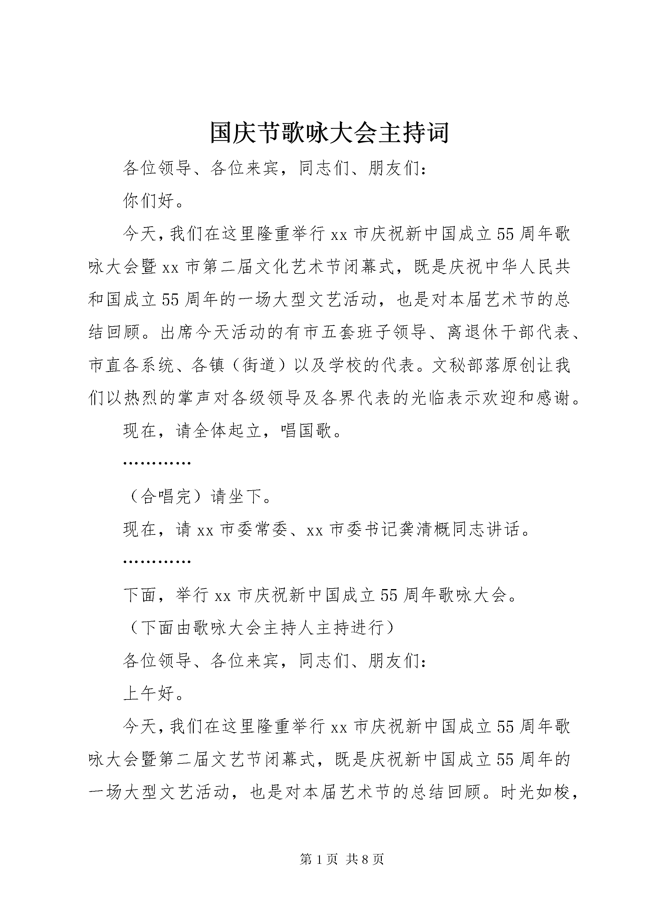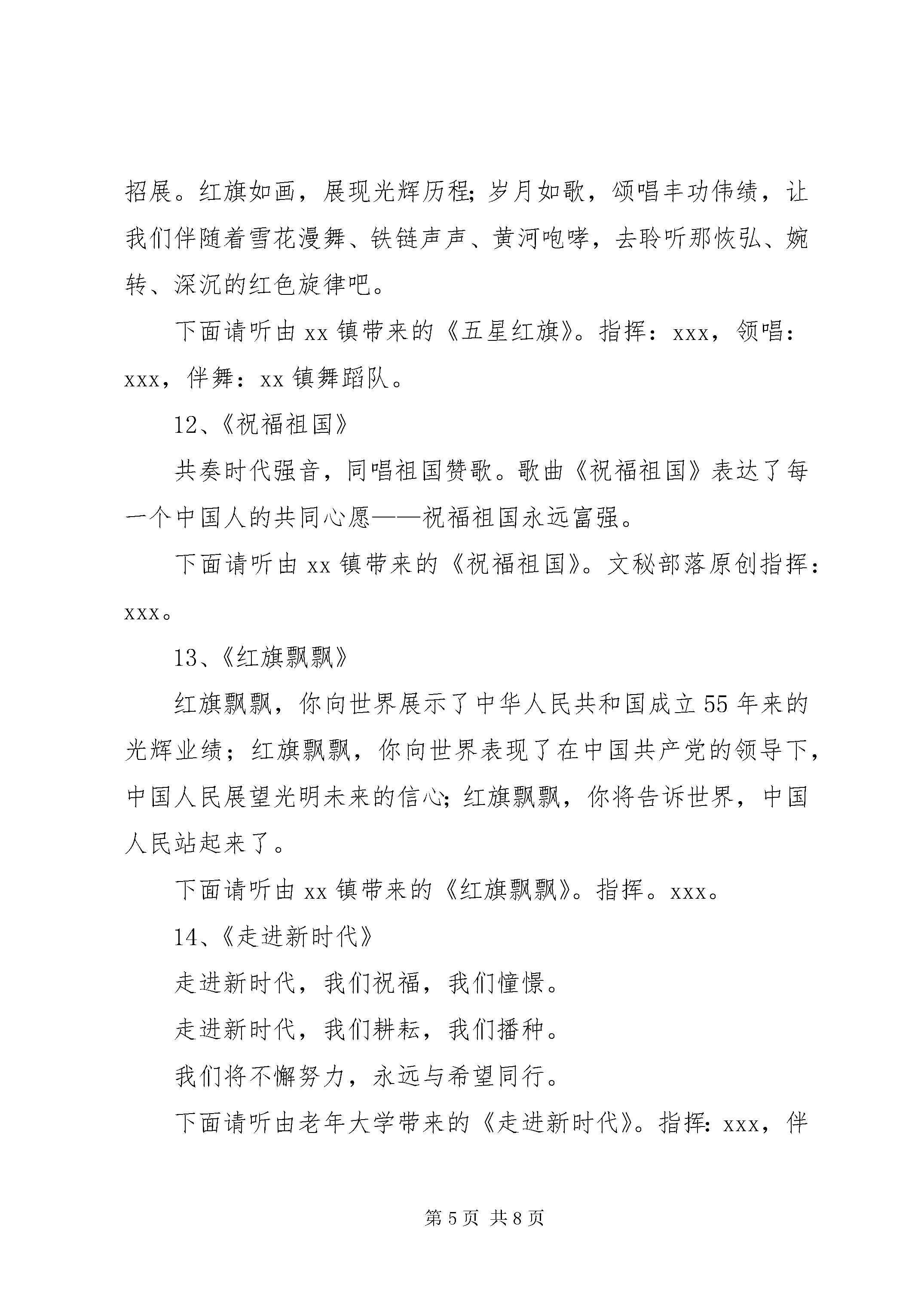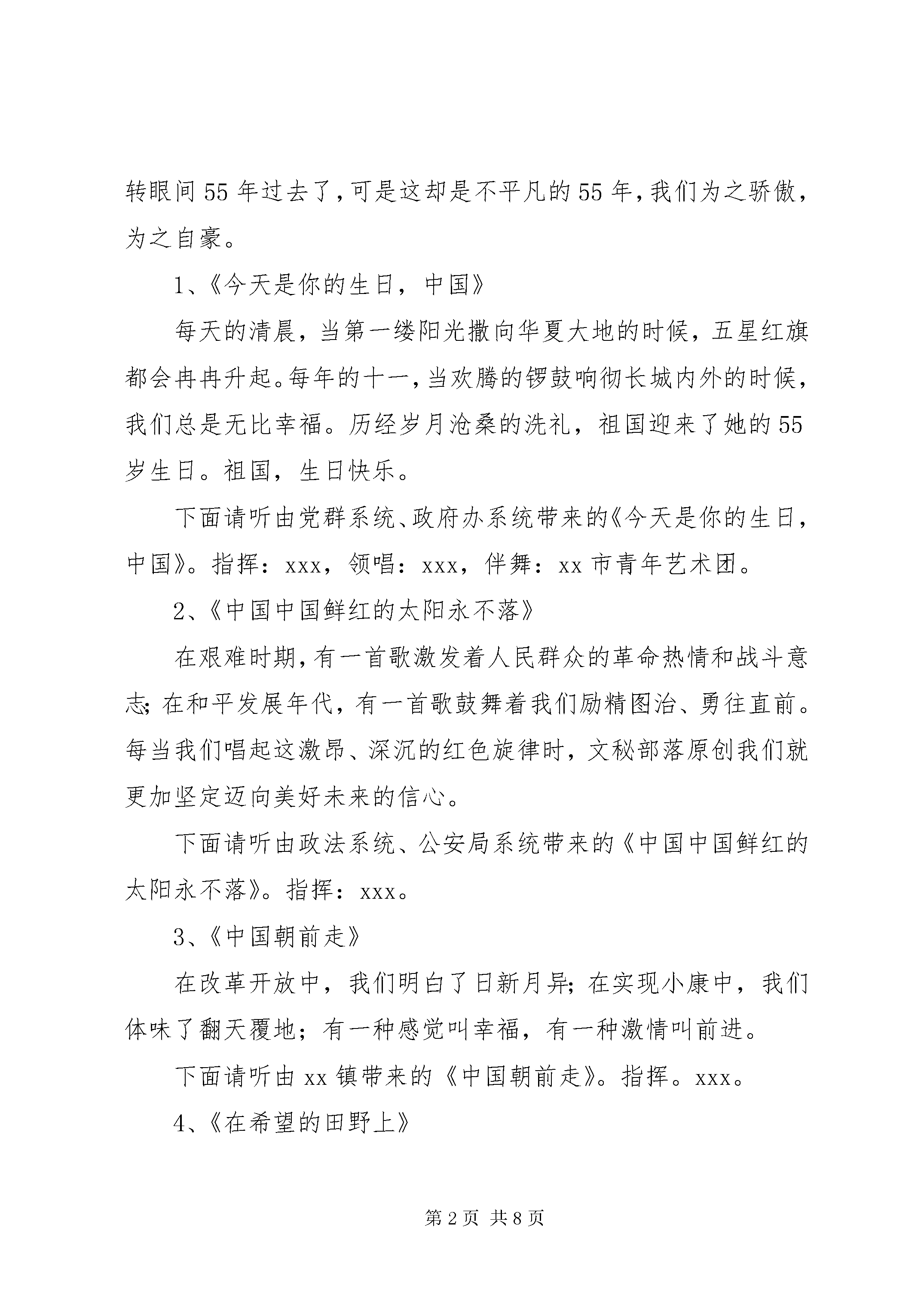 国庆节歌咏大会主持词各位领导、各位来宾,同志们、朋友们:你们好。今天,我们在这里隆重举行xx市庆祝新中国成立55周年歌咏大会暨xx市第二届文化艺术节闭幕式,既是庆祝中华人民共和国成立55周年的一场大型文艺活动,也是对本届艺术节的总结回顾。出席今天活动的有市五套班子领导、离退休干部代表、市直各系统、各镇(街道)以及学校的代表。文秘部落原创让我们以热烈的掌声对各级领导及各界代表的光临表示欢迎和感谢。现在,请全体起立,唱国歌。…………(合唱完)请坐下。现在,请xx市委常委、xx市委书记龚清概同志讲话。…………下面,举行xx市庆祝新中国成立55周年歌咏大会。(下面由歌咏大会主持人主持进行)各位领导、各位来宾,同志们、朋友们:上午好。今天,我们在这里隆重举行xx市庆祝新中国成立55周年歌咏大会暨第二届文艺节闭幕式,既是庆祝新中国成立55周年的一场大型文艺活动,也是对本届艺术节的总结回顾。时光如梭,转眼间55年过去了,可是这却是不平凡的55年,我们为之骄傲,为之自豪。1、《今天是你的生日,中国》每天的清晨,当第一缕阳光撒向华夏大地的时候,五星红旗都会冉冉升起。每年的十一,当欢腾的锣鼓响彻长城内外的时候,我们总是无比幸福。历经岁月沧桑的洗礼,祖国迎来了她的55岁生日。祖国,生日快乐。下面请听由党群系统、政府办系统带来的《今天是你的生日,中国》。指挥:xxx,领唱:xxx,伴舞:xx市青年艺术团。2、《中国中国鲜红的太阳永不落》在艰难时期,有一首歌激发着人民群众的革命热情和战斗意志;在和平发展年代,有一首歌鼓舞着我们励精图治、勇往直前。每当我们唱起这激昂、深沉的红色旋律时,文秘部落原创我们就更加坚定迈向美好未来的信心。下面请听由政法系统、公安局系统带来的《中国中国鲜红的太阳永不落》。指挥:xxx。3、《中国朝前走》在改革开放中,我们明白了日新月异;在实现小康中,我们体味了翻天覆地;有一种感觉叫幸福,有一种激情叫前进。下面请听由xx镇带来的《中国朝前走》。指挥。xxx。4、《在希望的田野上》无数次挫折的磨砺,数不清成功的激励,今天的中国比以往任何一个时期都更加成熟。在希望的田野上,我们播种希望,我们收获理想,我们从一个辉煌走向另一个辉煌。下面请听由xx镇带来的《在希望的田野上》。指挥。xxx。5、《人民军队忠于党》在抗洪抢险中,有个名字叫钢铁长城。在保家卫国中,有个名字叫人民军队。在党的领导下,他们默默无闻的做着贡献。他们象一座丰碑永远镌刻在亿万人民的心中。下面请听由驻x部队带来的《人民军队忠于党》。指挥。xxx。6、《我的祖国》歌曲《我的祖国》是电影《上甘岭》中的插曲。它讲述了抗美援朝时期,人民志愿军在缺弹缺水的情况下,凭着惊人的毅力和意志最后成功完成任务。而《我的祖国》也从此响遍祖国山川大地。下面请听由xx街道、xx街道、xx街道带来的《我的祖国》。指挥:xxx,领唱:xxx。7、《祖国啊,我永远热爱你》“生我是这块土地,养我是这块土地,祖国啊,我永远热爱你……”祝愿伟大的祖国明天更美好,这是每个华夏儿女共同的心愿。下面请听由xx镇带来的《祖国啊,我永远热爱你》。指挥:xxx,领唱:xxx,伴舞:xx镇舞蹈队。8、《激情晋江》国是放大的家,家是缩小的国。晋江,生我养我的家乡,你是如此的令人永记不忘,你是如此的让我充满激情。下面请听由宣传系统、教育系统带来的《激情晋江》。指挥:xxx。9、《大中国》打开记忆的长卷,走进岁月的远方。在改革开放的大道上,您踏着国歌激越的旋律,意气风发昂首阔步。看您崛起的雄姿,孕育出东方黎明的血红,那是中华振兴的图腾。下面请听由建设系统、农业系统、统战系统带来的《大中国》。指挥:xxx。10、《中国春潮》《中国春潮》具有很高的思想性和艺术性。它以写意与抒情交融的笔法,通过表现春潮的意境和航船等形象,热情歌颂改革开放如春潮澎湃,推动中国航船破浪前进。下面请听由xx镇带来的《中国春潮》。指挥:xxx,领唱:xxx、xxx。11、《五星红旗》刚刚结束的雅典奥运会上,五星红旗32次在运动场上迎风招展。红旗如画,展现光辉历程;岁月如歌,颂唱丰功伟绩,让我们伴随着雪花漫舞、铁链声声、黄河咆哮,去聆听那恢弘、婉转、深沉的红色旋律吧。下面请听由xx镇带来的《五星红旗》。指挥:xxx,领唱:xxx,伴舞:xx镇舞蹈队。12、《祝福祖国》共奏时代强音,同唱祖国赞歌。歌曲《祝福祖国》表达了每一个中国人的共同心愿——祝福祖国永远富强。下面请听由xx镇带来的《祝福祖国》。文秘部落原创指挥:xxx。13、《红旗飘飘》红旗飘飘,你向世界展示了中华人民共和国成立55年来的光辉业绩;红旗飘飘,你向世界表现了在中国共产党的领导下,中国人民展望光明未来的信心;红旗飘飘,你将告诉世界,中国人民站起来了。下面请听由xx镇带来的《红旗飘飘》。指挥。xxx。1